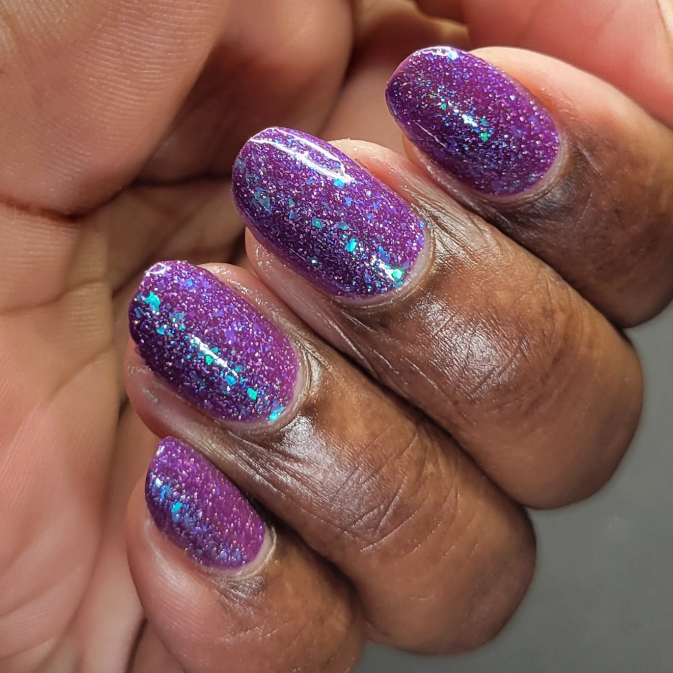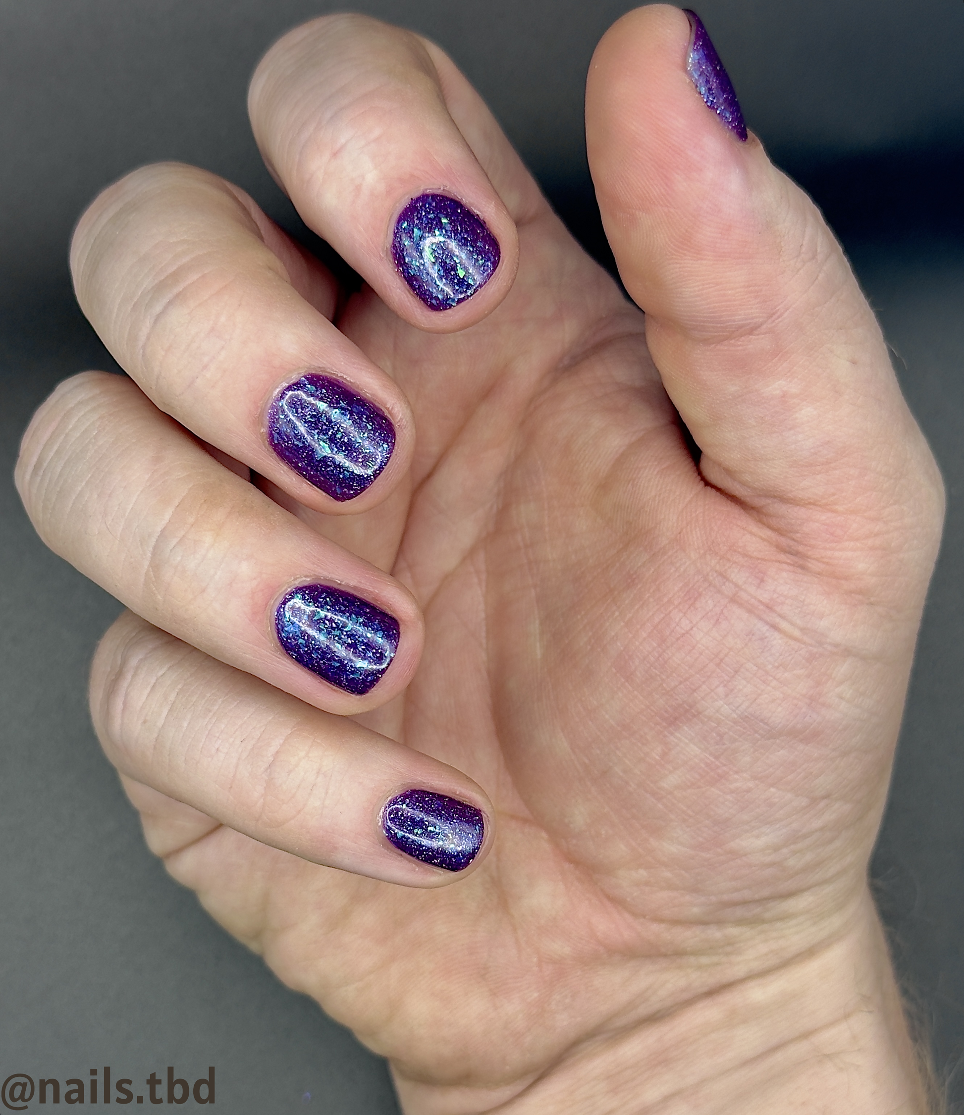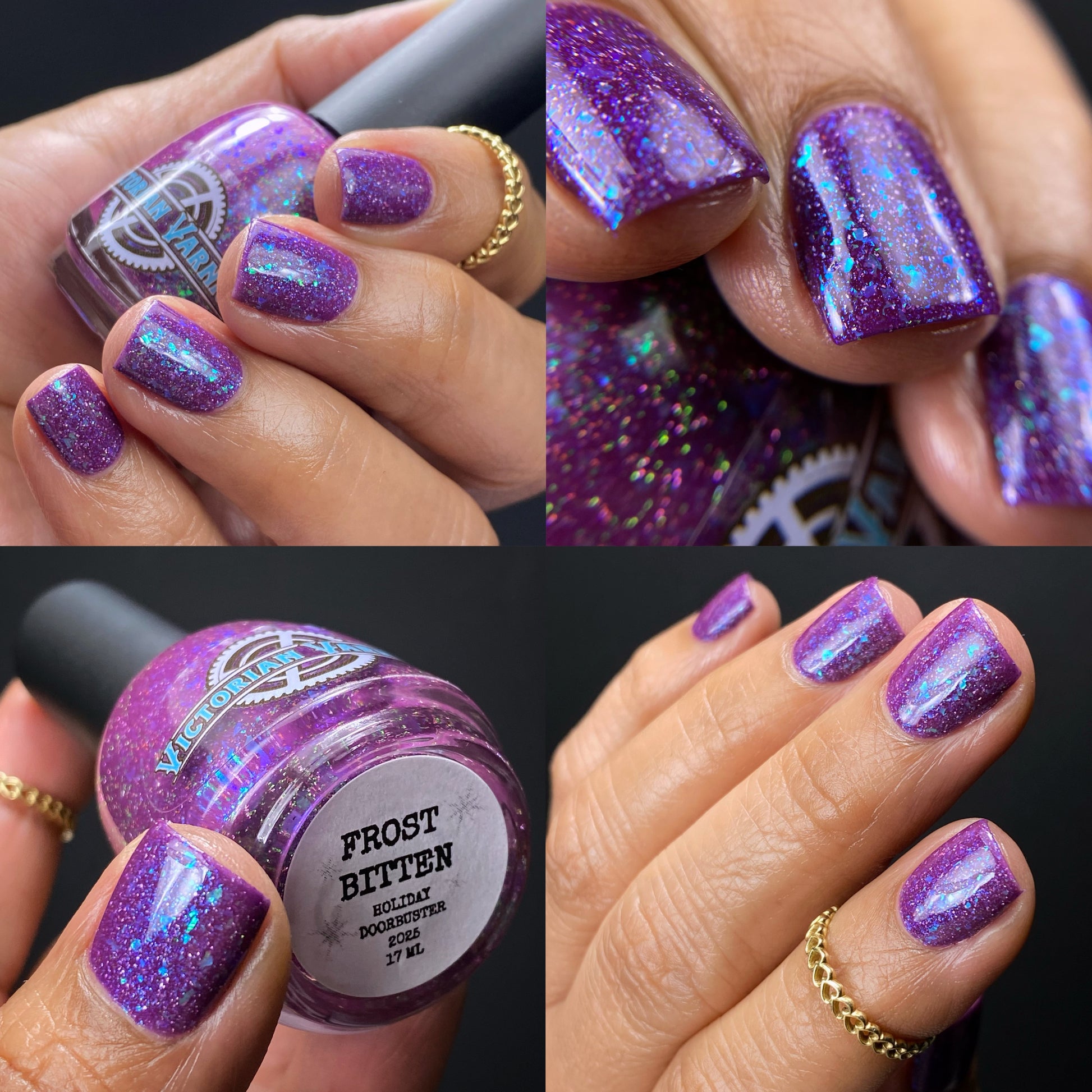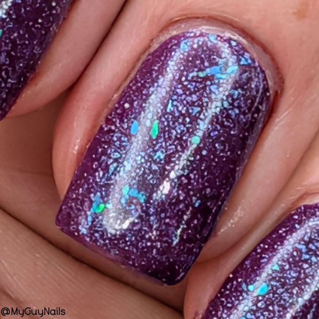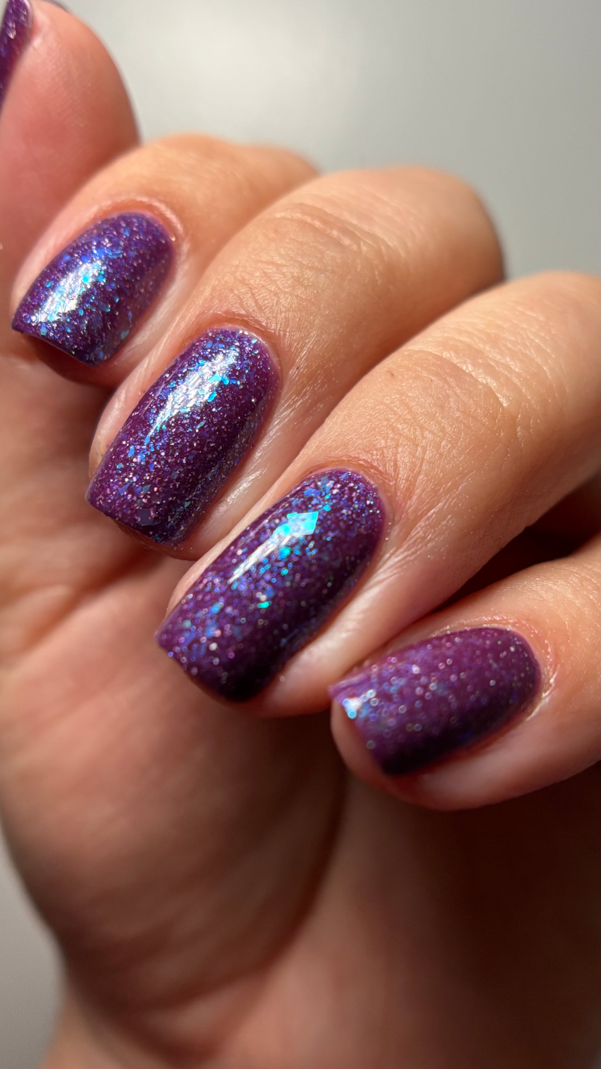 A winter berry purple with large particle aqua/blue/purple shimmer with frosty flakes in aquas/blues/greens/purples and a hint of icy micro holo glitters and reflective glitters