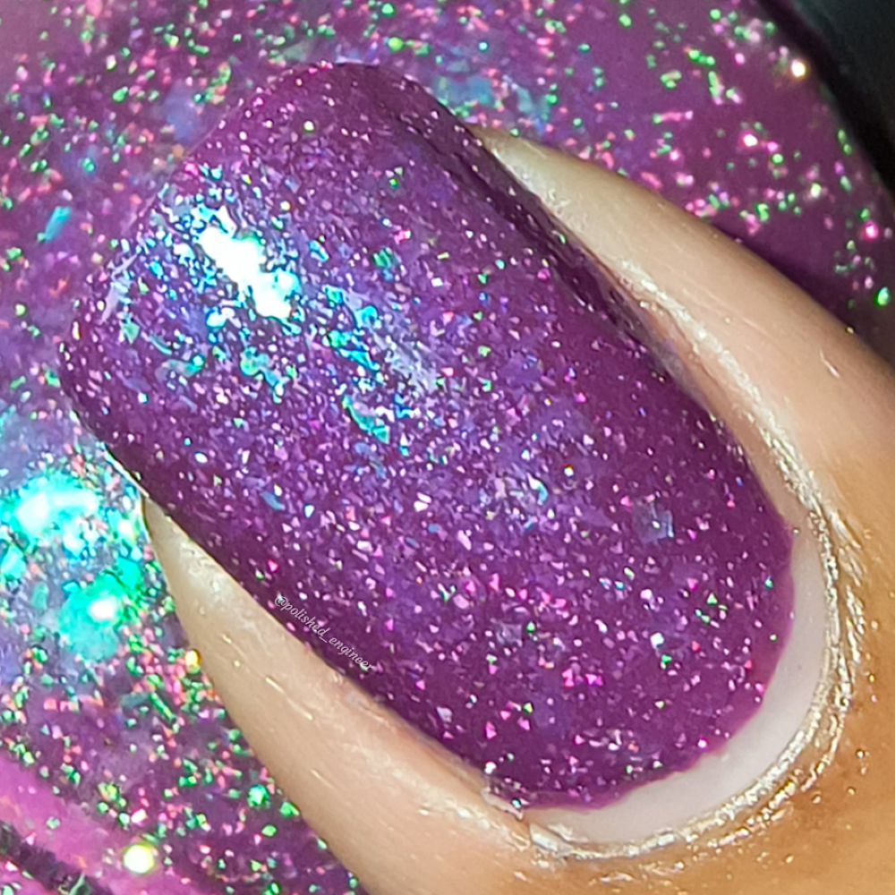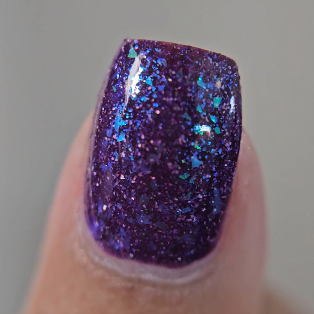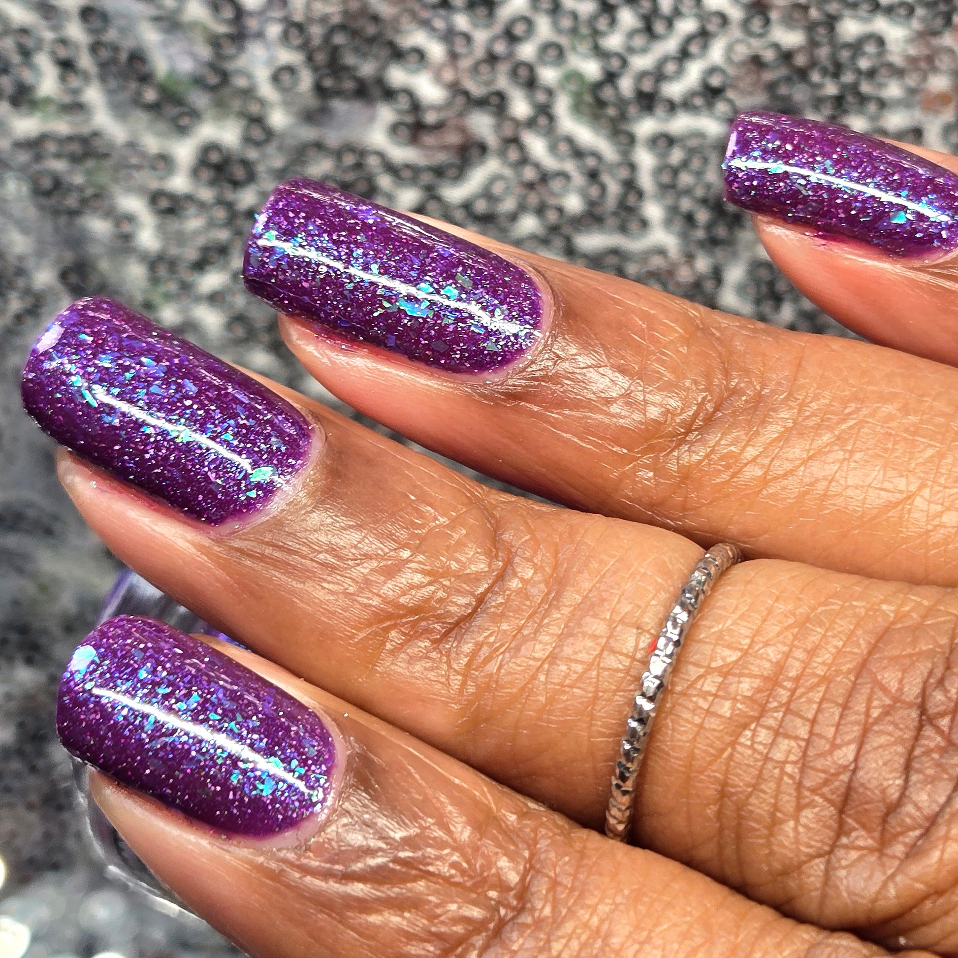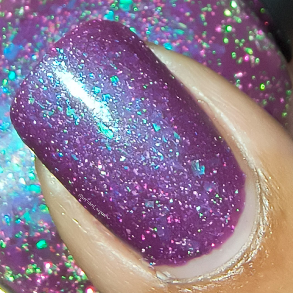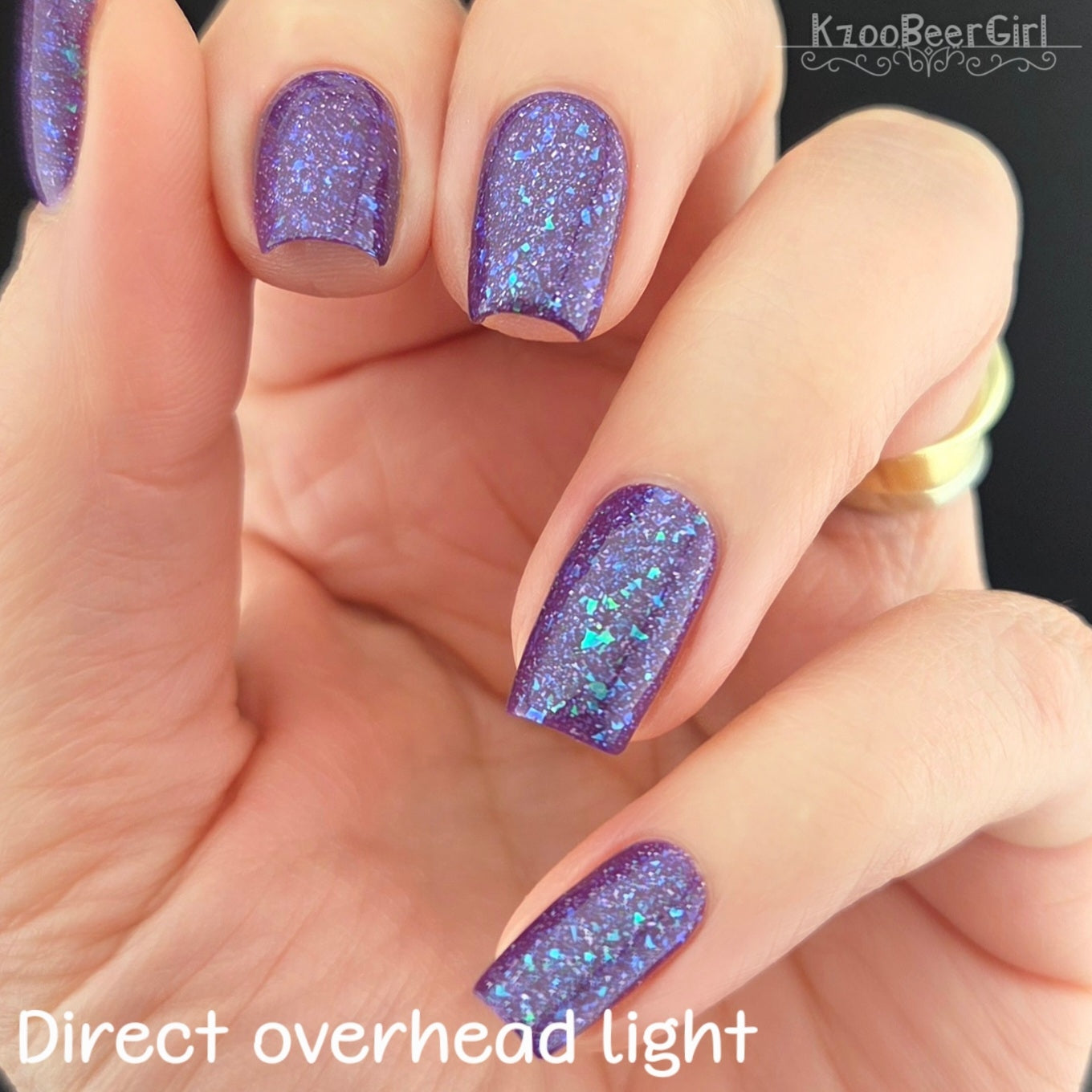 A winter berry purple with large particle aqua/blue/purple shimmer with frosty flakes in aquas/blues/greens/purples and a hint of icy micro holo glitters and reflective glitters