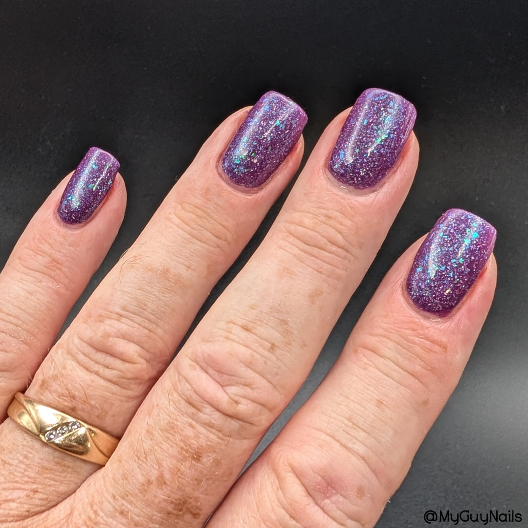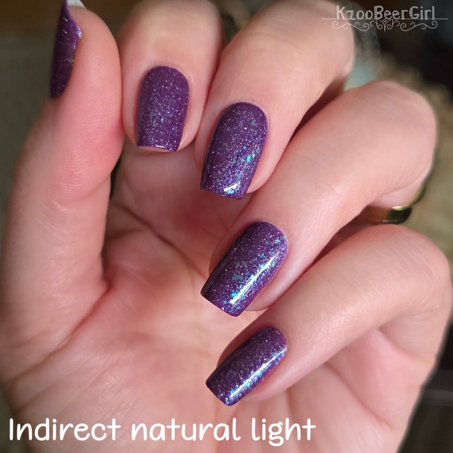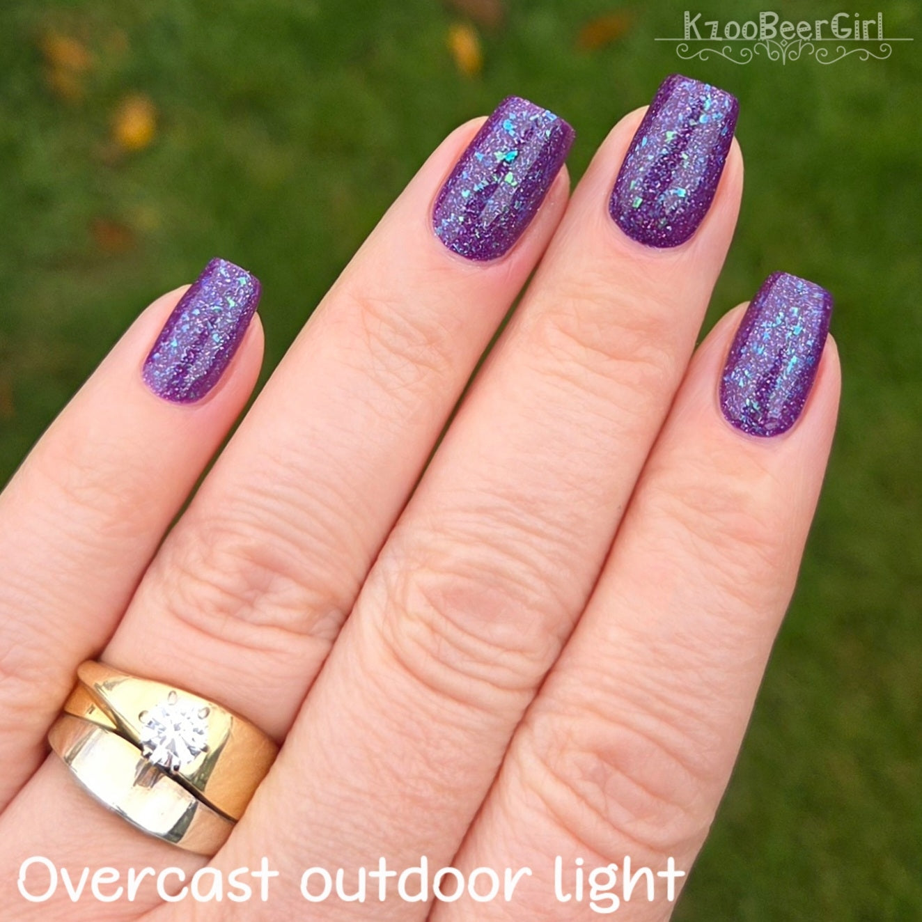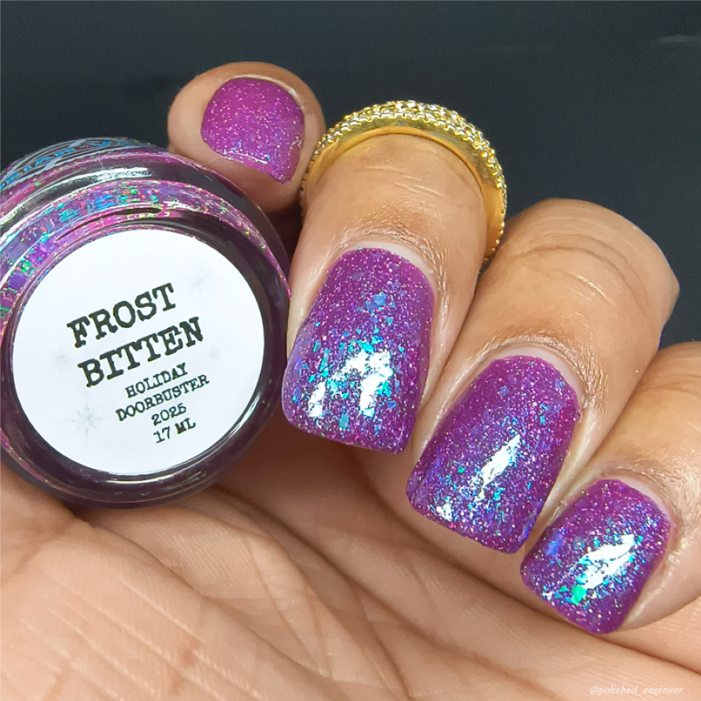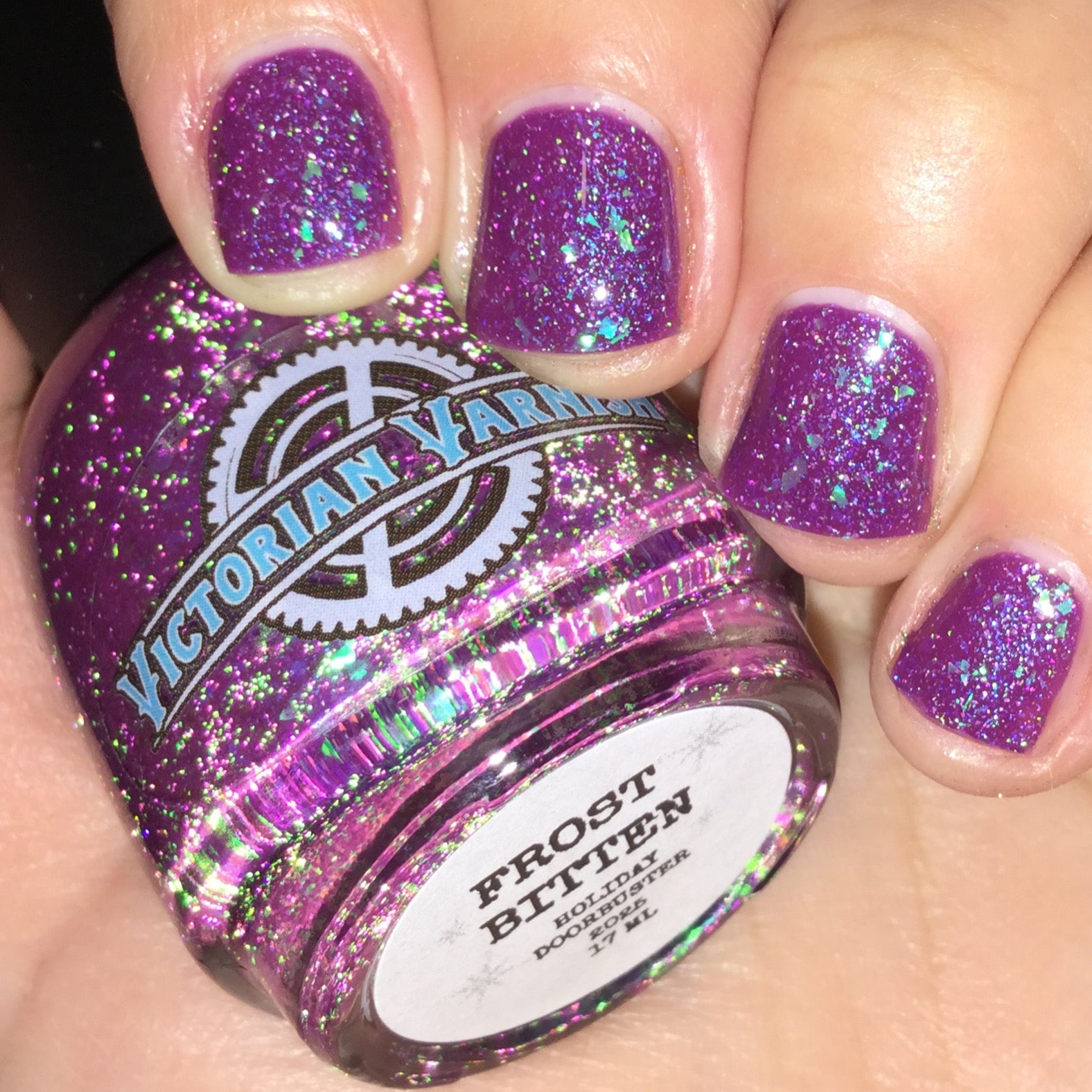 A winter berry purple with large particle aqua/blue/purple shimmer with frosty flakes in aquas/blues/greens/purples and a hint of icy micro holo glitters and reflective glitters
