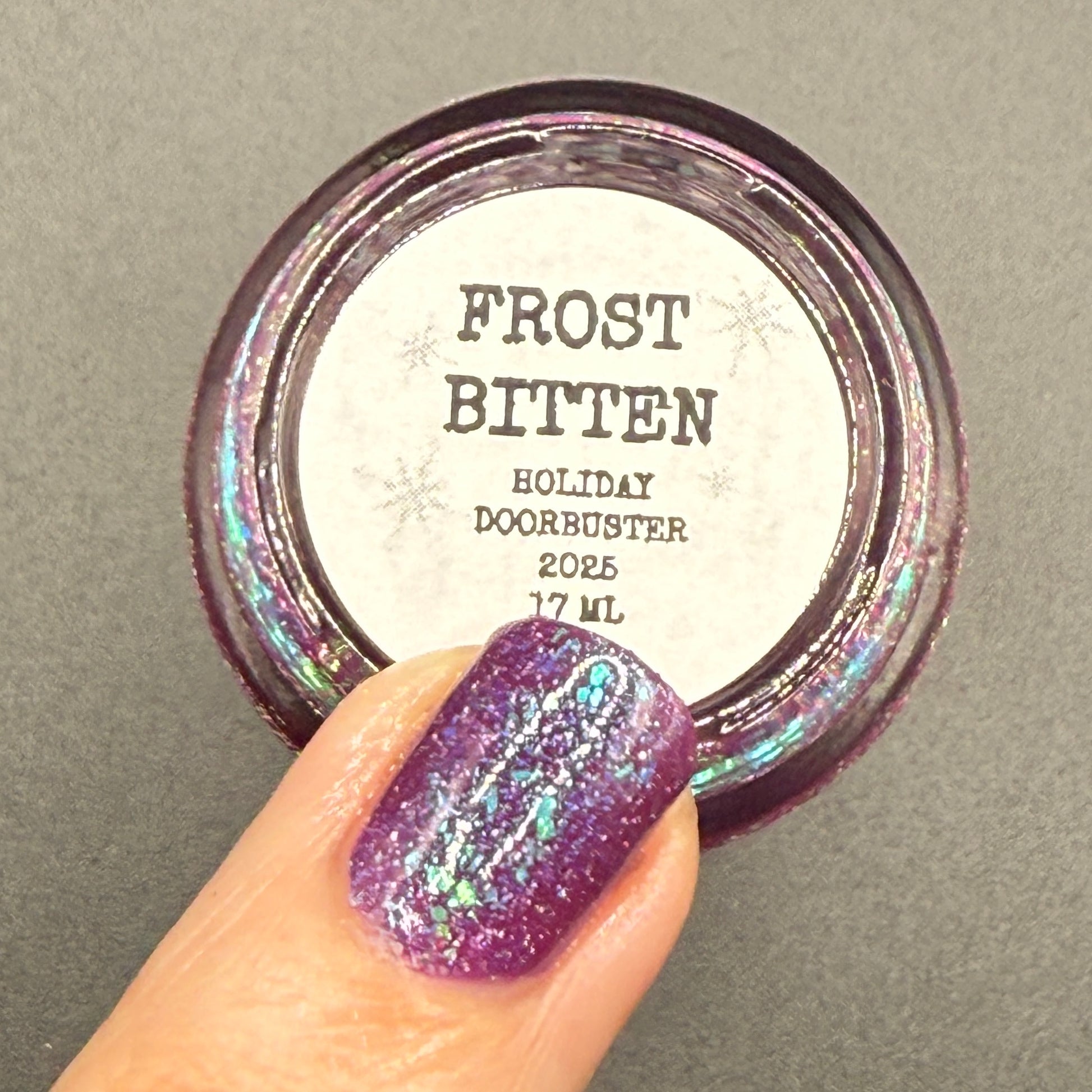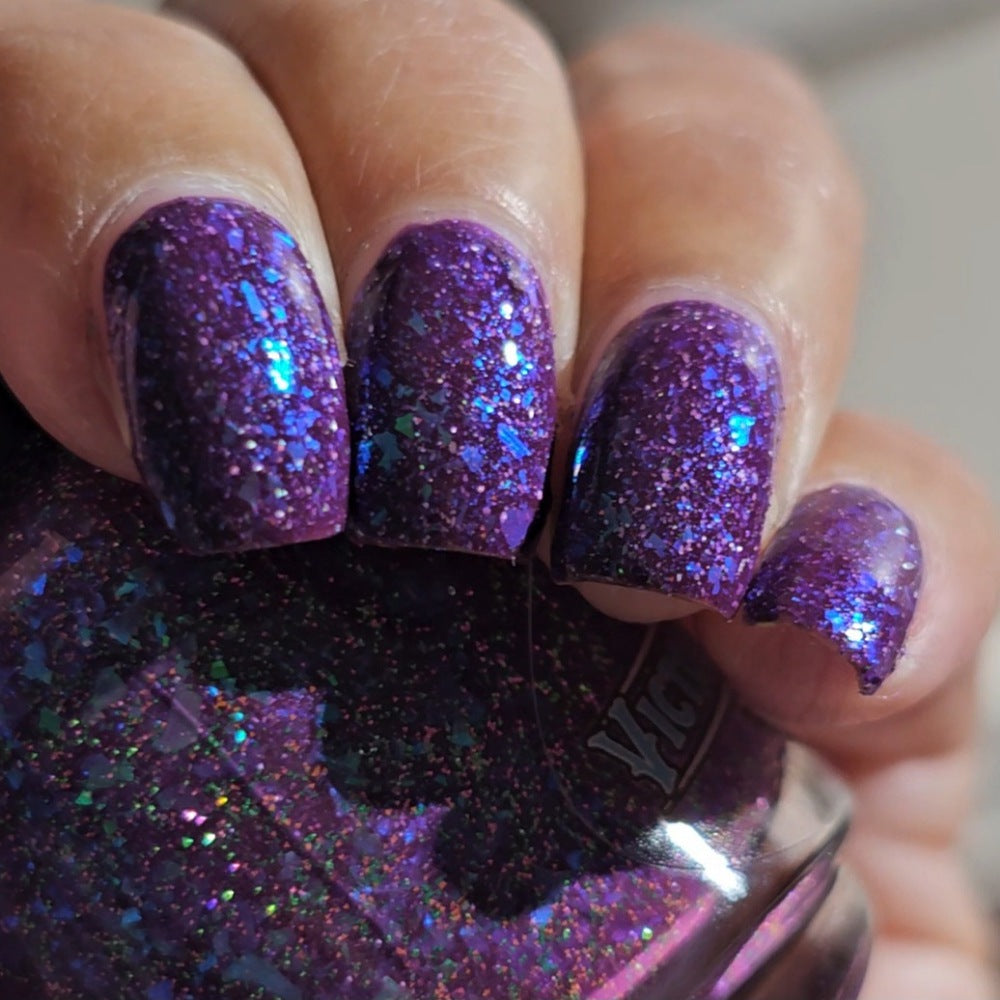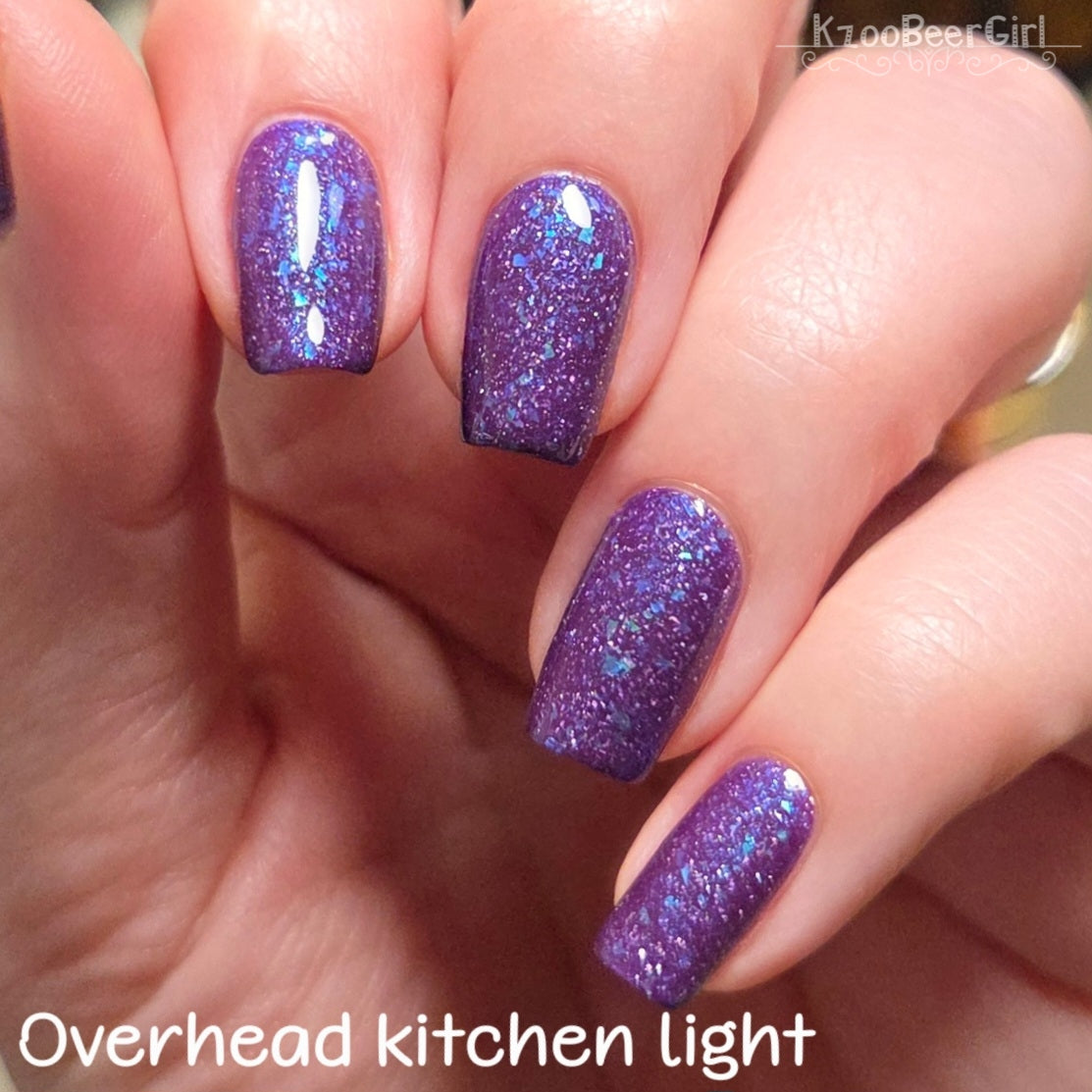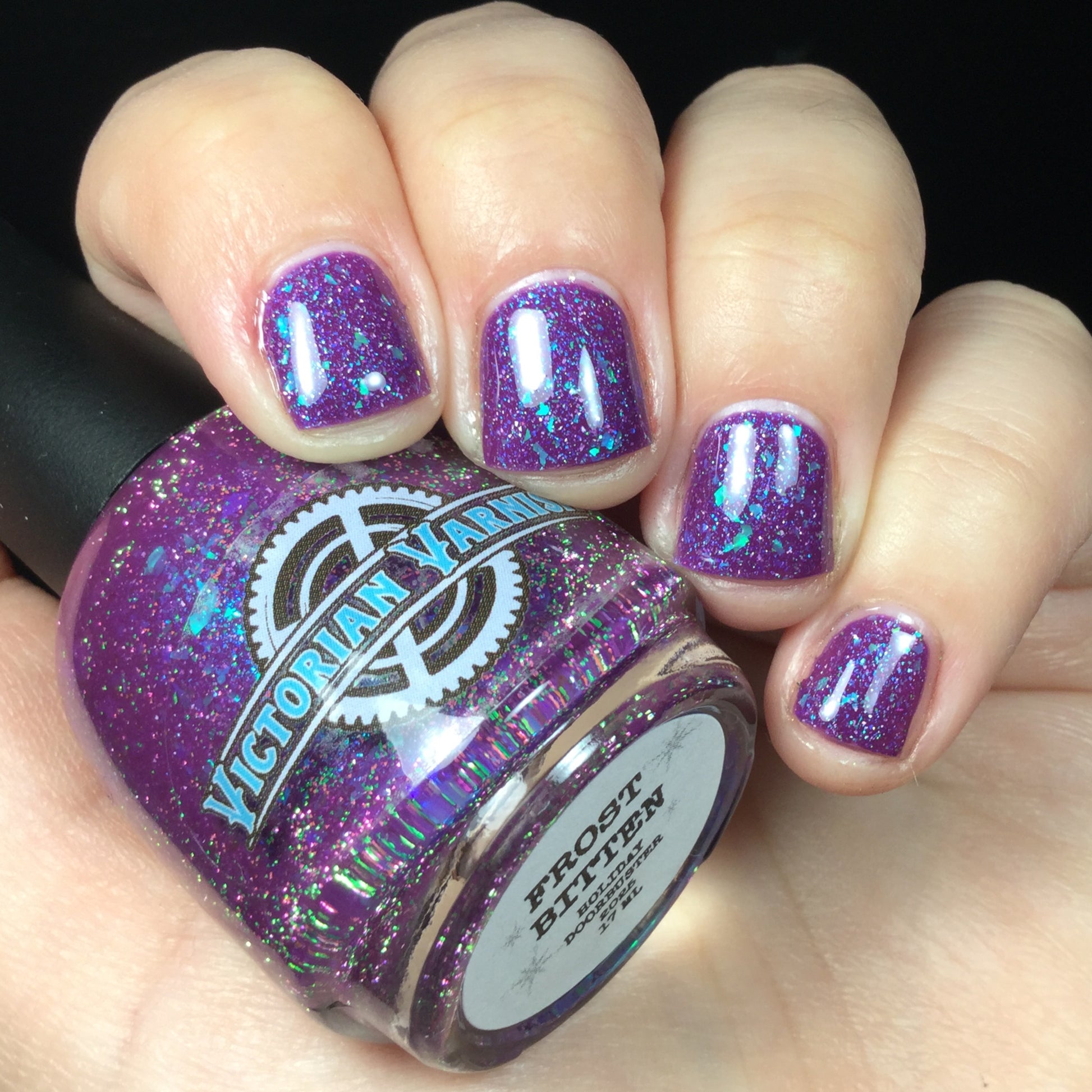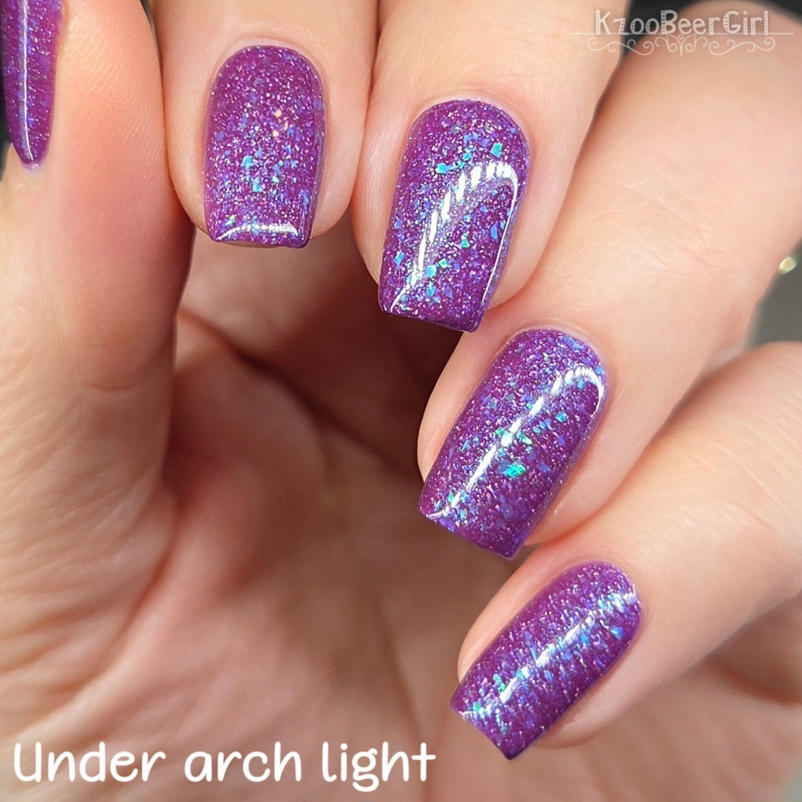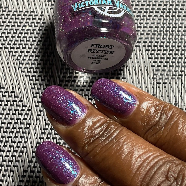 A winter berry purple with large particle aqua/blue/purple shimmer with frosty flakes in aquas/blues/greens/purples and a hint of icy micro holo glitters and reflective glitters