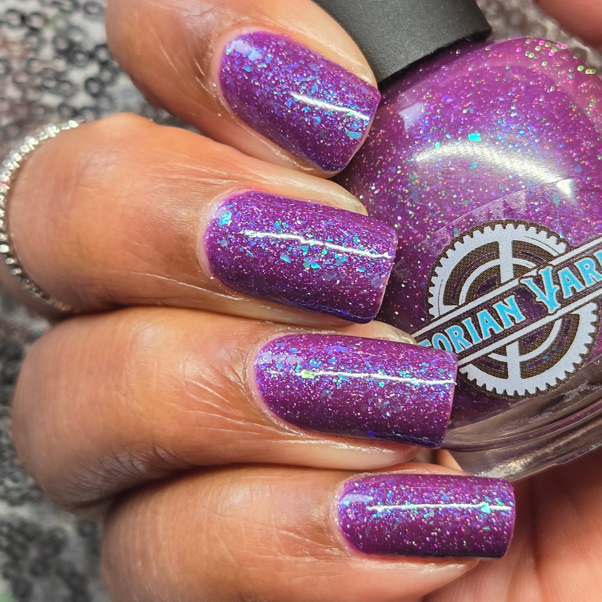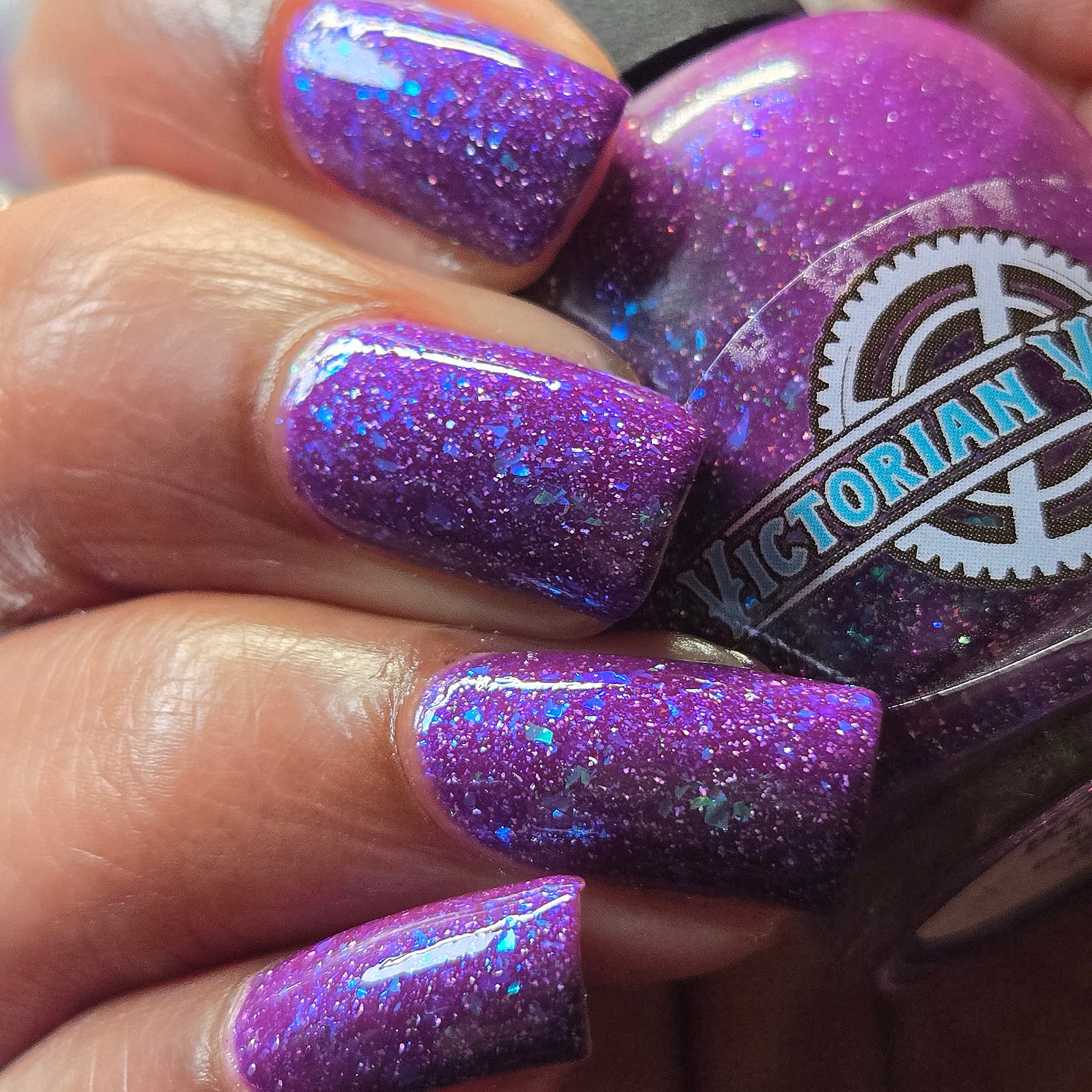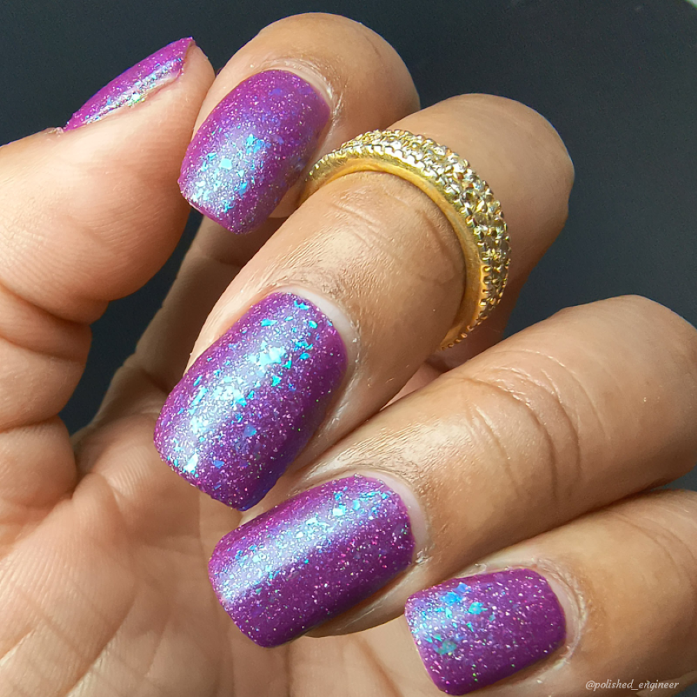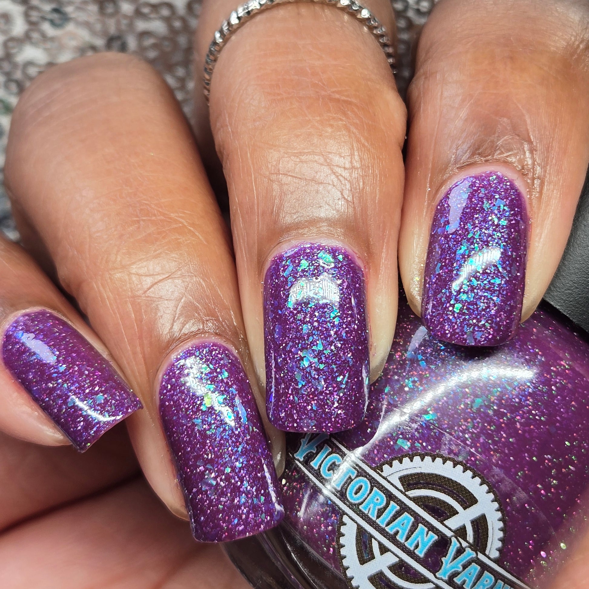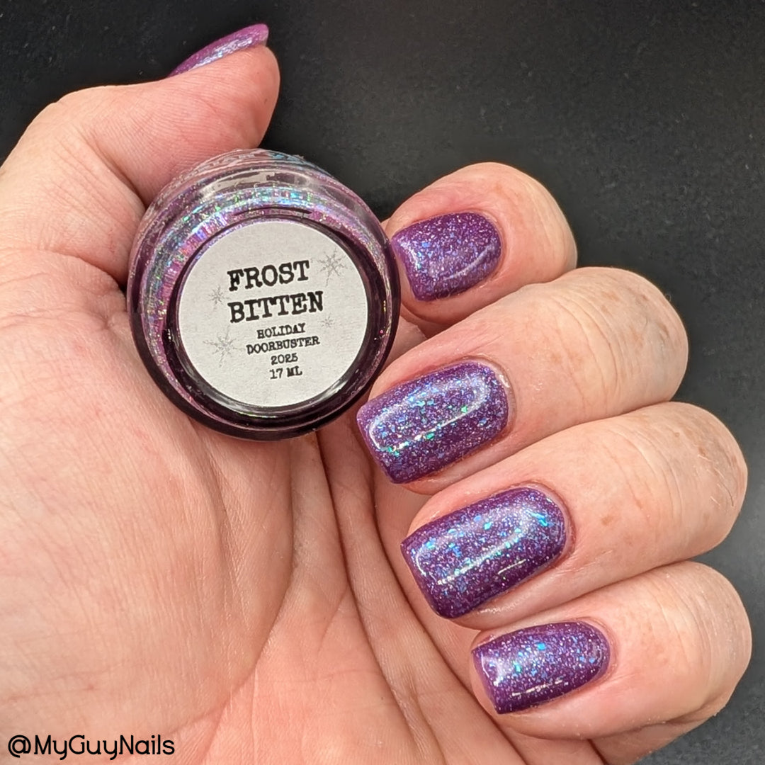 A winter berry purple with large particle aqua/blue/purple shimmer with frosty flakes in aquas/blues/greens/purples and a hint of icy micro holo glitters and reflective glitters