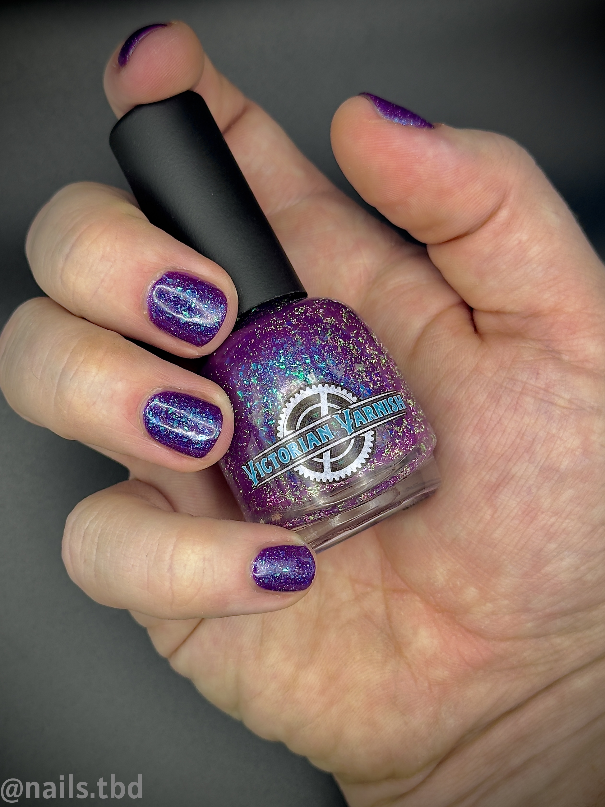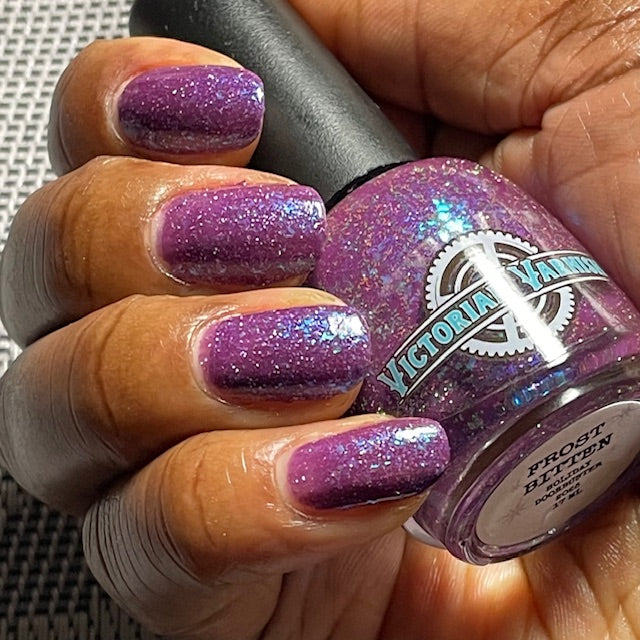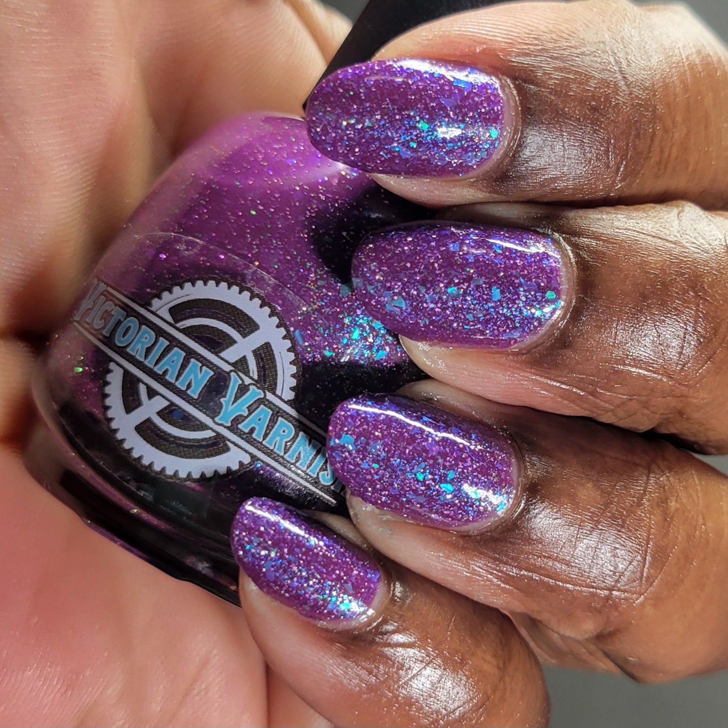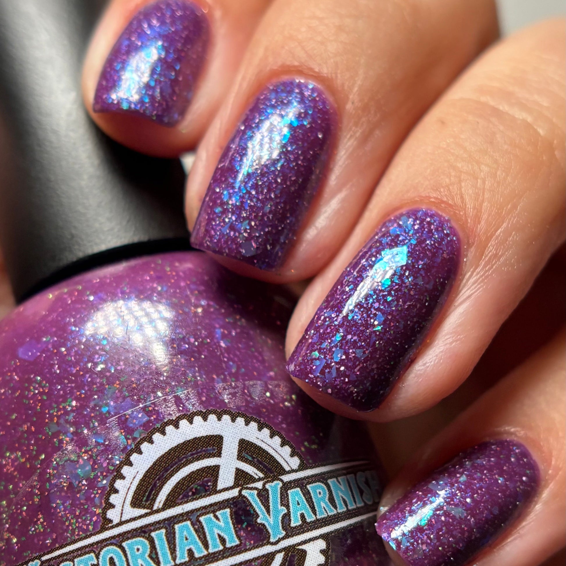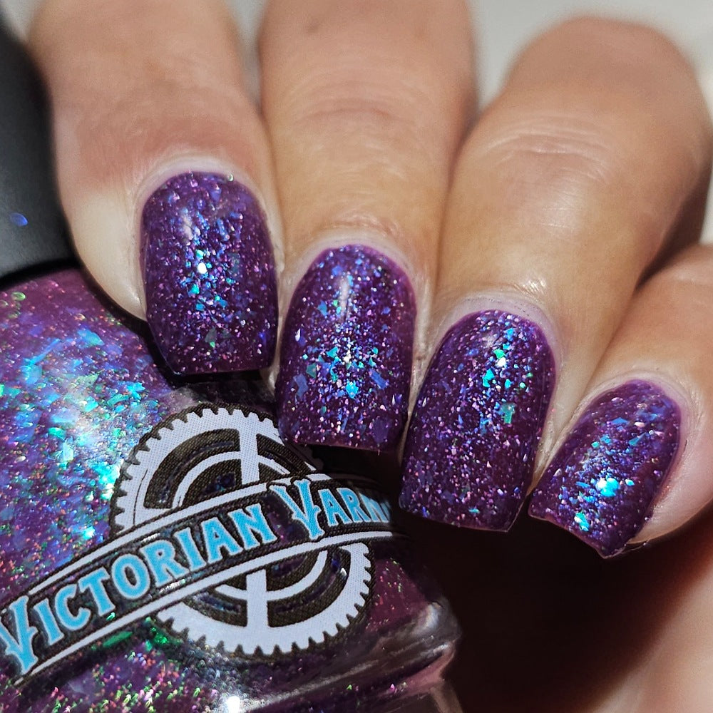 A winter berry purple with large particle aqua/blue/purple shimmer with frosty flakes in aquas/blues/greens/purples and a hint of icy micro holo glitters and reflective glitters
