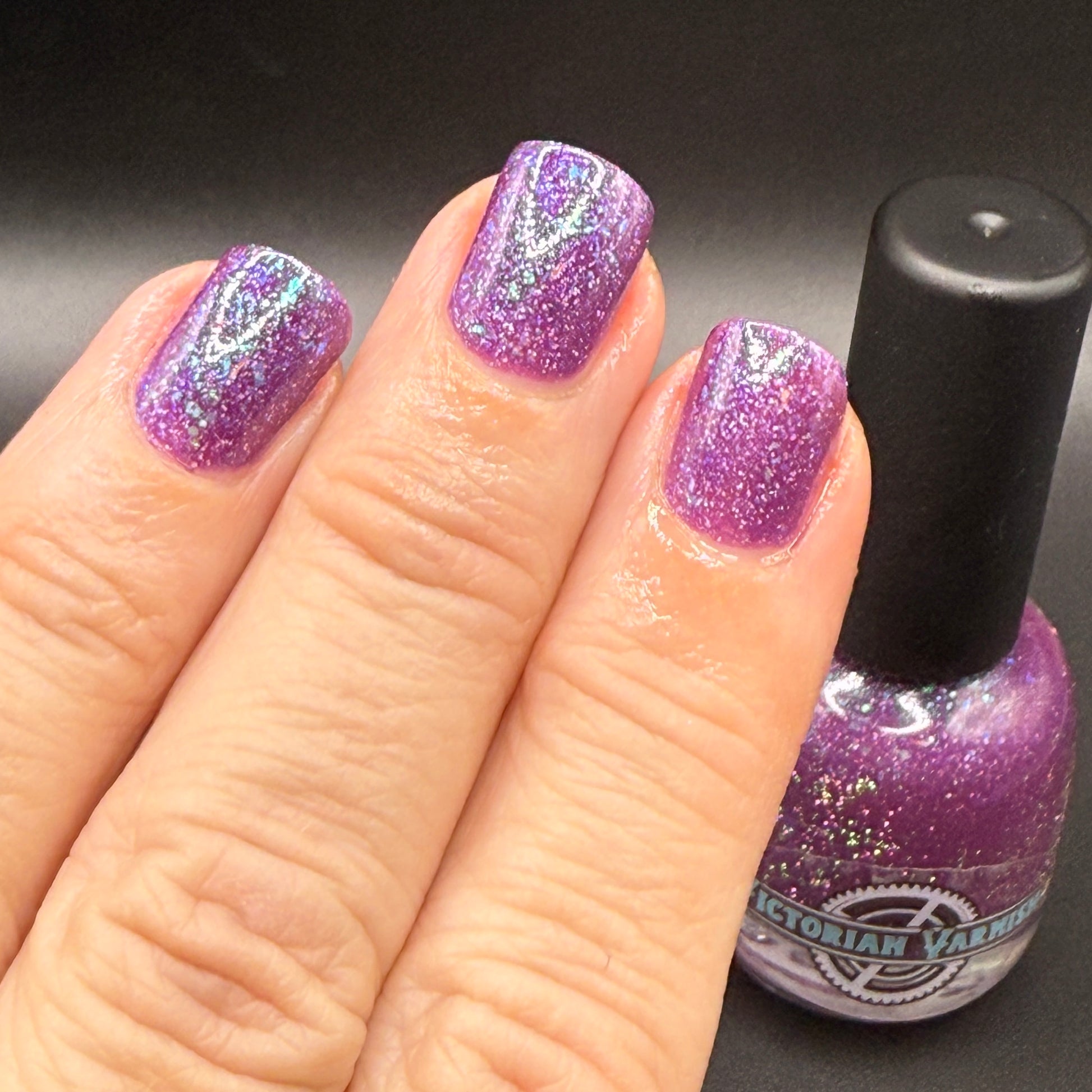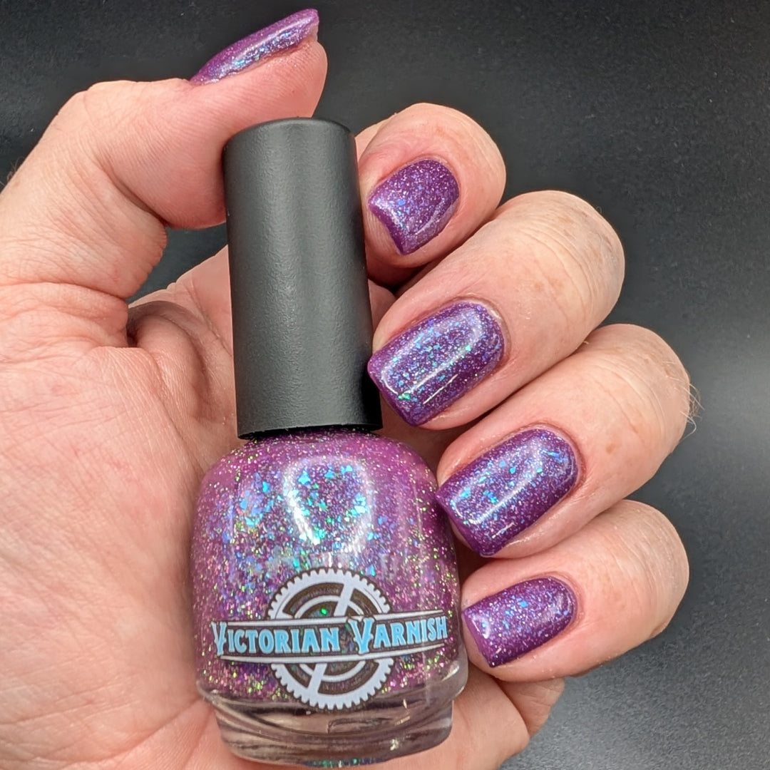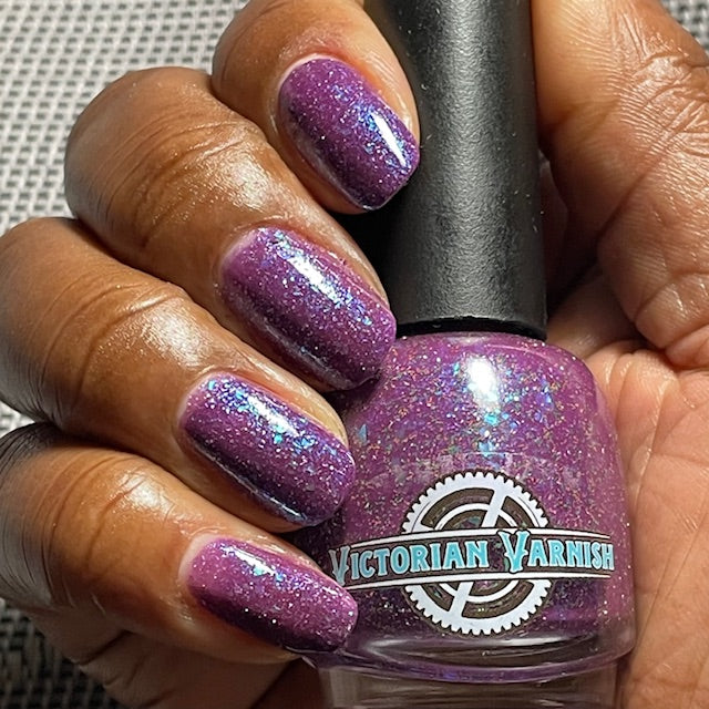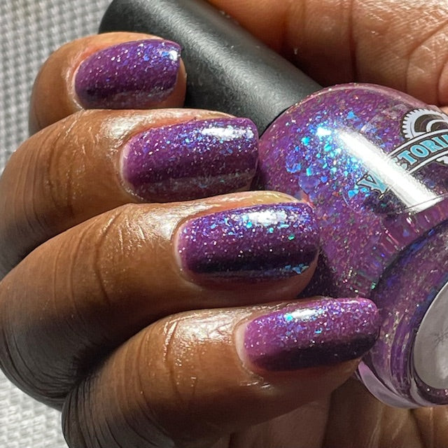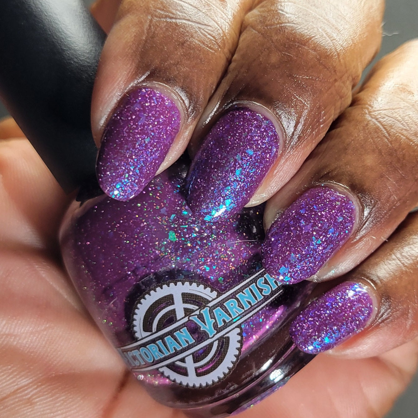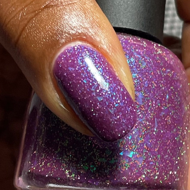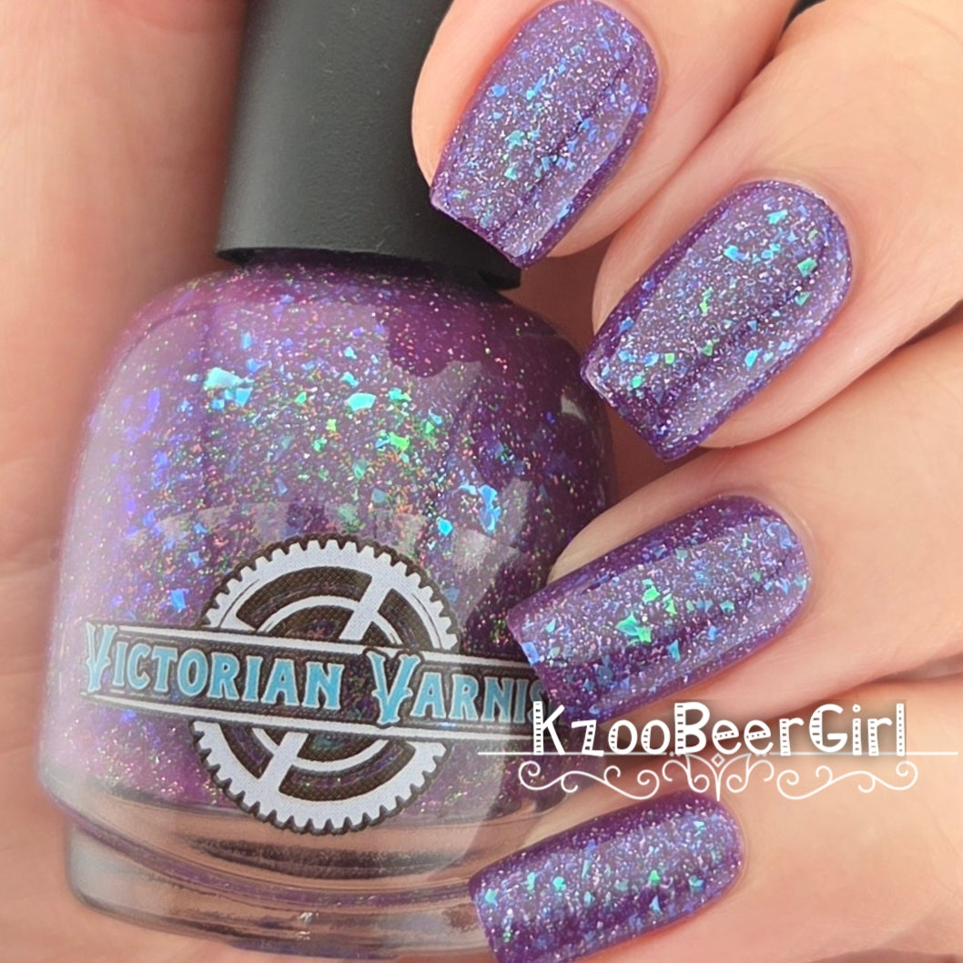 A winter berry purple with large particle aqua/blue/purple shimmer with frosty flakes in aquas/blues/greens/purples and a hint of icy micro holo glitters and reflective glitters