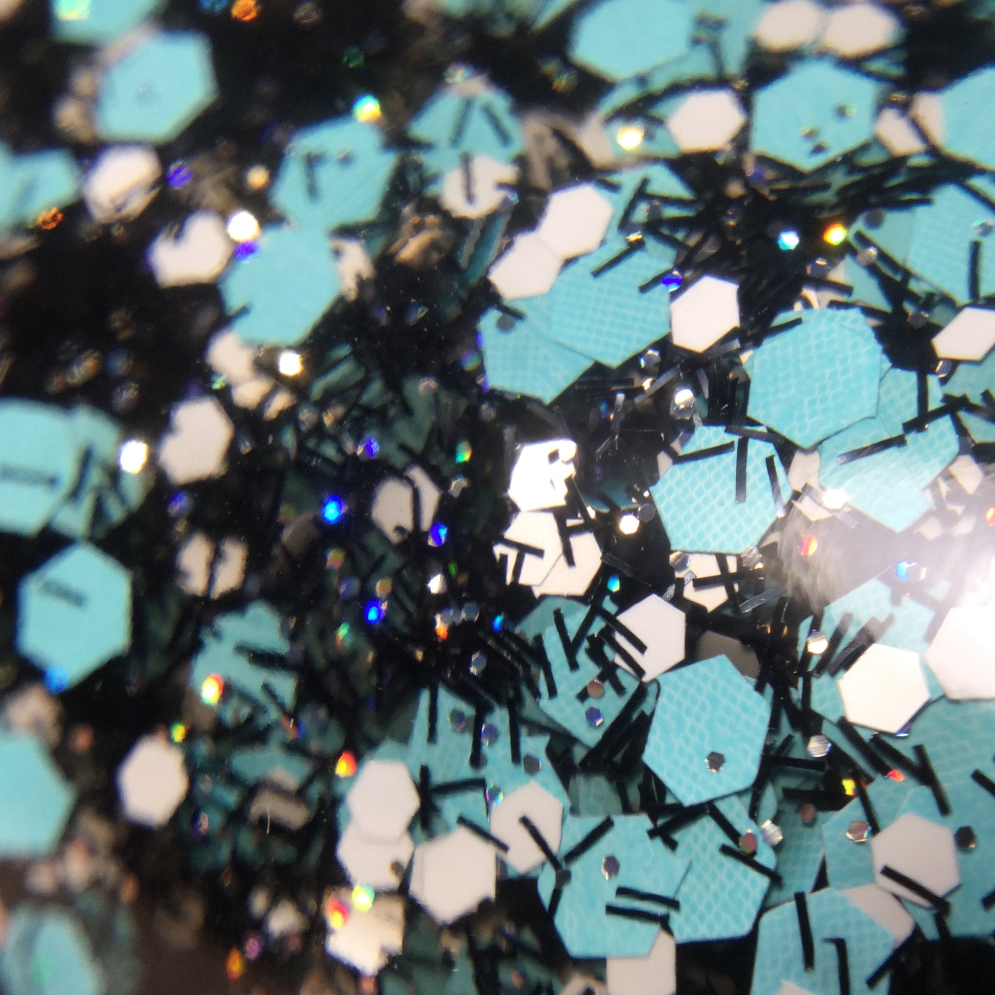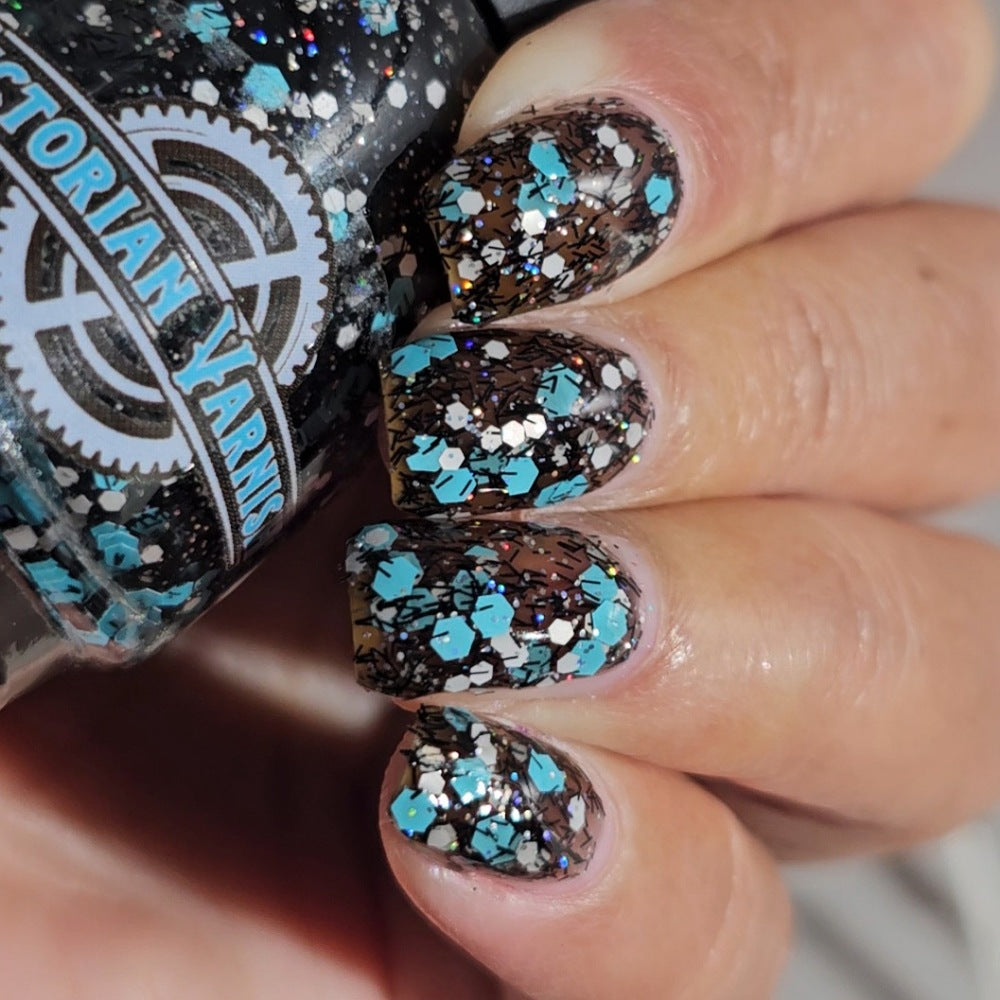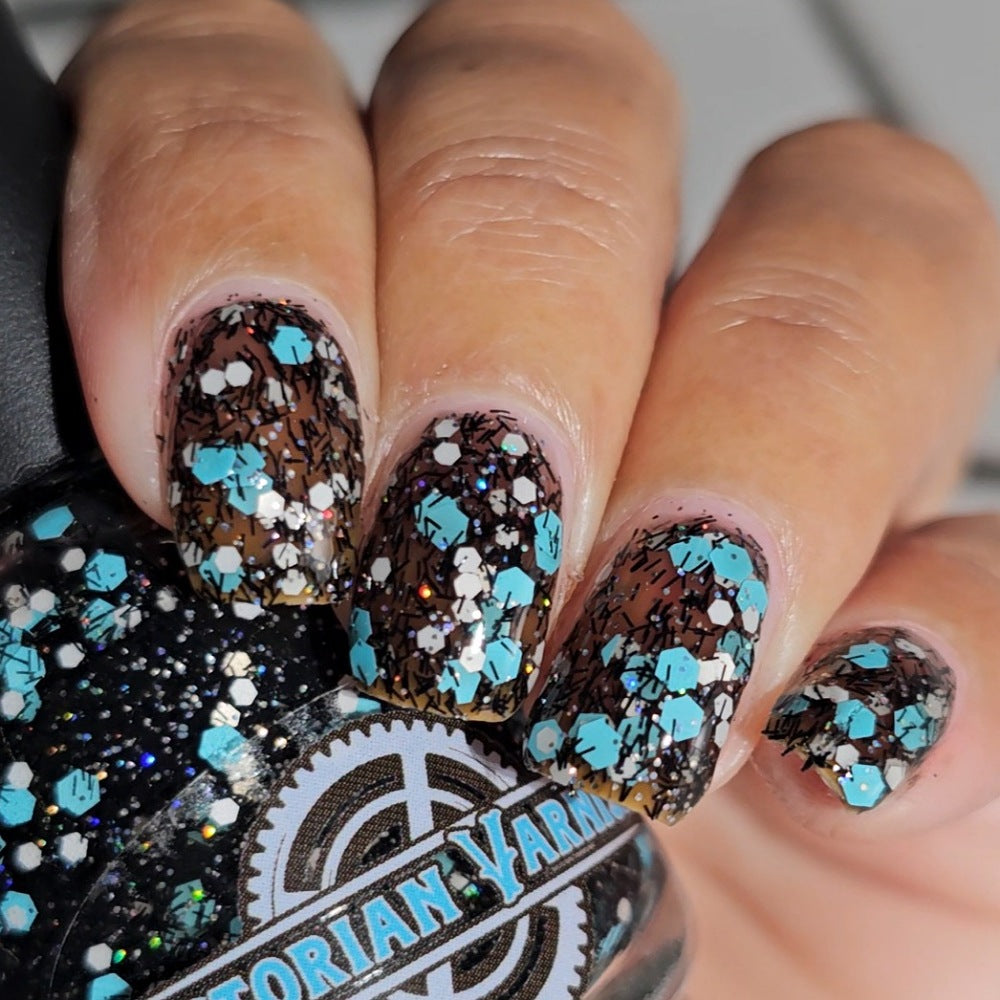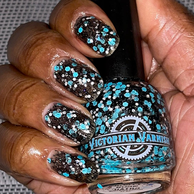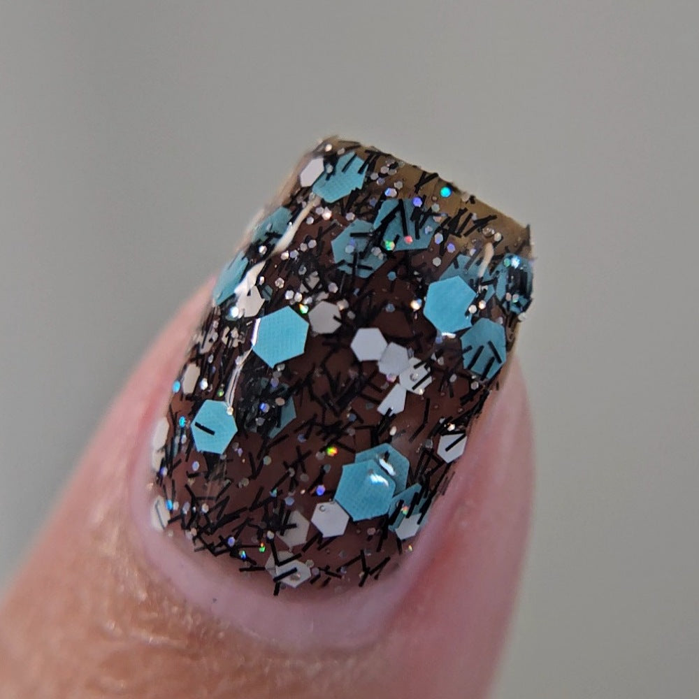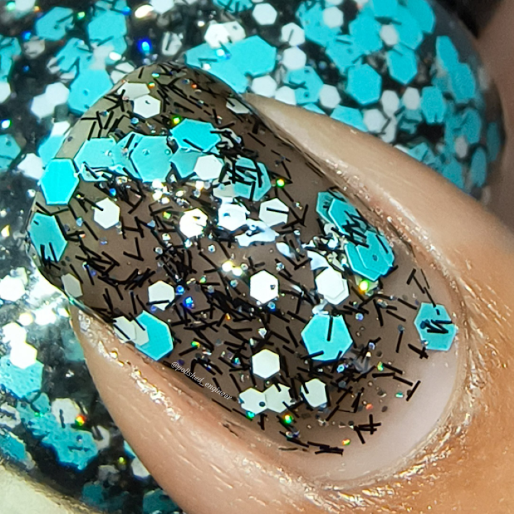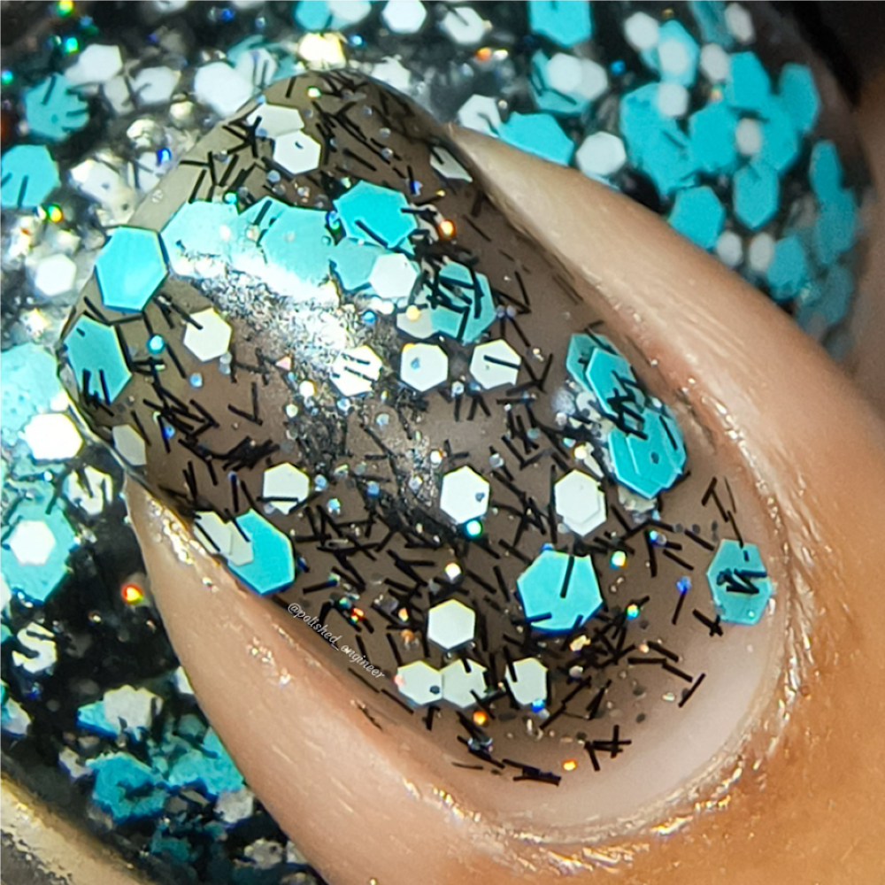 A black jelly base with black micro shreds, frosty blue glitter, white glitters and silver micro holo.