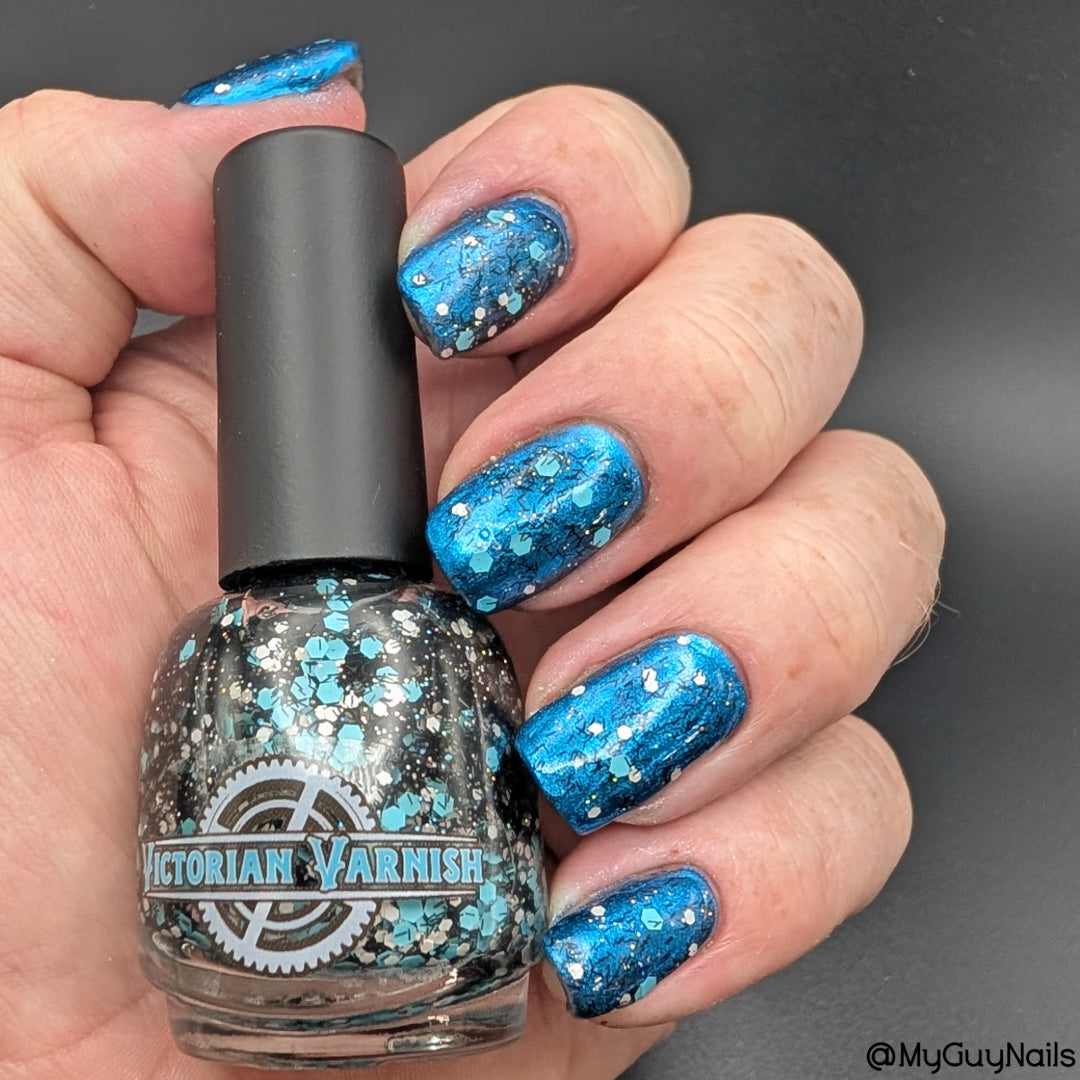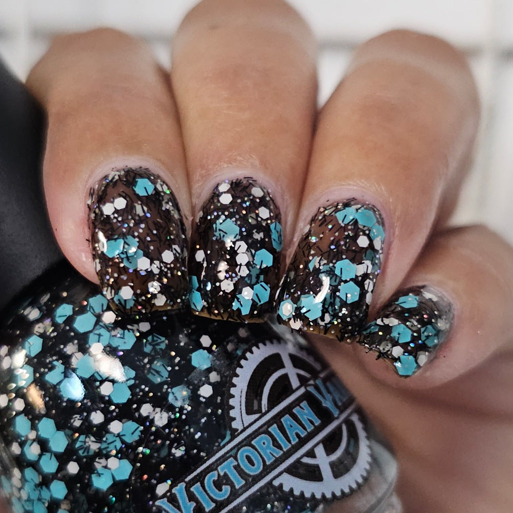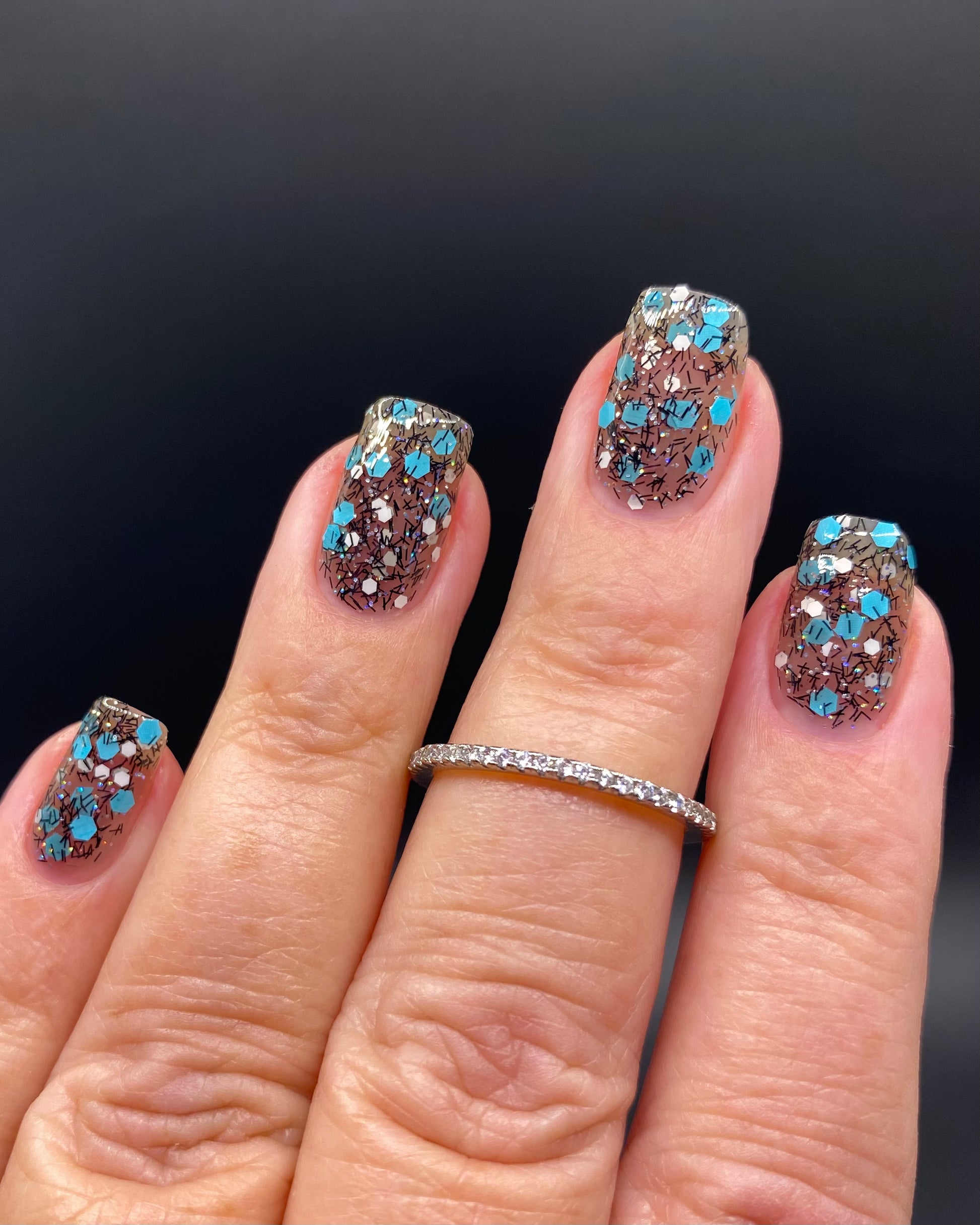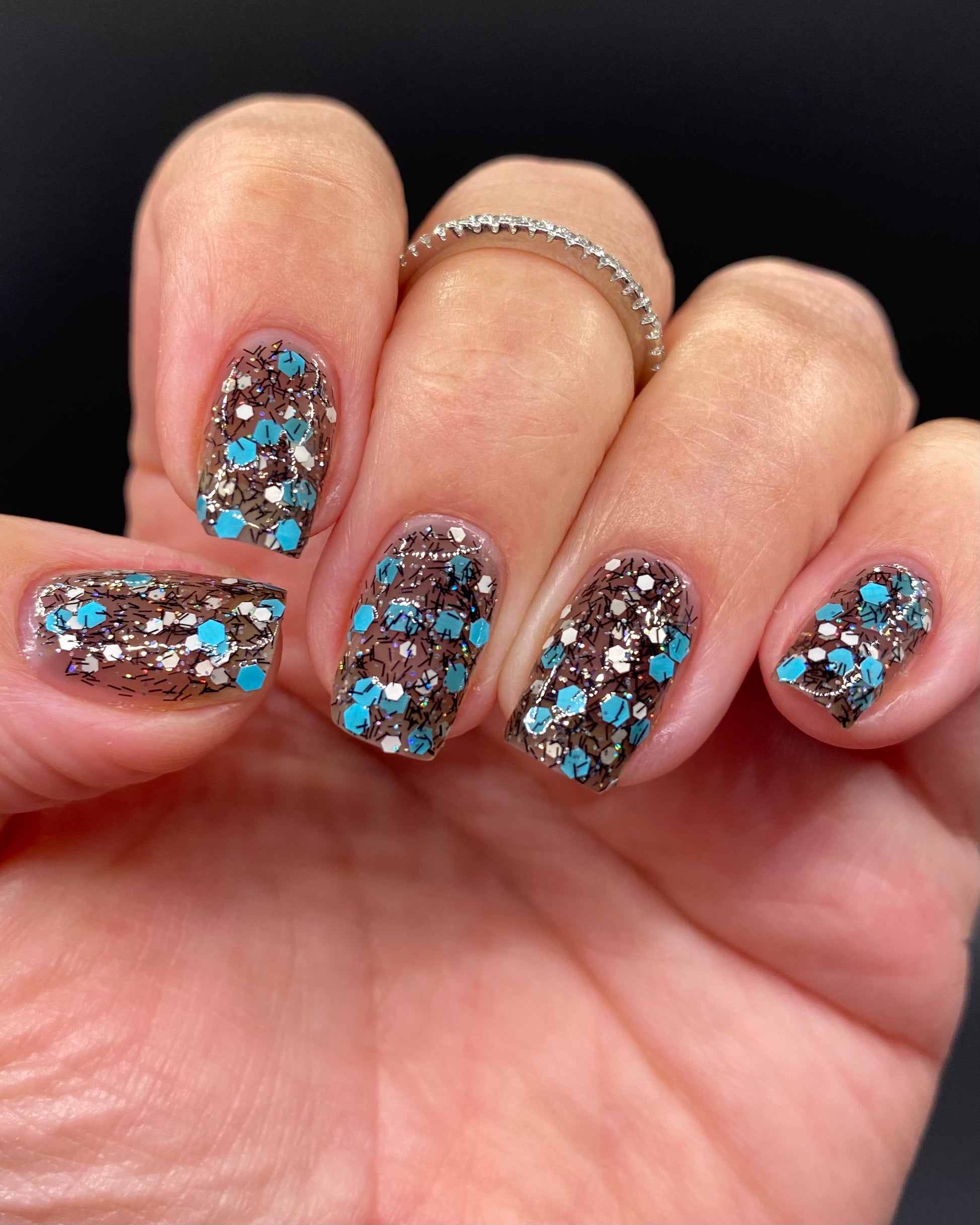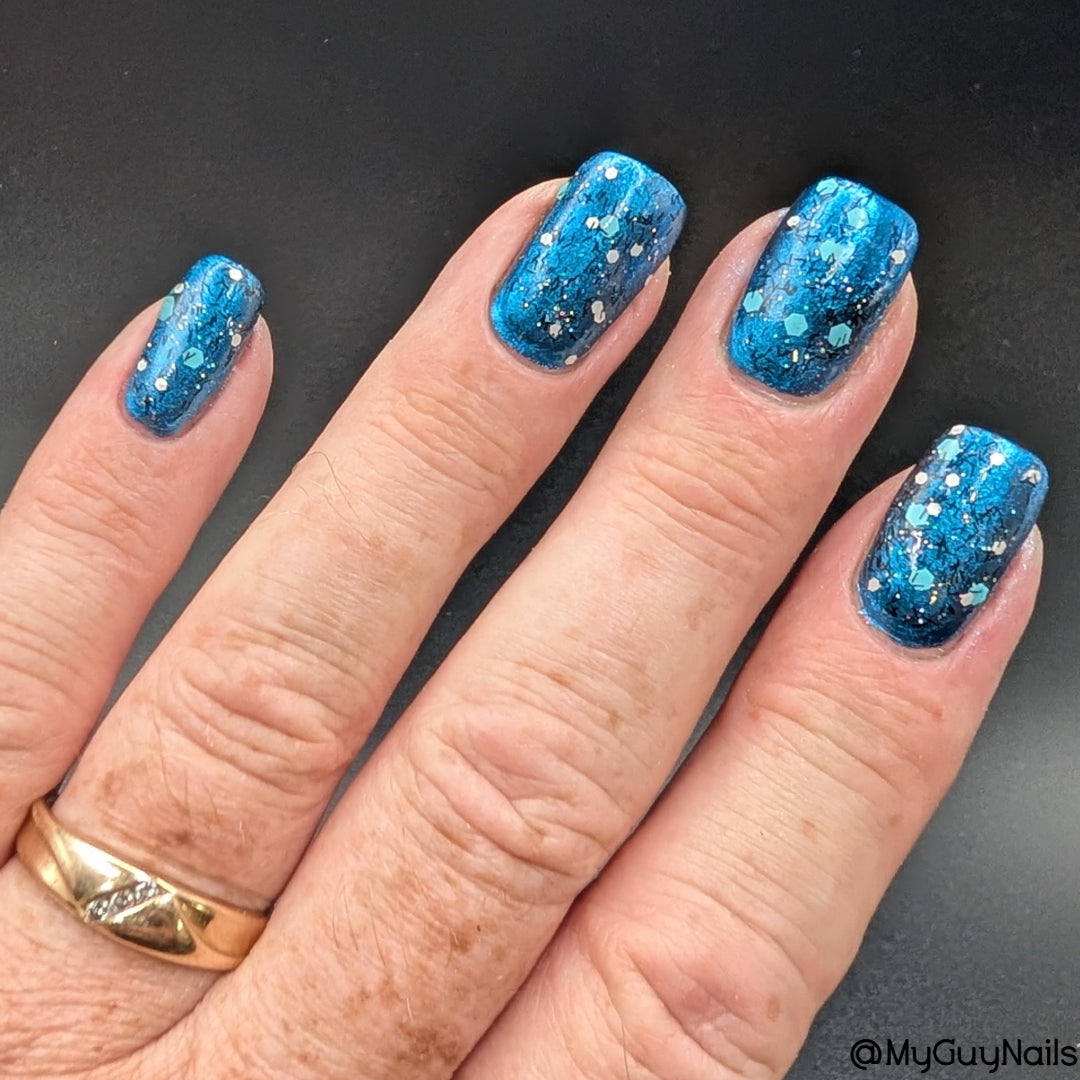 A black jelly base with black micro shreds, frosty blue glitter, white glitters and silver micro holo.