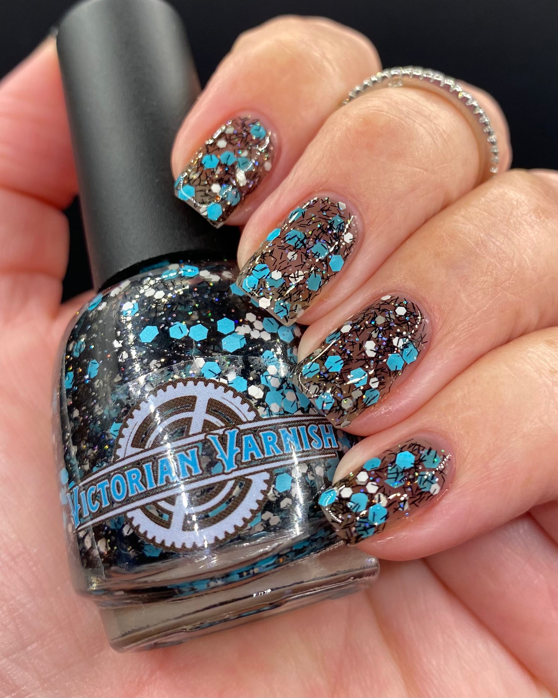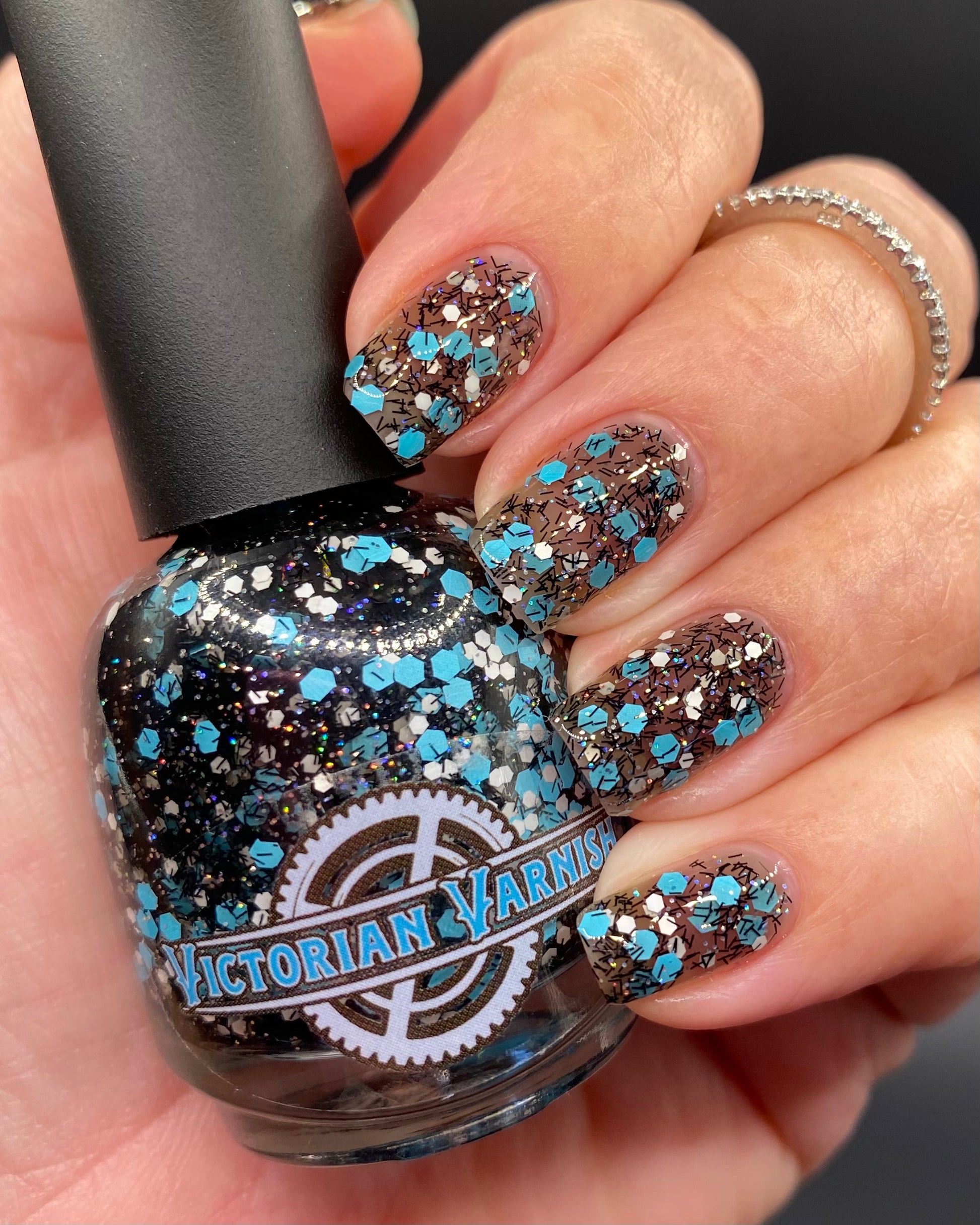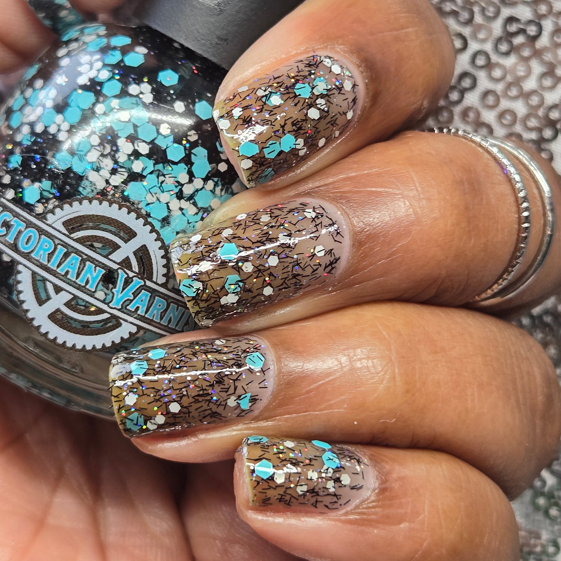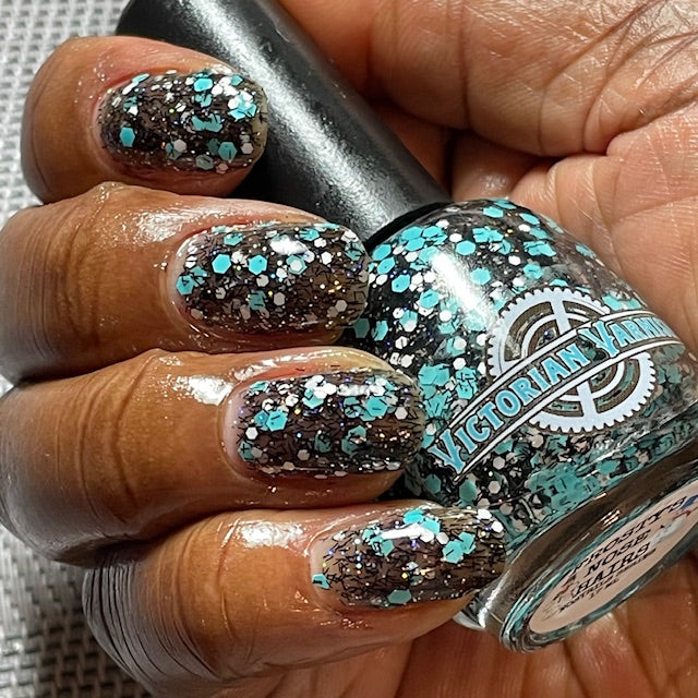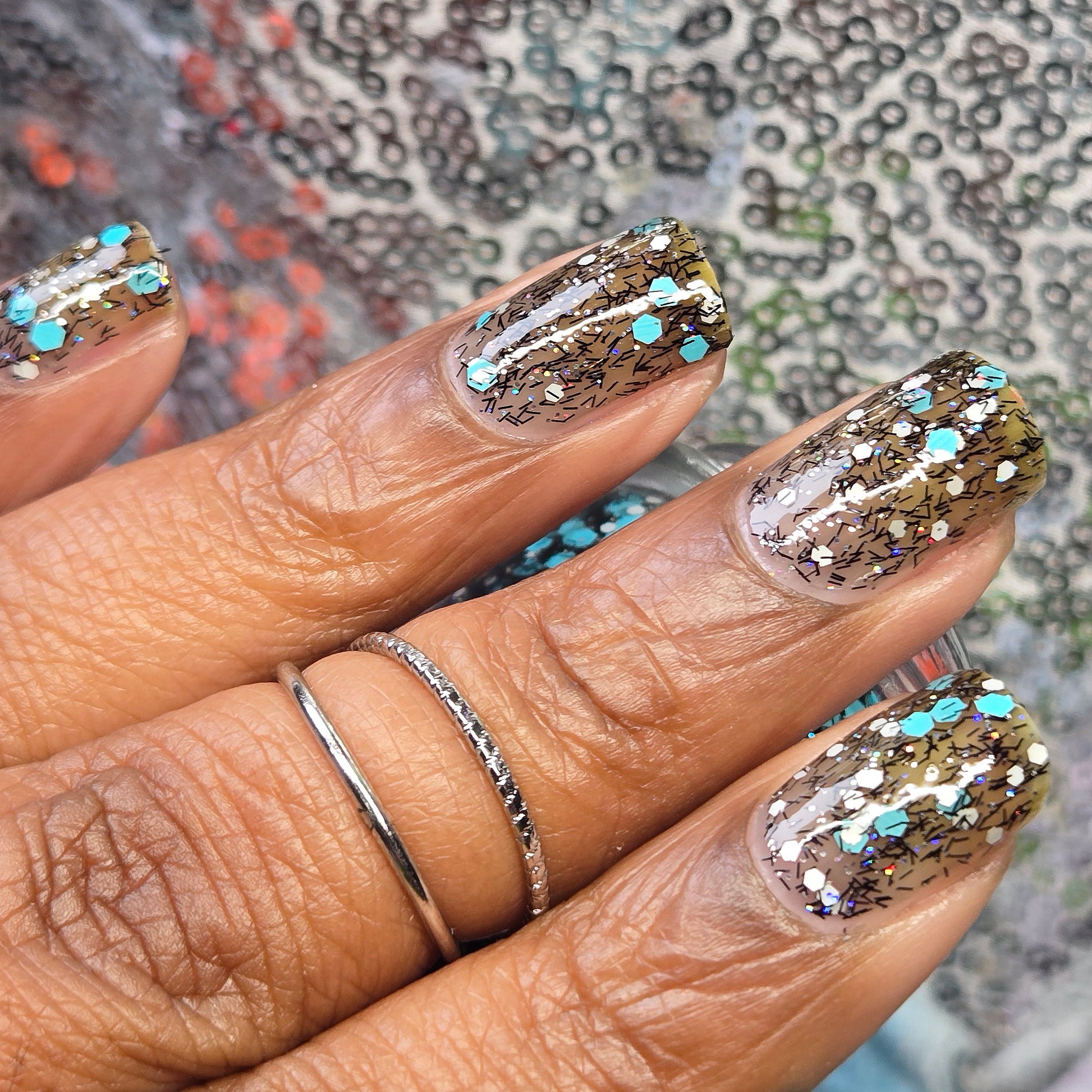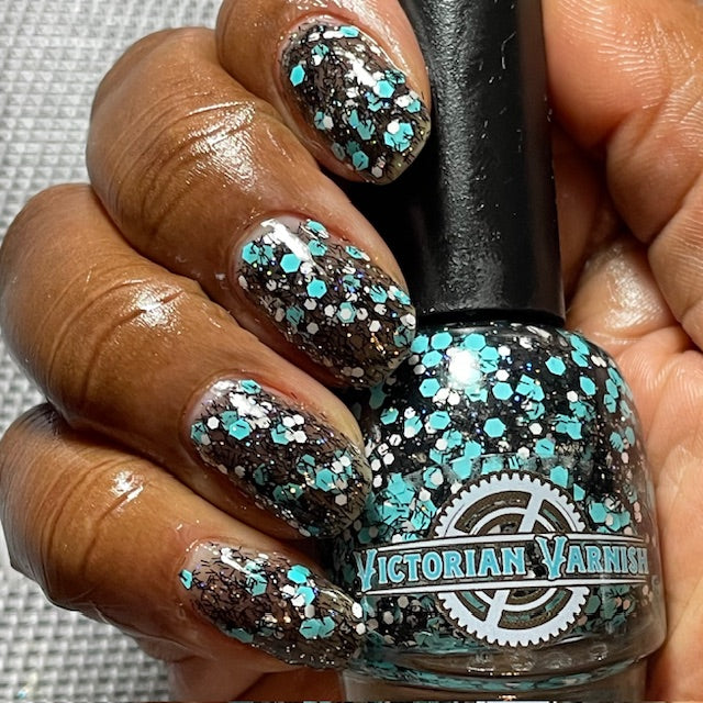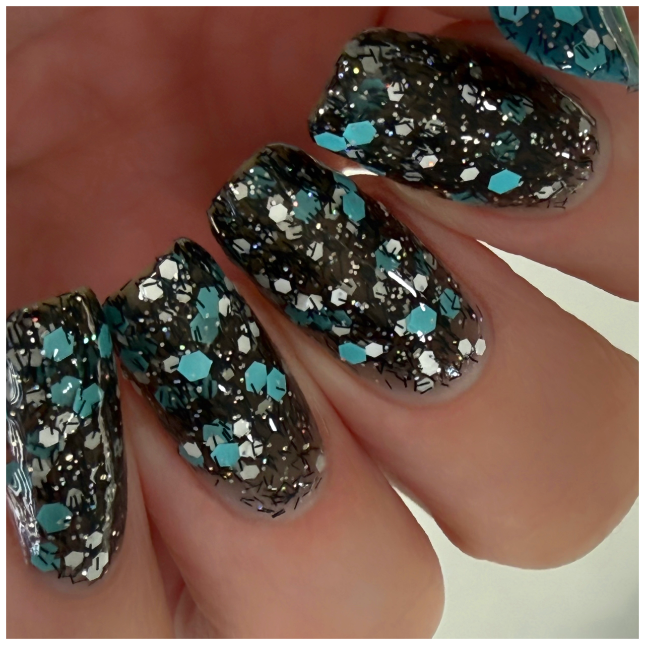 A black jelly base with black micro shreds, frosty blue glitter, white glitters and silver micro holo.