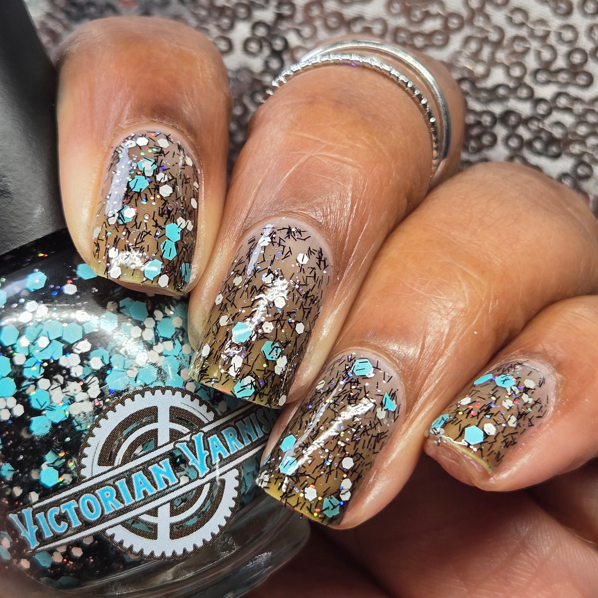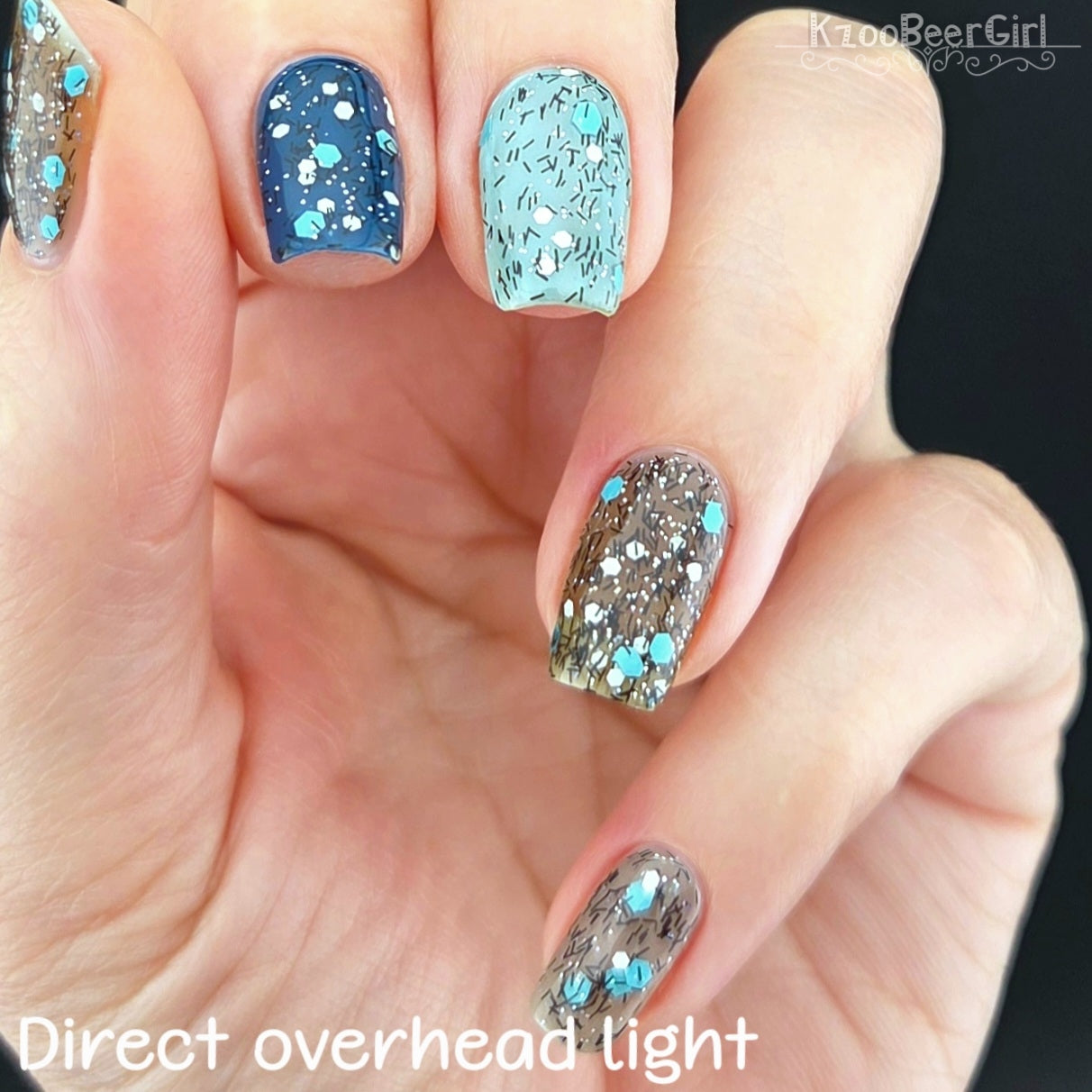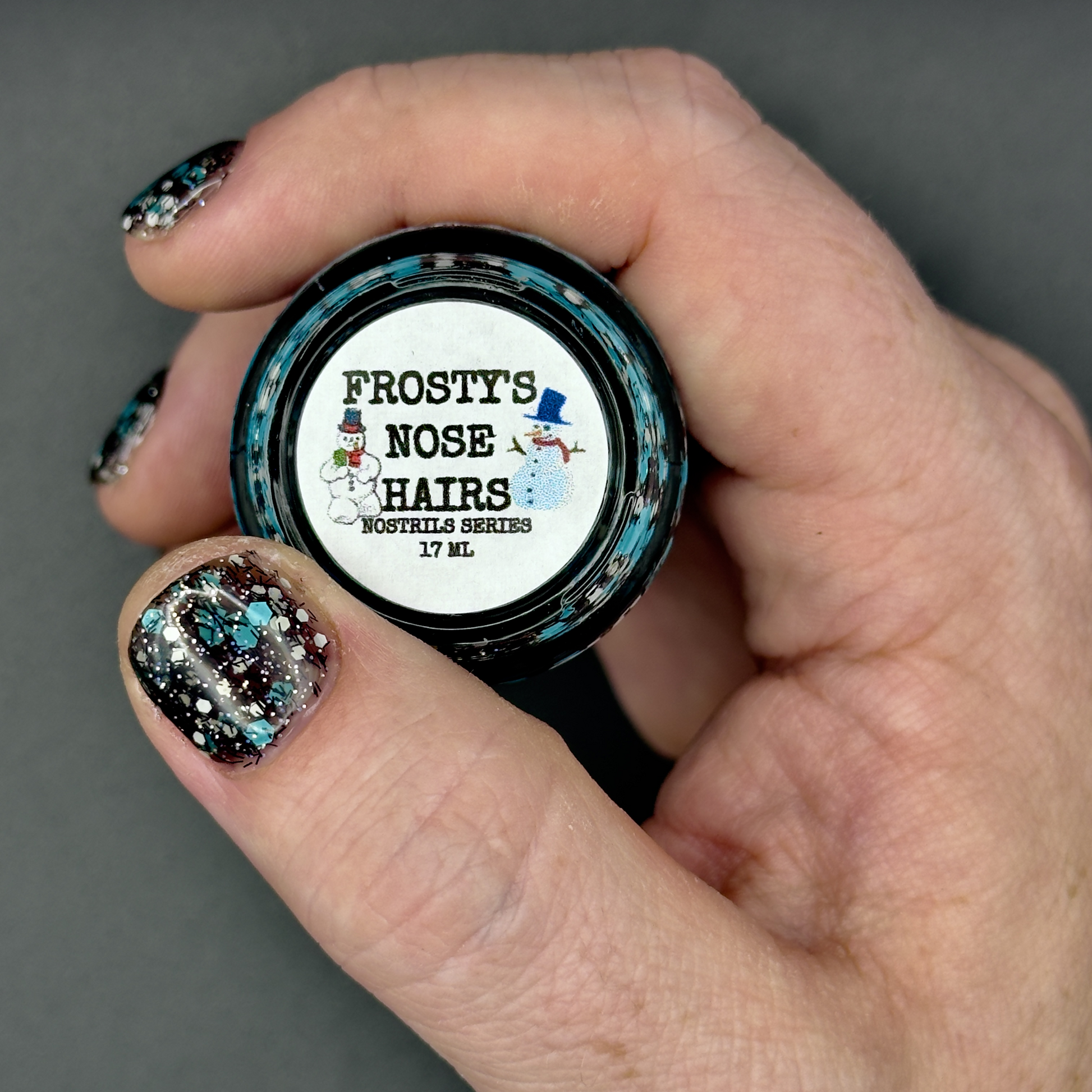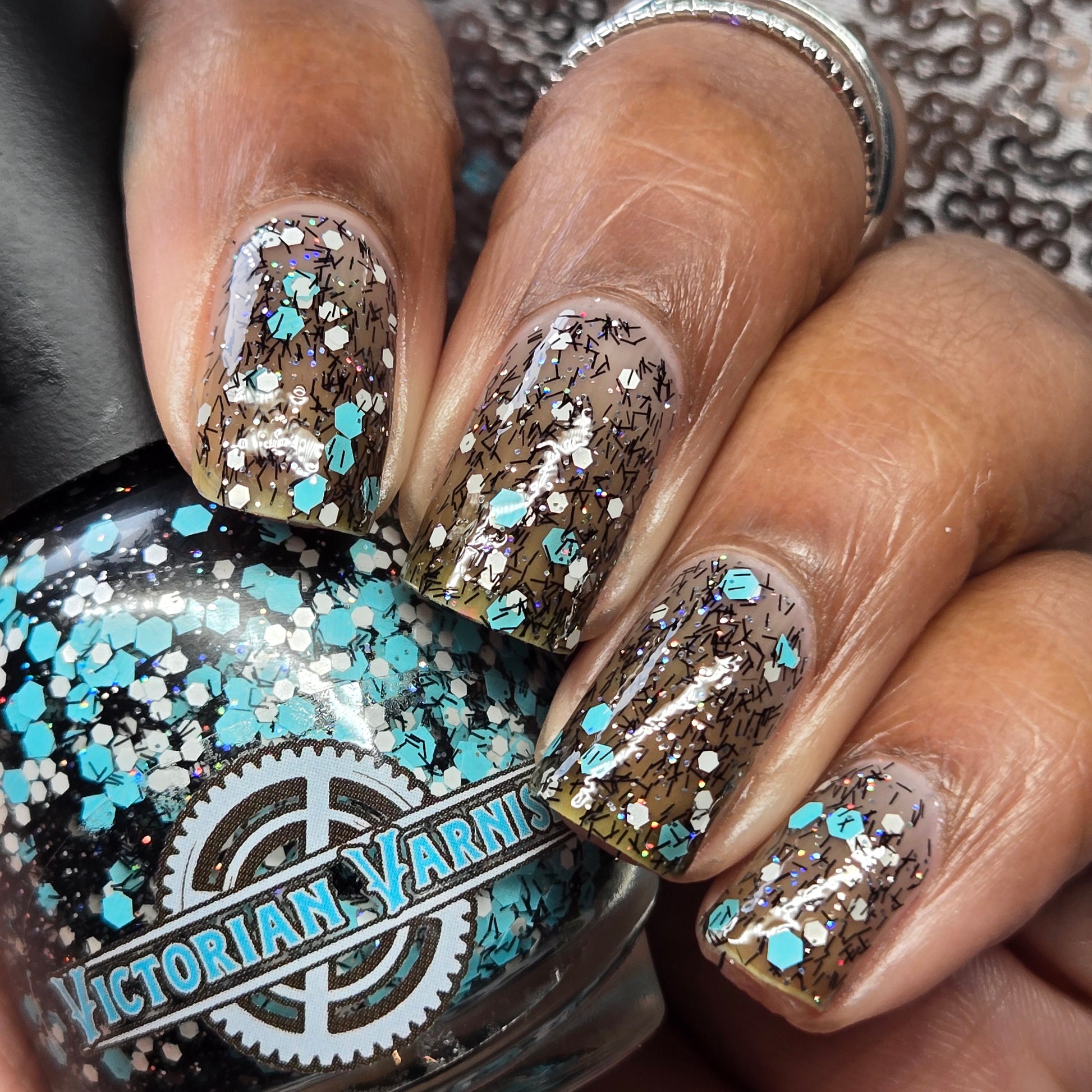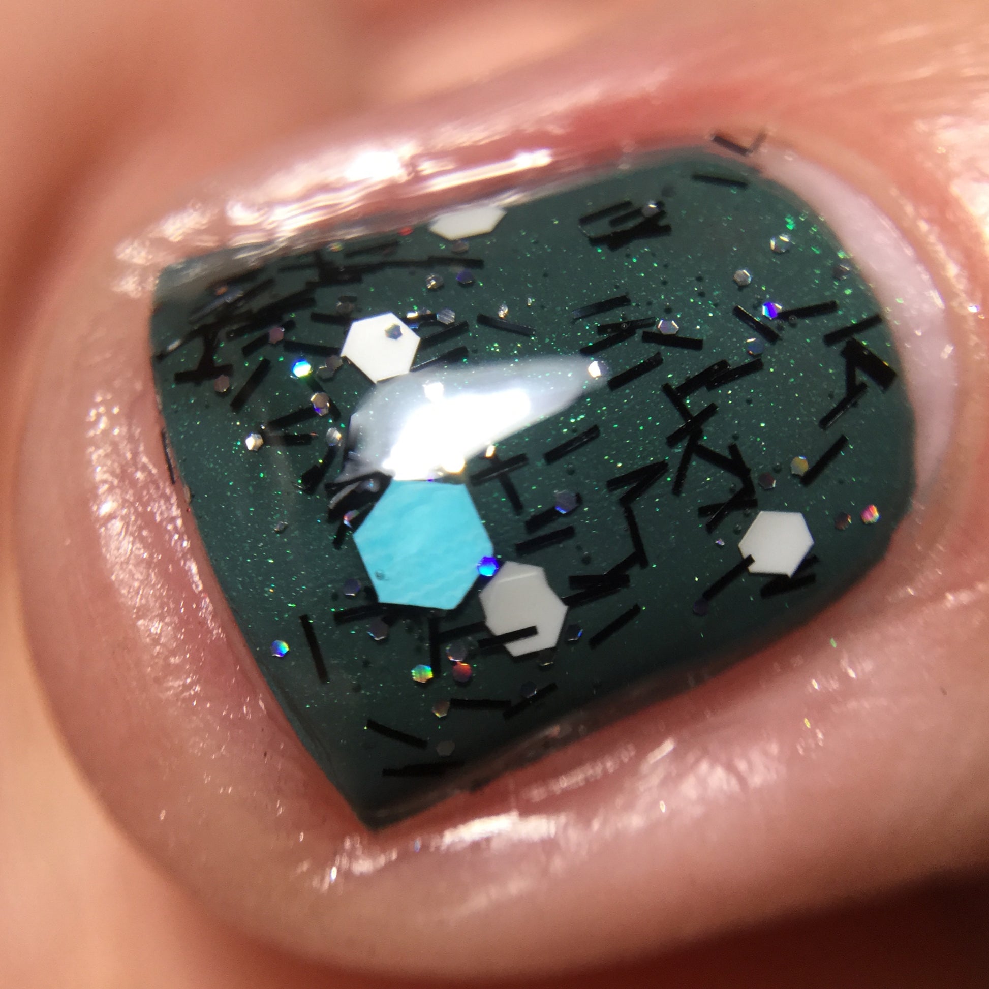 A black jelly base with black micro shreds, frosty blue glitter, white glitters and silver micro holo.