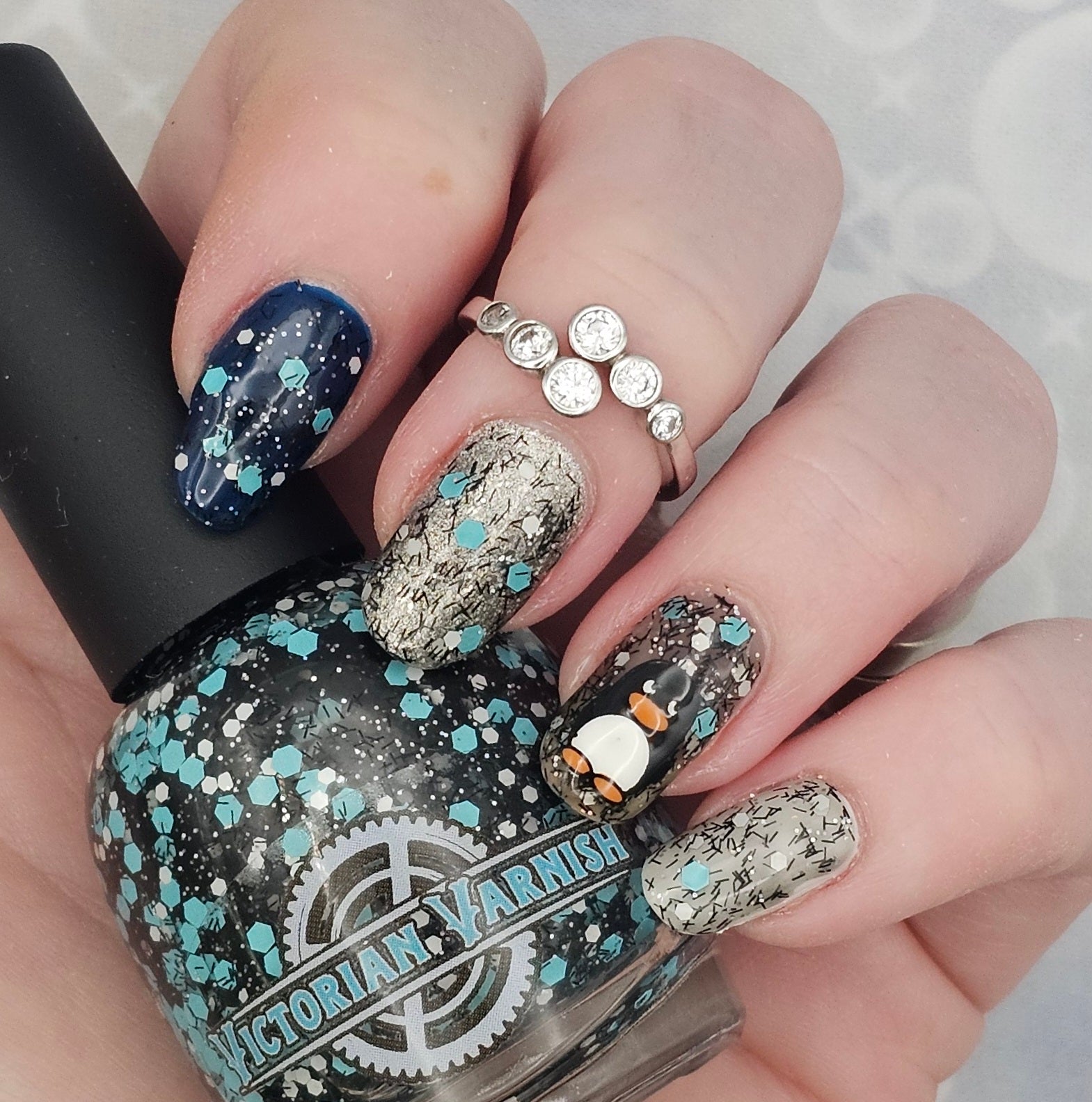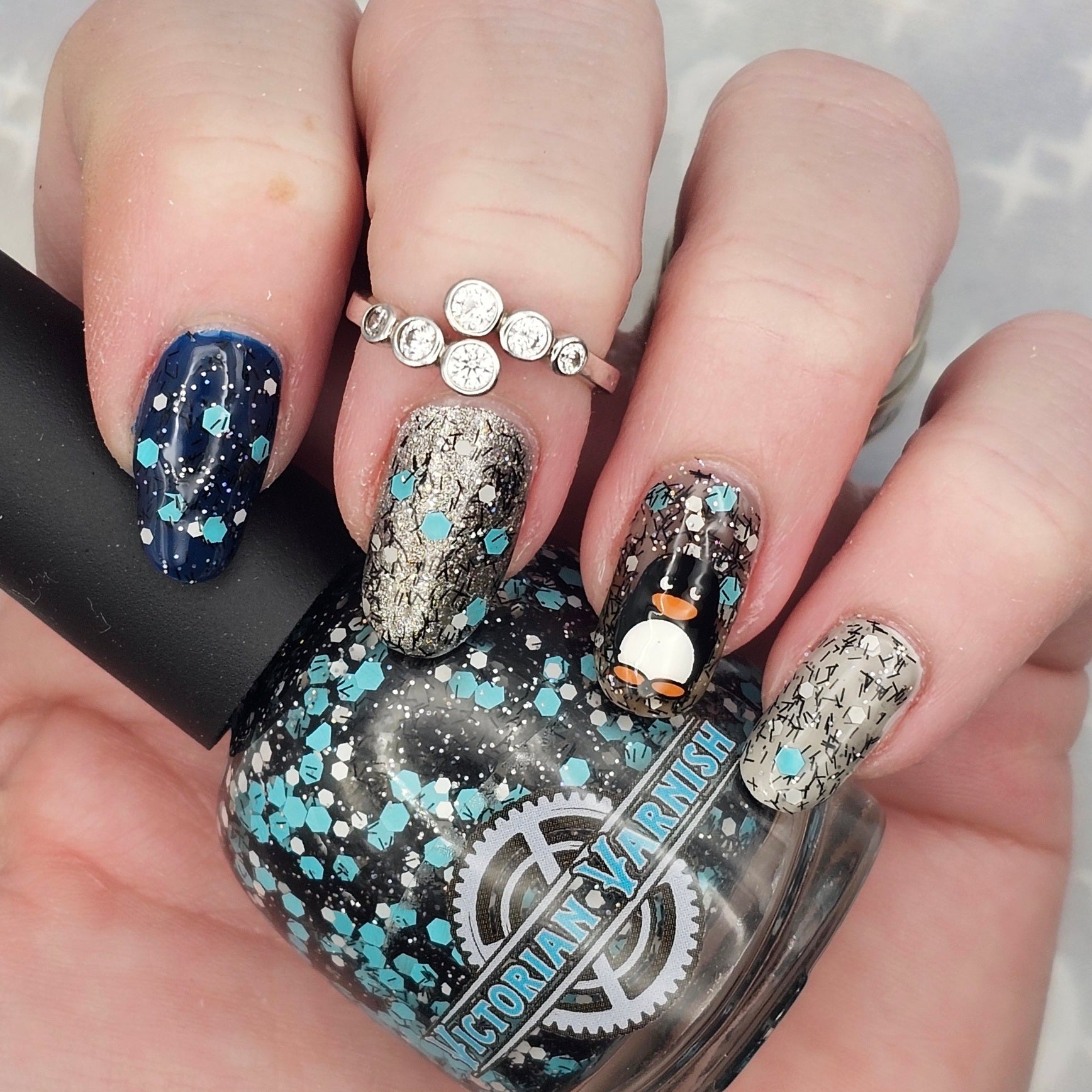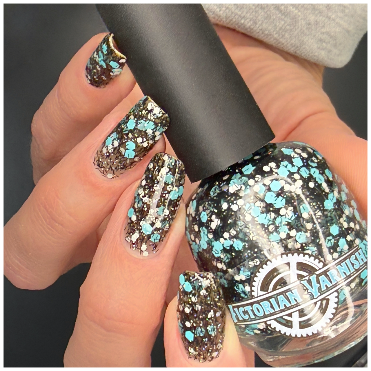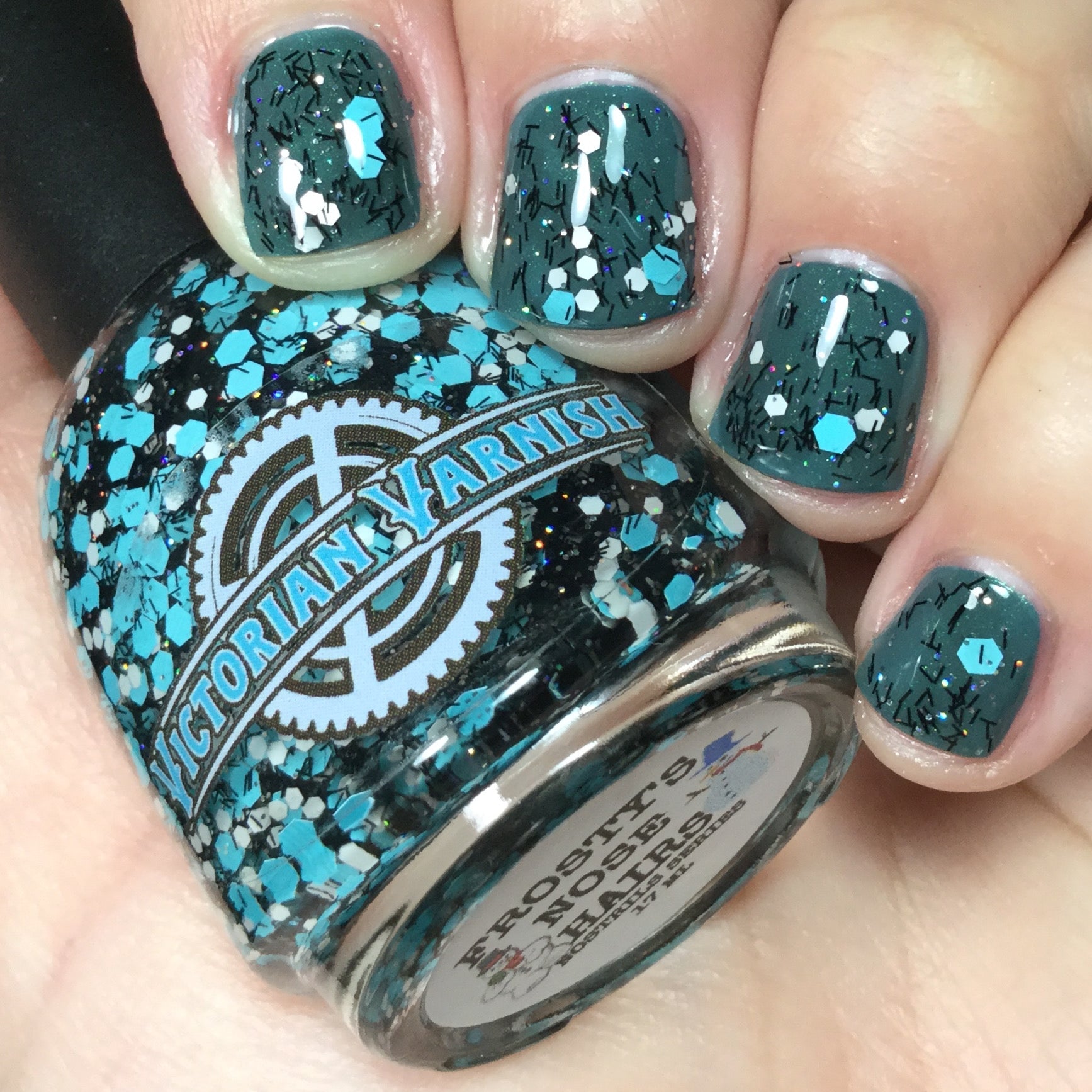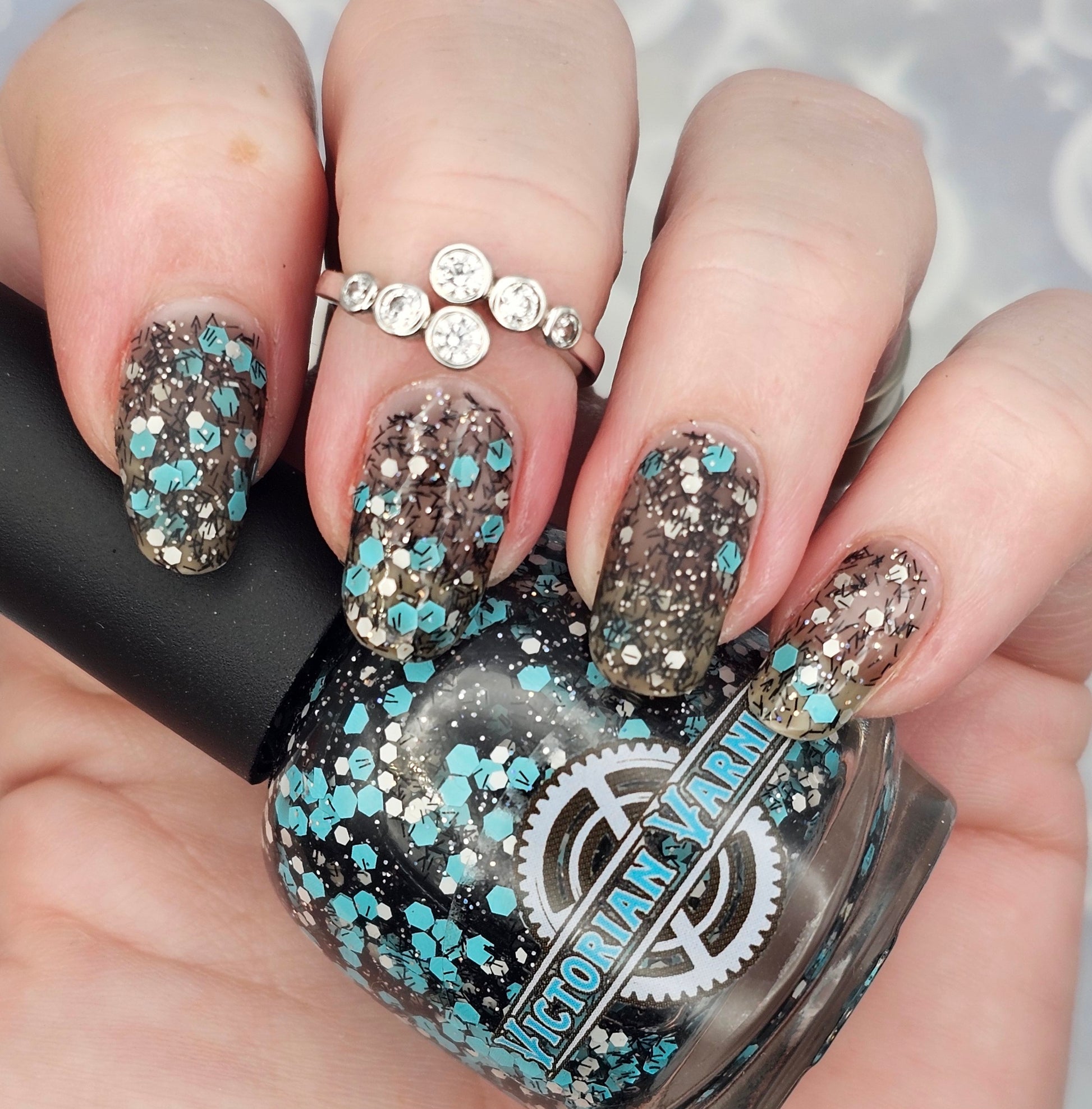 A black jelly base with black micro shreds, frosty blue glitter, white glitters and silver micro holo.