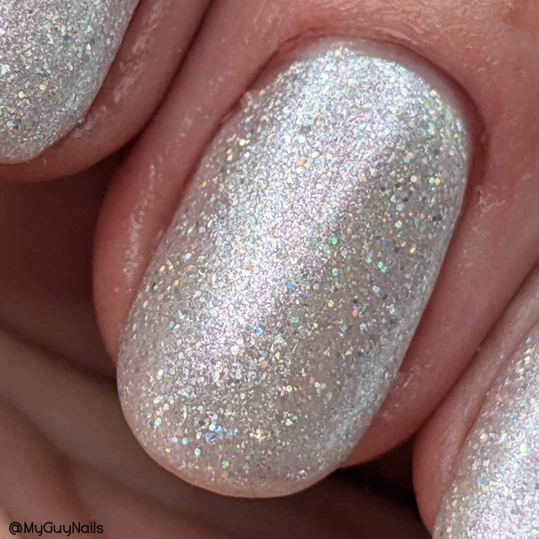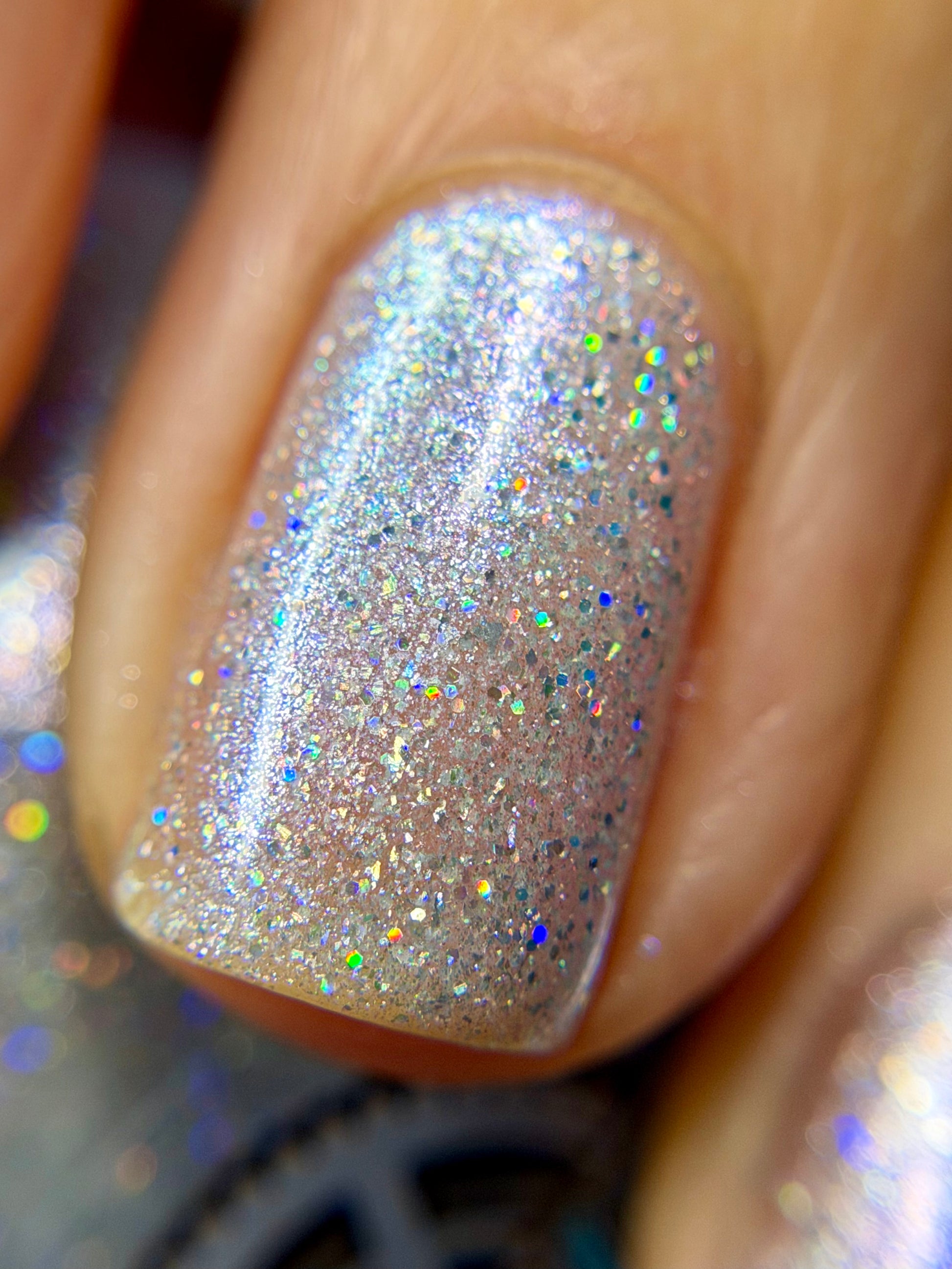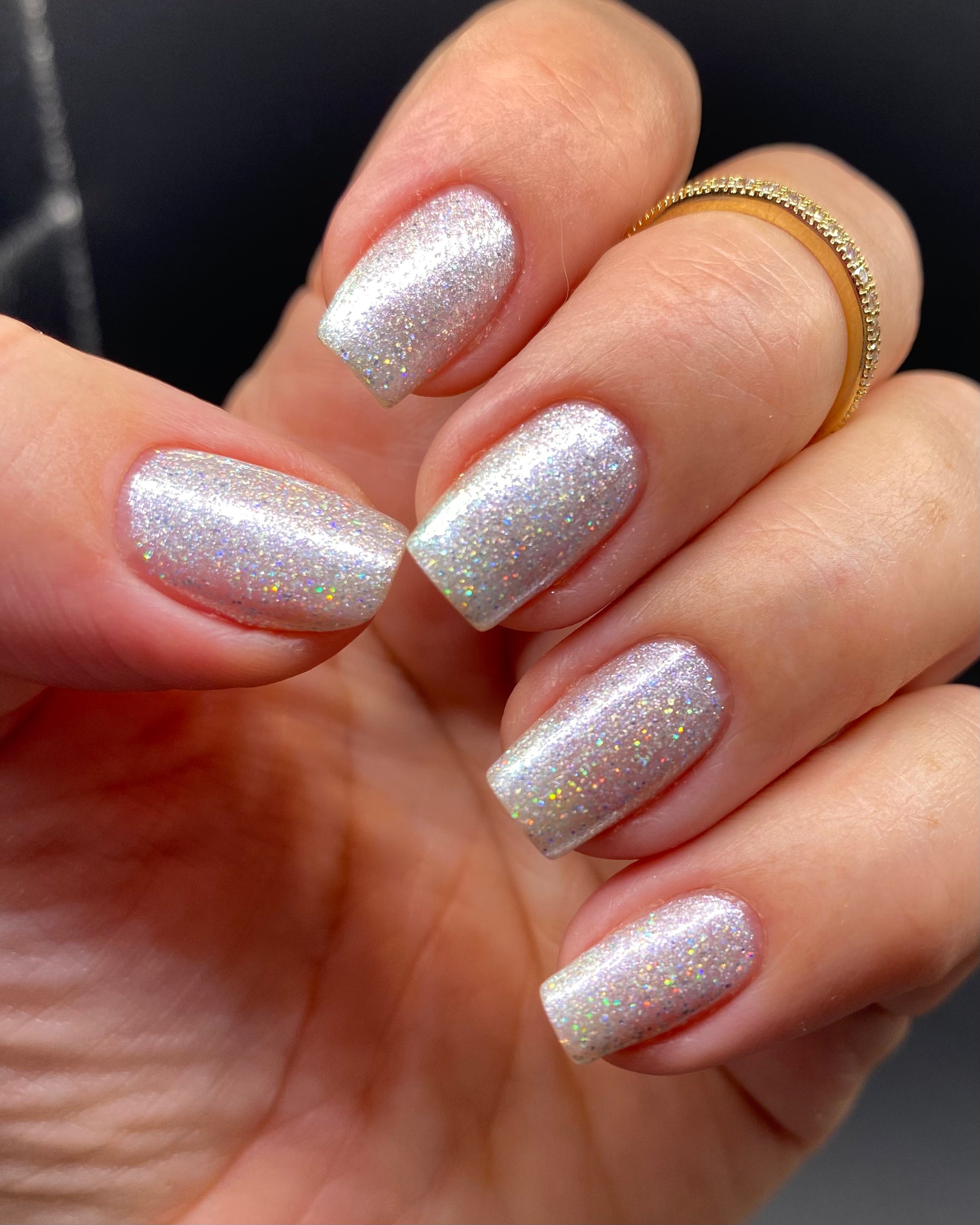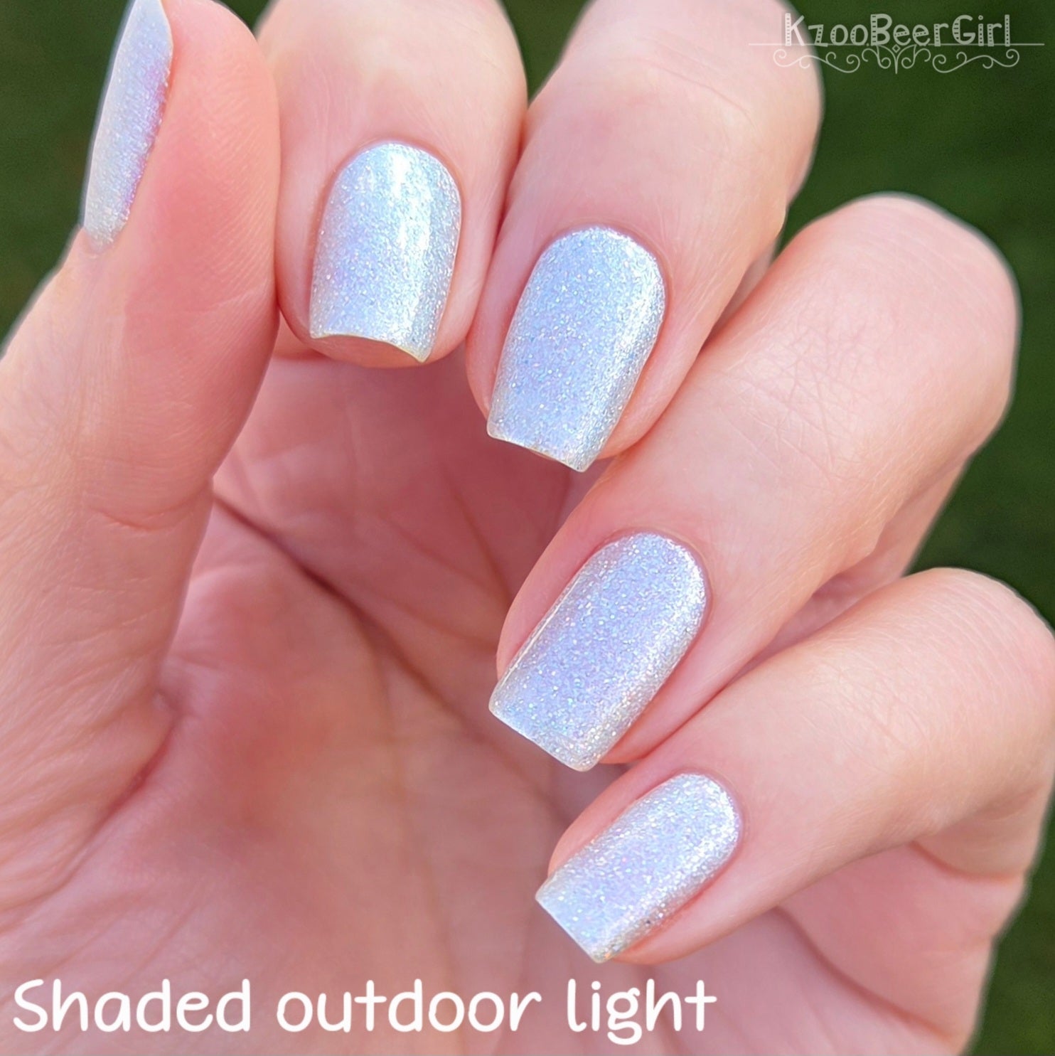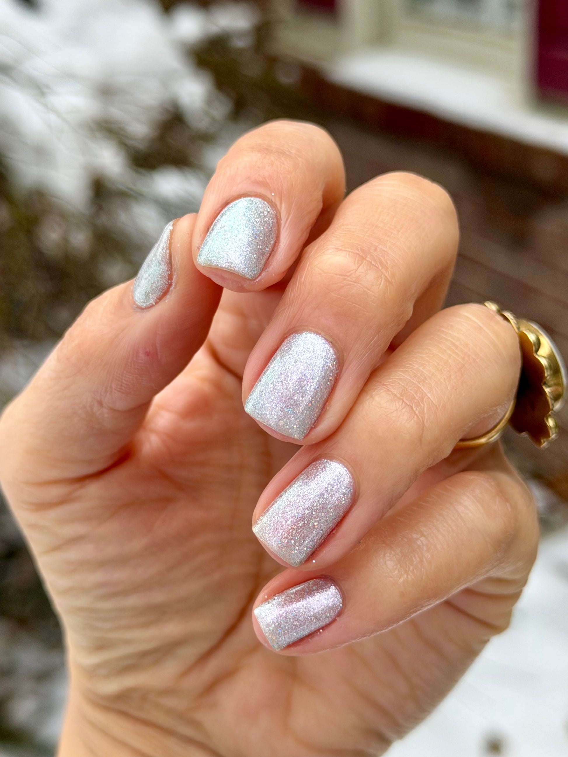 It's just a tiny dusting, it's not Snowmageddon! This polish is a super shimmery base with shifts from pink/purple/blue and loaded with holo flakes and micro silver holo.