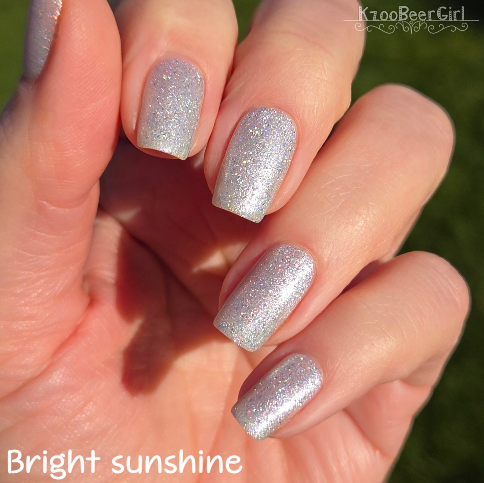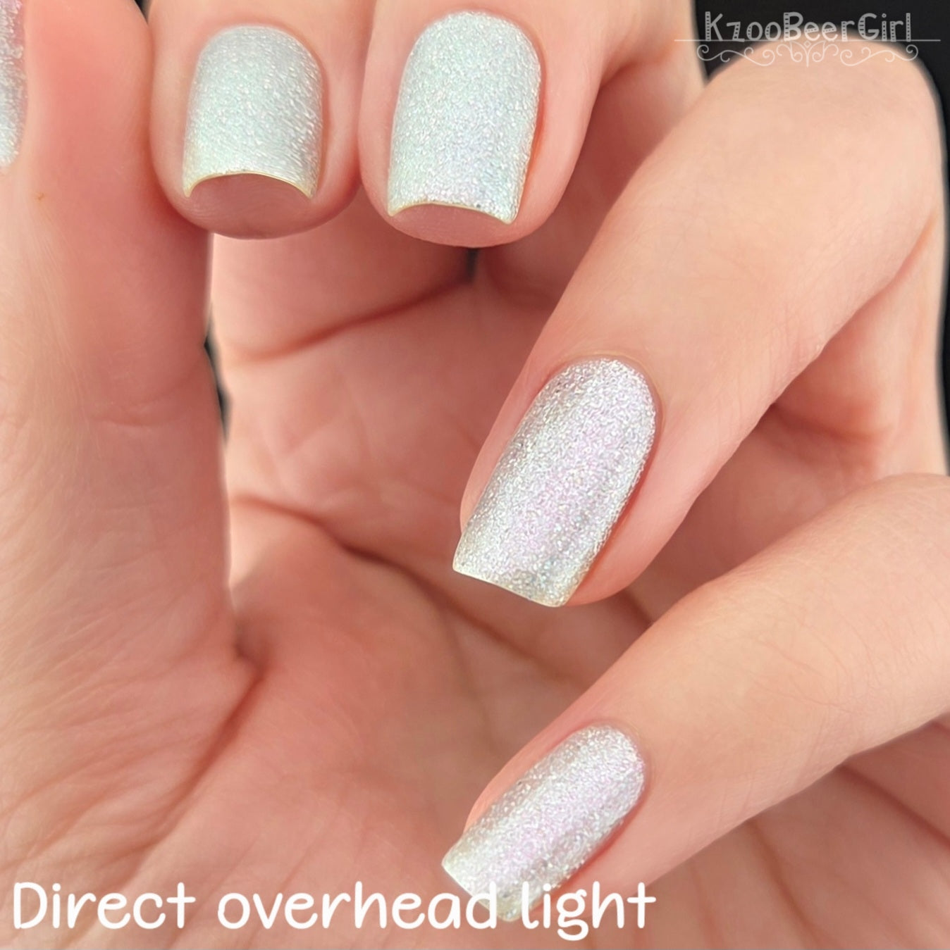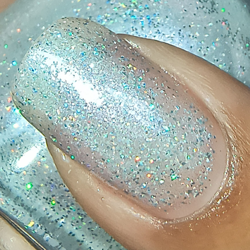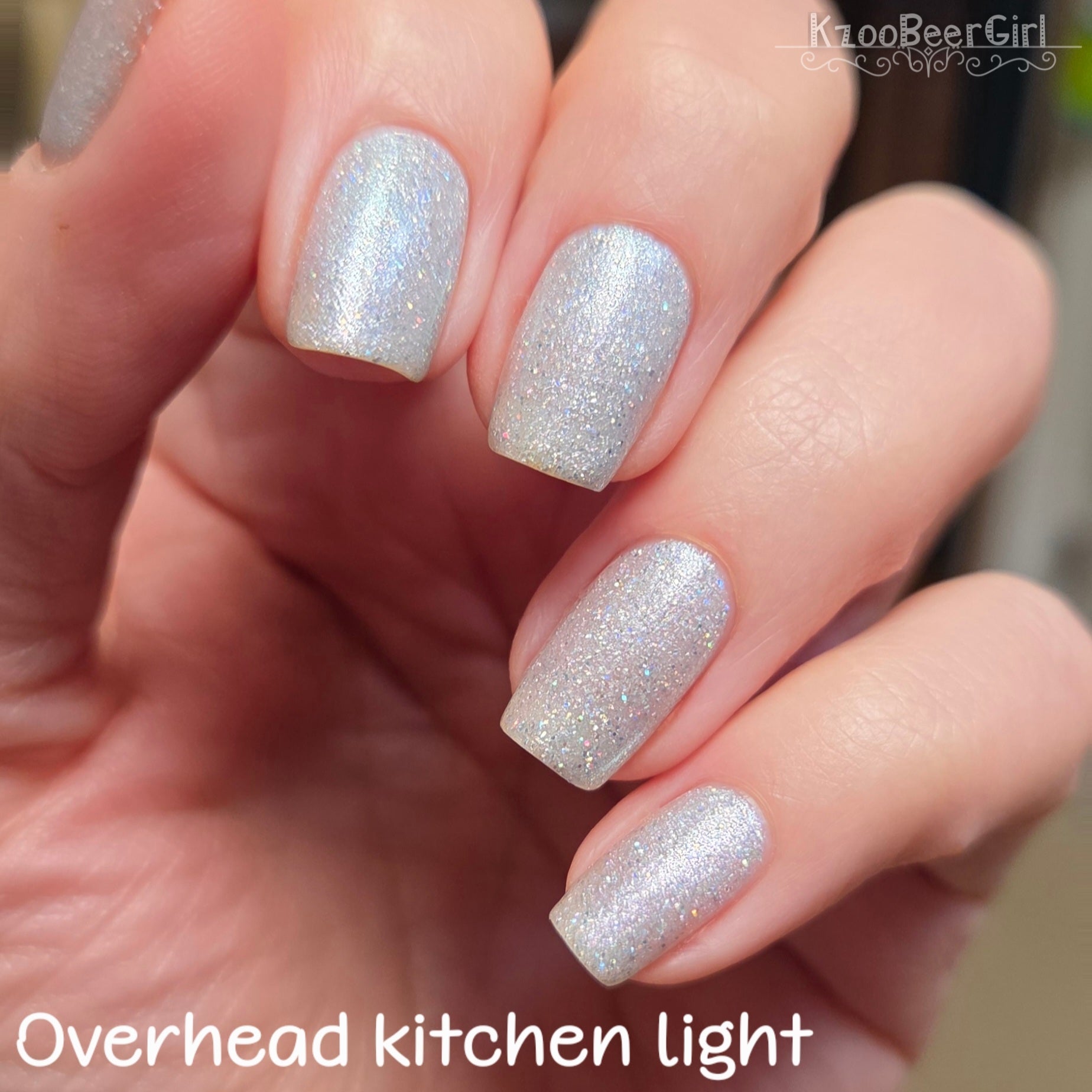 It's just a tiny dusting, it's not Snowmageddon! This polish is a super shimmery base with shifts from pink/purple/blue and loaded with holo flakes and micro silver holo.