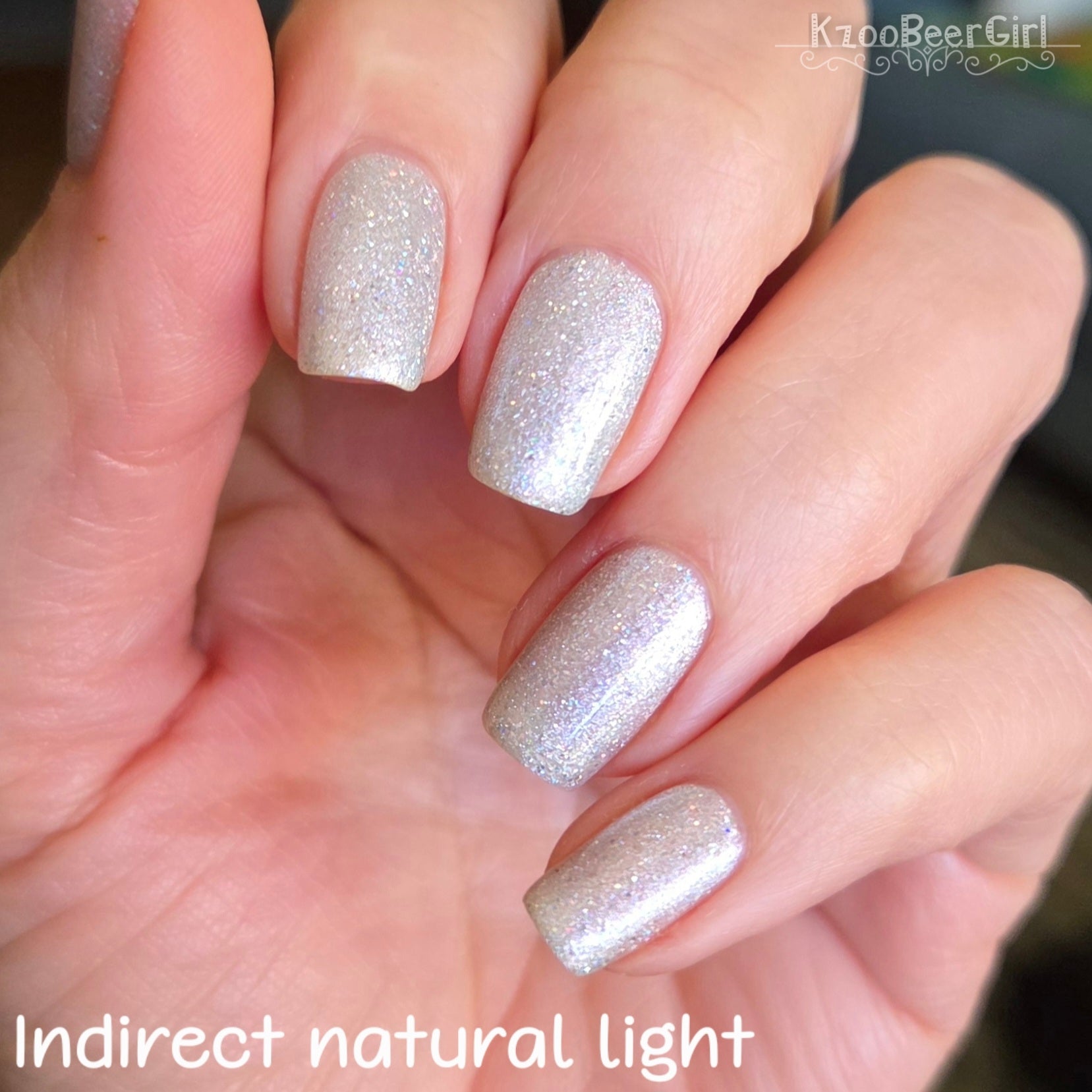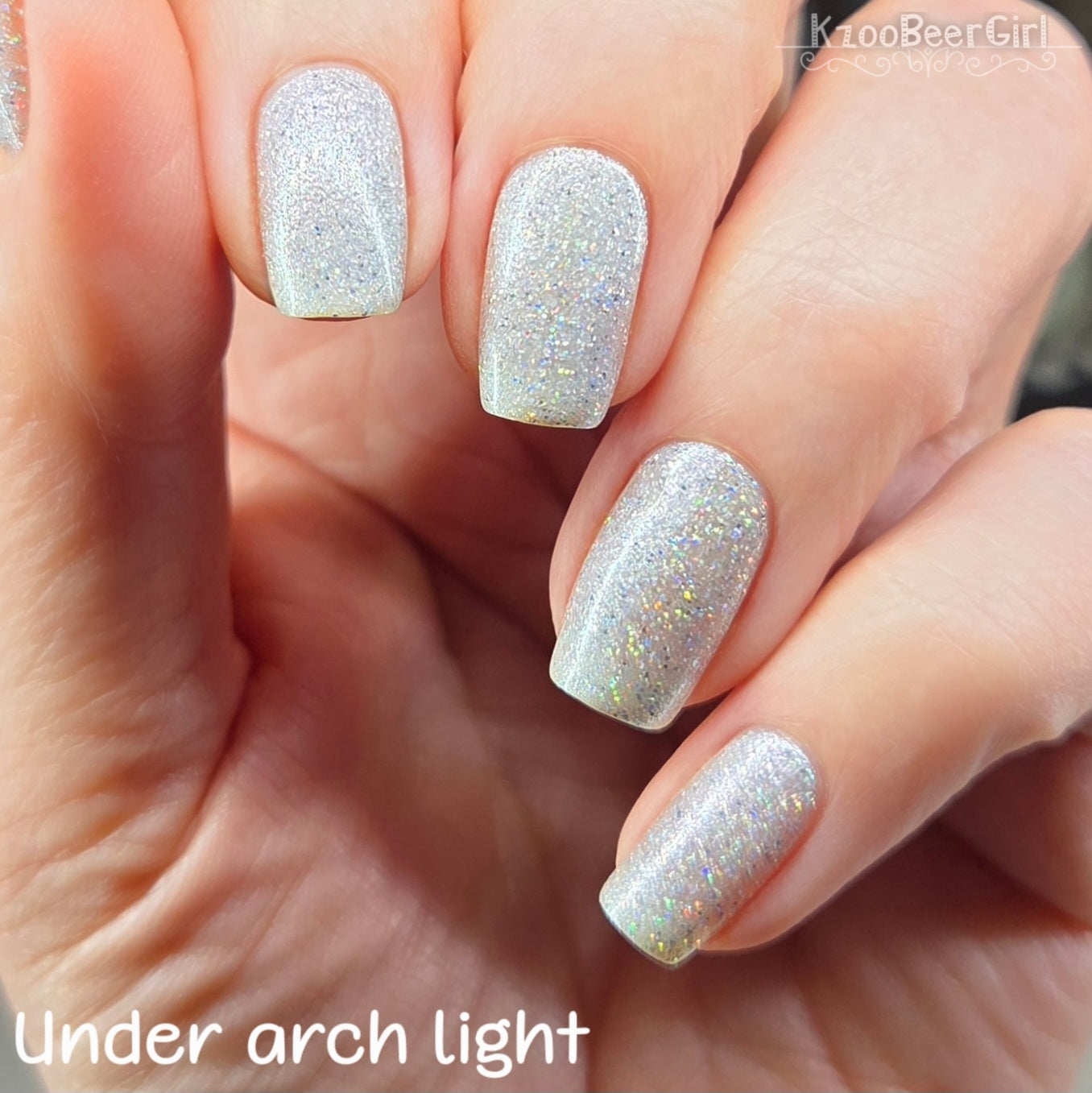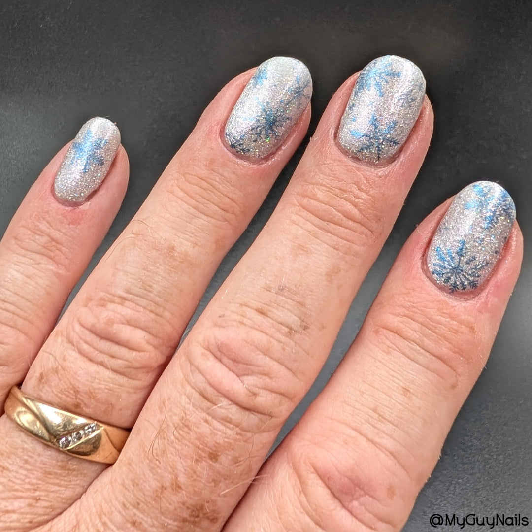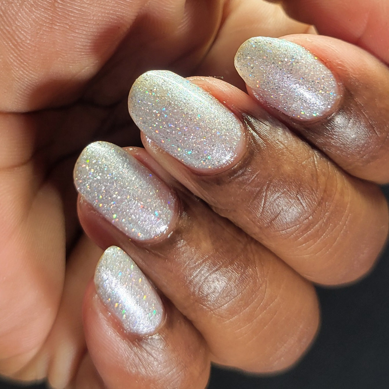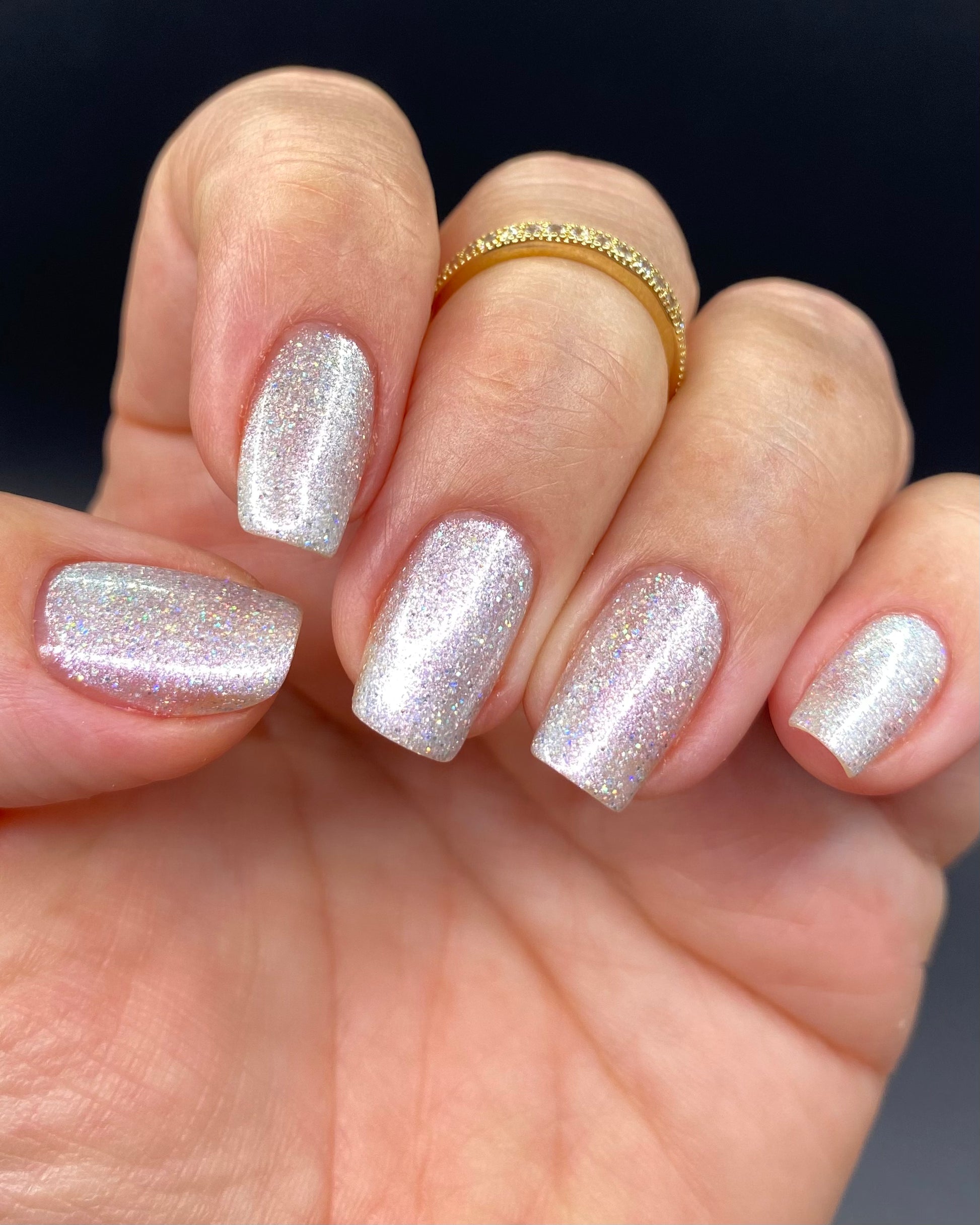 It's just a tiny dusting, it's not Snowmageddon! This polish is a super shimmery base with shifts from pink/purple/blue and loaded with holo flakes and micro silver holo.