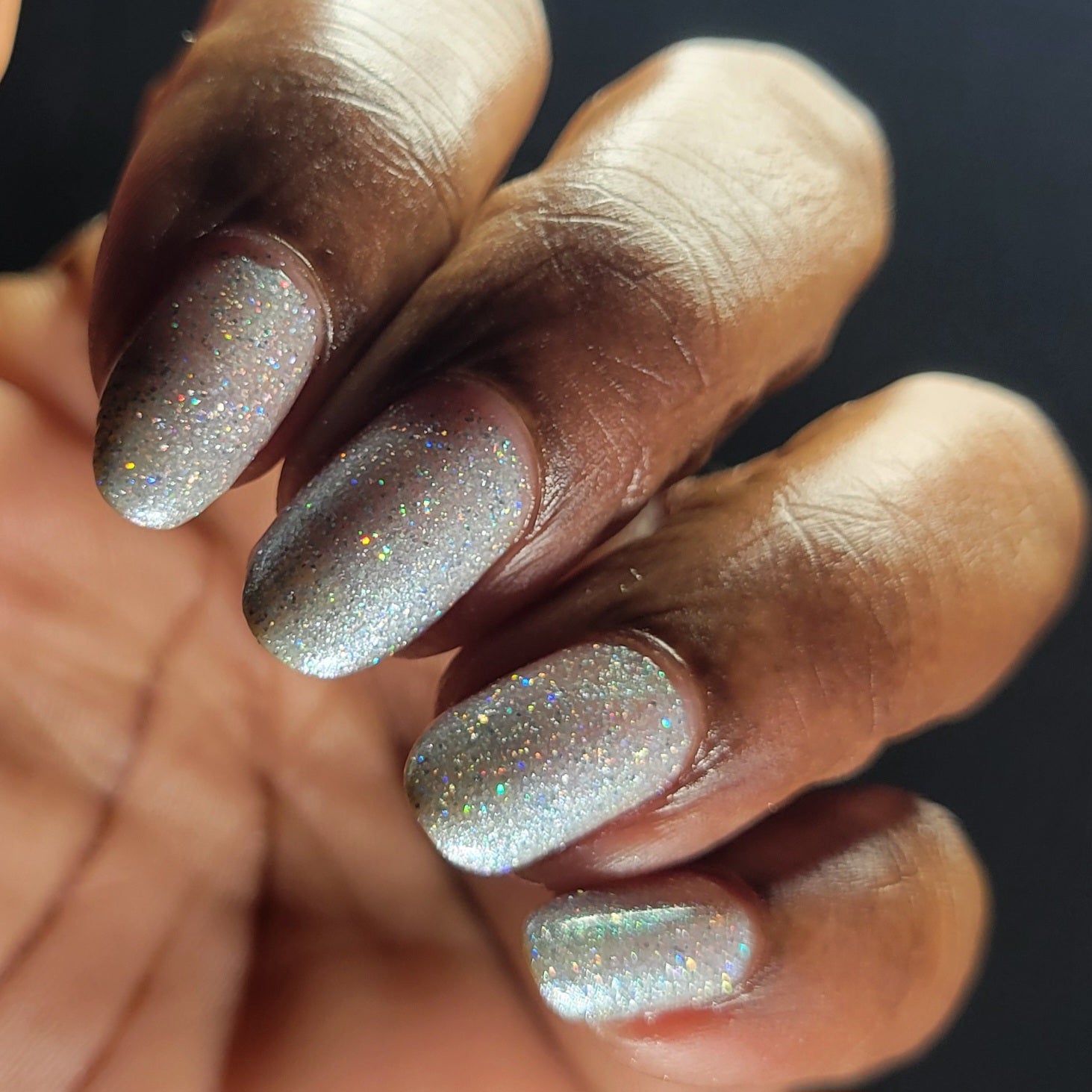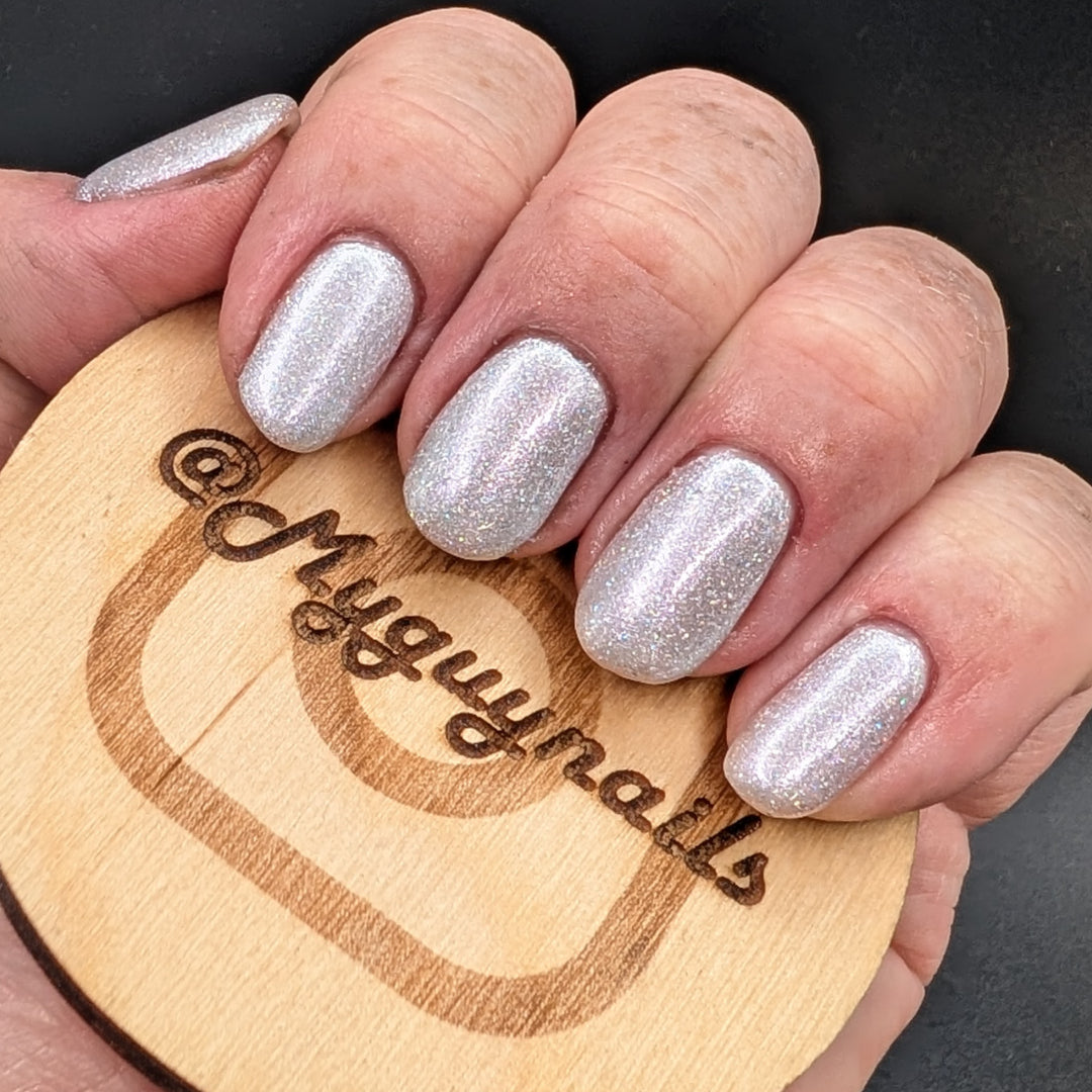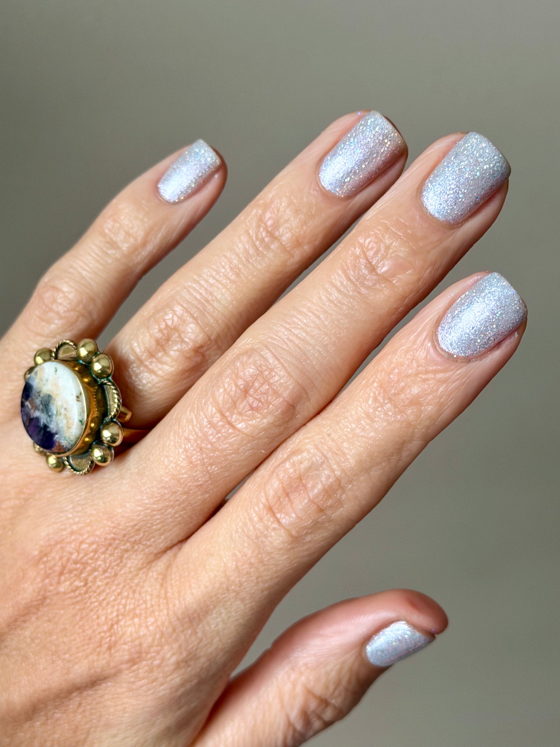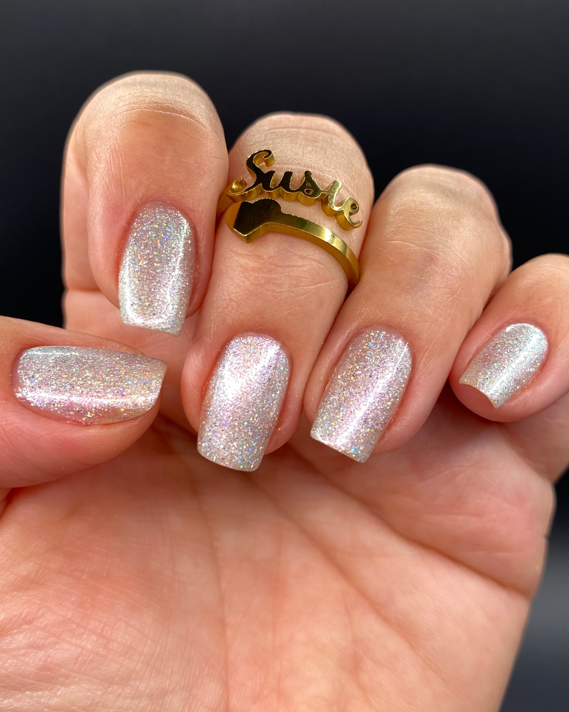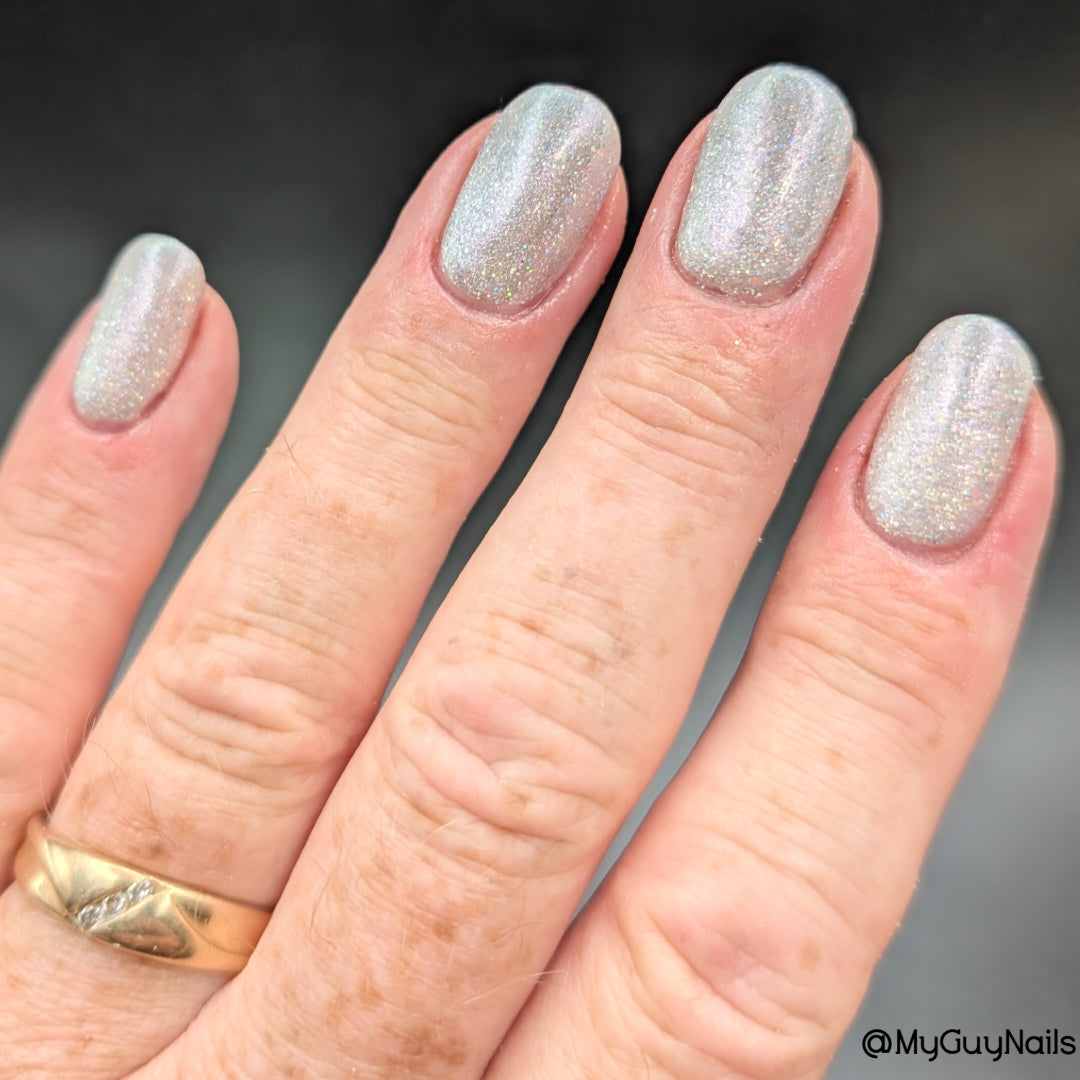 It's just a tiny dusting, it's not Snowmageddon! This polish is a super shimmery base with shifts from pink/purple/blue and loaded with holo flakes and micro silver holo.