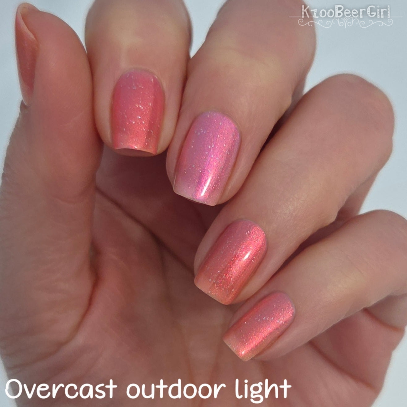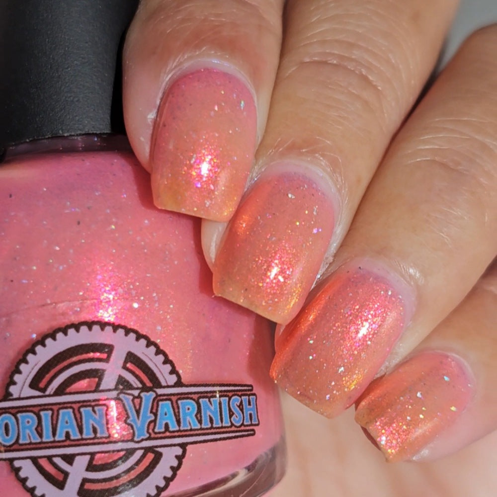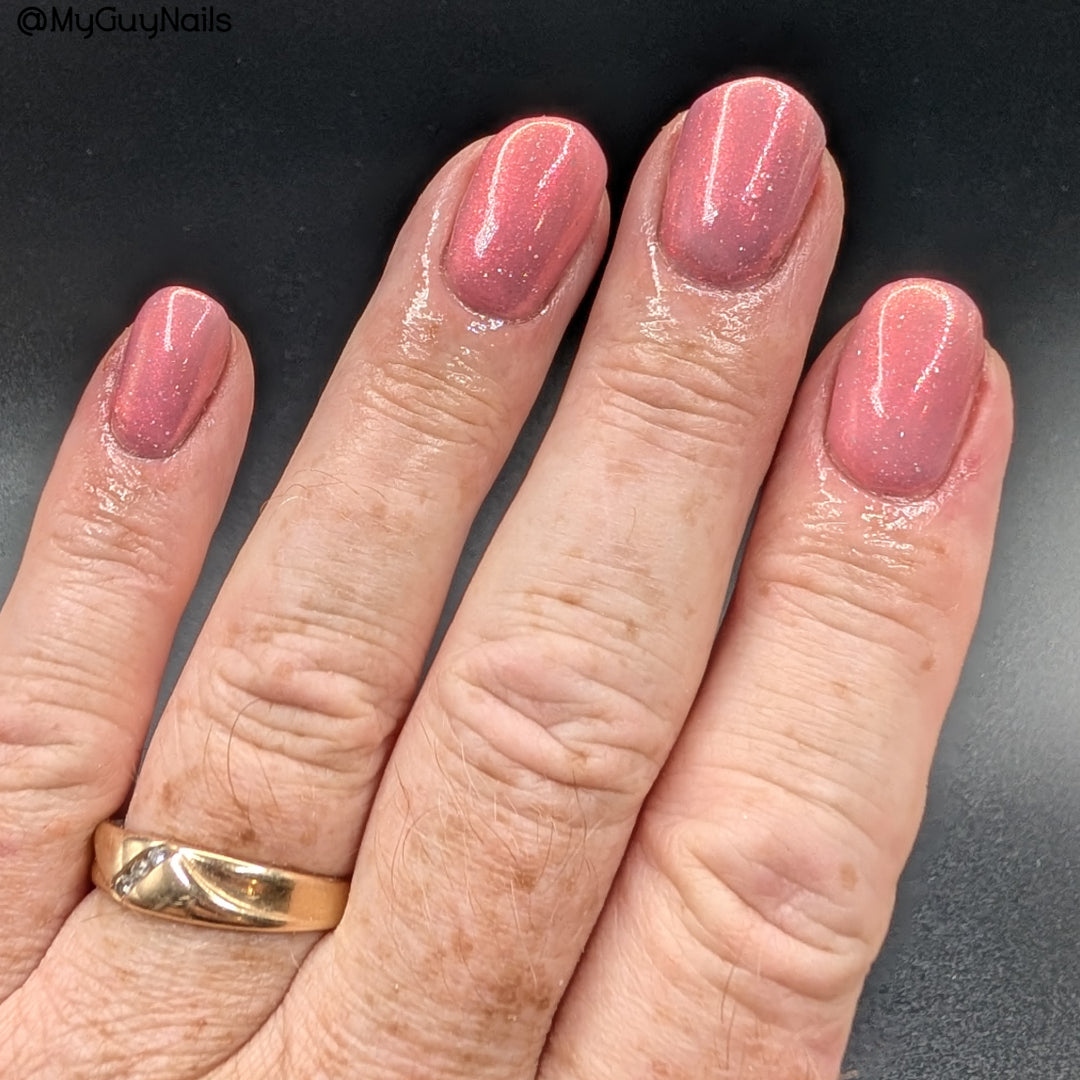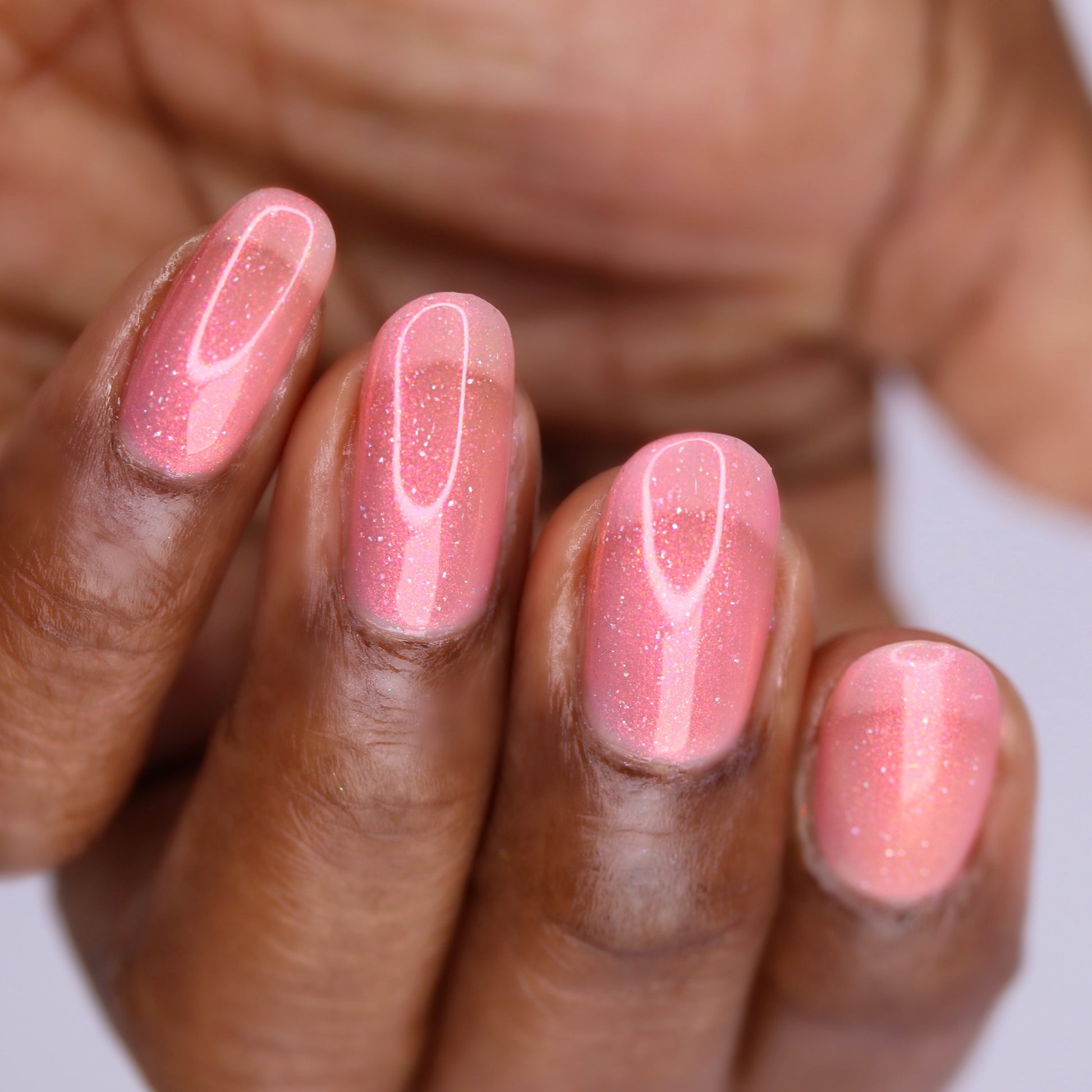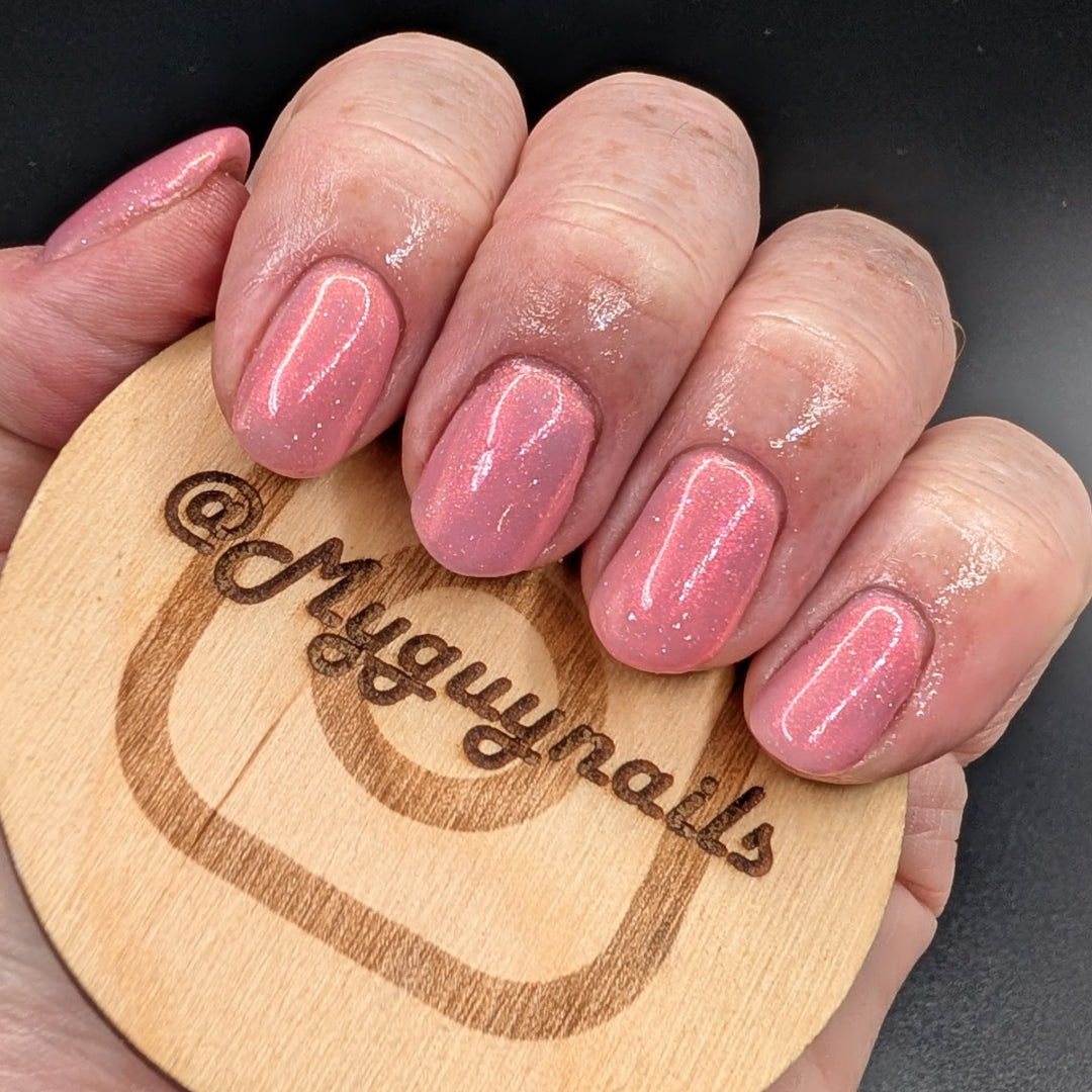 A sheer baby pink base with large particle aurora shimmer that ranges from bright pink/peach/gold with a pollinating amount of holo flakes (holo dust)