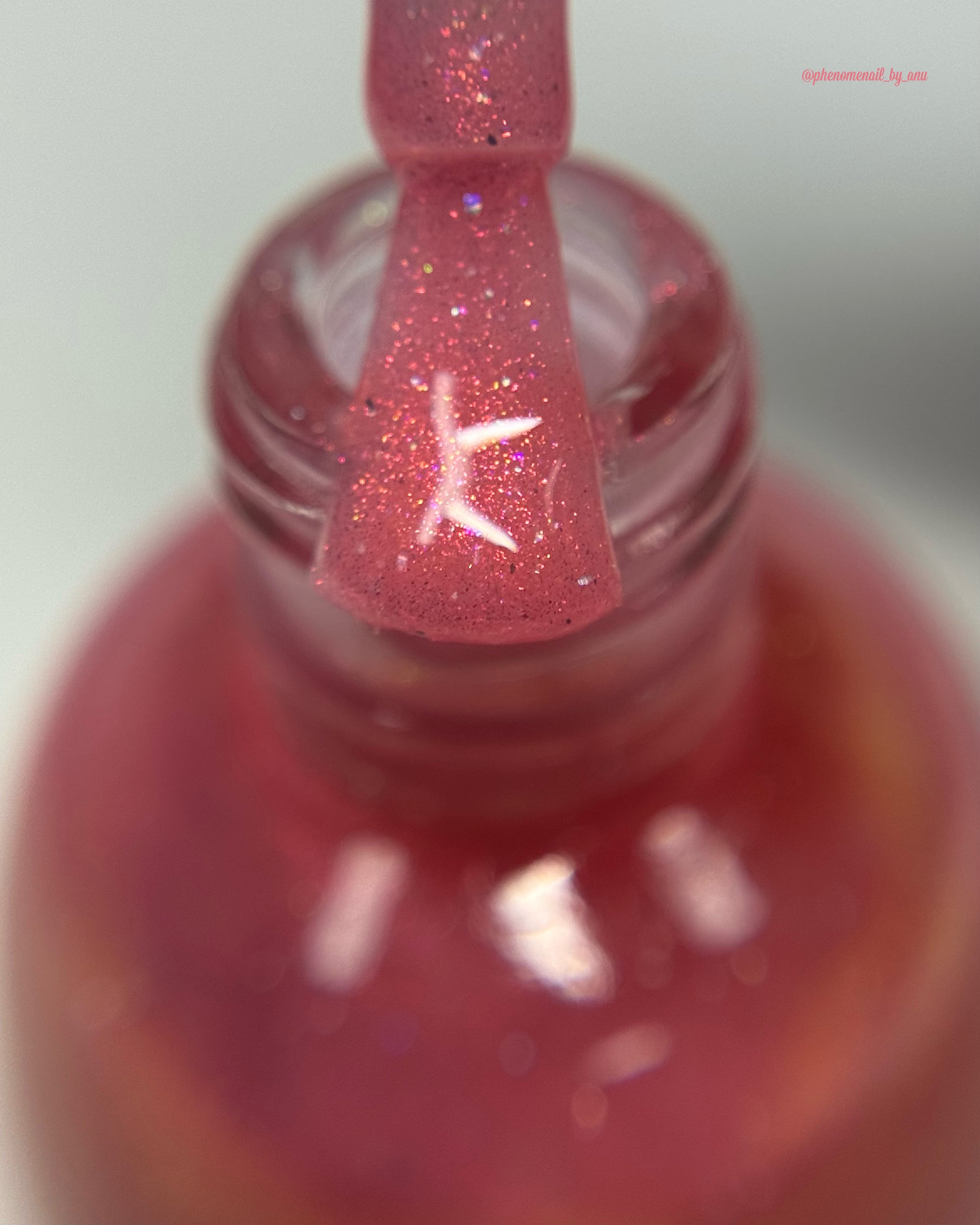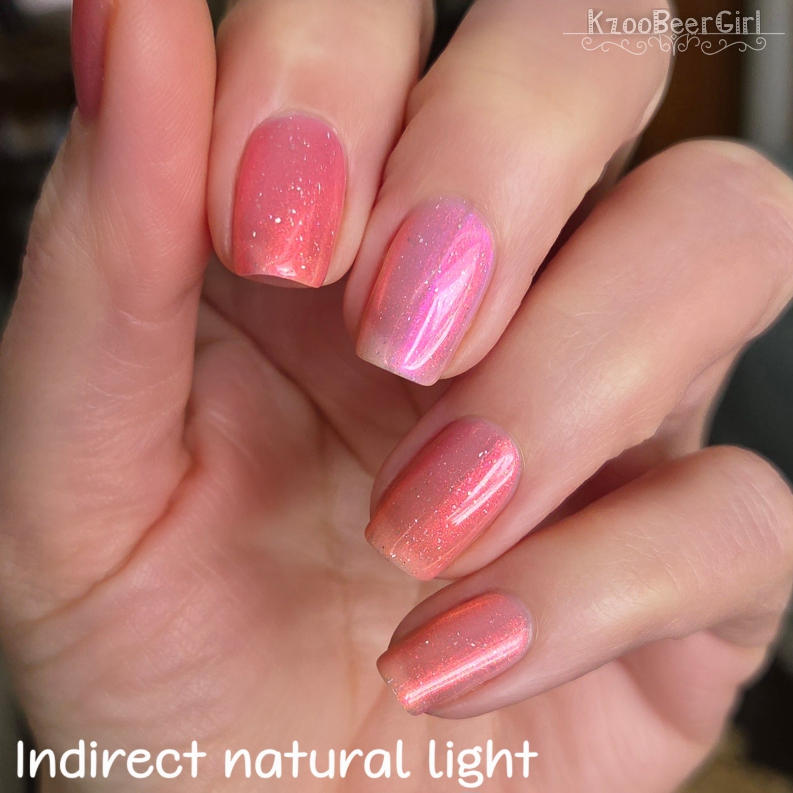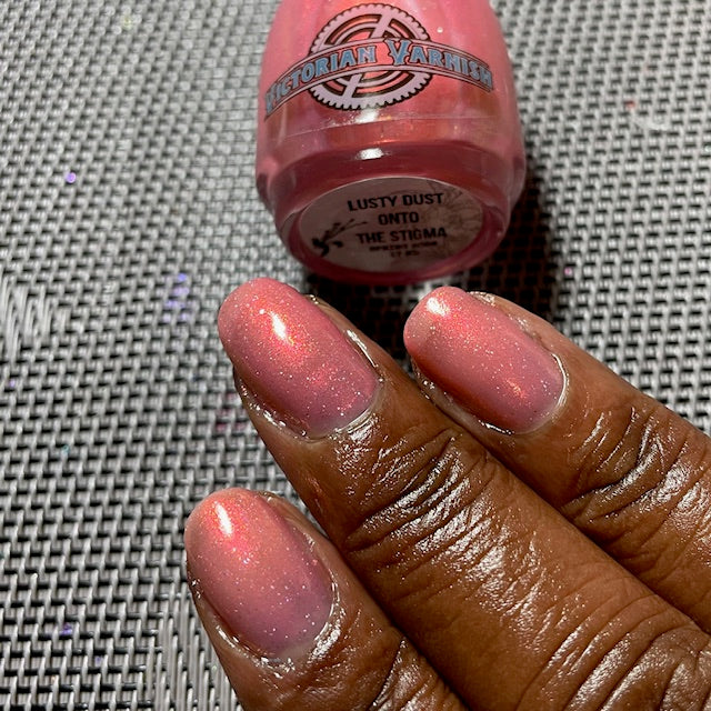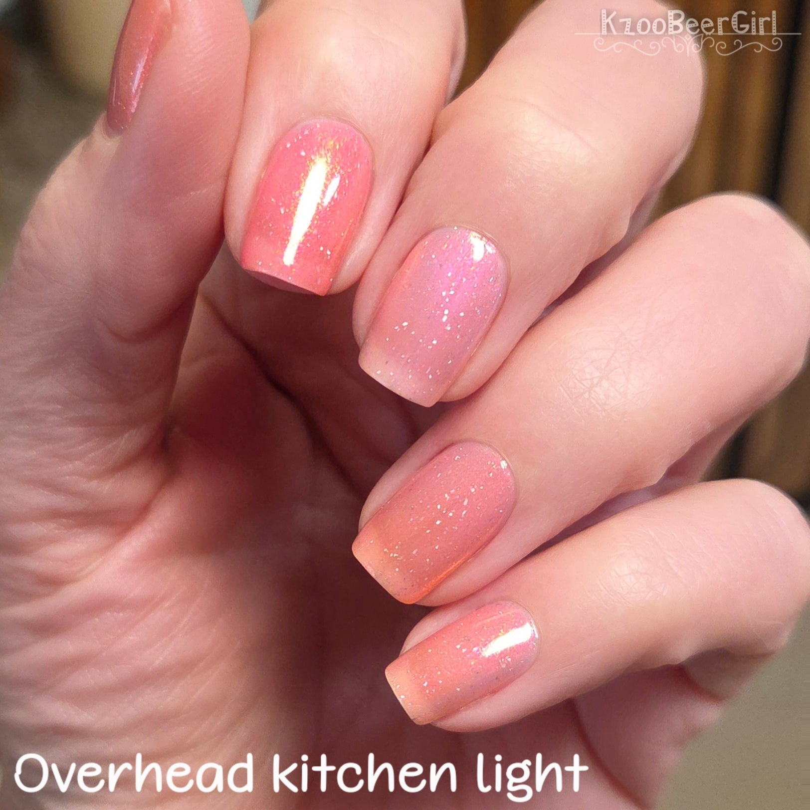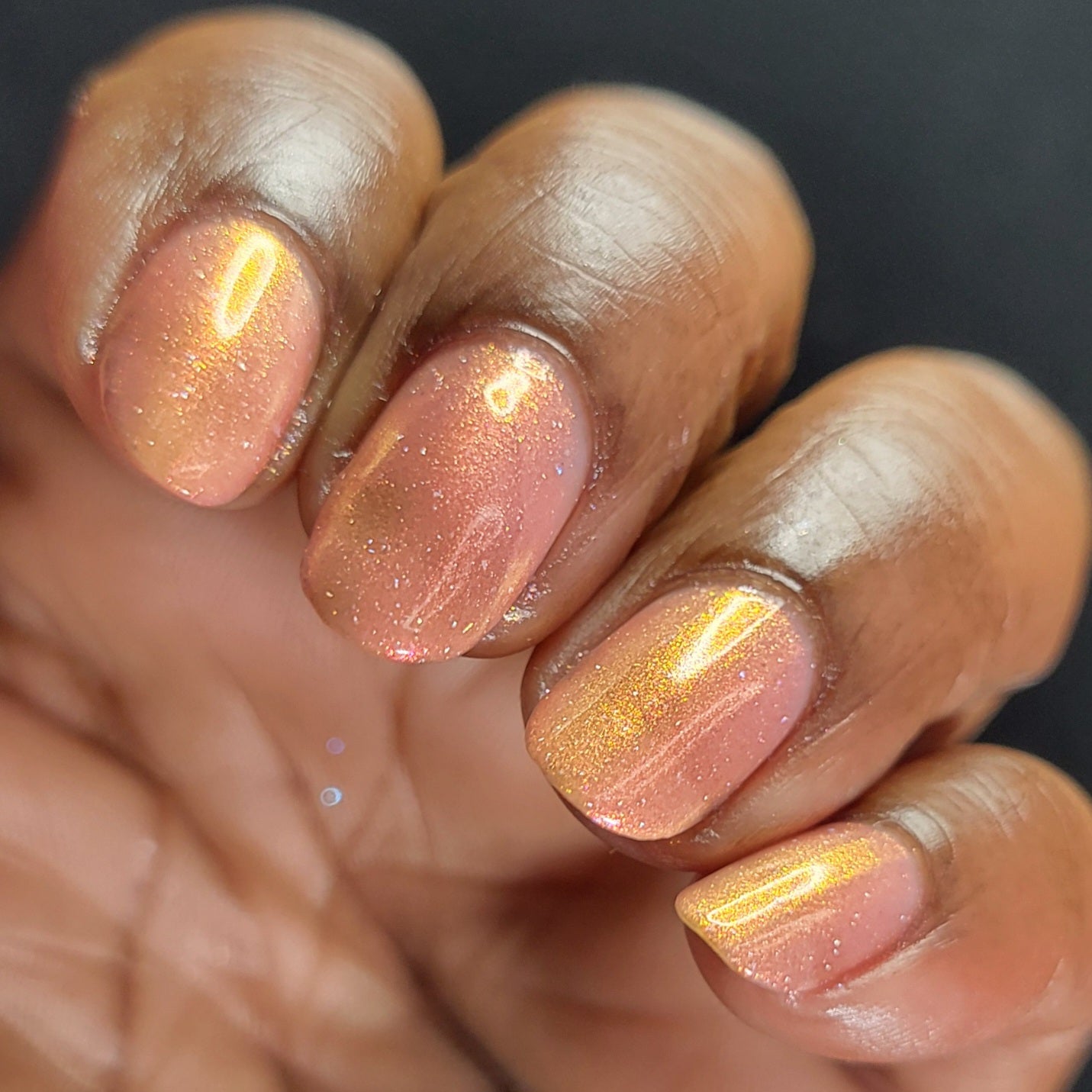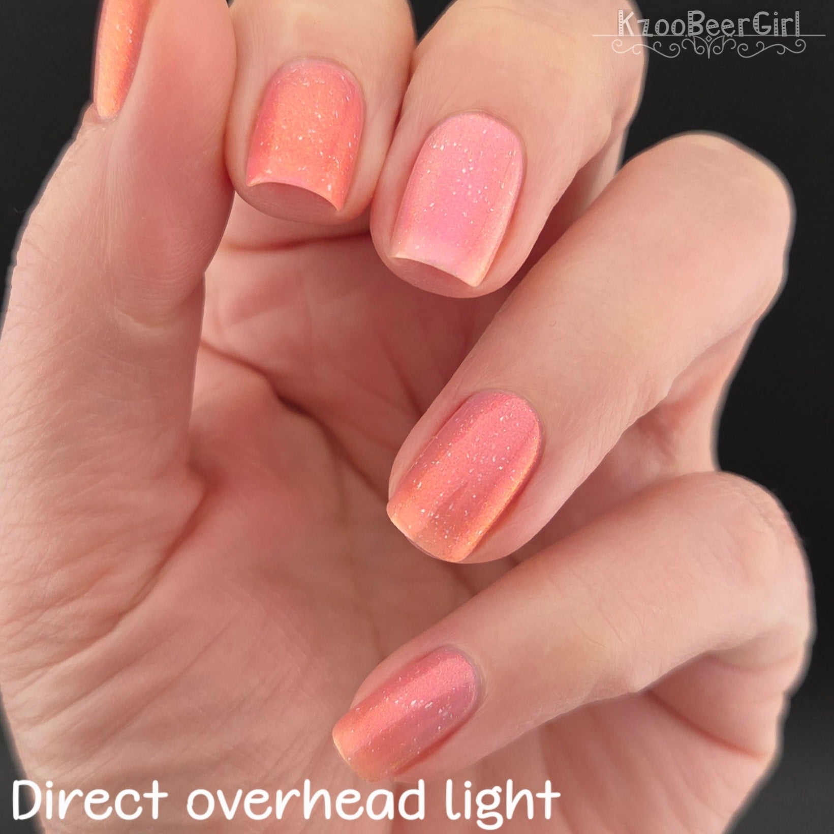 A sheer baby pink base with large particle aurora shimmer that ranges from bright pink/peach/gold with a pollinating amount of holo flakes (holo dust)