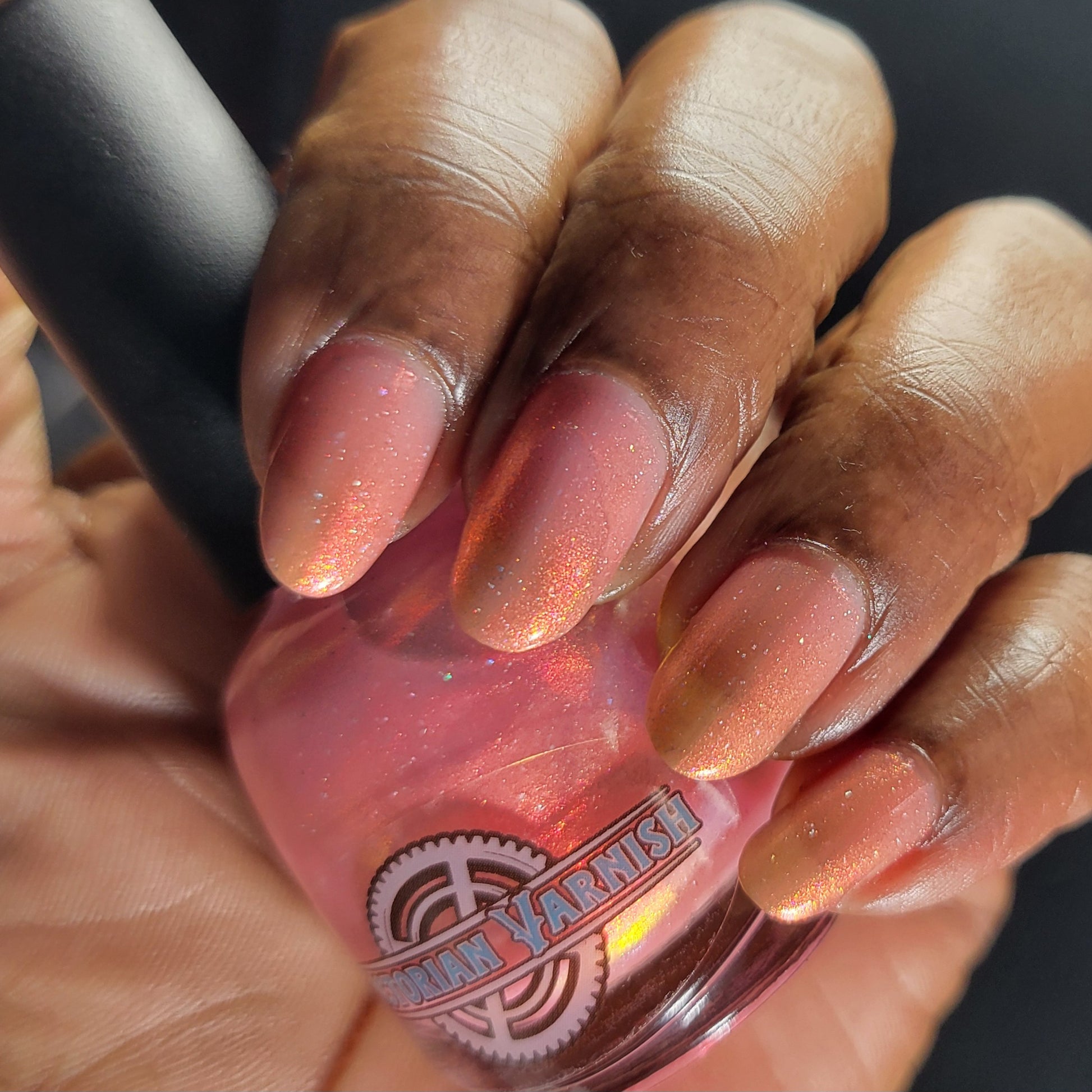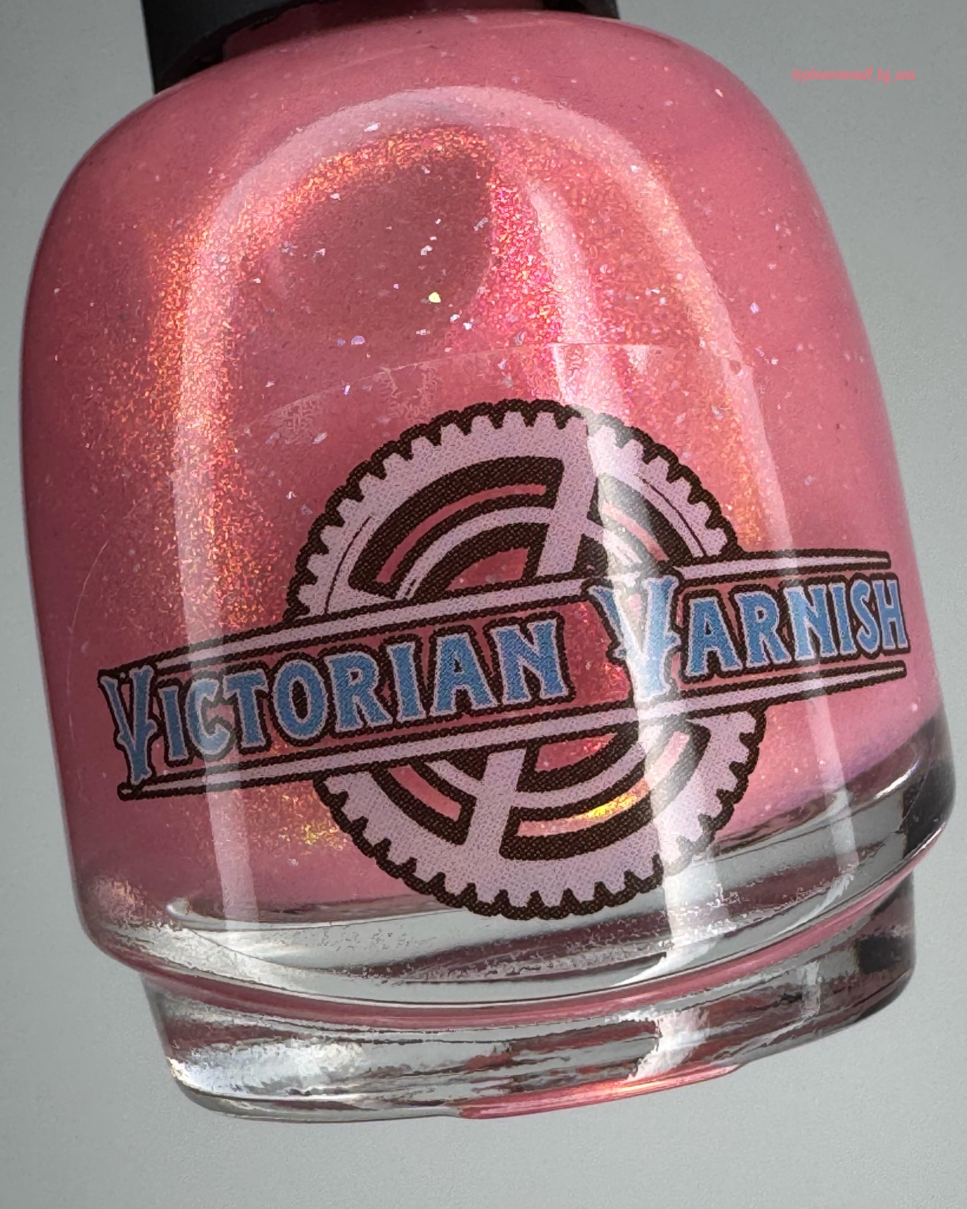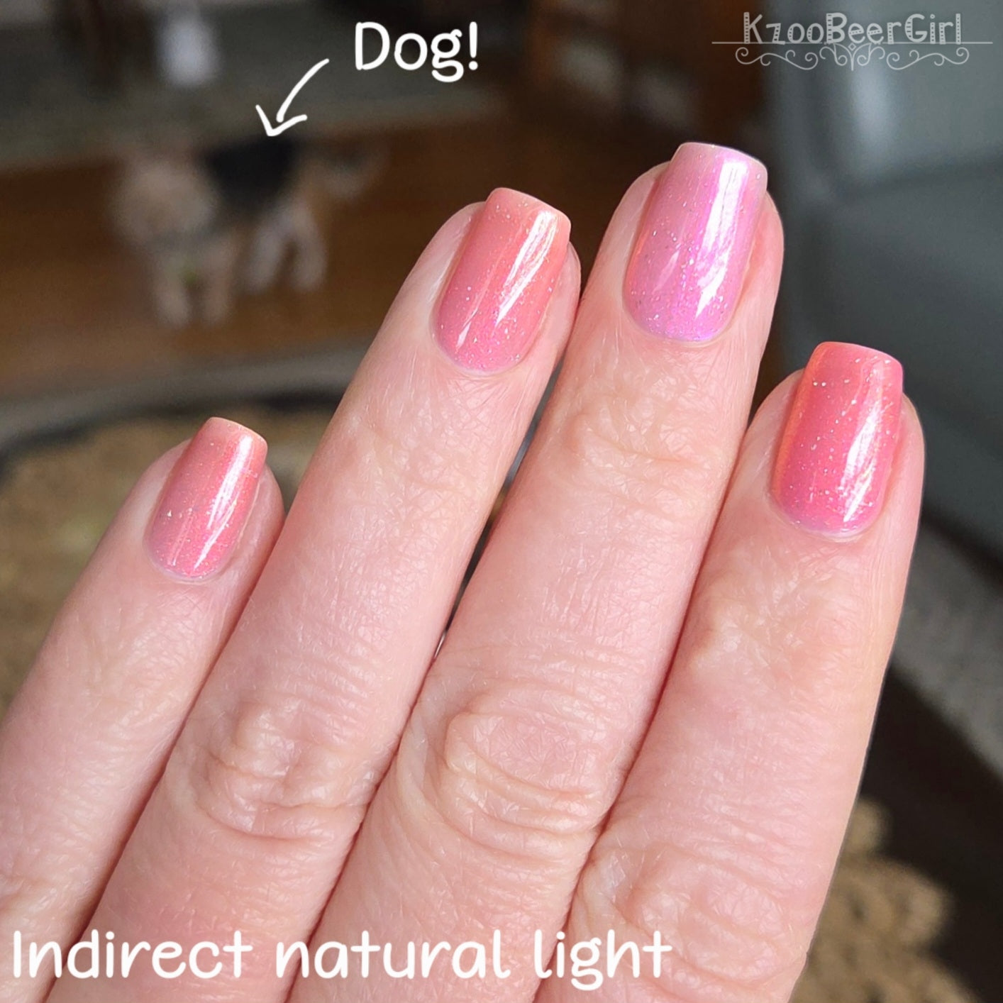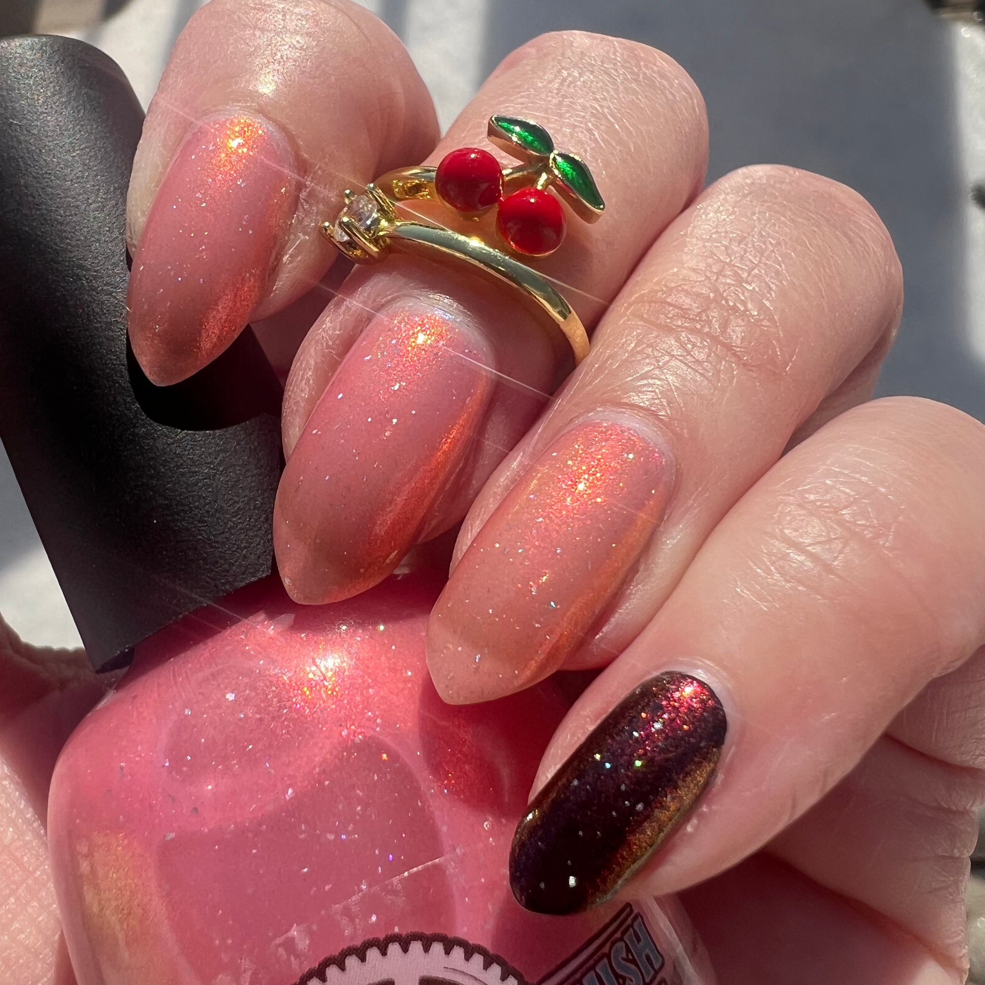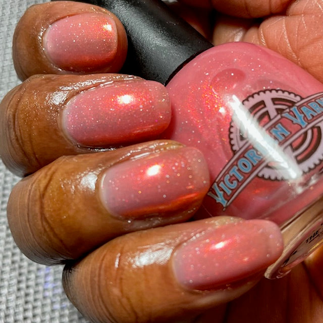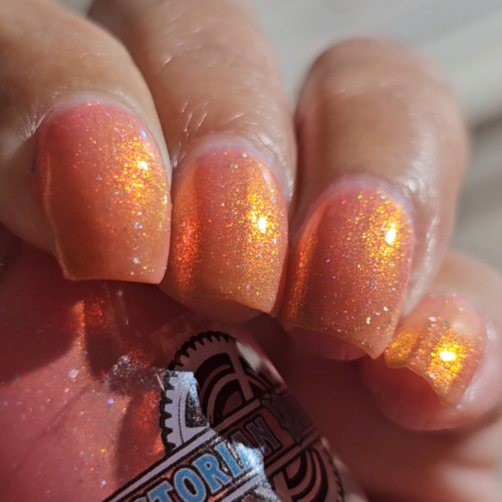 A sheer baby pink base with large particle aurora shimmer that ranges from bright pink/peach/gold with a pollinating amount of holo flakes (holo dust)