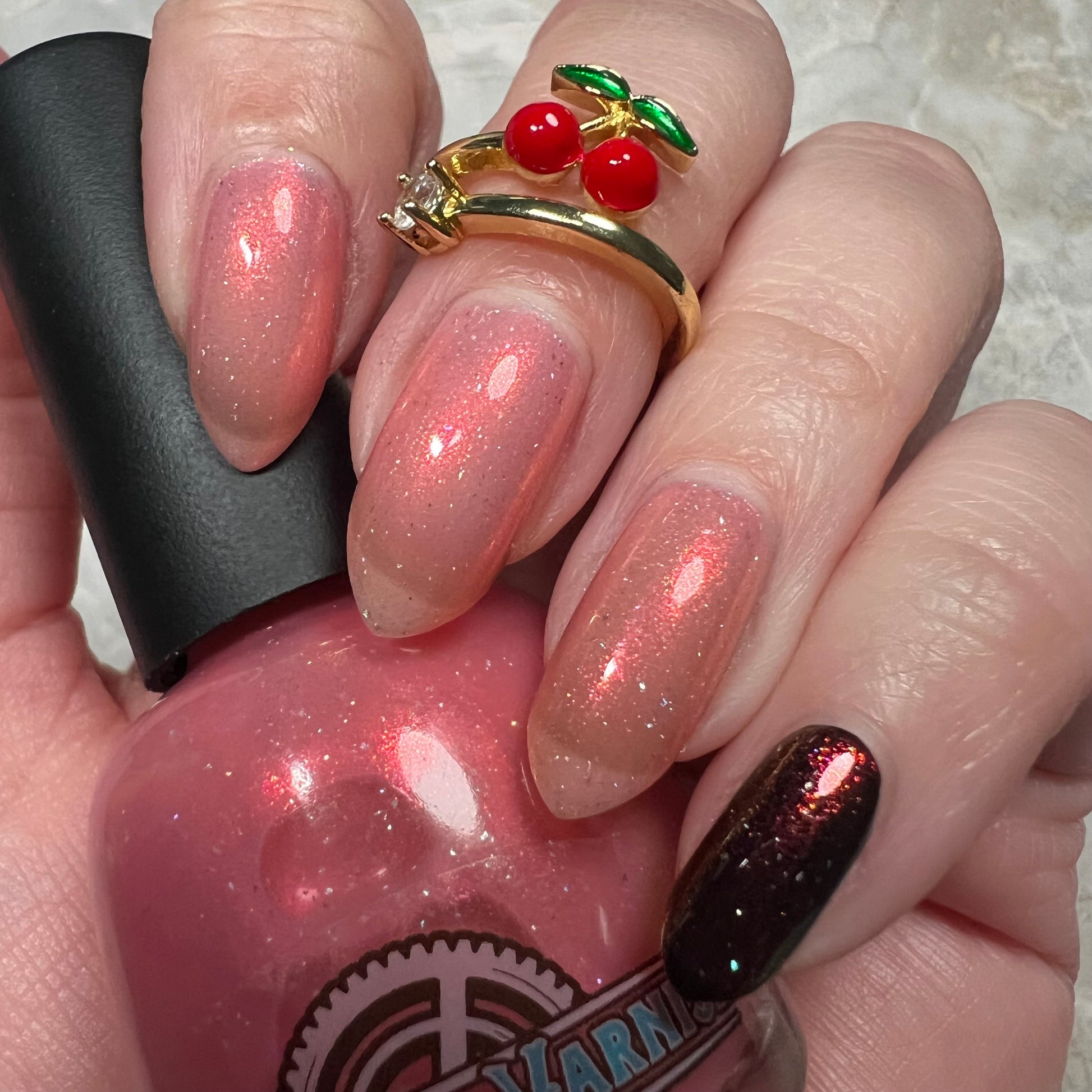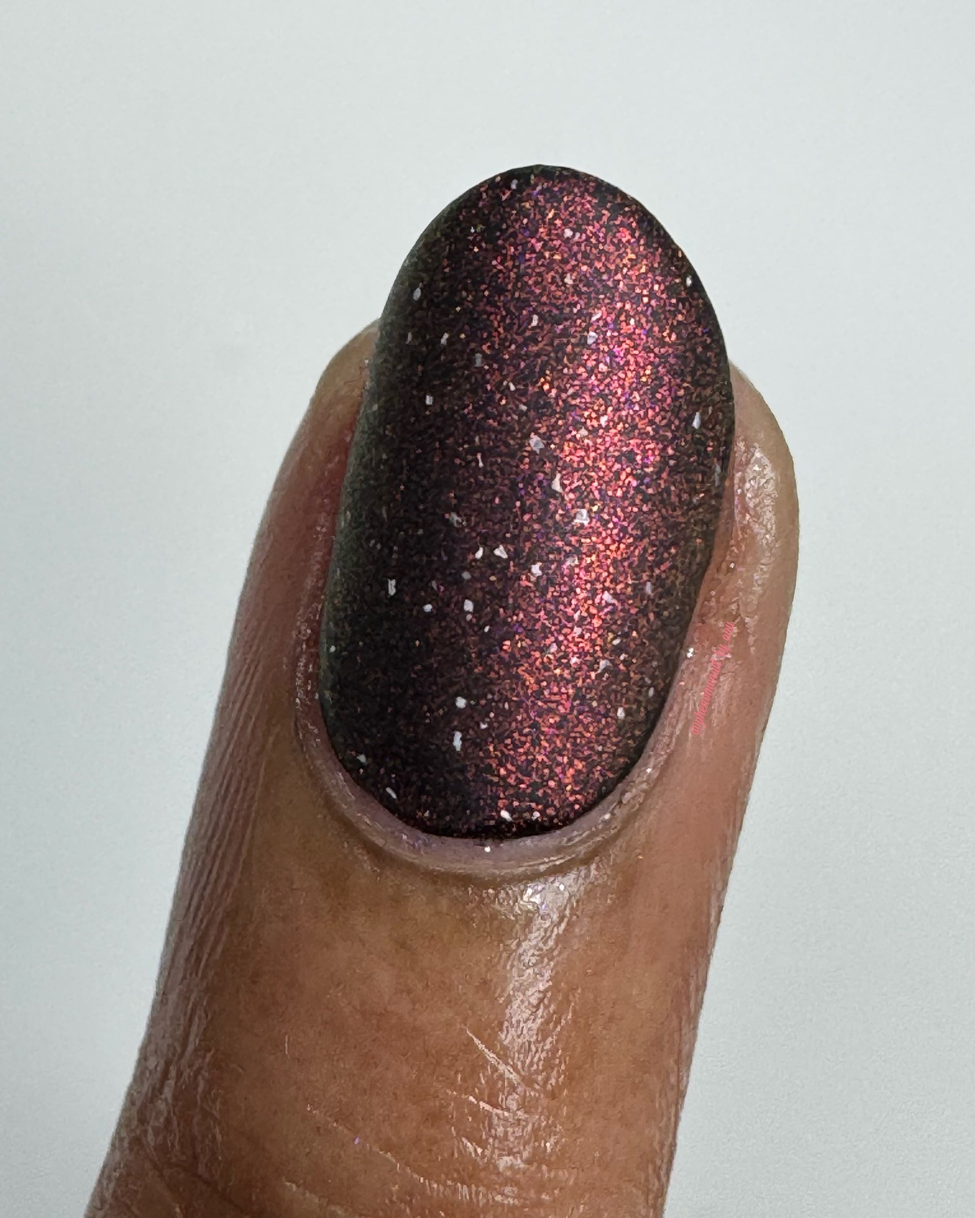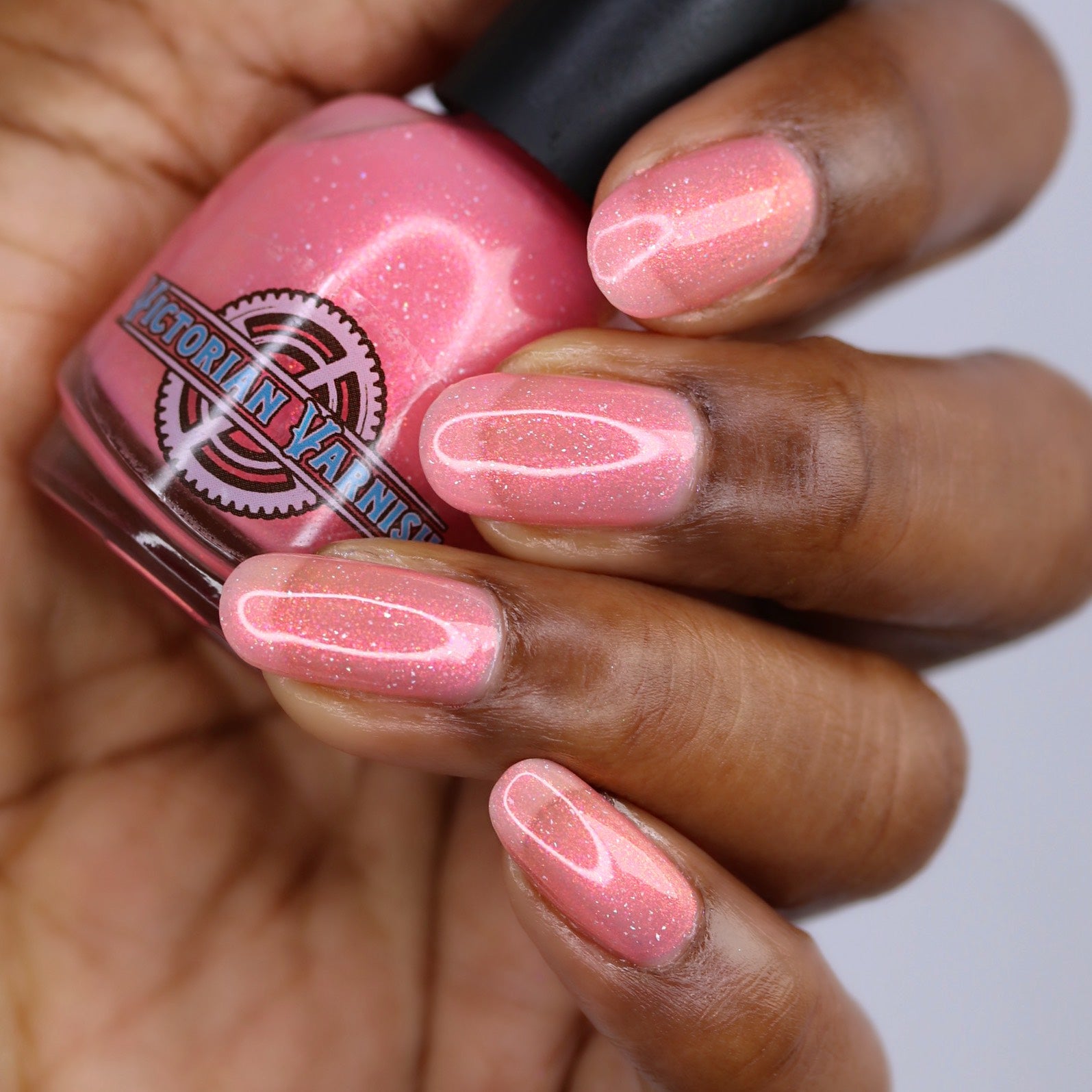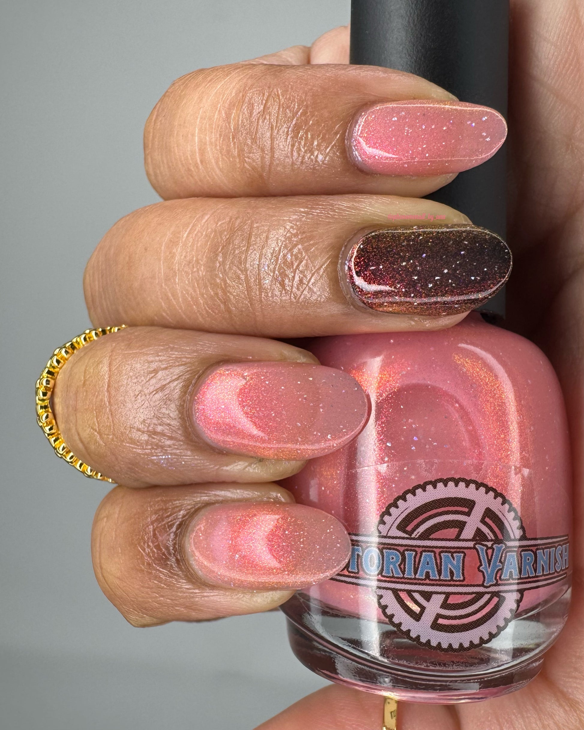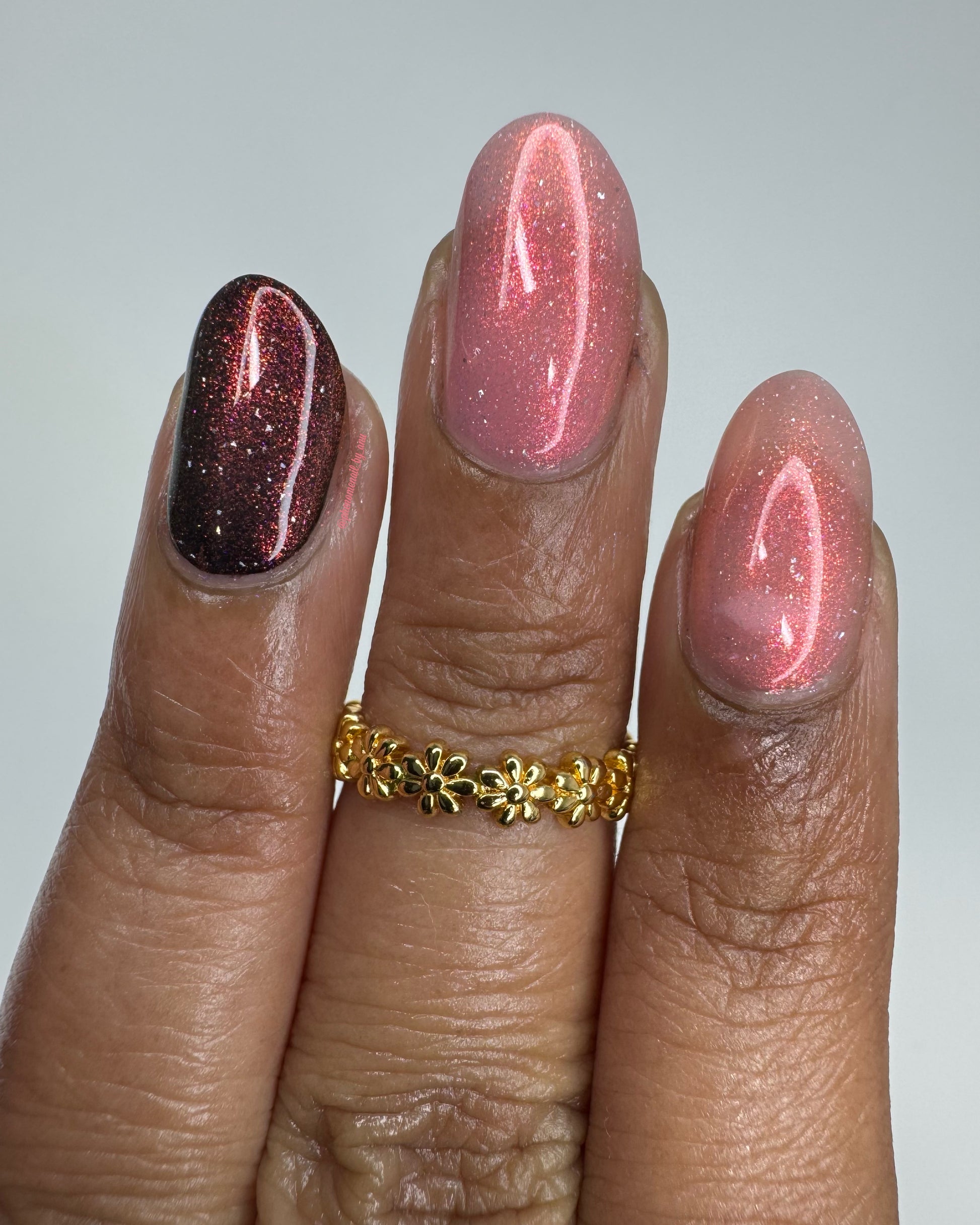 A sheer baby pink base with large particle aurora shimmer that ranges from bright pink/peach/gold with a pollinating amount of holo flakes (holo dust)