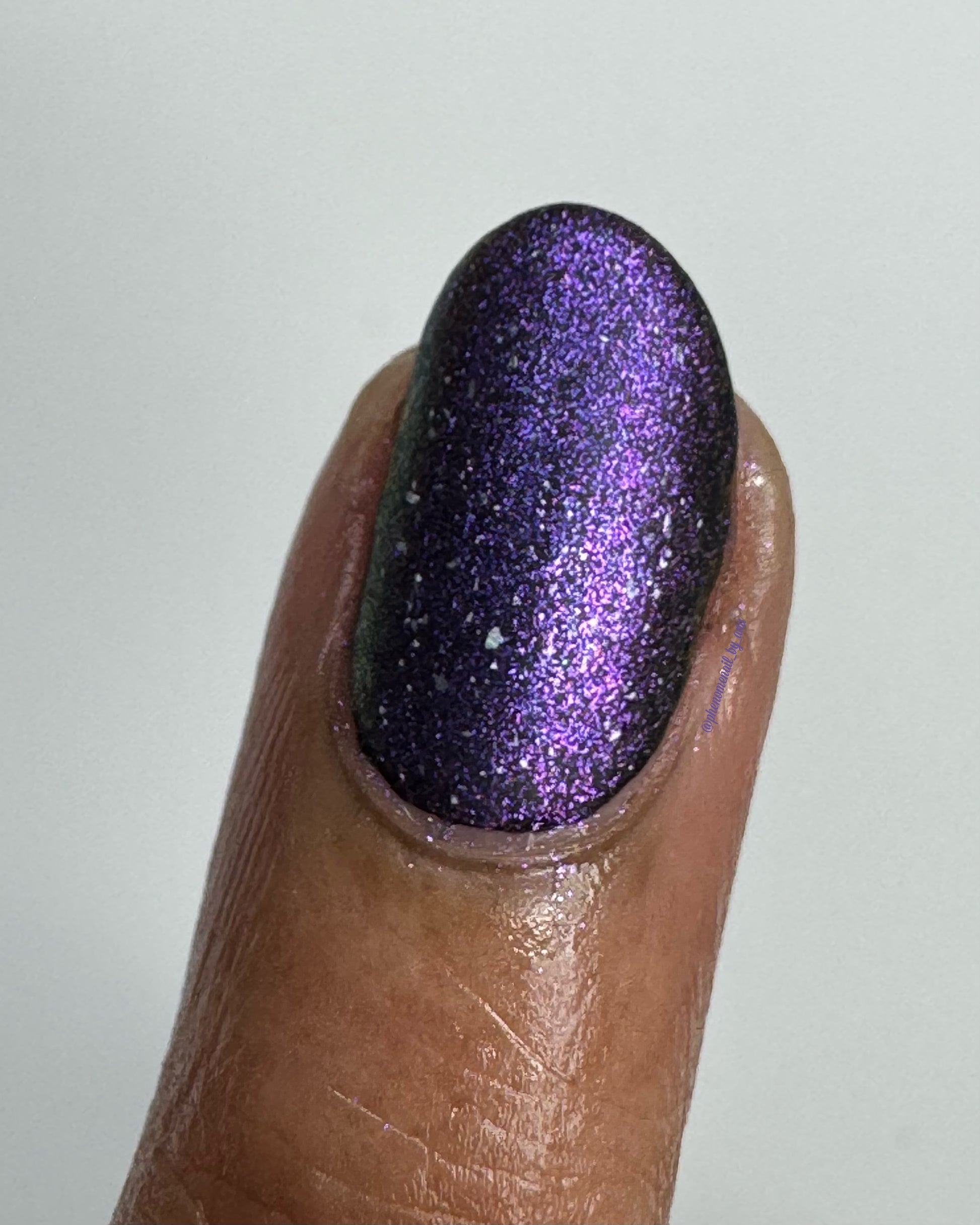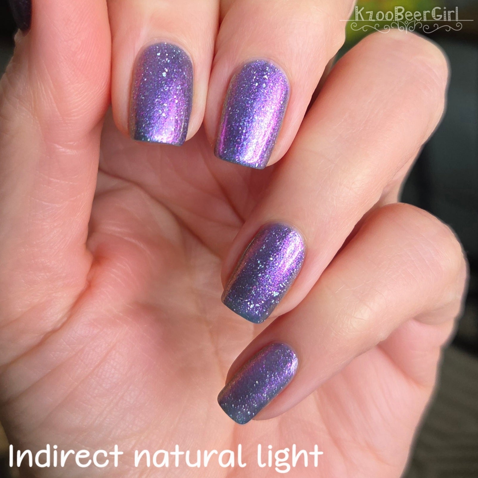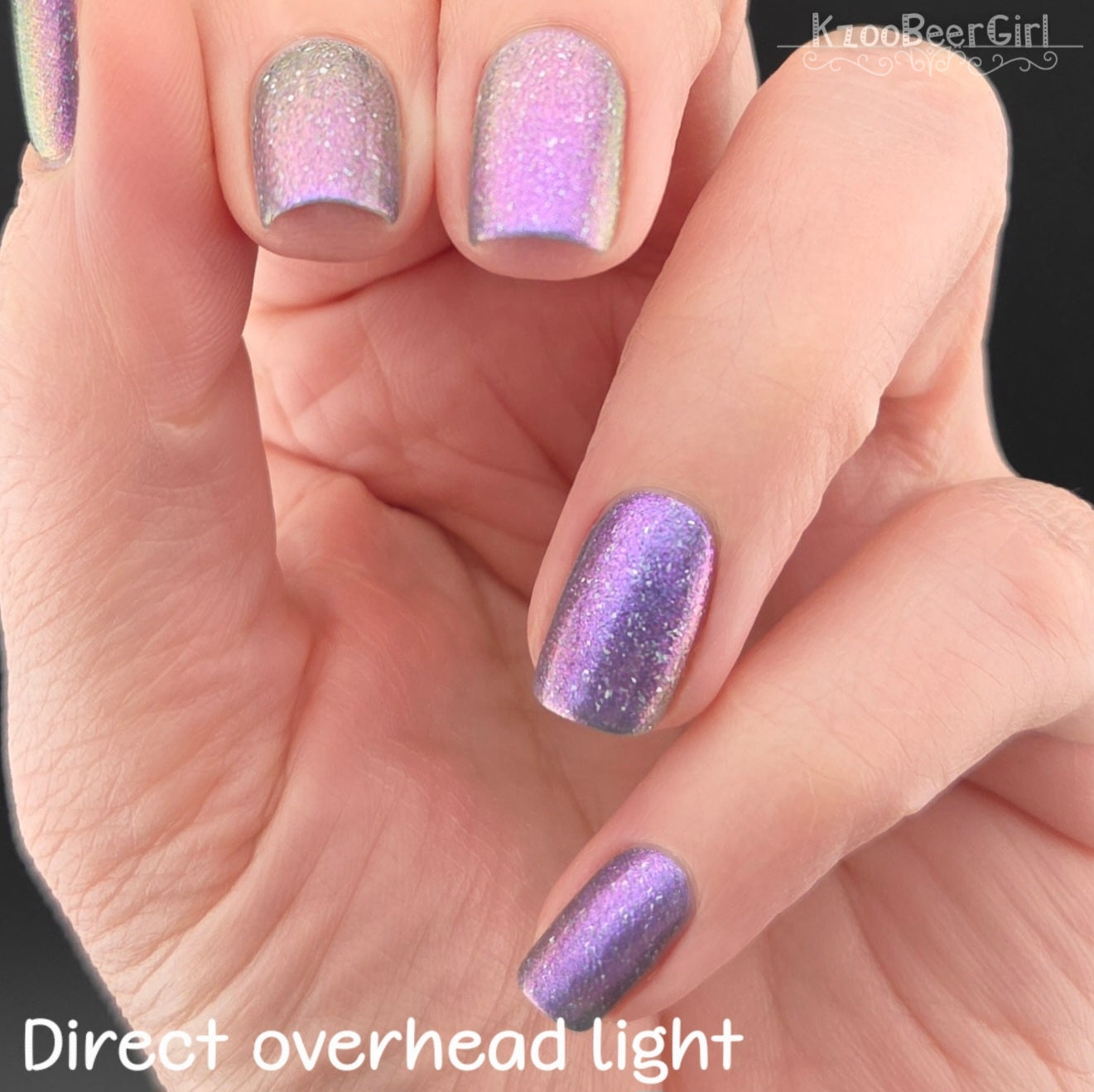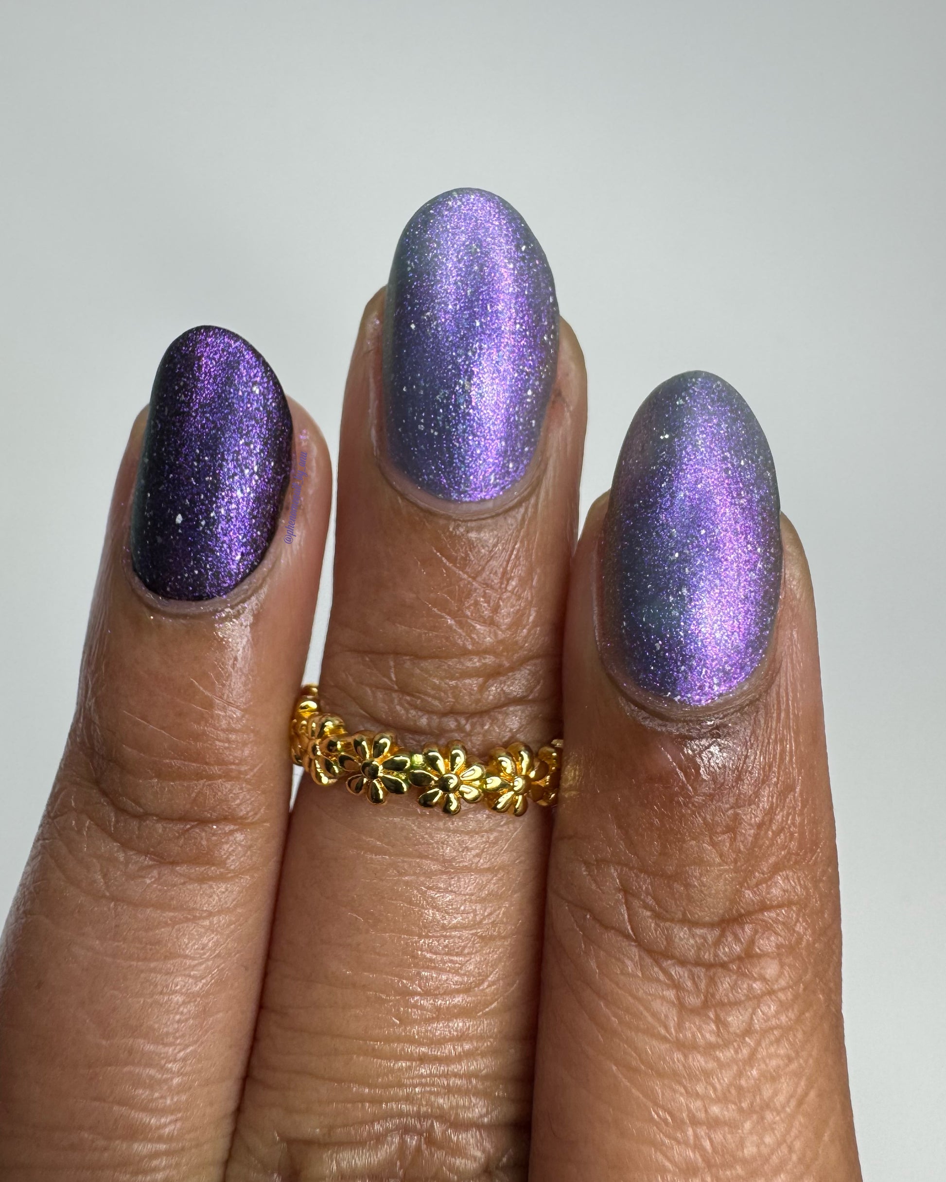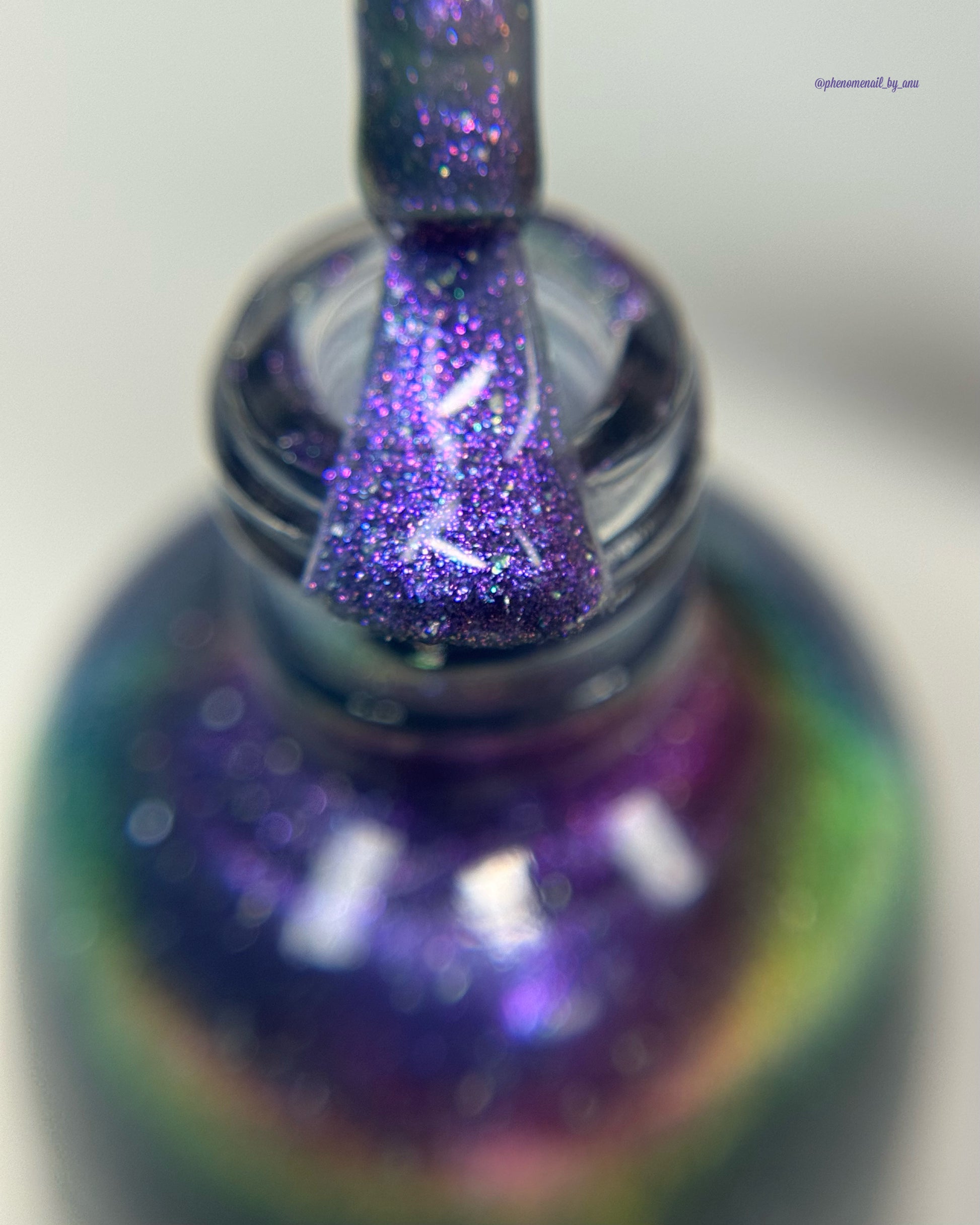 A sheer indigo base with large particle aurora shimmer that ranges from bright purple/pink and green/gold bronze at extreme angles with a pollinating amount of holo flakes (holo dust)
