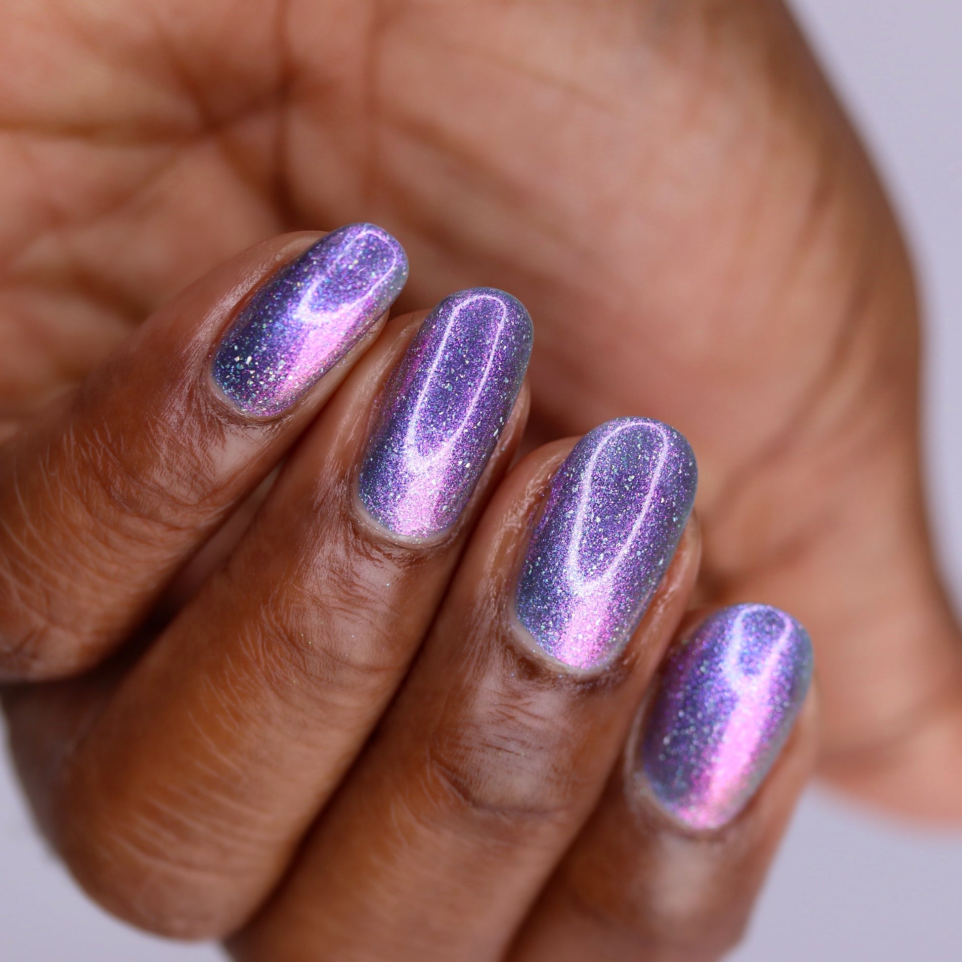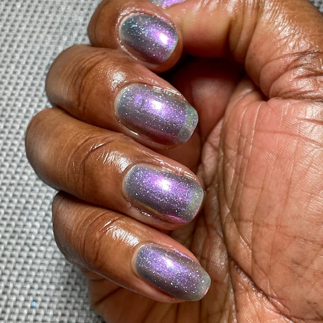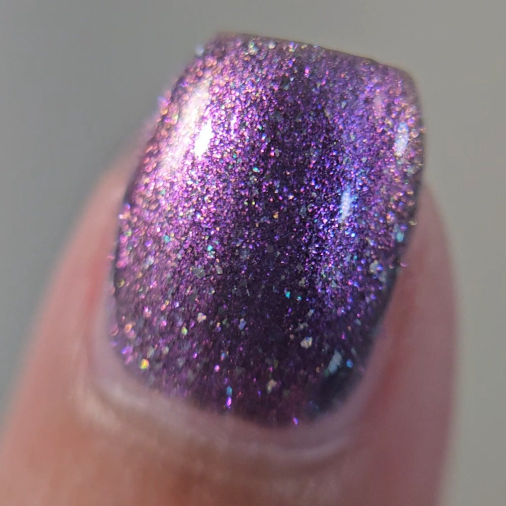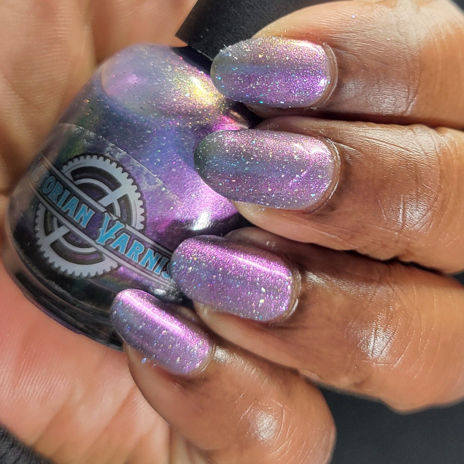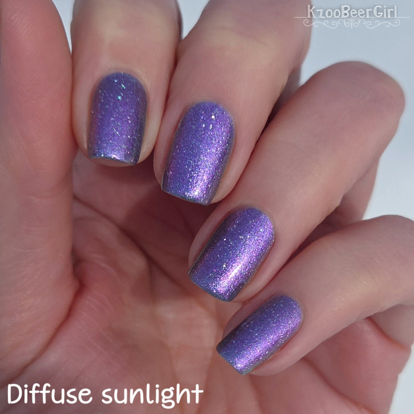 A sheer indigo base with large particle aurora shimmer that ranges from bright purple/pink and green/gold bronze at extreme angles with a pollinating amount of holo flakes (holo dust)