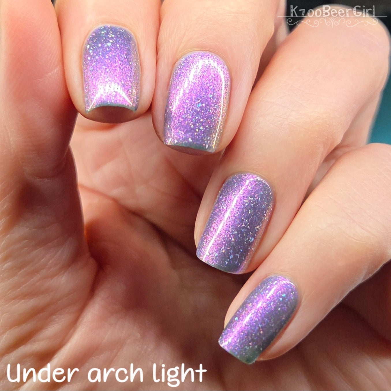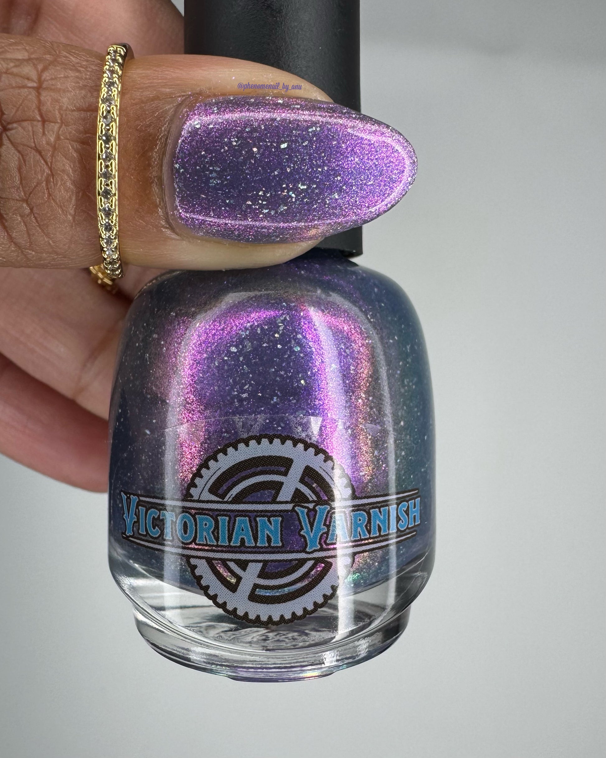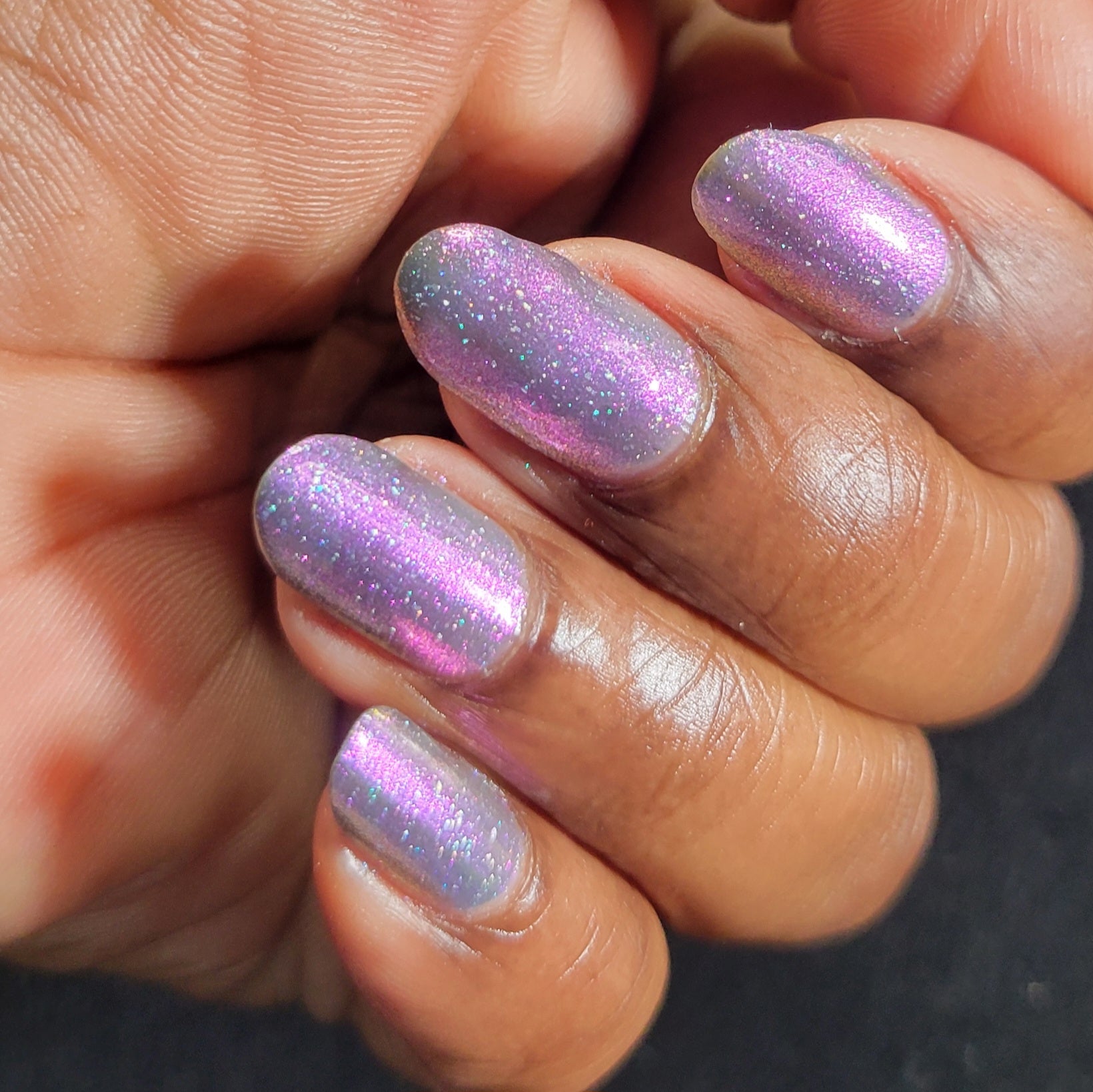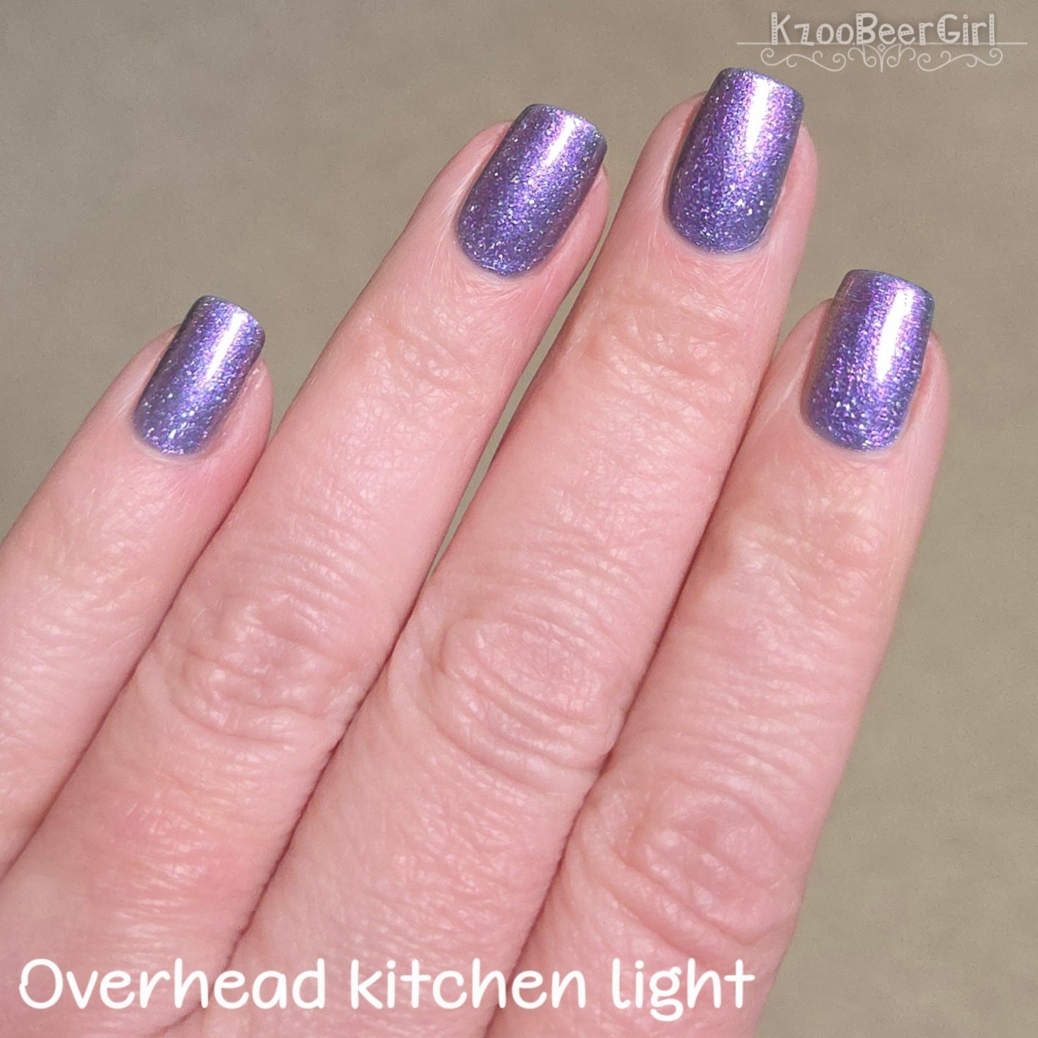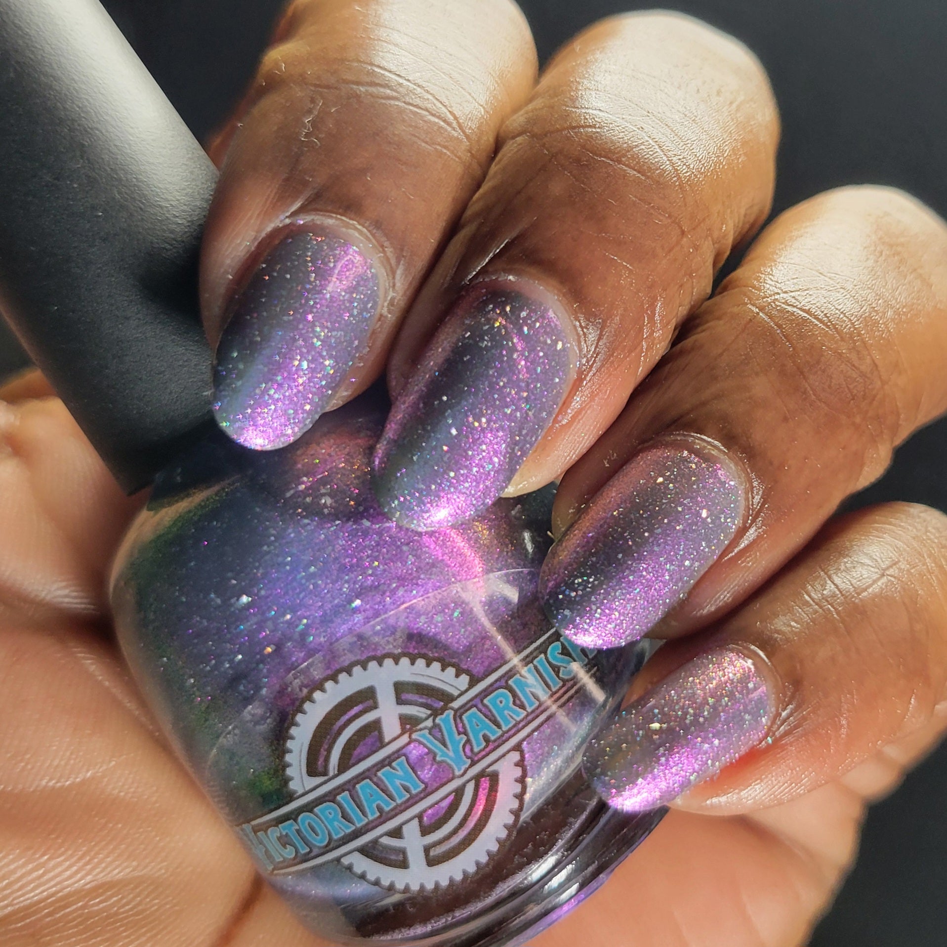 A sheer indigo base with large particle aurora shimmer that ranges from bright purple/pink and green/gold bronze at extreme angles with a pollinating amount of holo flakes (holo dust)