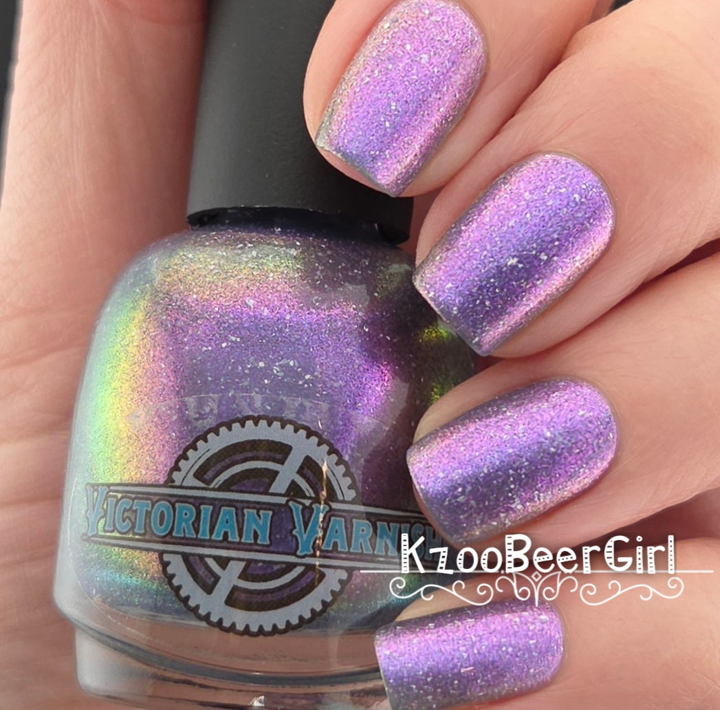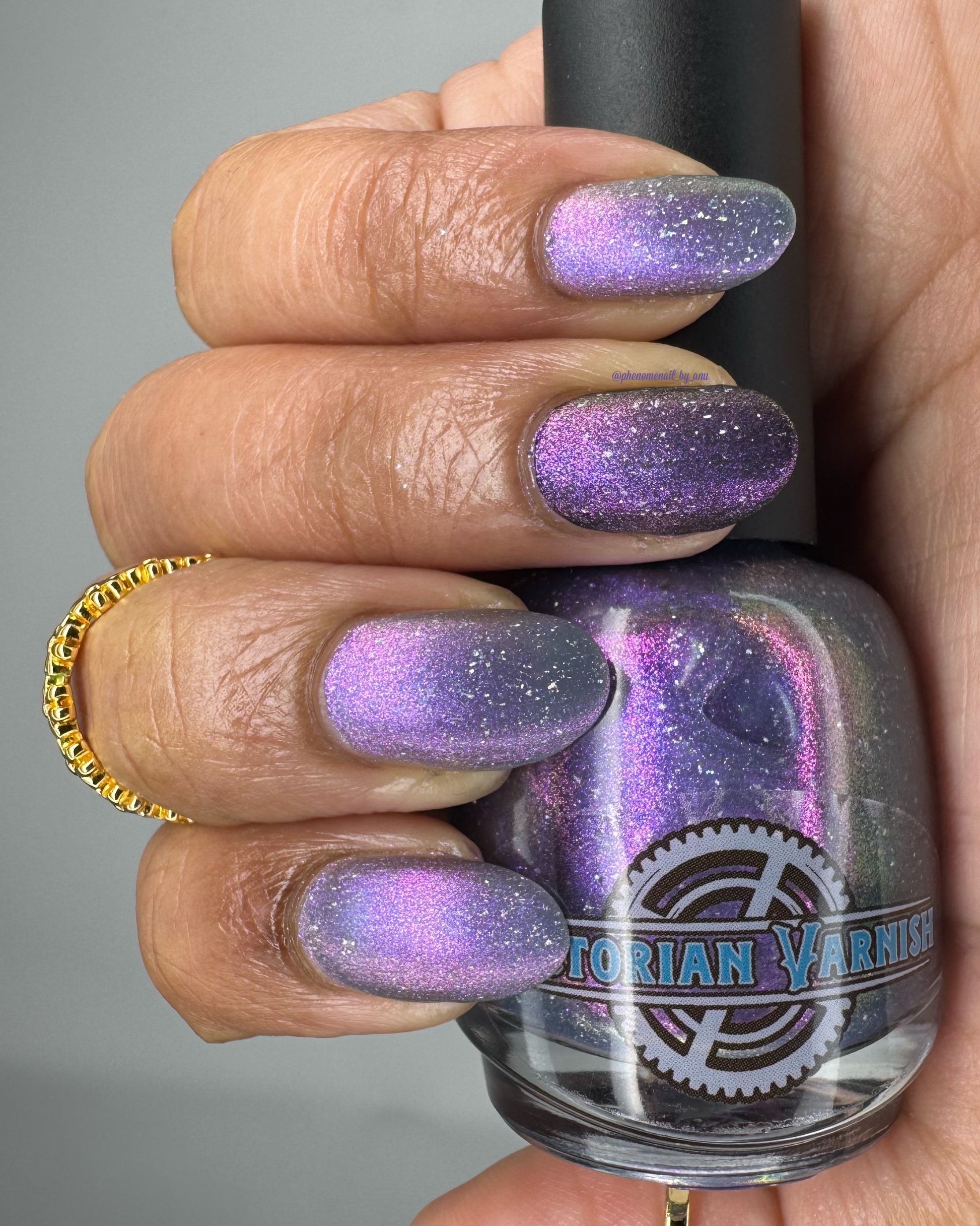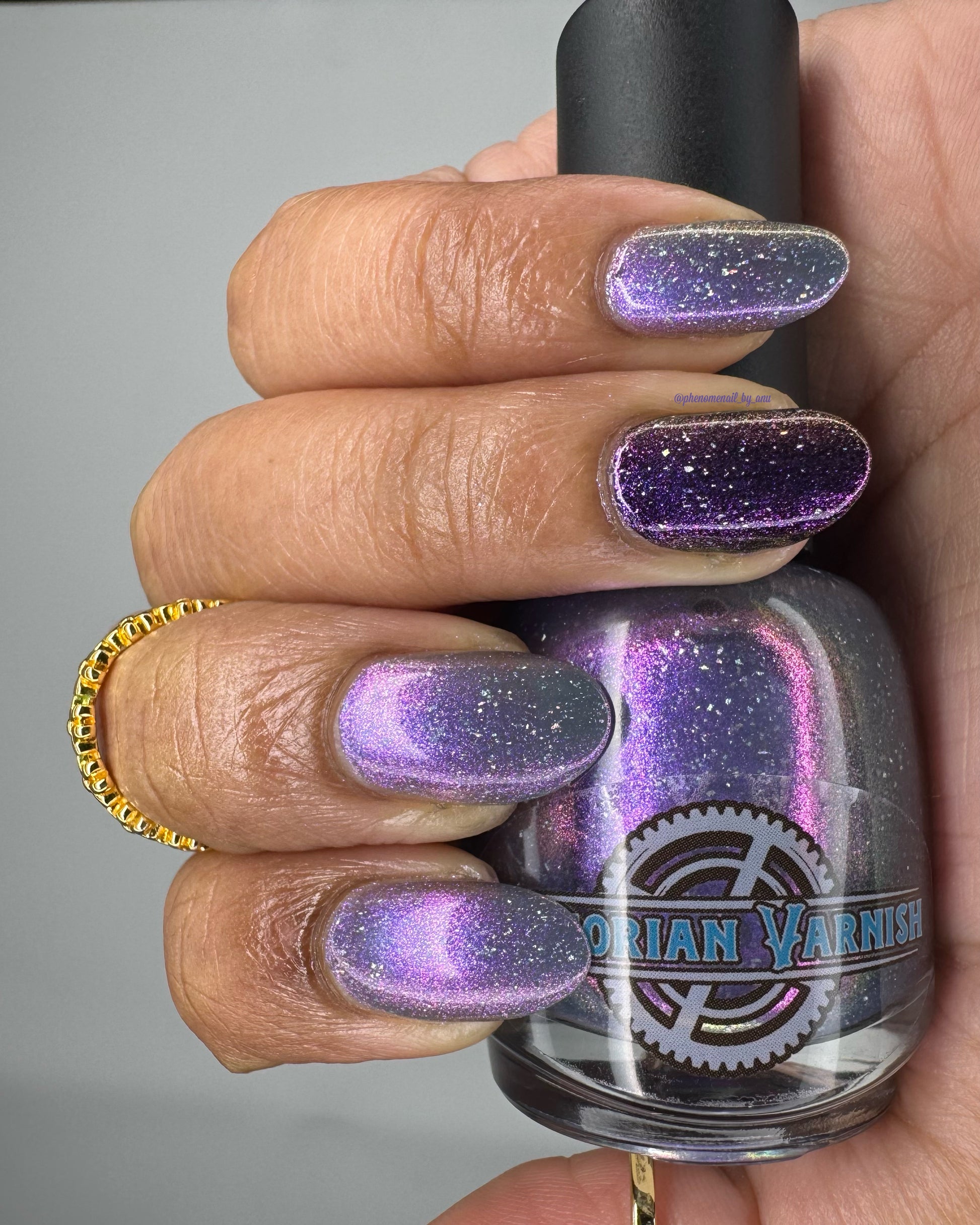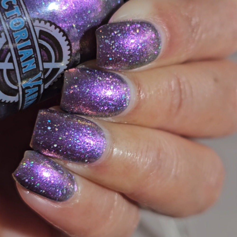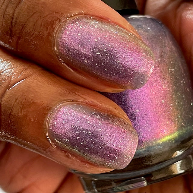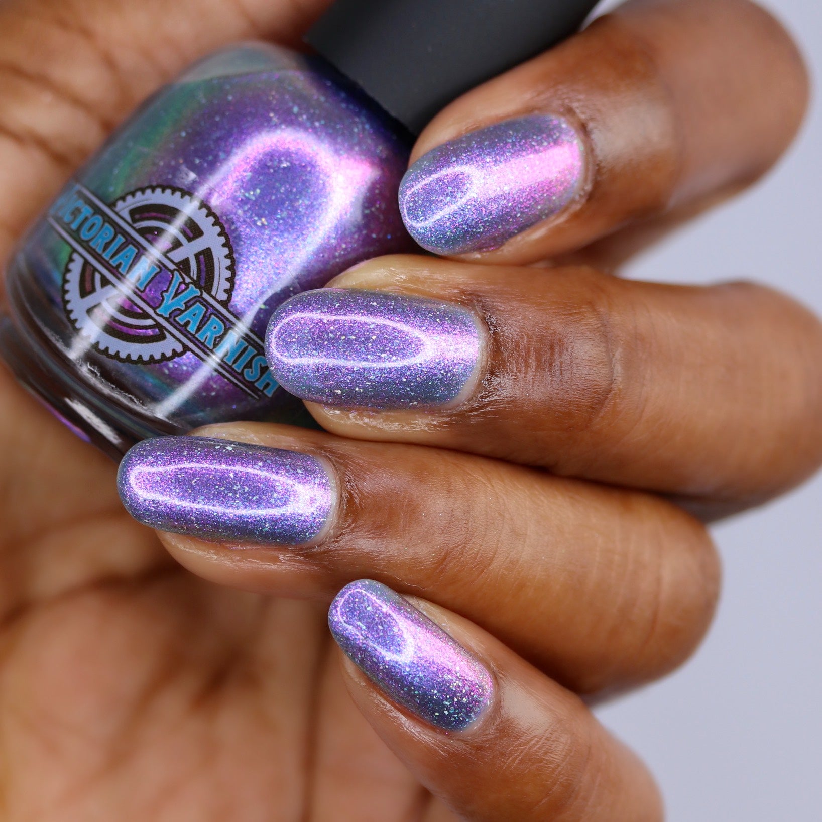 A sheer indigo base with large particle aurora shimmer that ranges from bright purple/pink and green/gold bronze at extreme angles with a pollinating amount of holo flakes (holo dust)