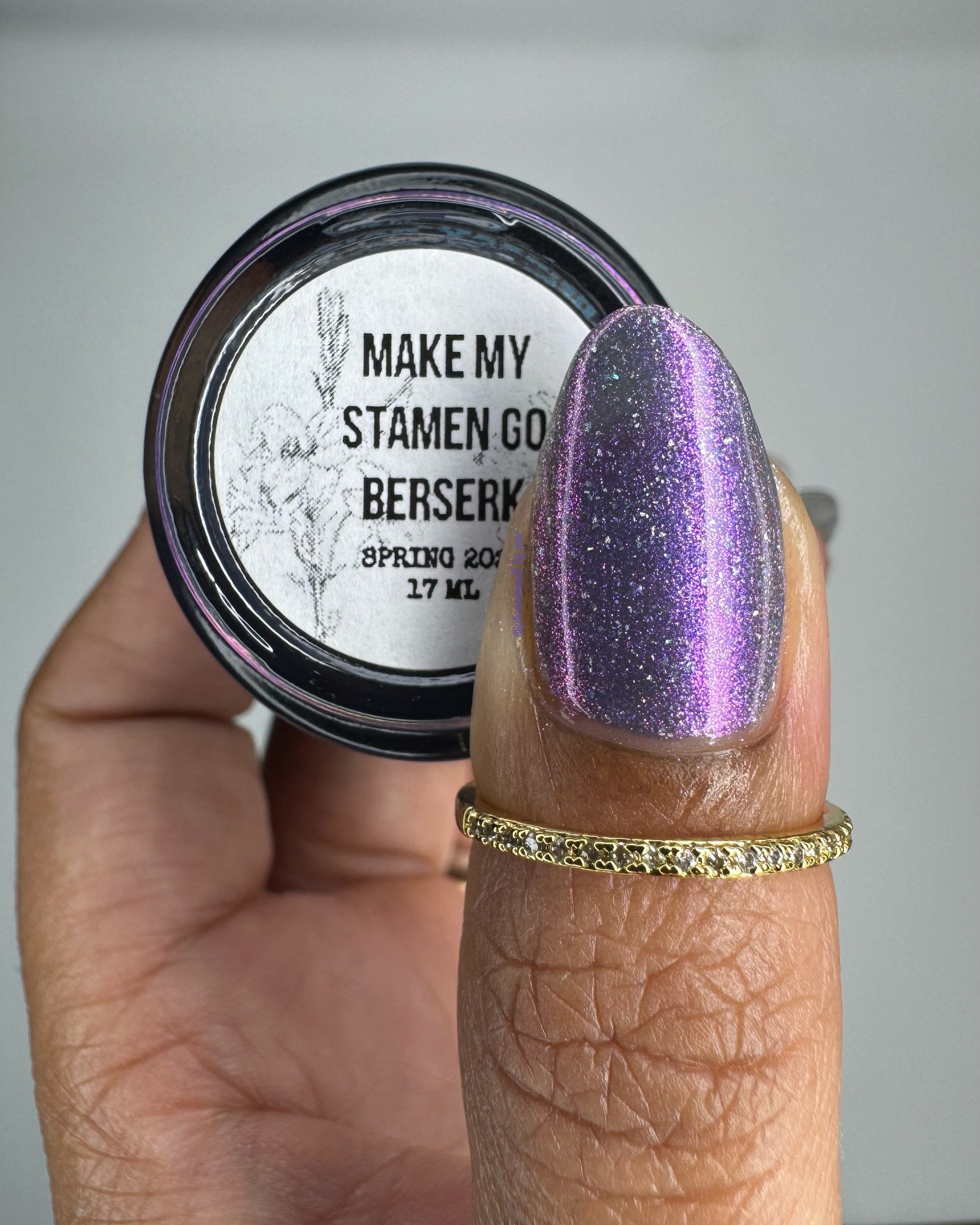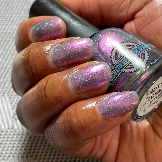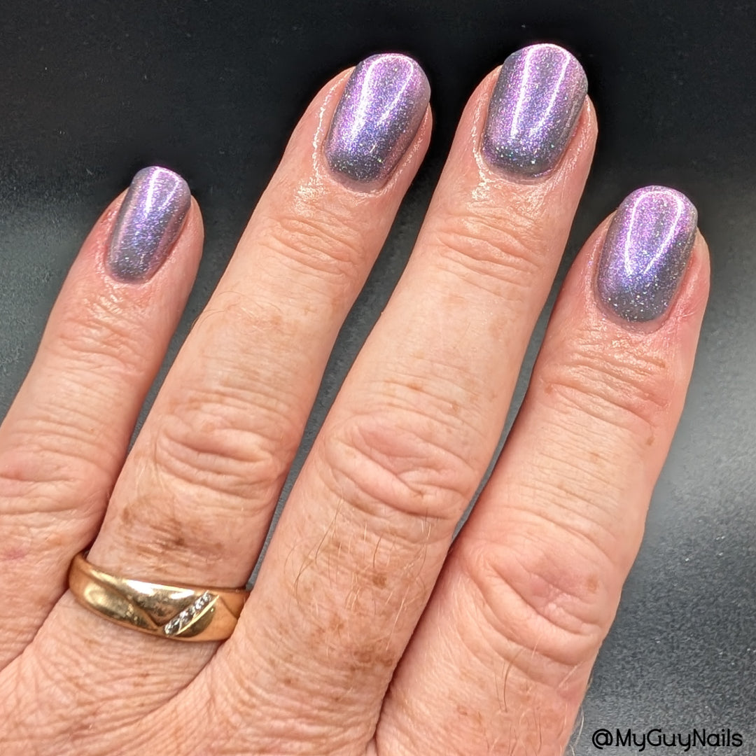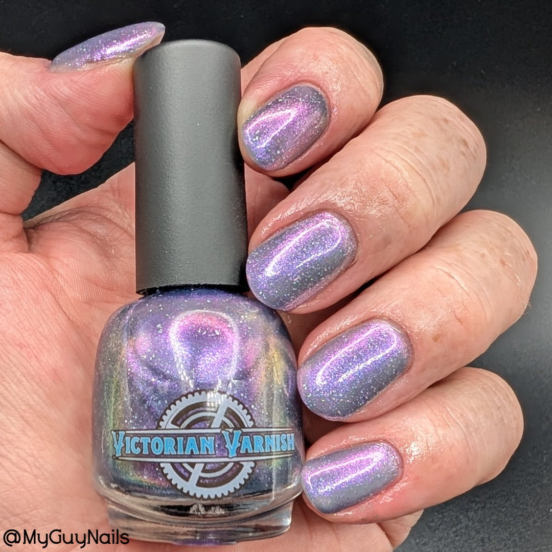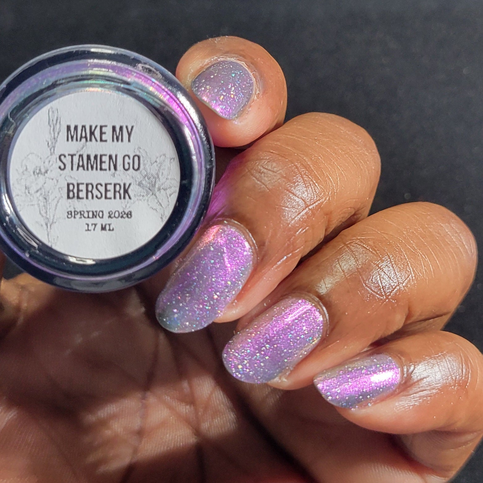A sheer indigo base with large particle aurora shimmer that ranges from bright purple/pink and green/gold bronze at extreme angles with a pollinating amount of holo flakes (holo dust)