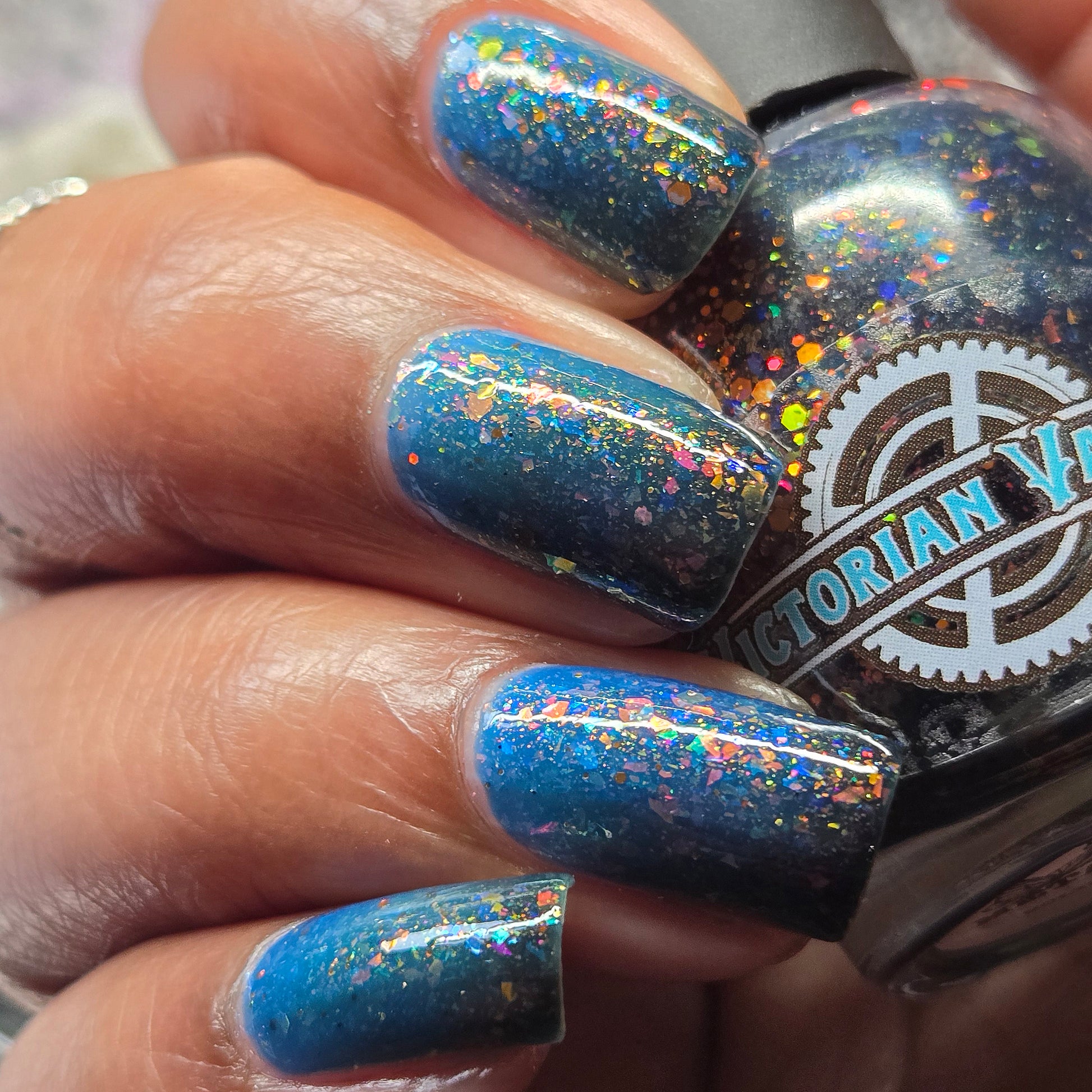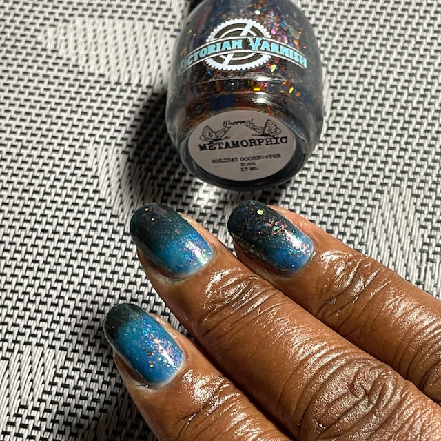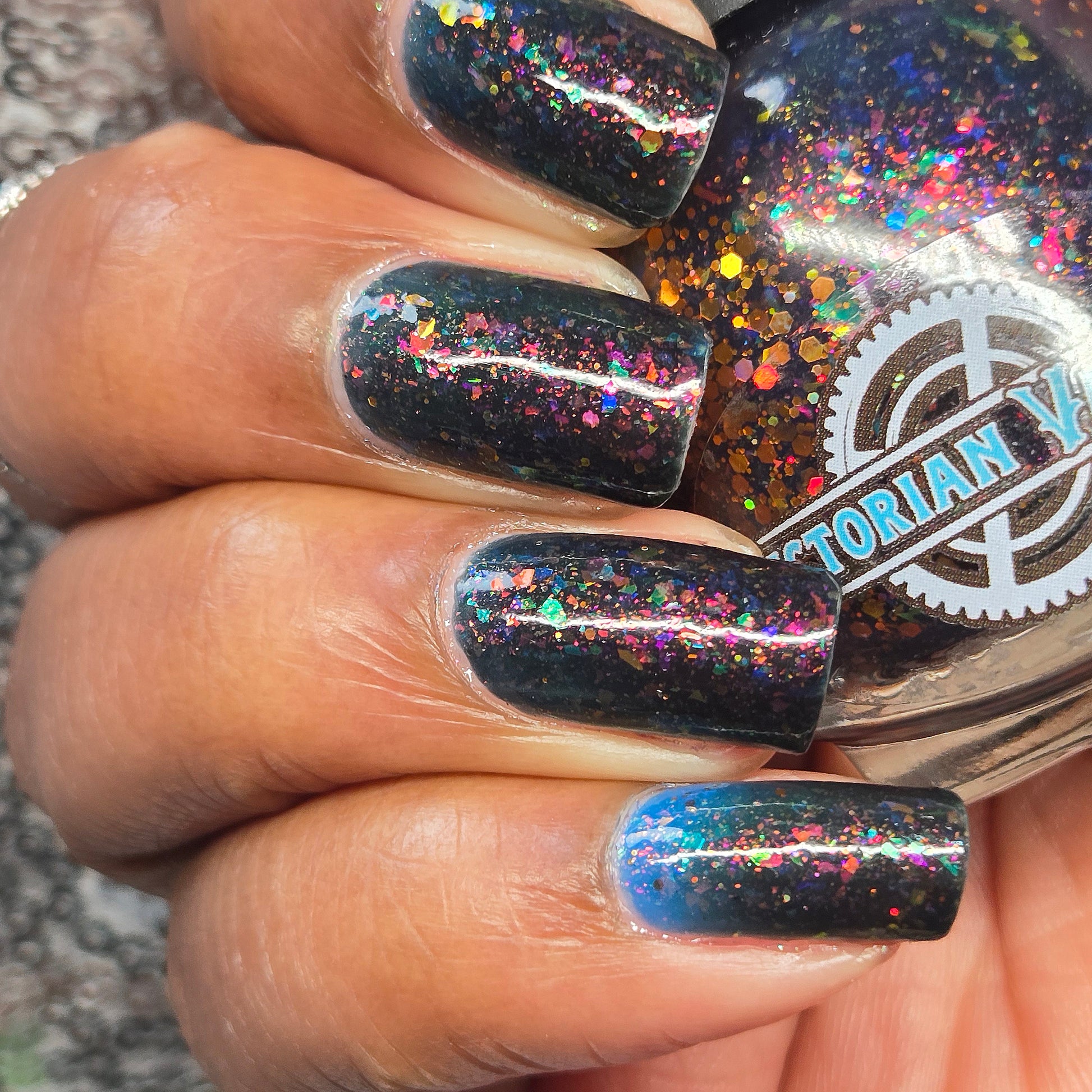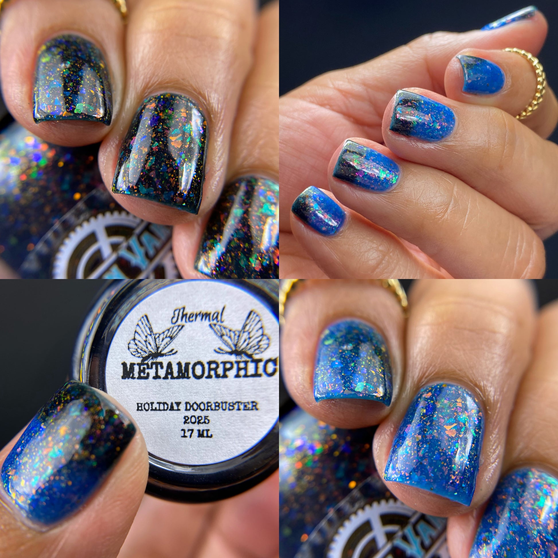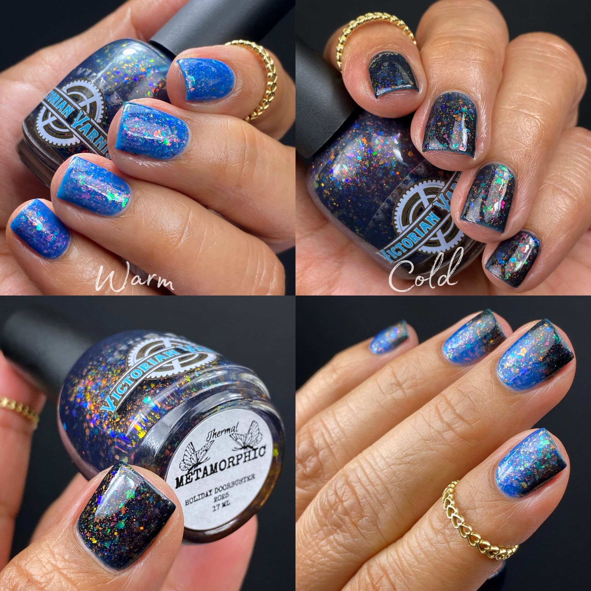 Dark Navy almost black (cold state) to Blue (warm state) with red/orange large particle aurora shimmer, orange holo glitters, and chameleon flakes that look different in each state.
