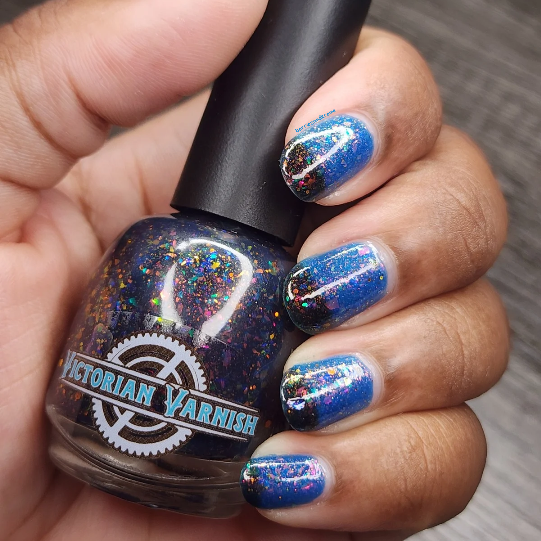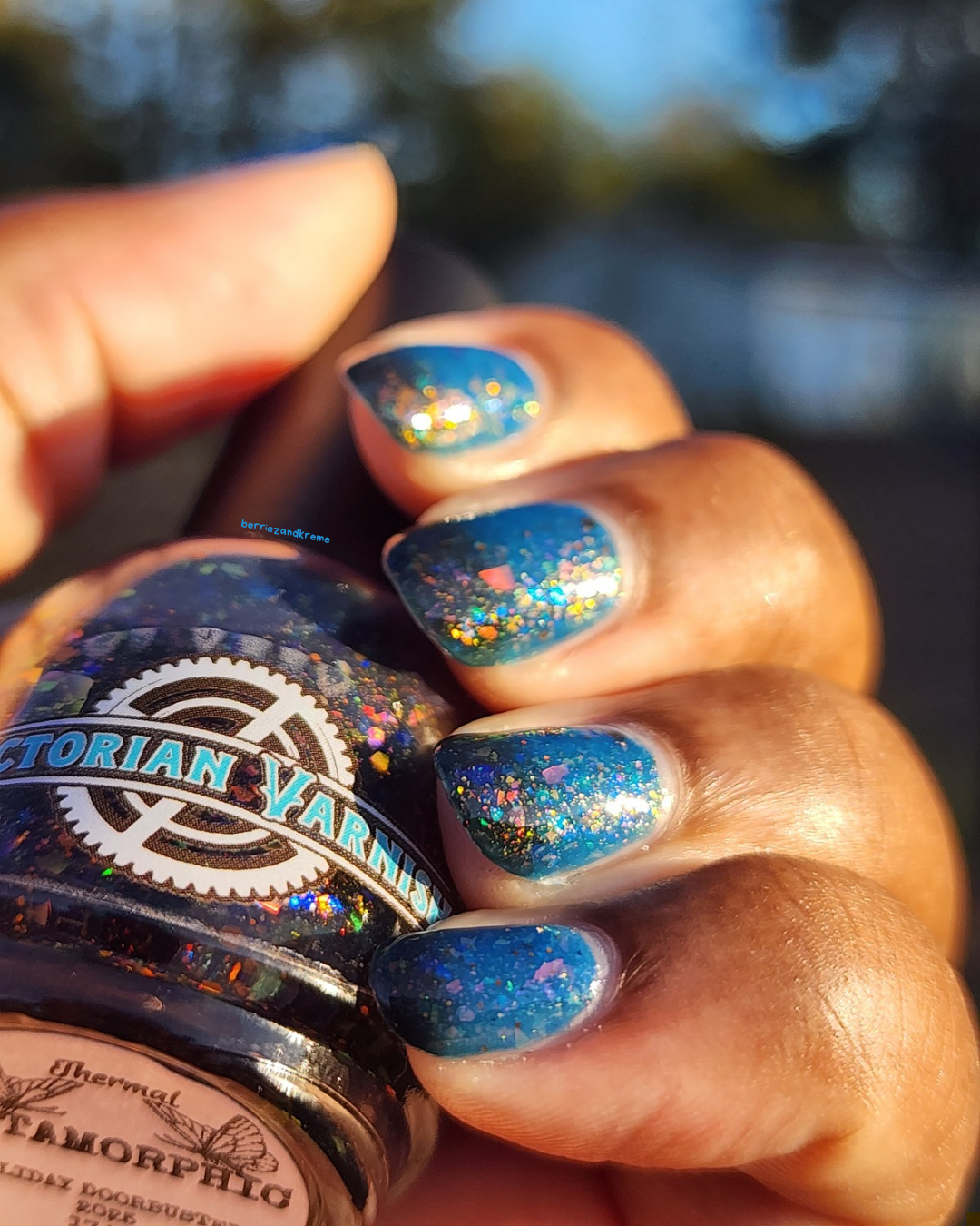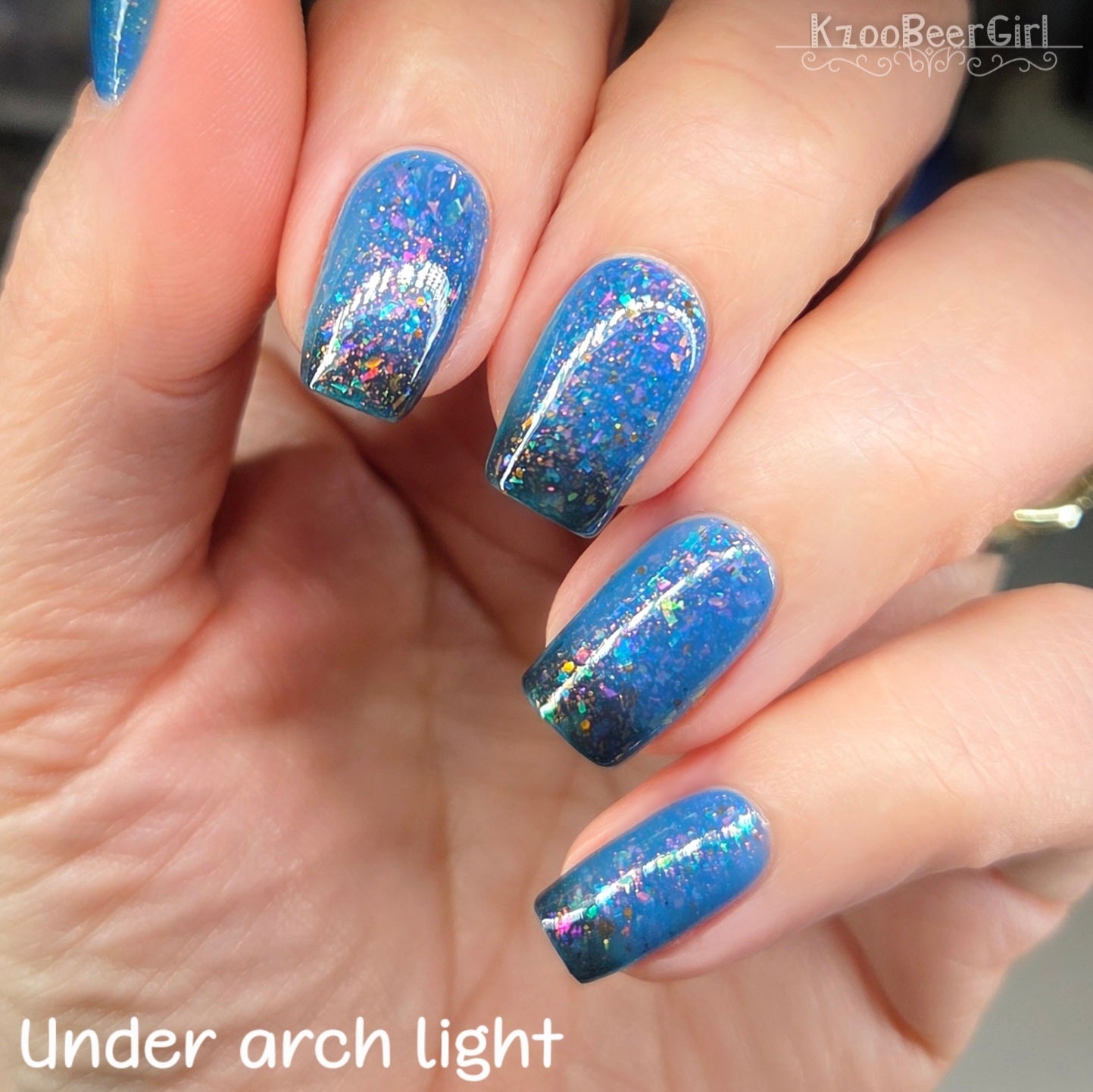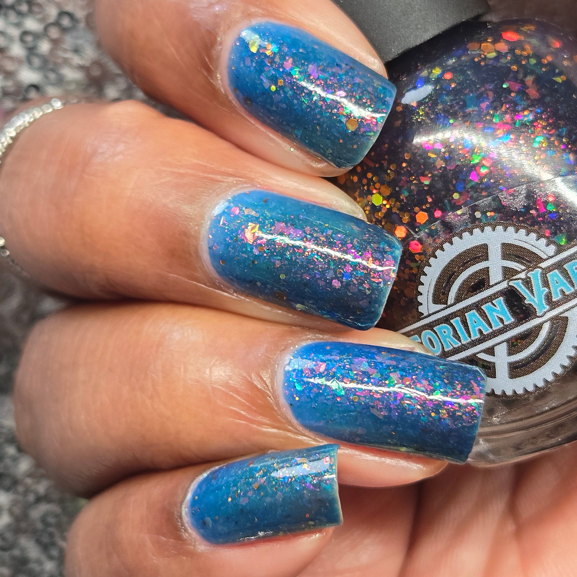 Dark Navy almost black (cold state) to Blue (warm state) with red/orange large particle aurora shimmer, orange holo glitters, and chameleon flakes that look different in each state.