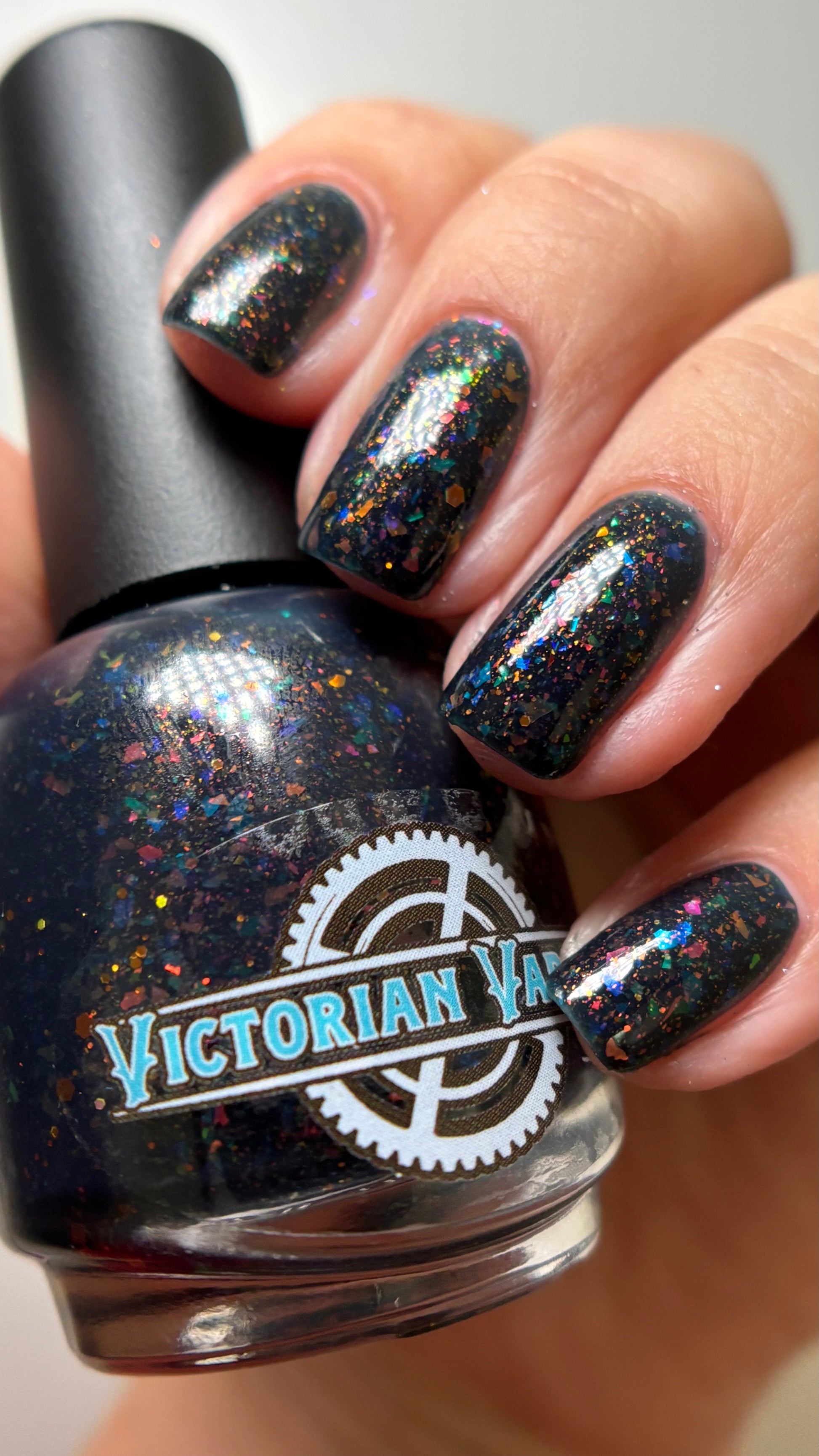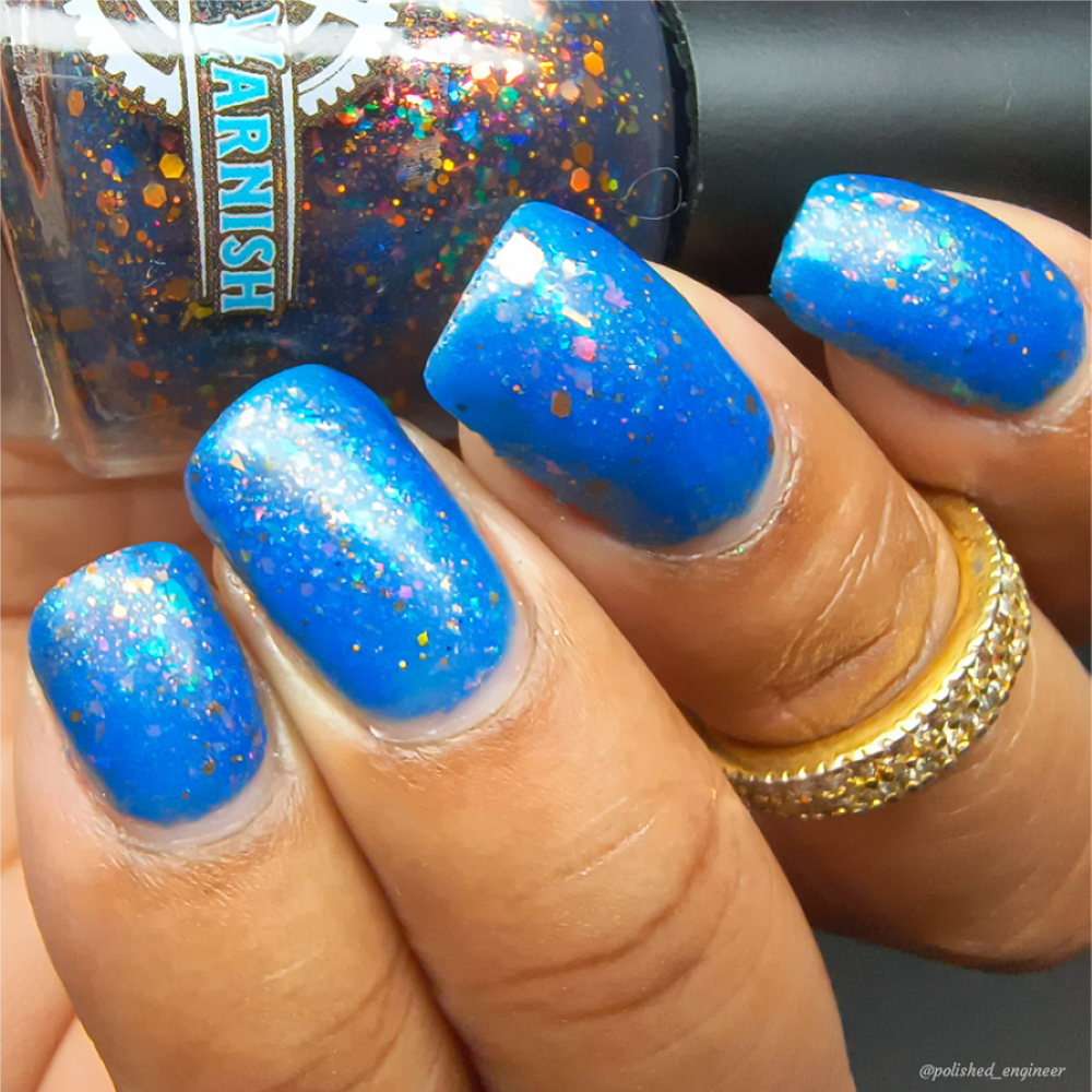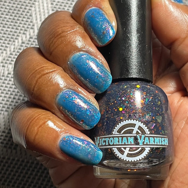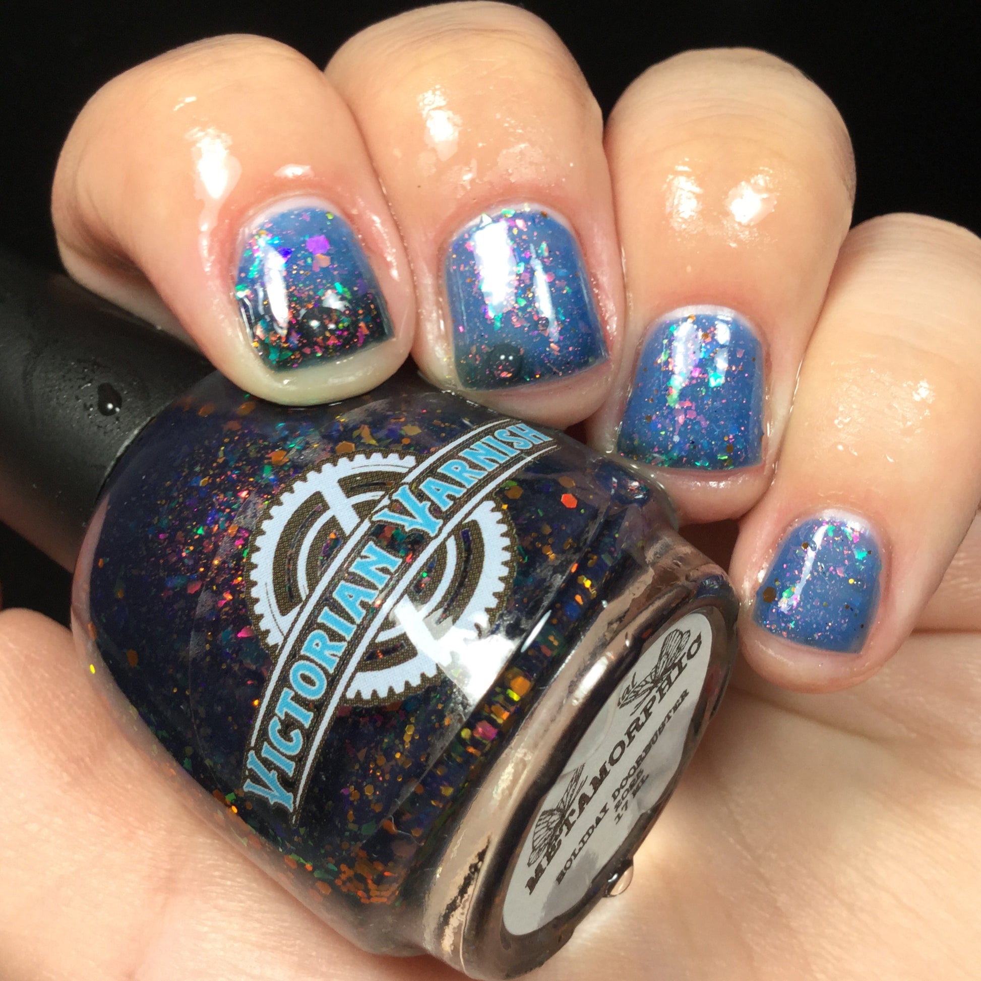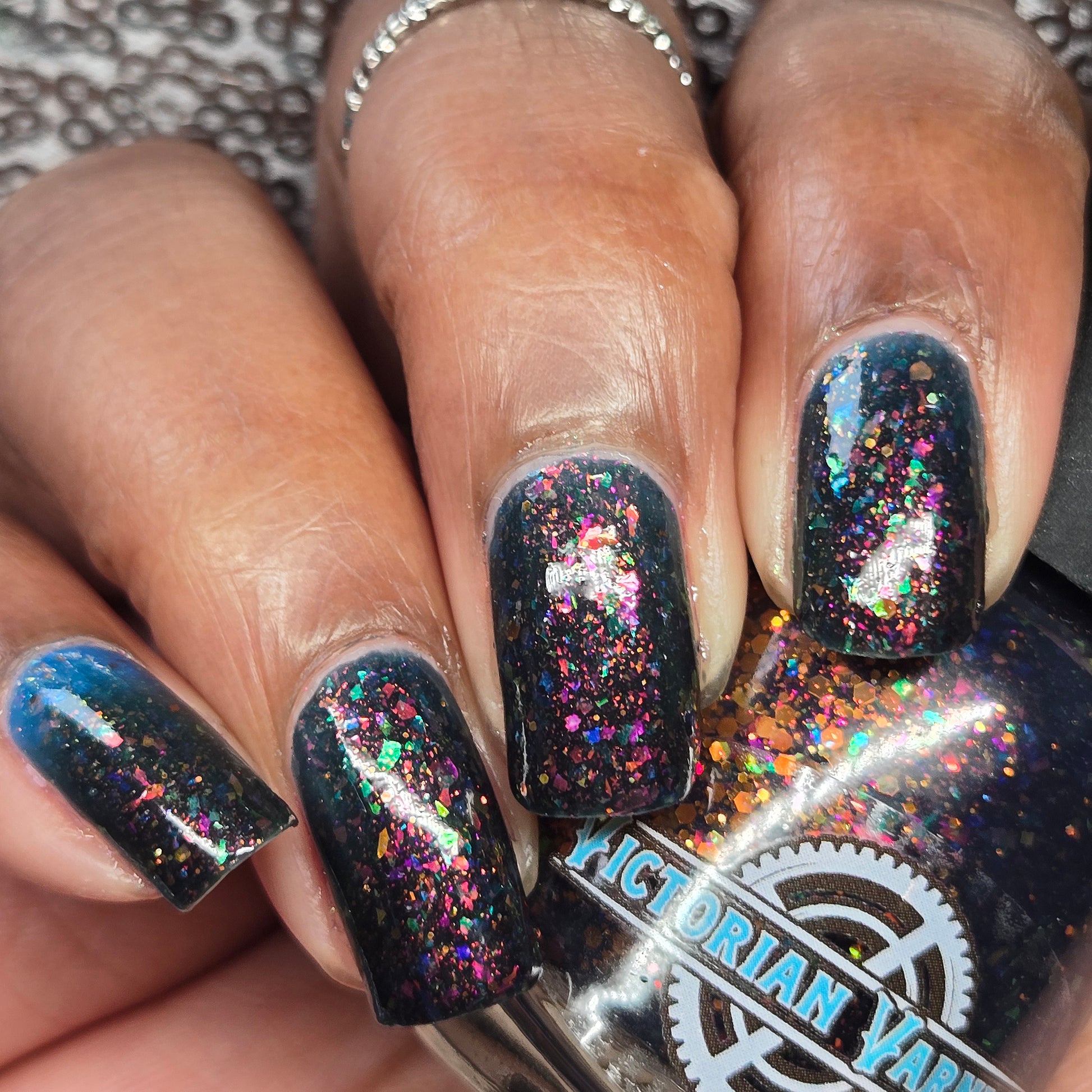 Dark Navy almost black (cold state) to Blue (warm state) with red/orange large particle aurora shimmer, orange holo glitters, and chameleon flakes that look different in each state.