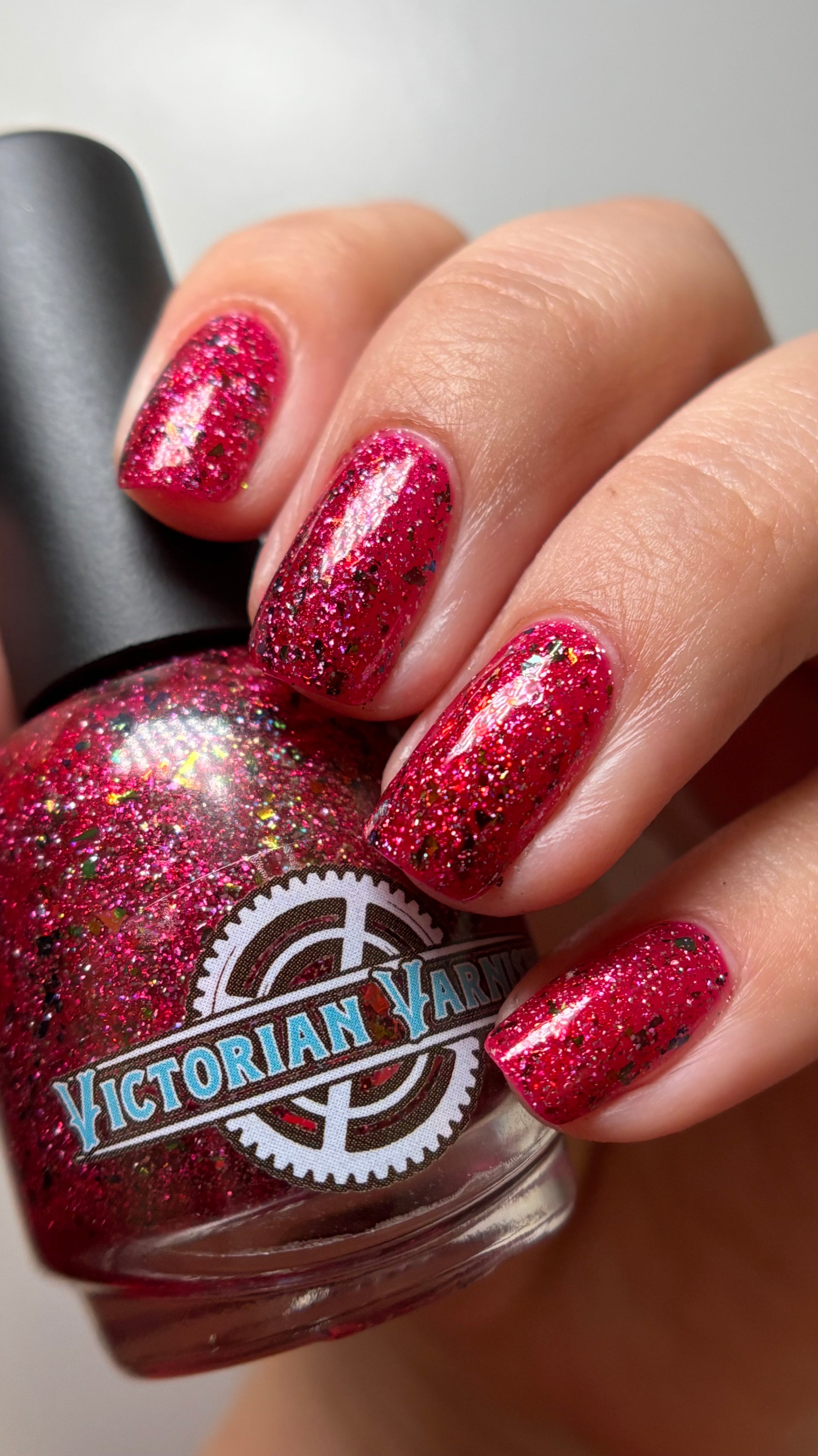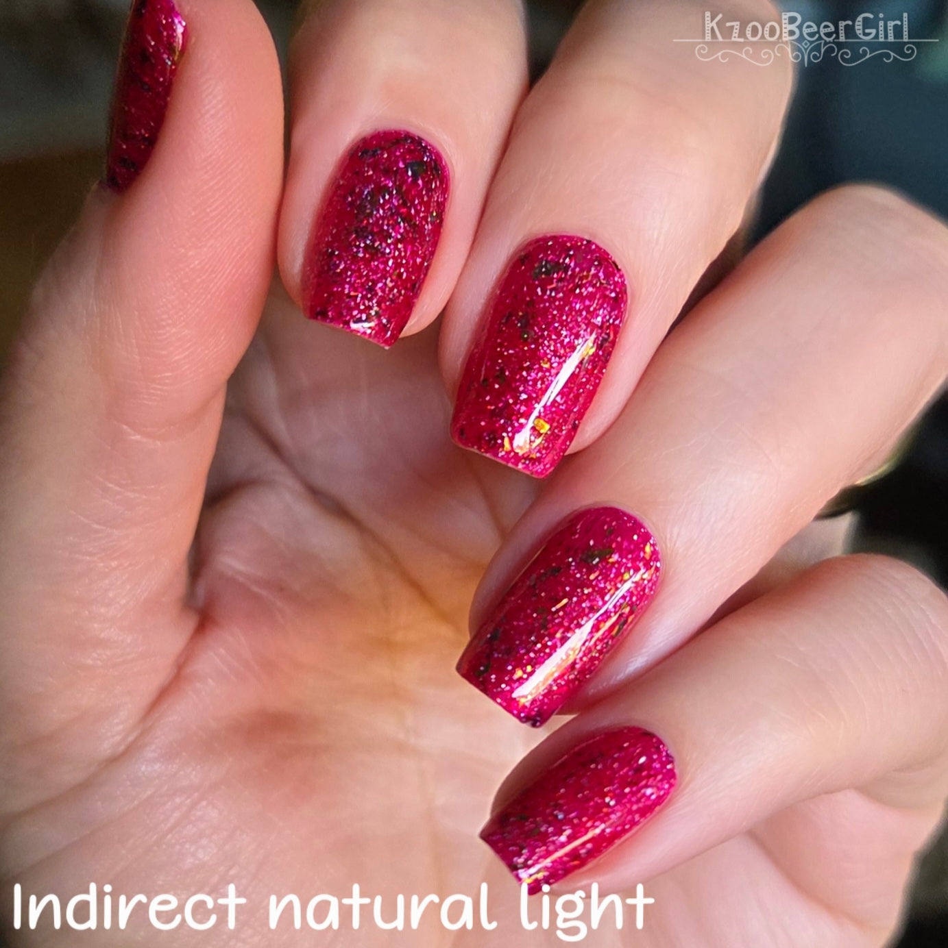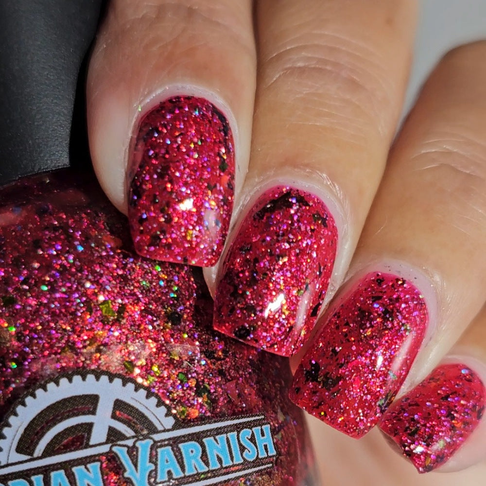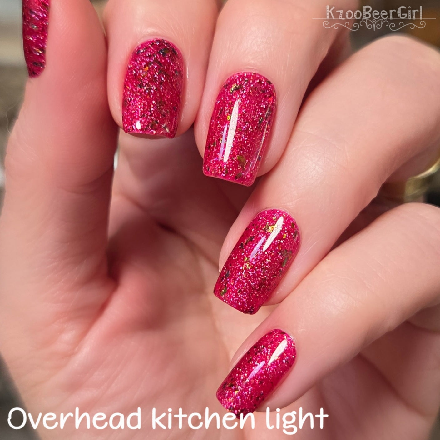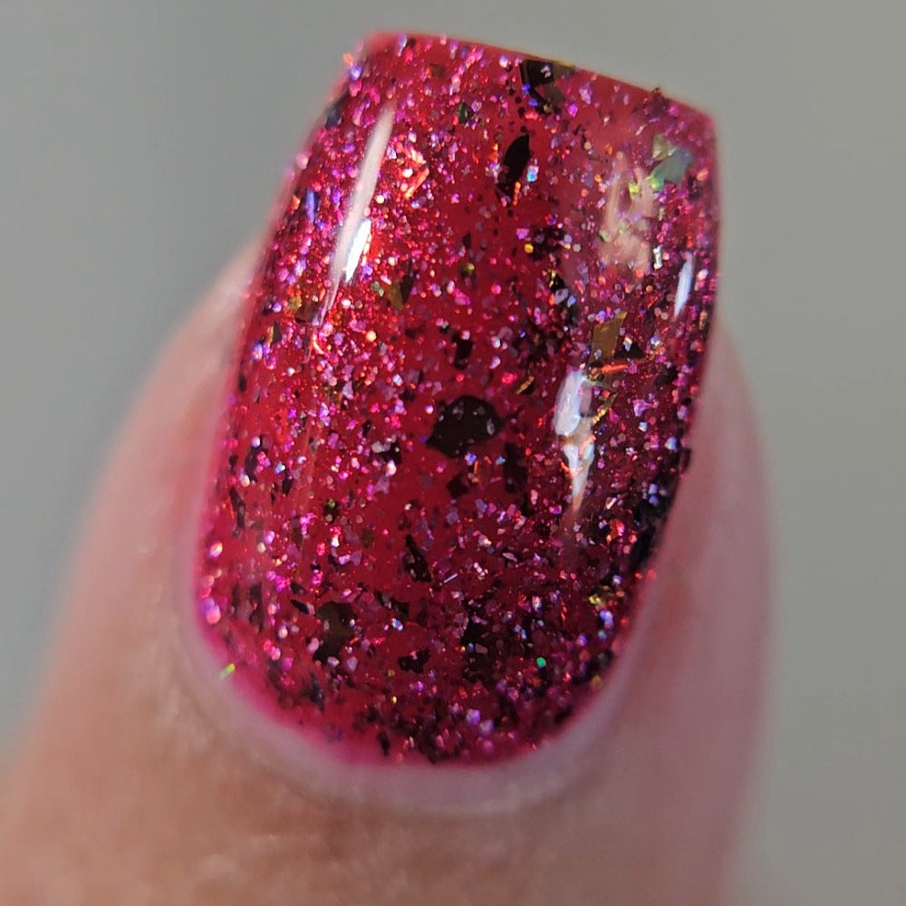 A red base with berry blue undertones, scattered holo, holo flakes, UCC flakes and crystal chameleon flakes