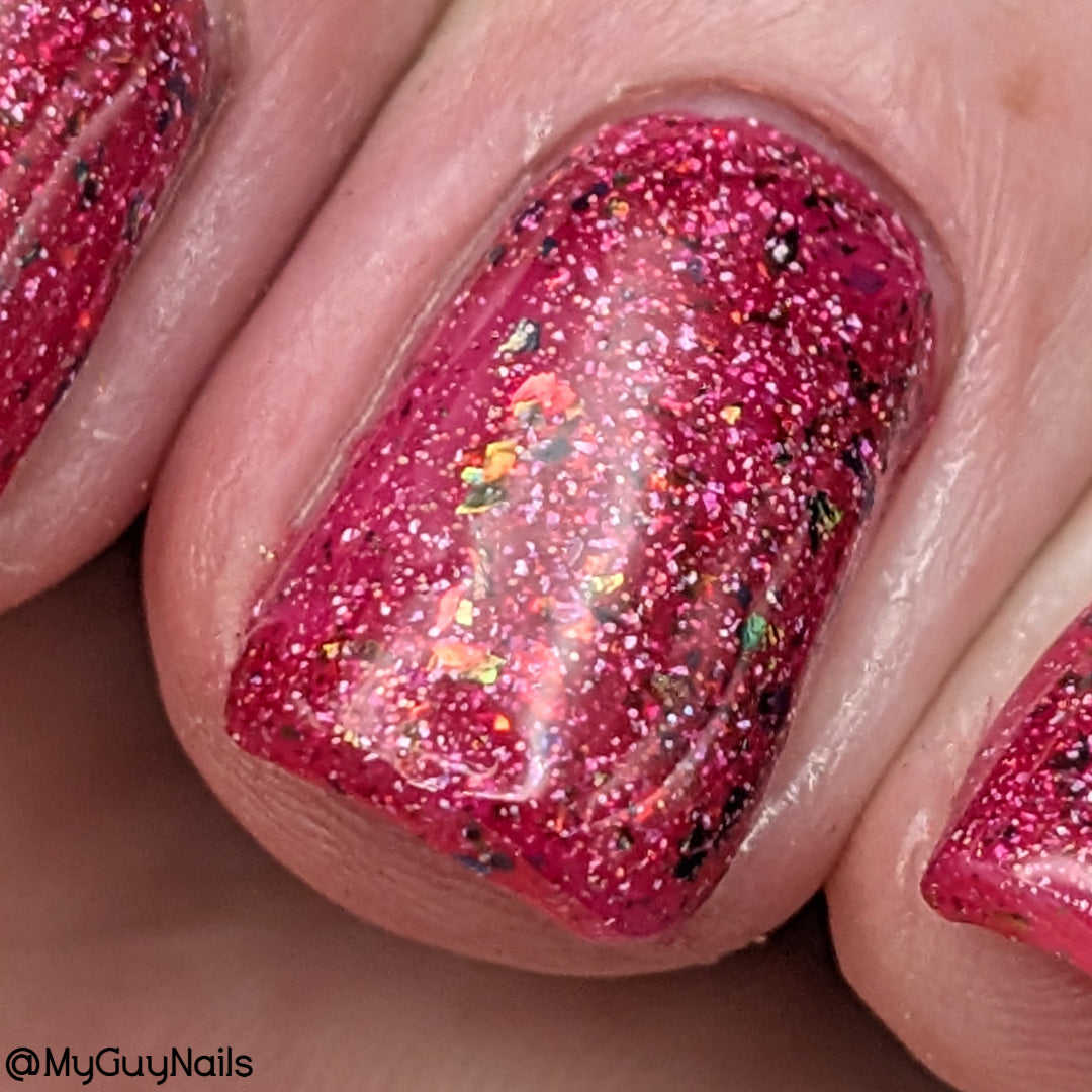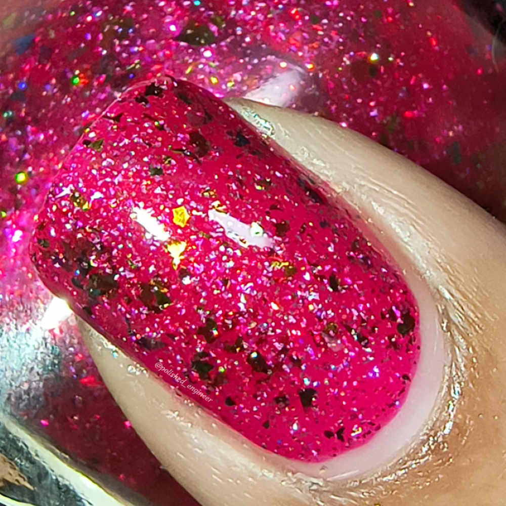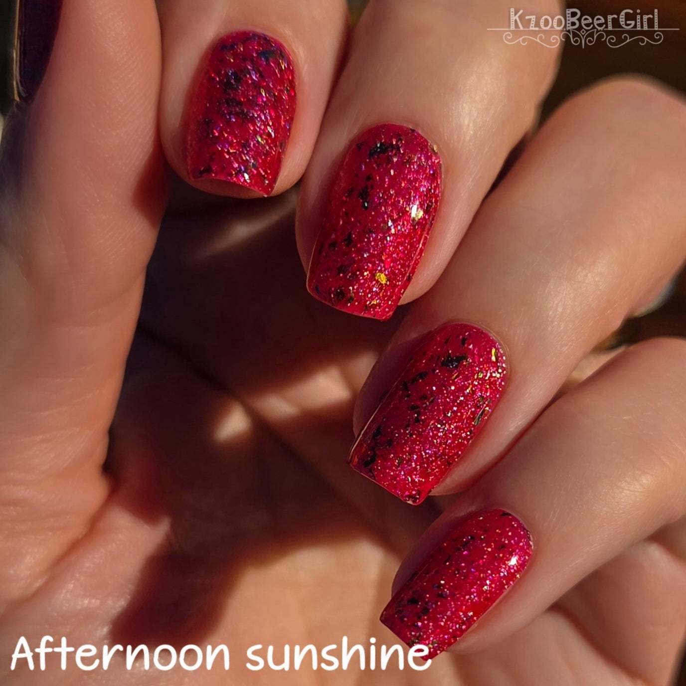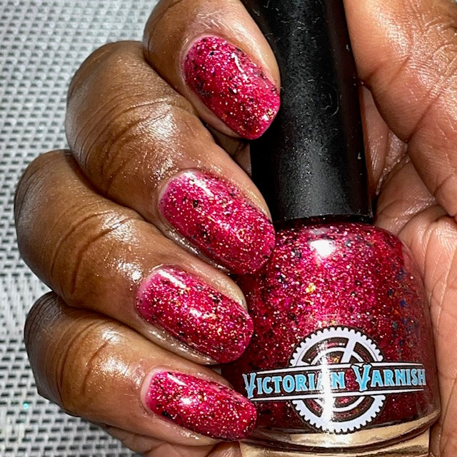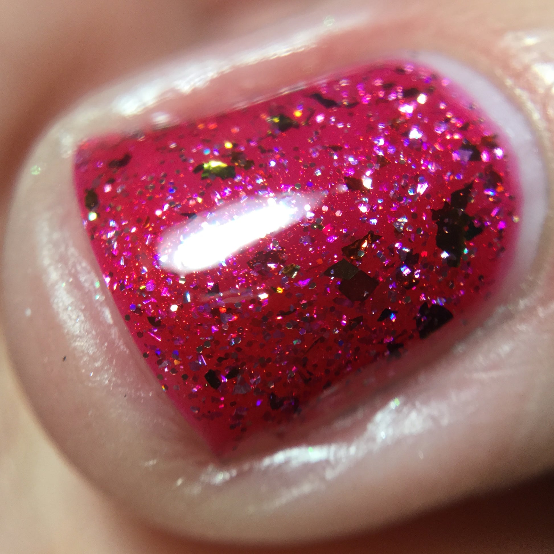 A red base with berry blue undertones, scattered holo, holo flakes, UCC flakes and crystal chameleon flakes