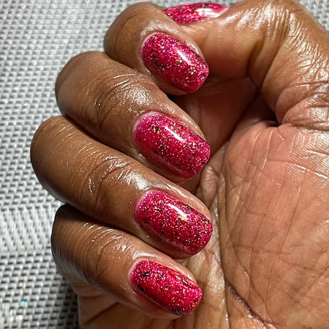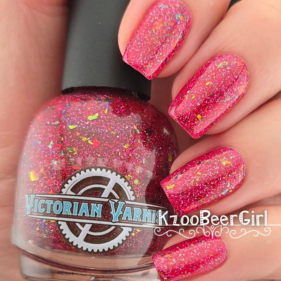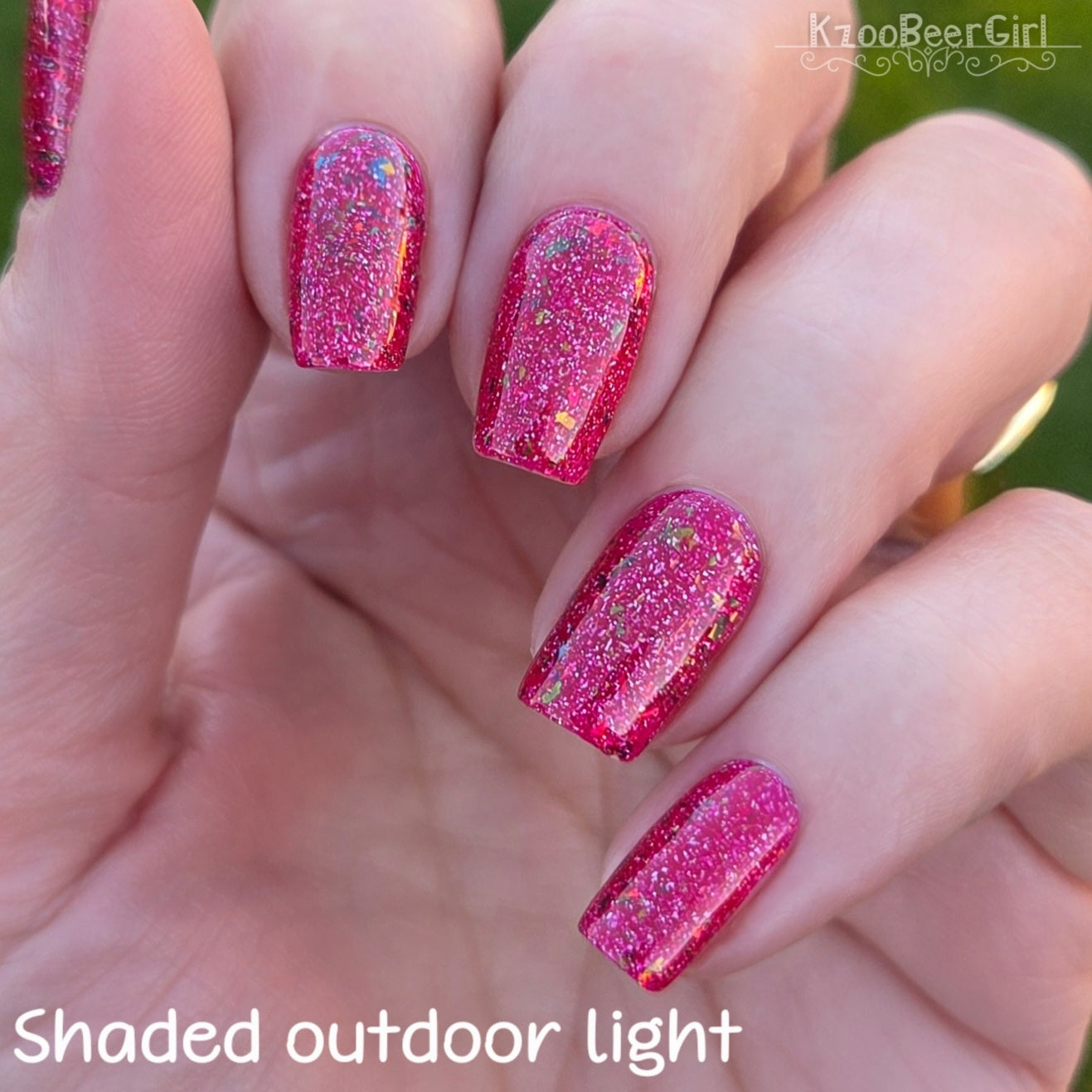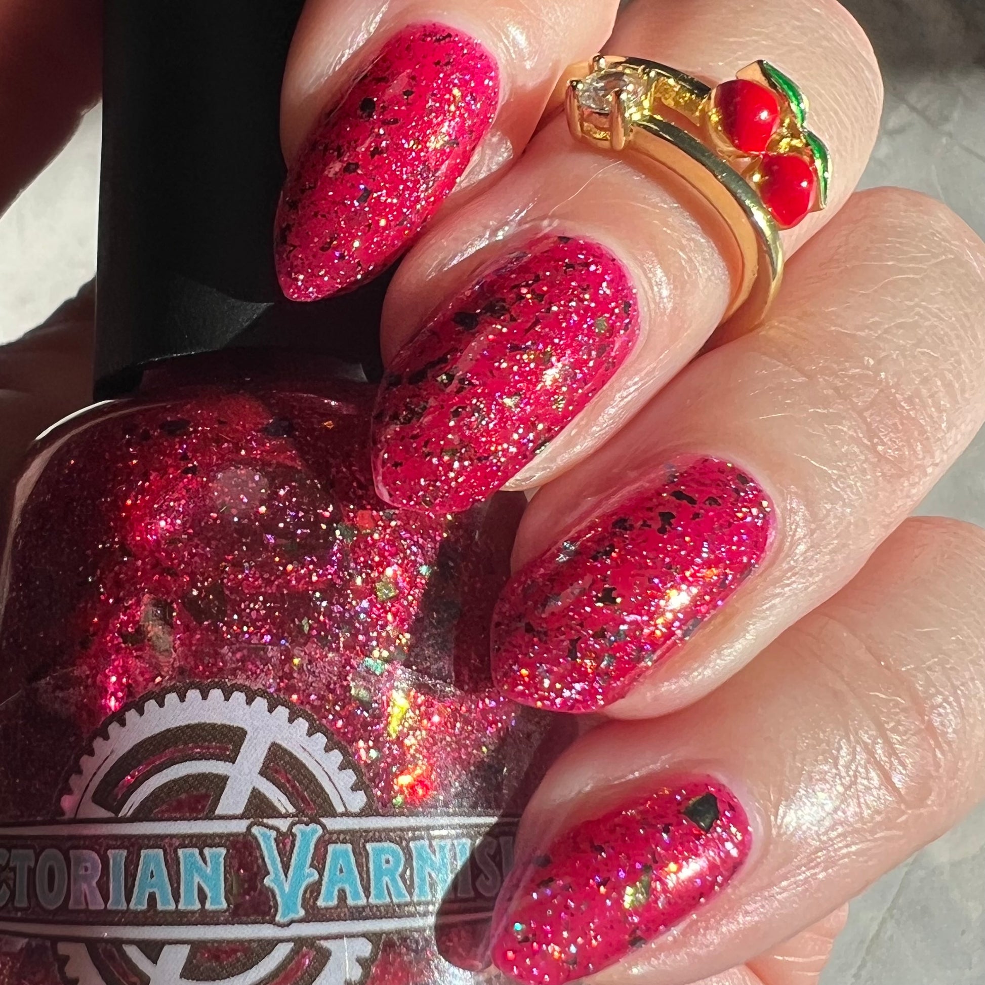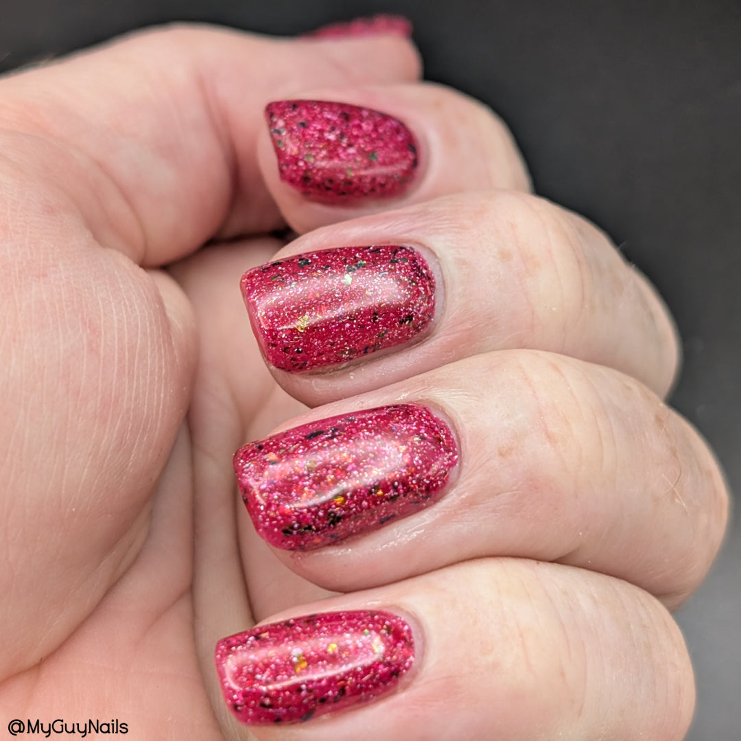 A red base with berry blue undertones, scattered holo, holo flakes, UCC flakes and crystal chameleon flakes