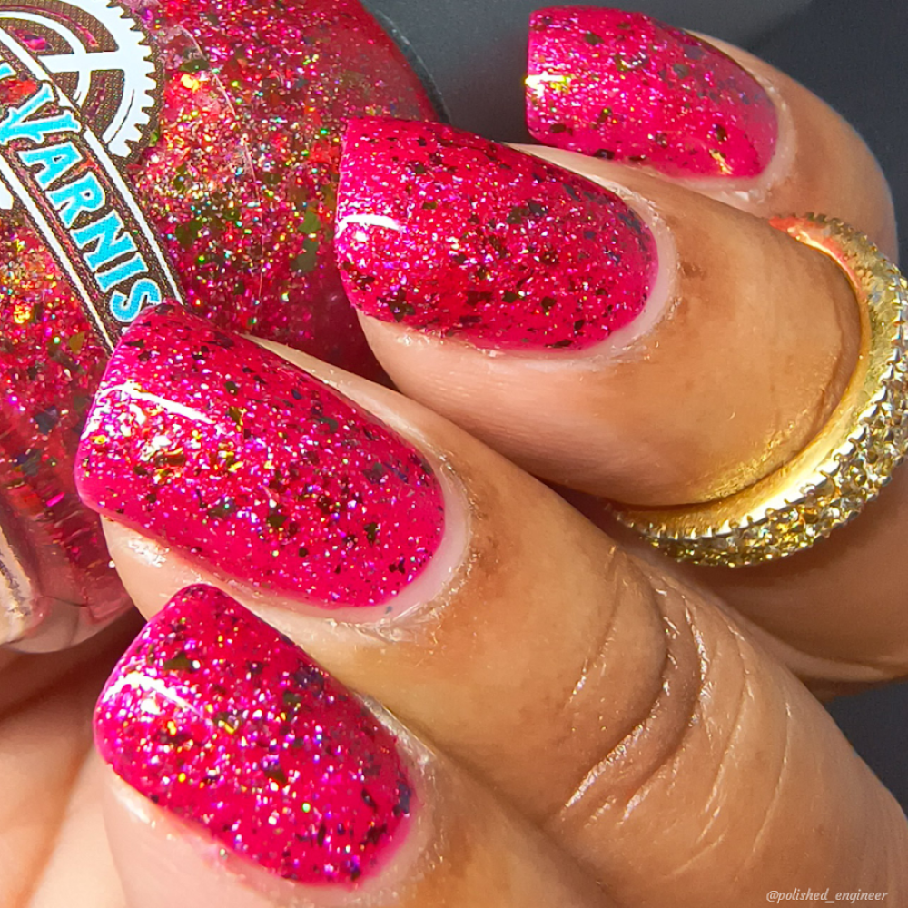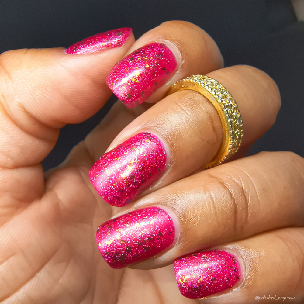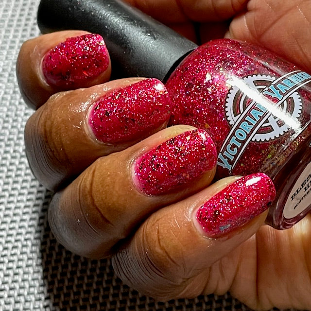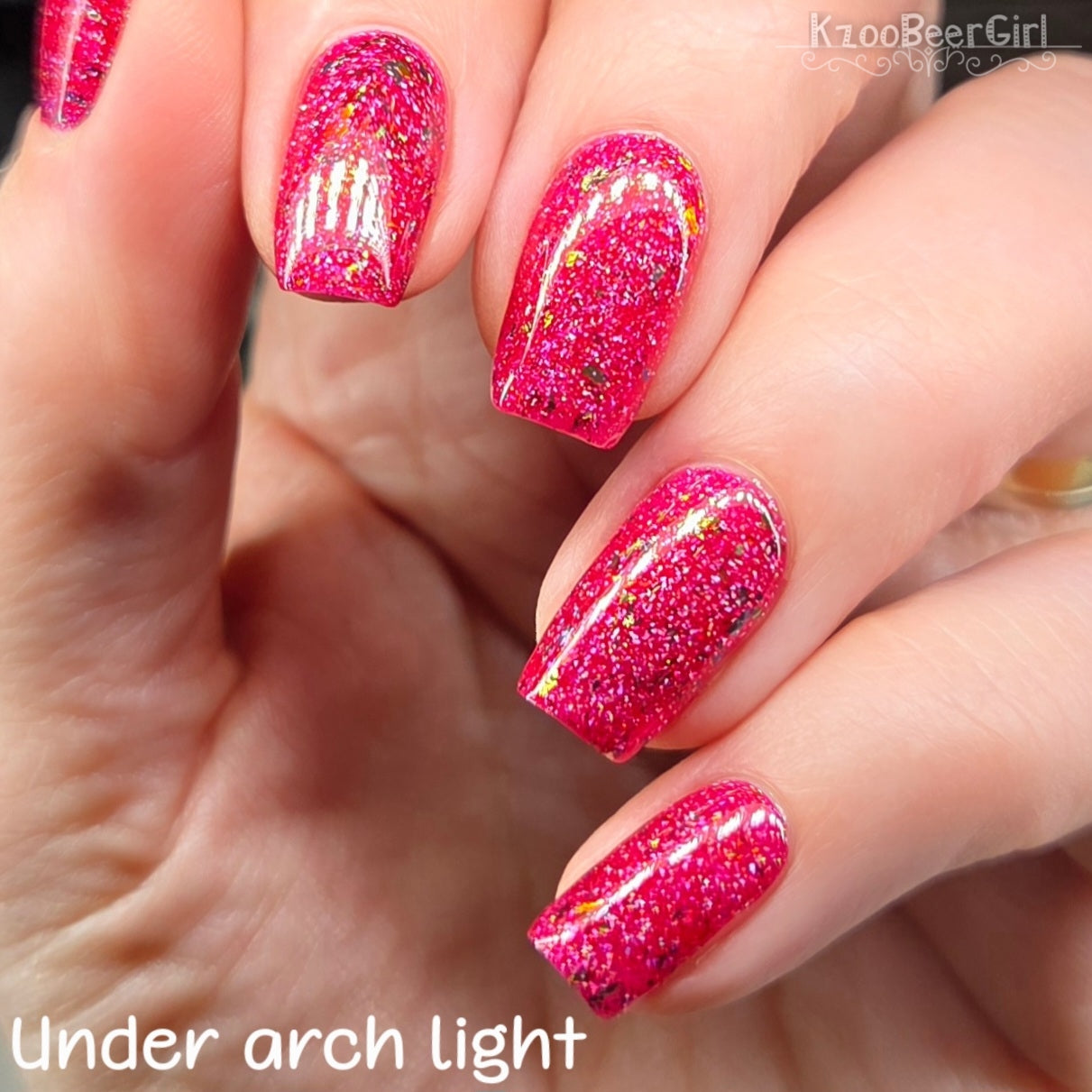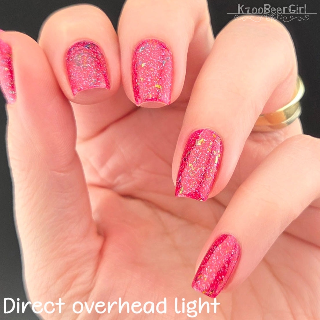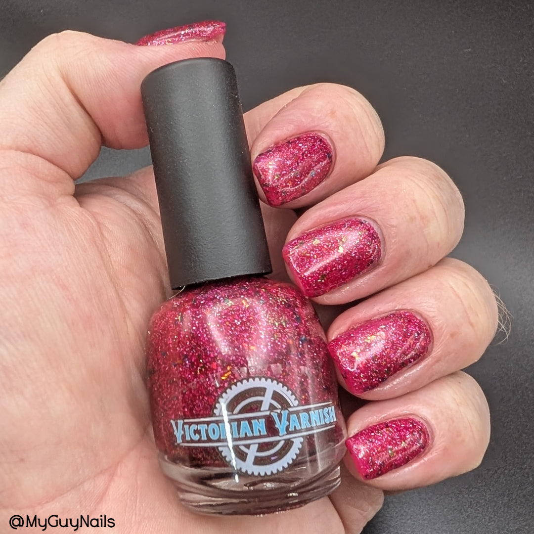 A red base with berry blue undertones, scattered holo, holo flakes, UCC flakes and crystal chameleon flakes
