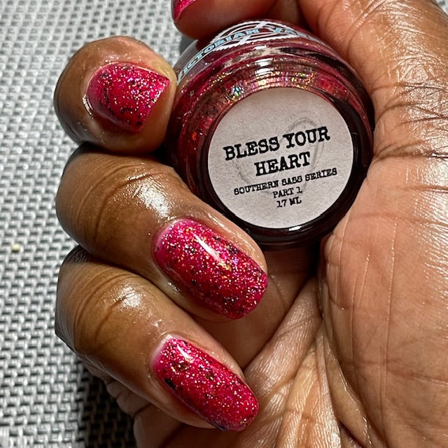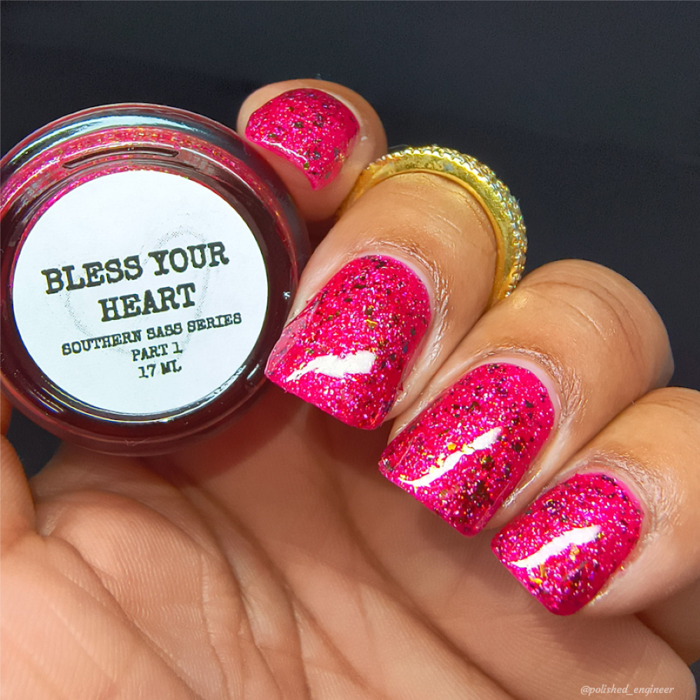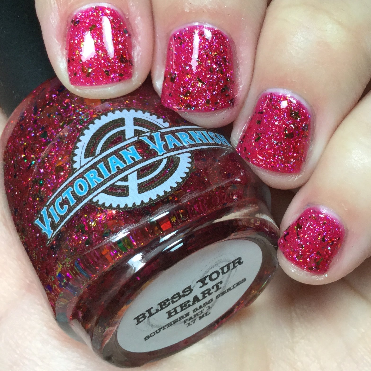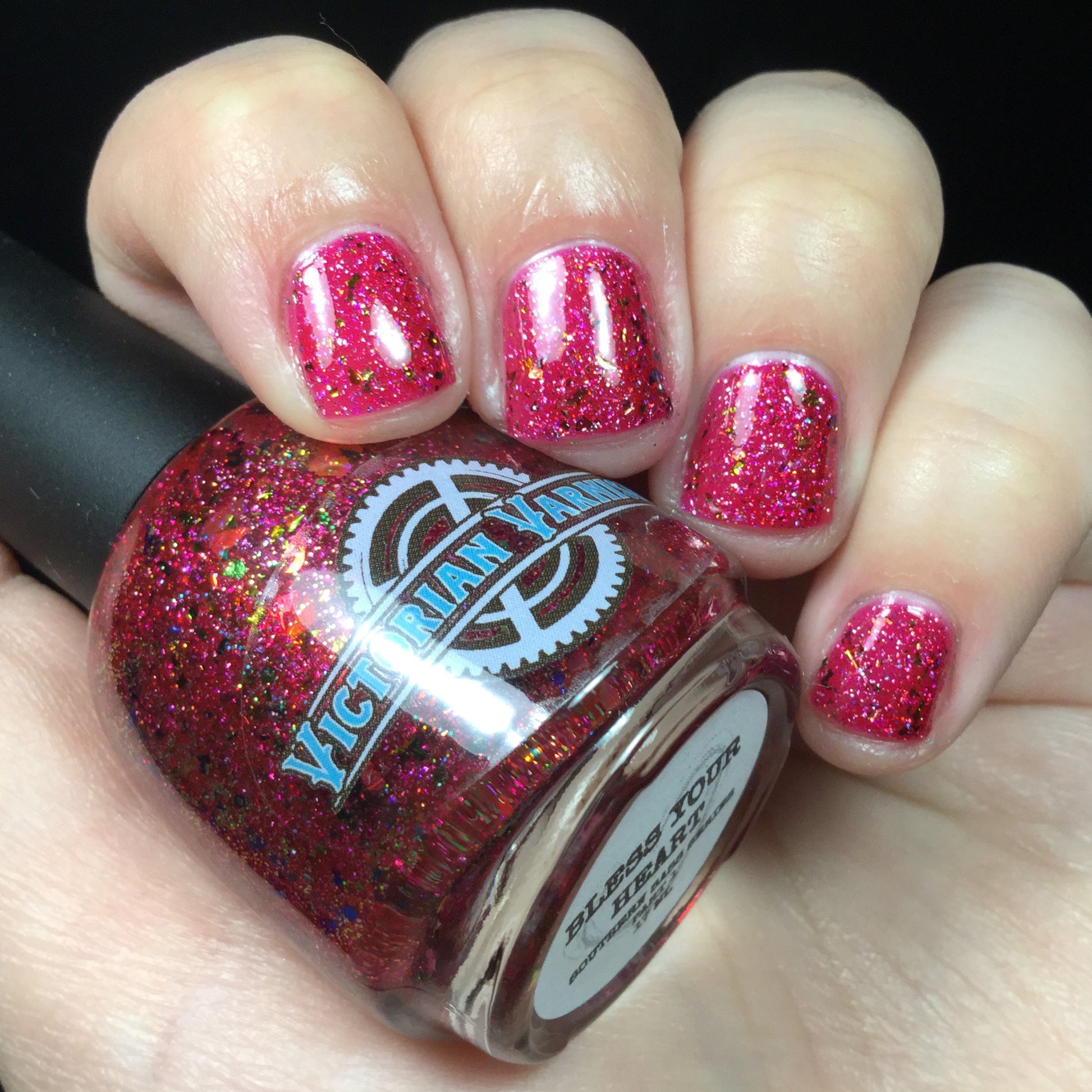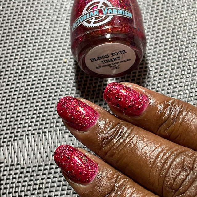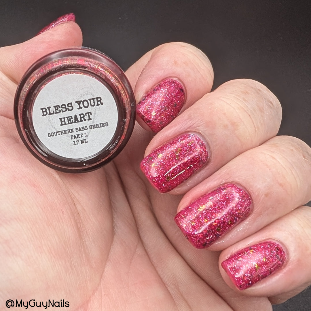 A red base with berry blue undertones, scattered holo, holo flakes, UCC flakes and crystal chameleon flakes