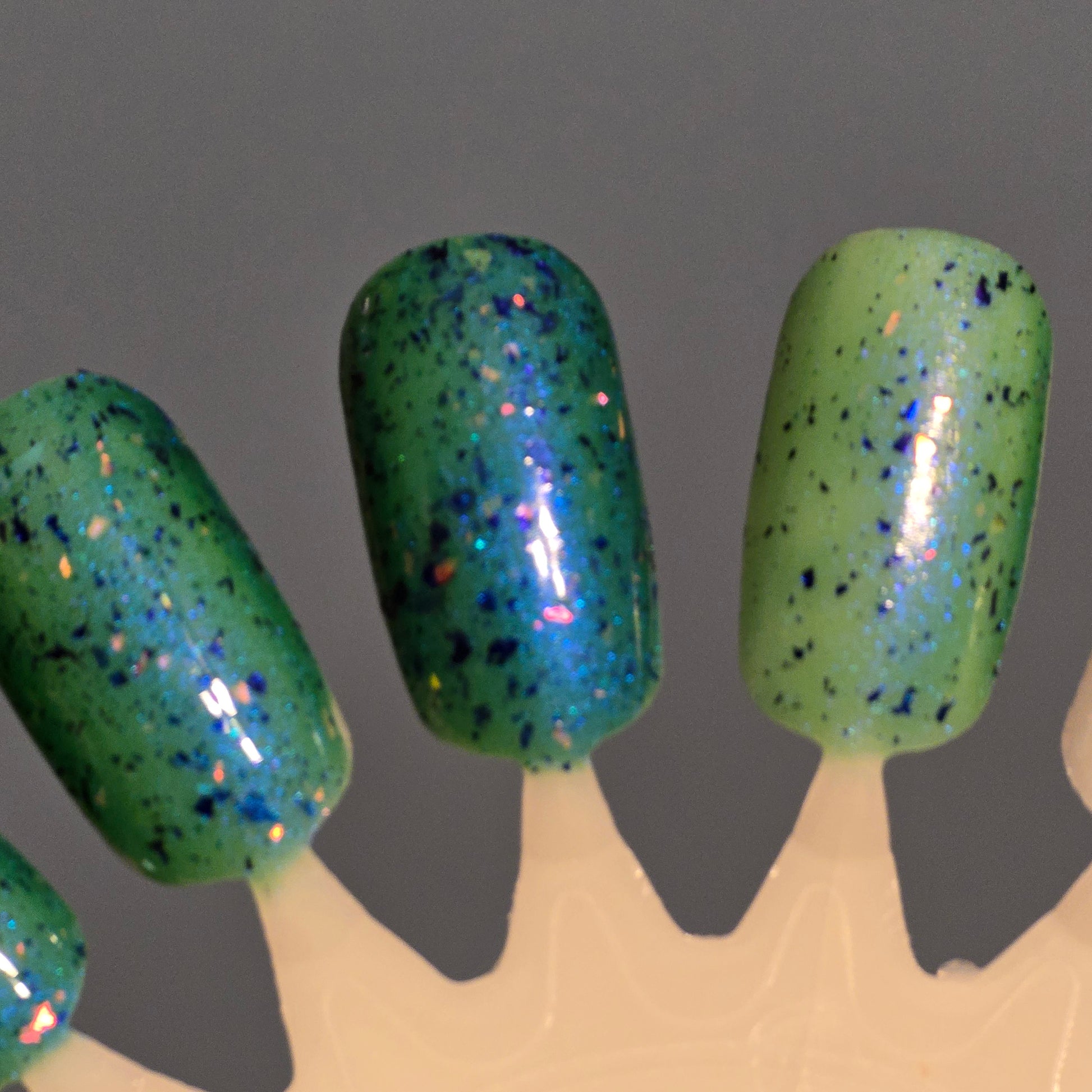 Description: A spring green in cold state that transitions to a pale blue in the warm state with violet/blue aurora shimmer, blue to black duochrome flakies and pink/peach/gold ghost flakies. Note this is a subtle change in thermal states due to the amount of blue shimmer.