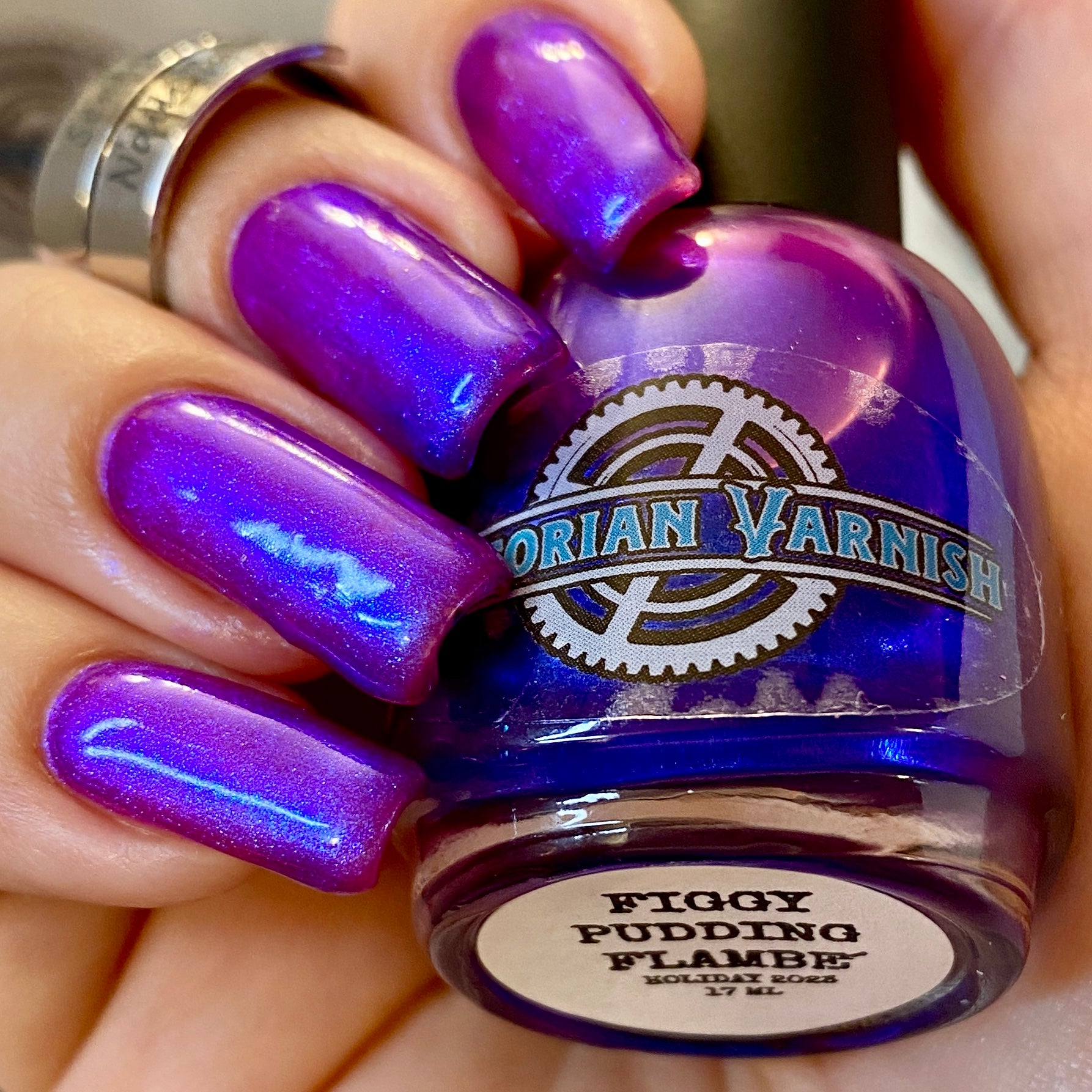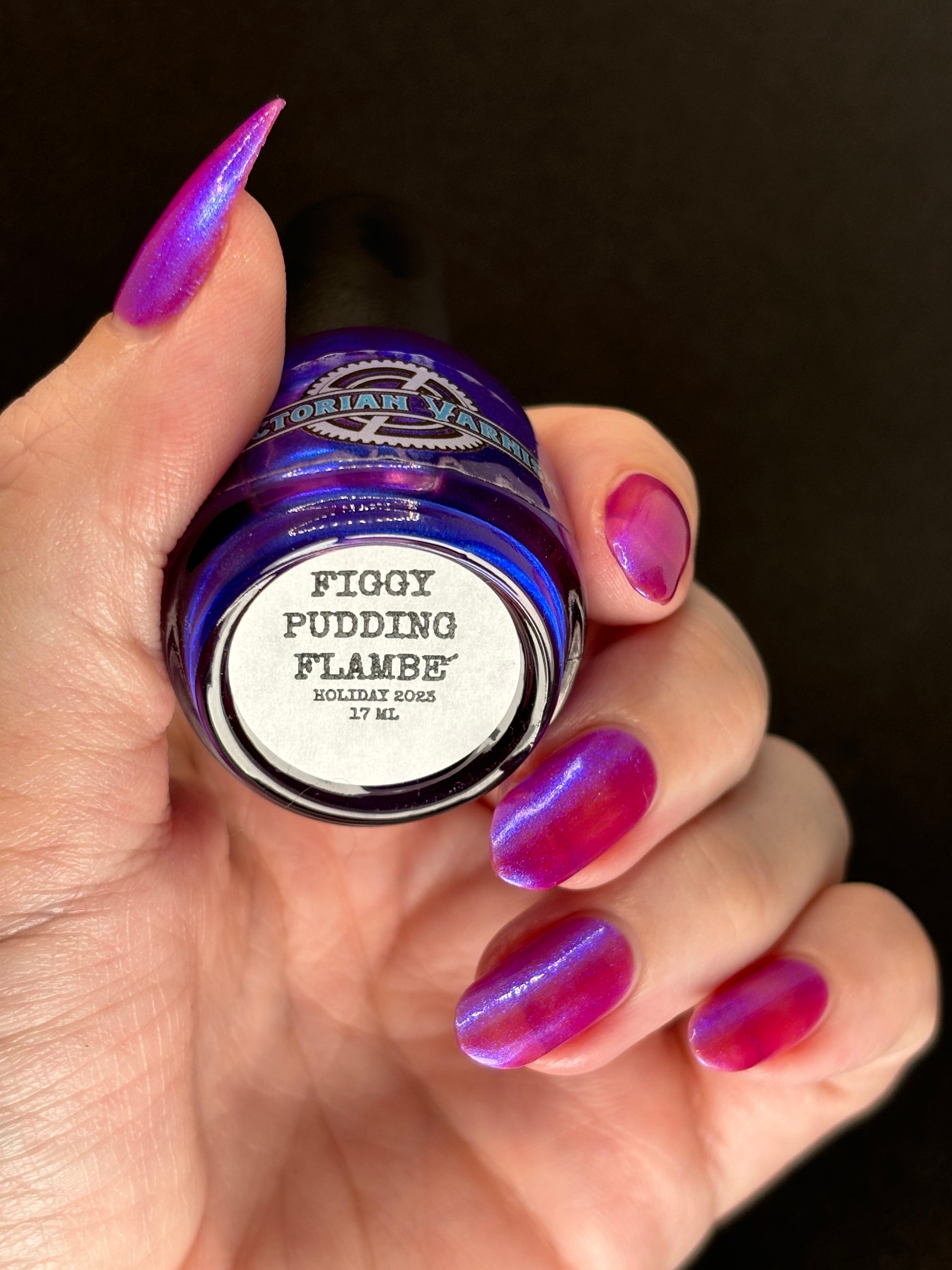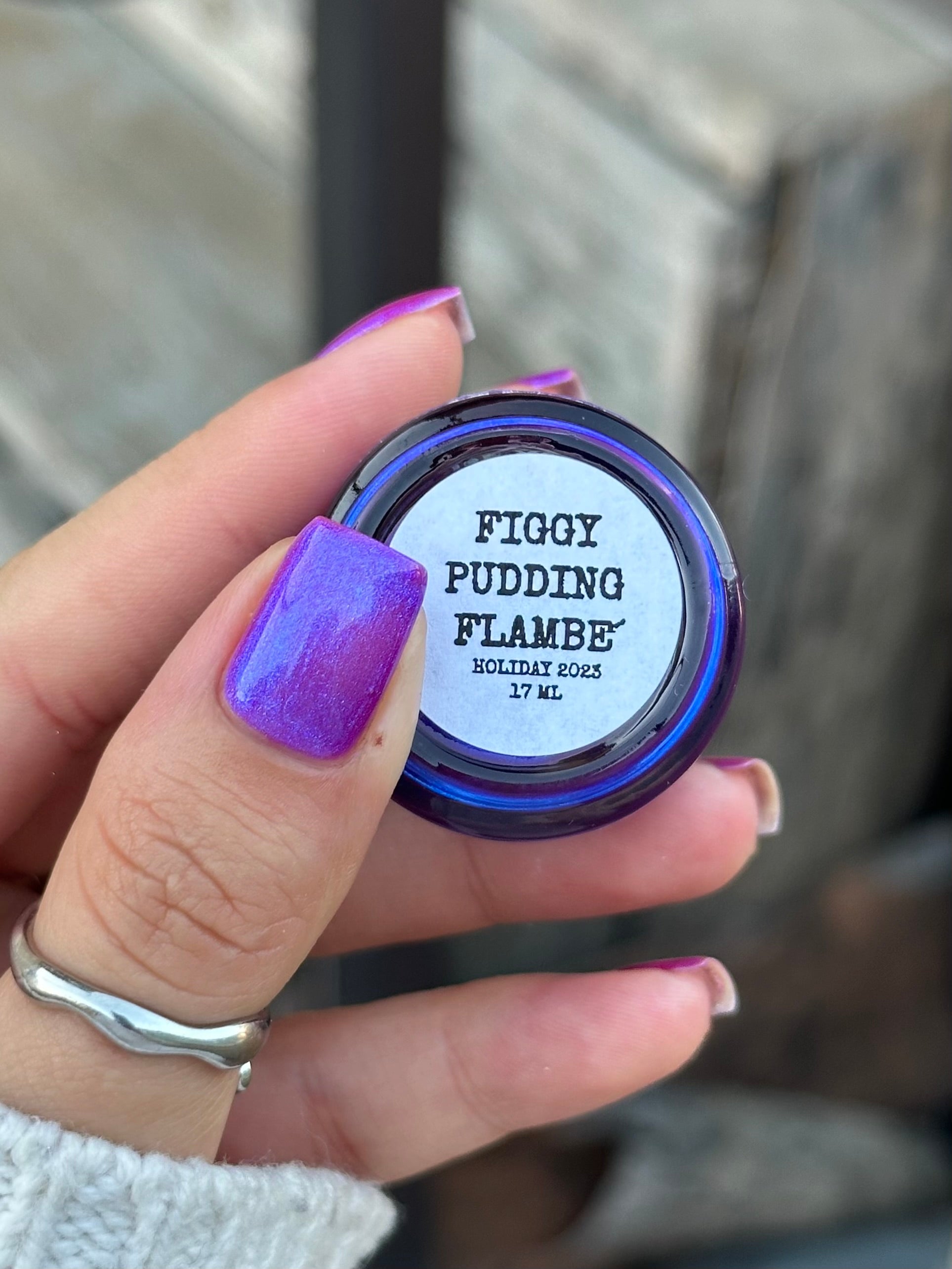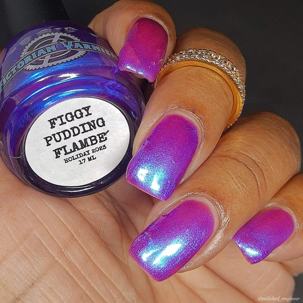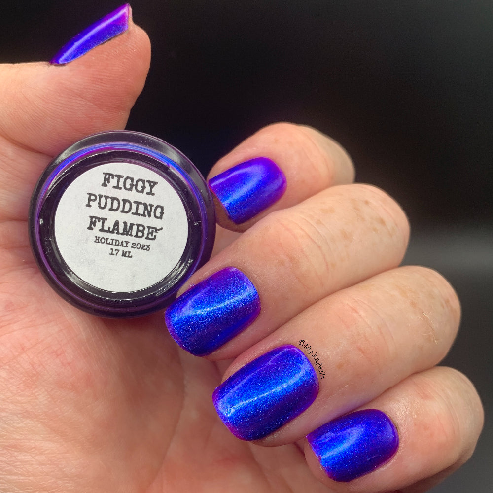 We were inspired by lighting the pudding on fire and the blue flame that emerges - A Figgy purple jelly base with berry undertones and large particle aurora shimmer in blues/purples.