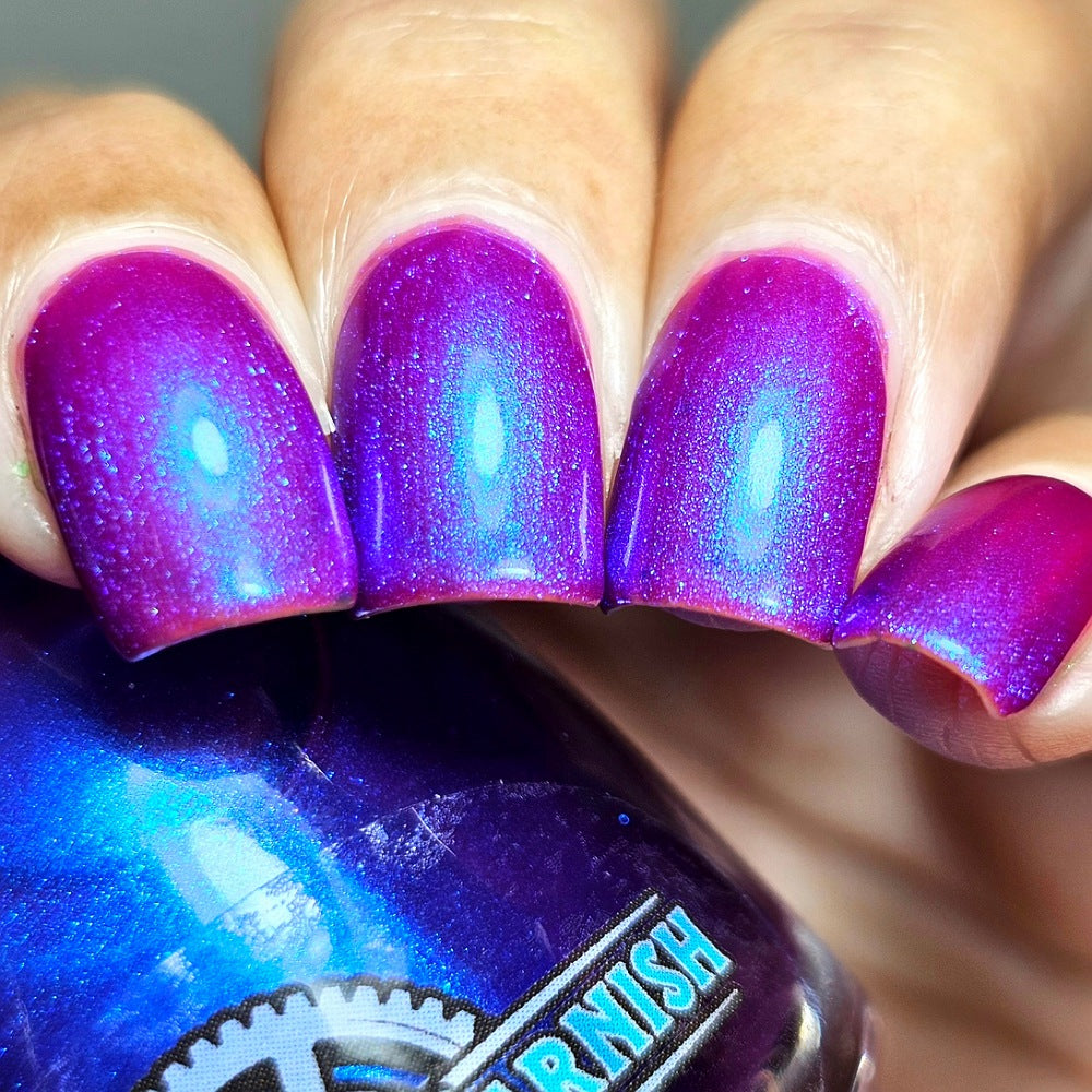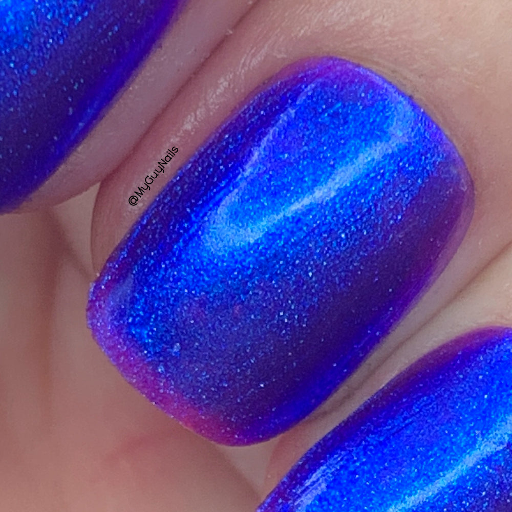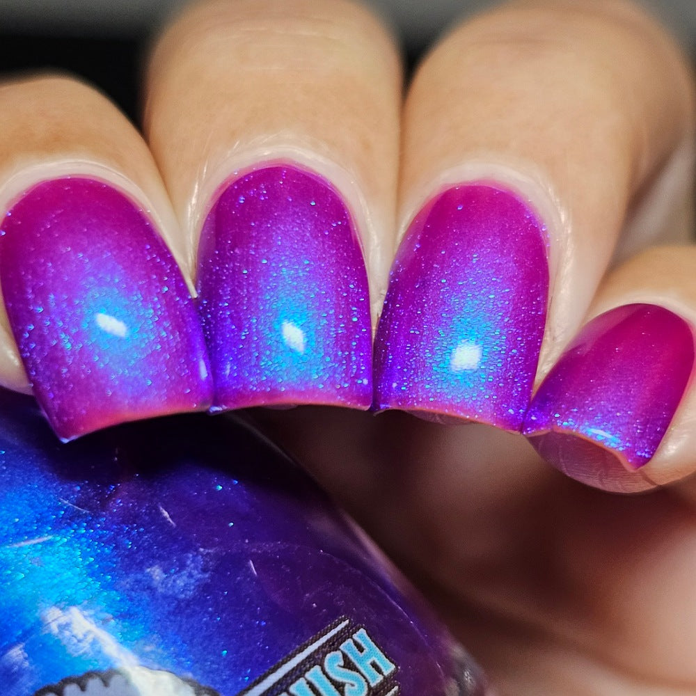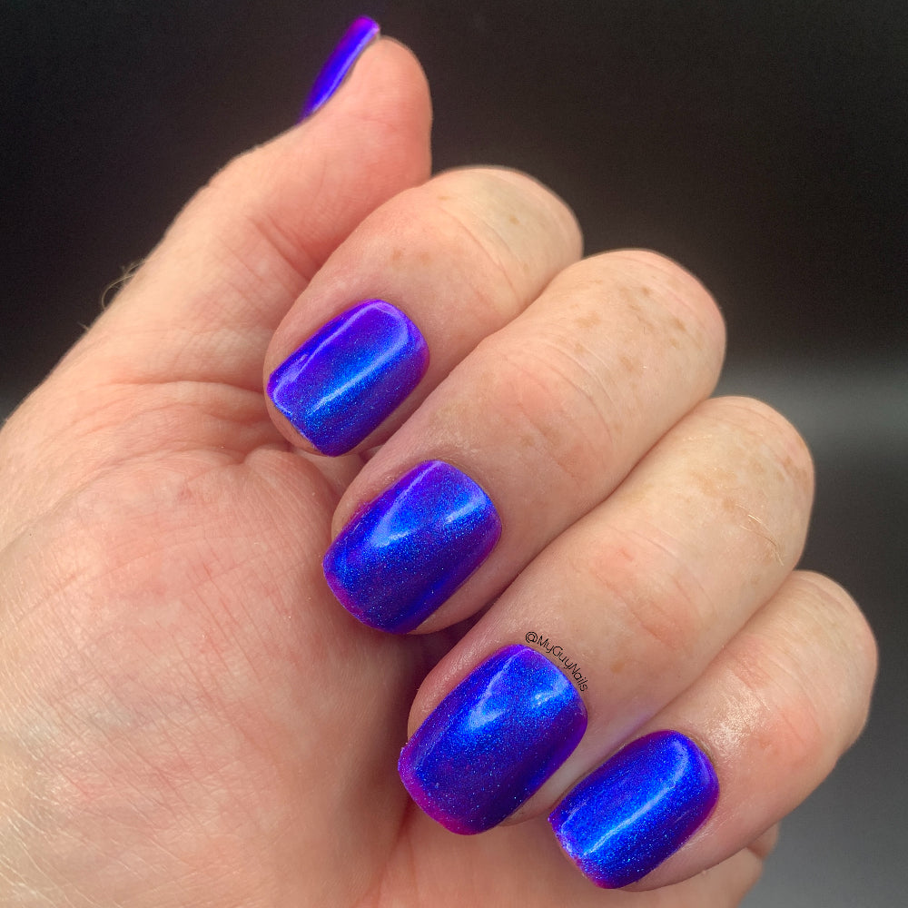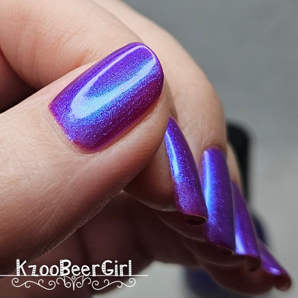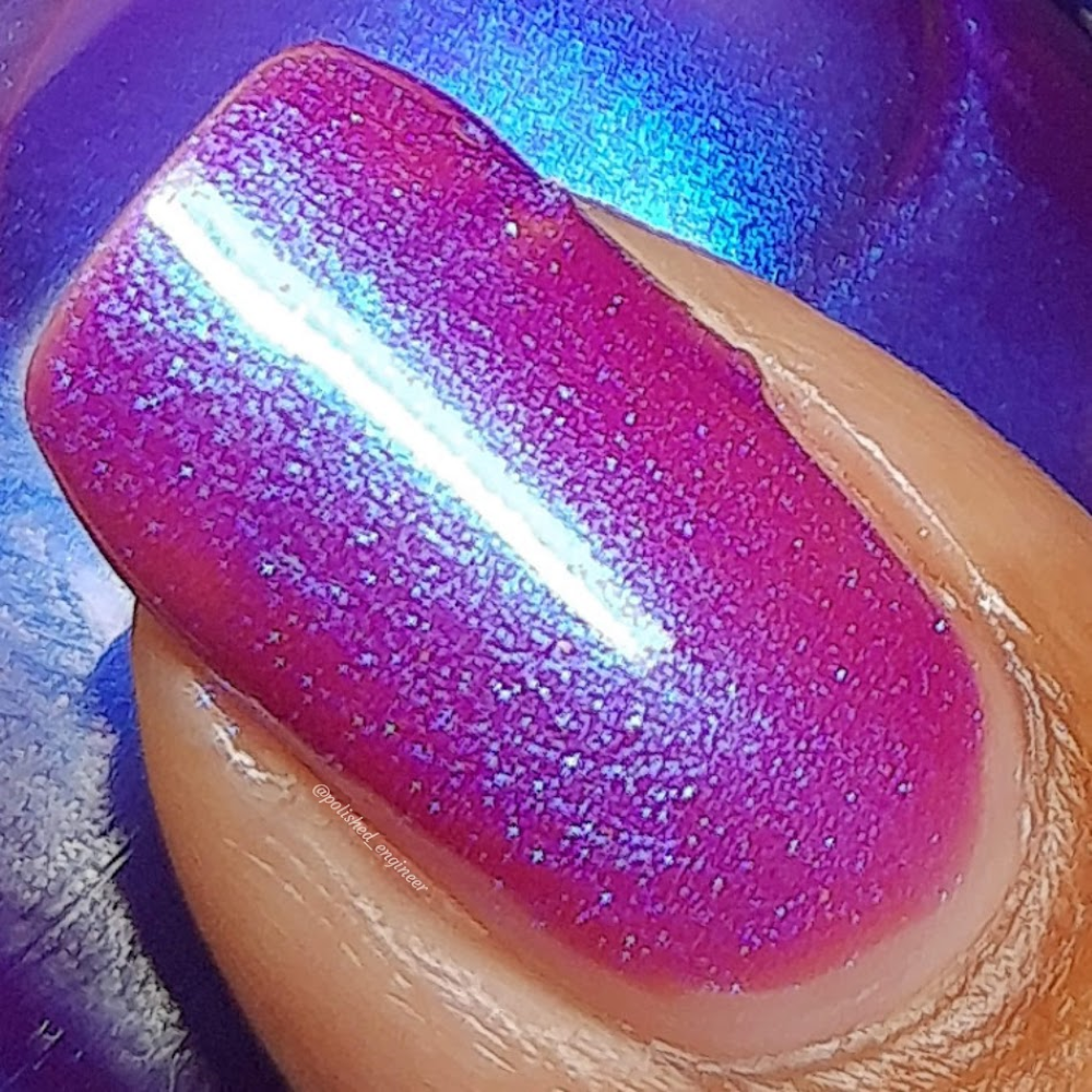 We were inspired by lighting the pudding on fire and the blue flame that emerges - A Figgy purple jelly base with berry undertones and large particle aurora shimmer in blues/purples.