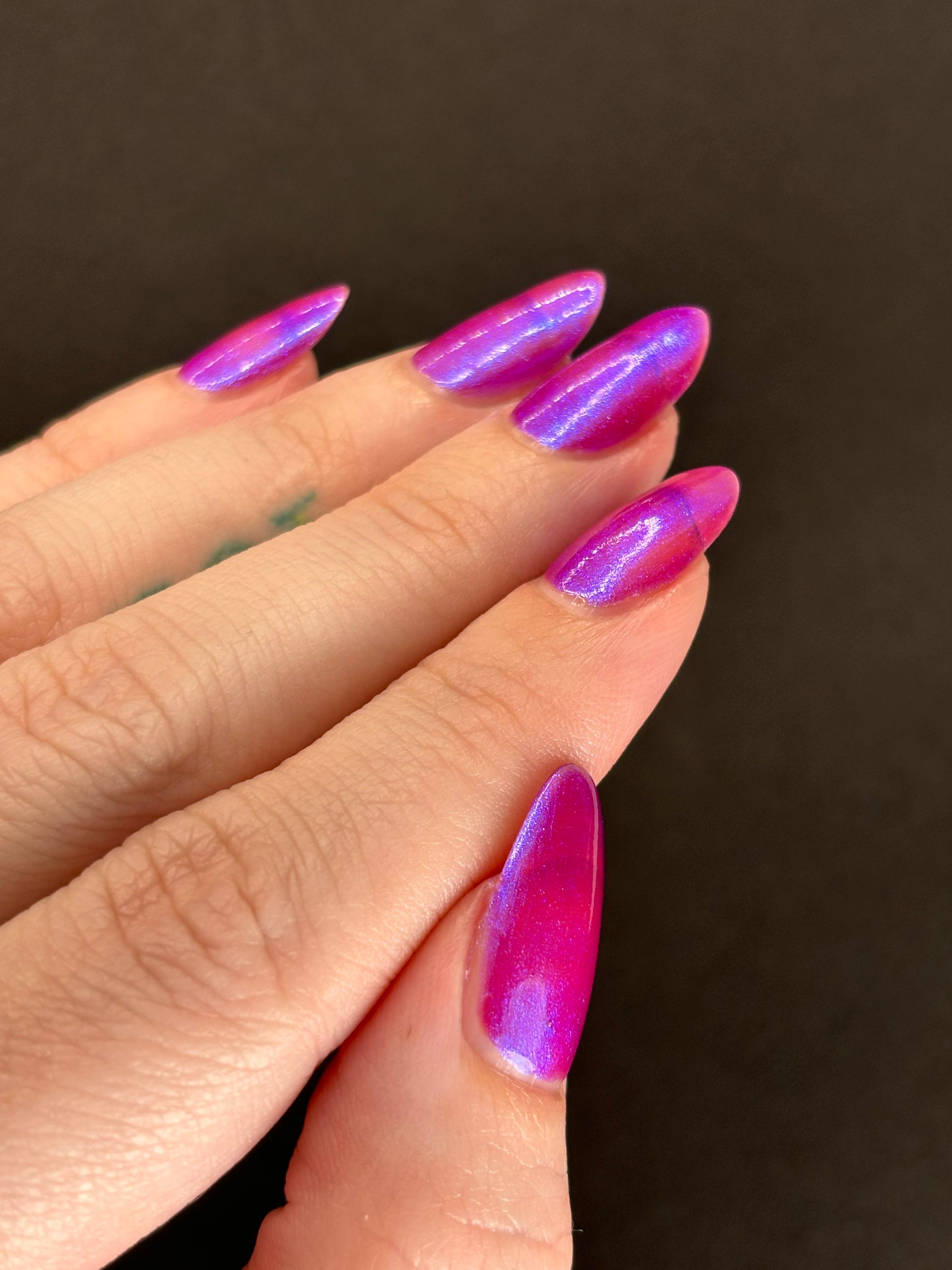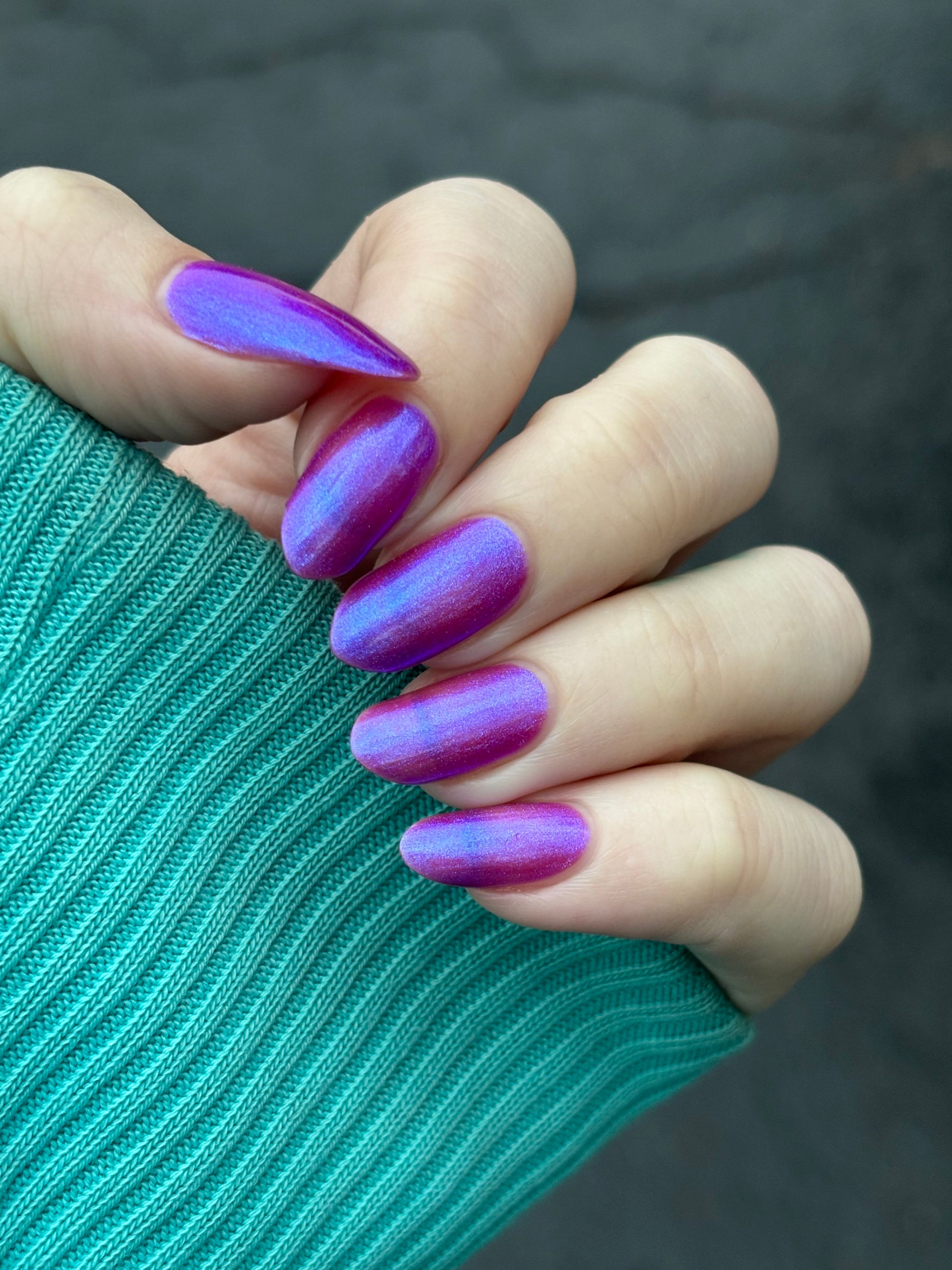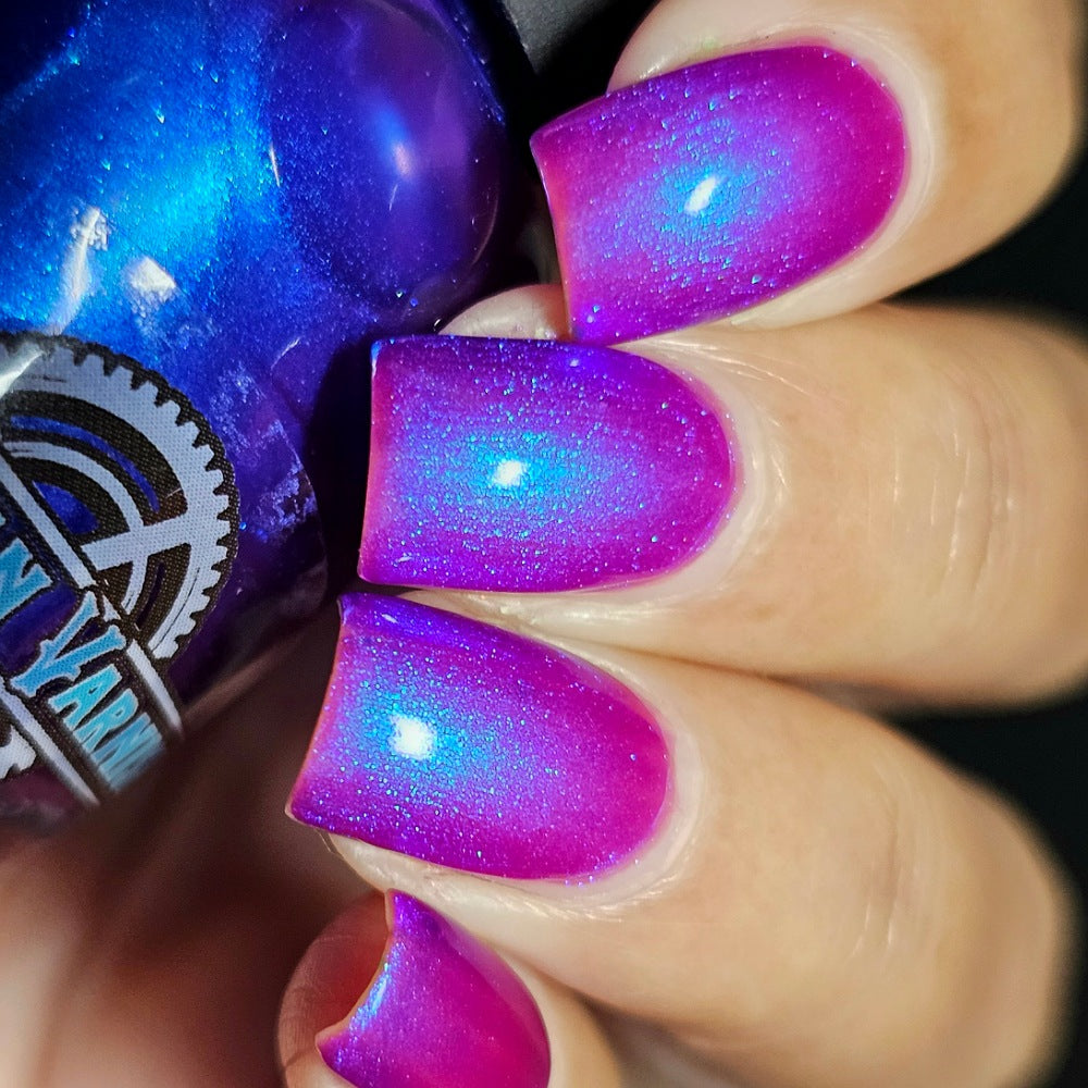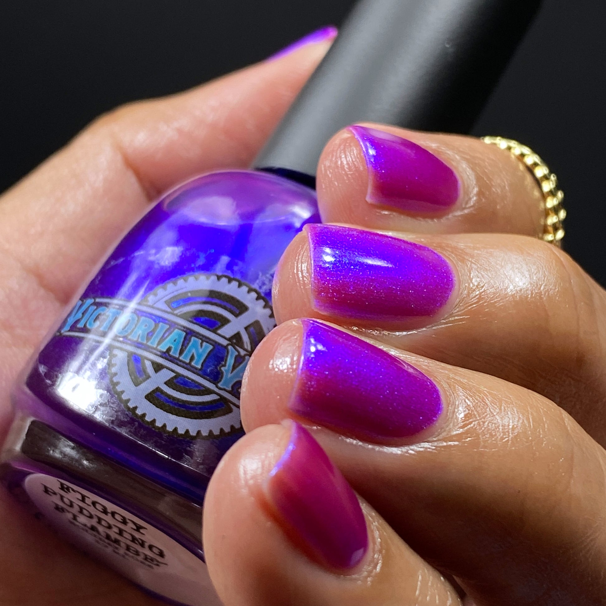 We were inspired by lighting the pudding on fire and the blue flame that emerges - A Figgy purple jelly base with berry undertones and large particle aurora shimmer in blues/purples.