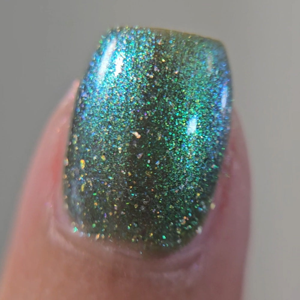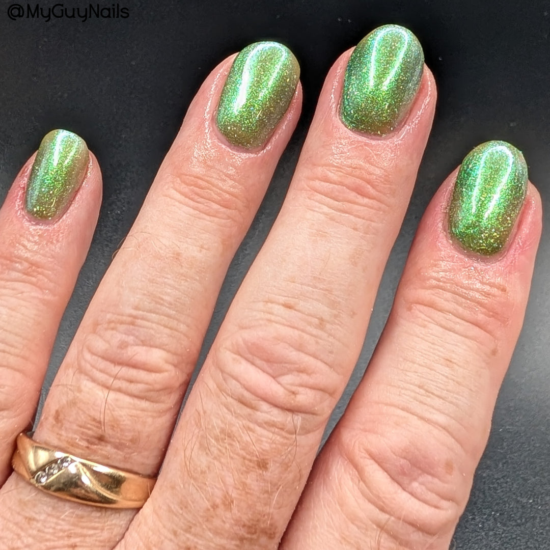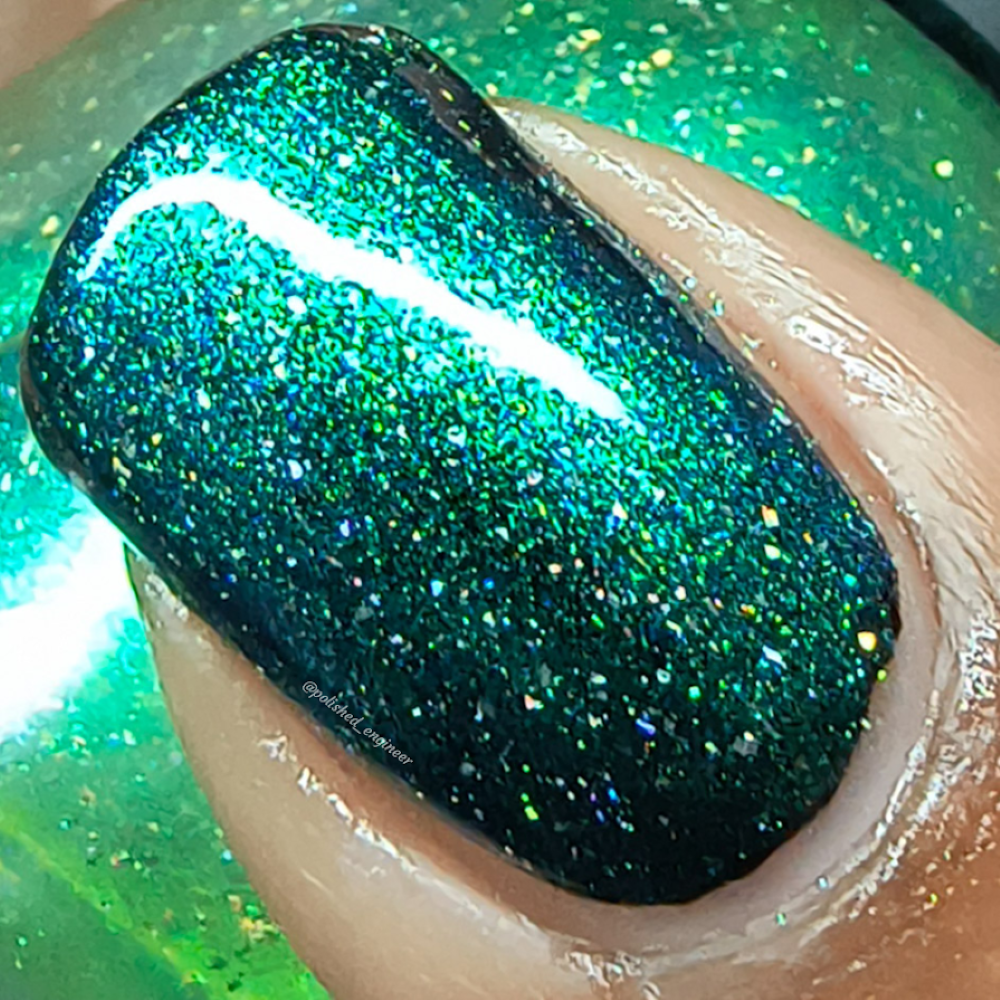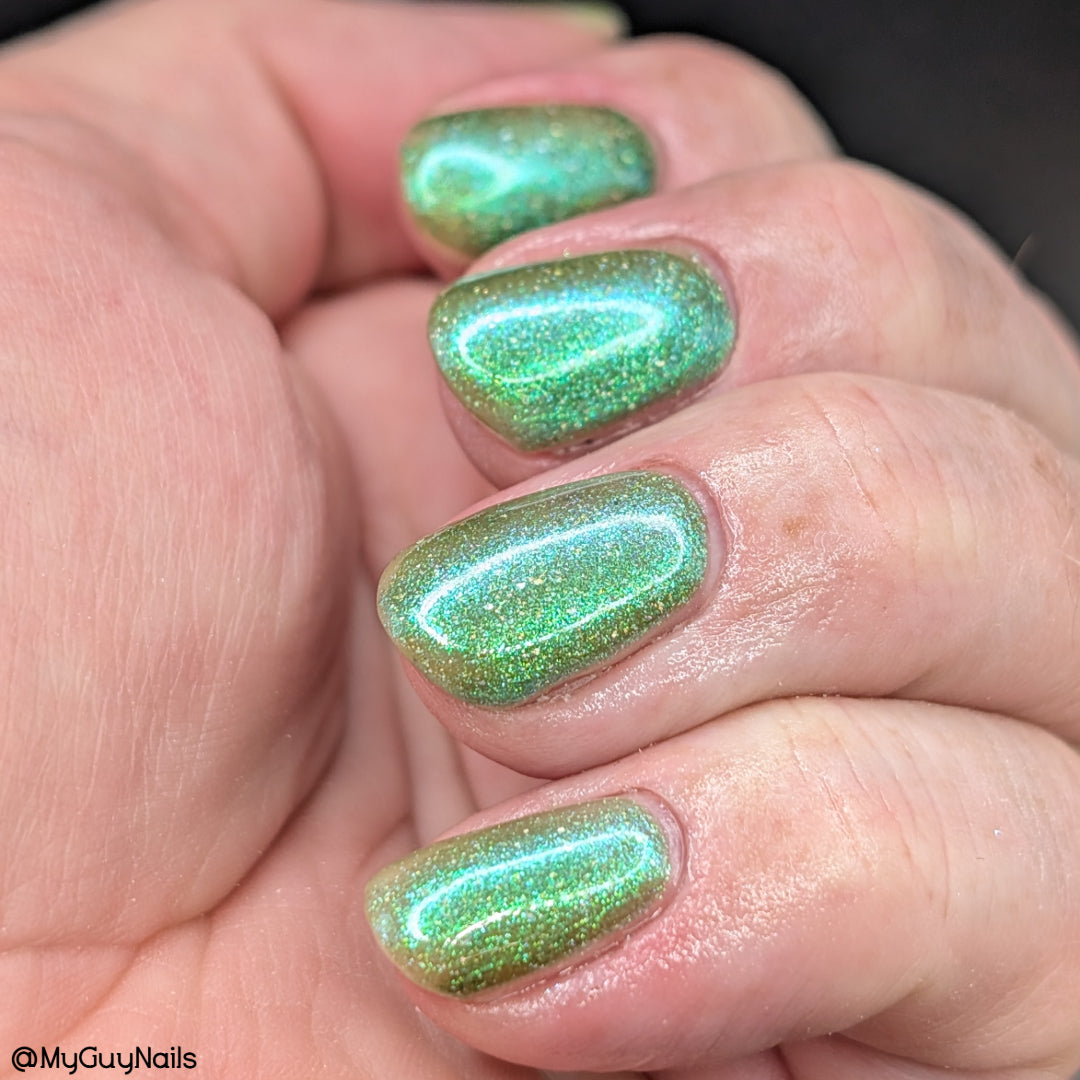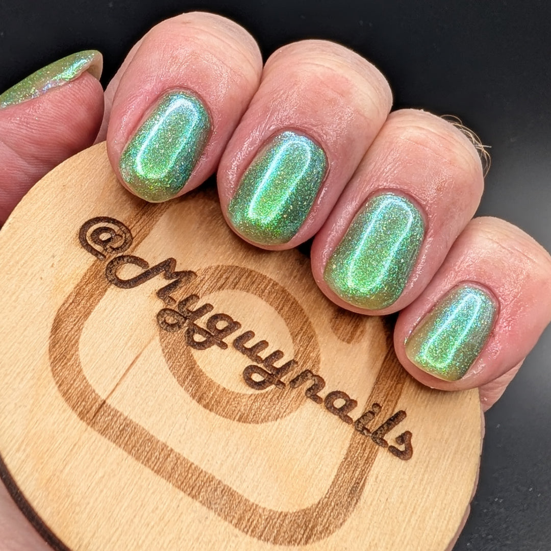 A sheer spring green with a large particle green/aqua to purple/blue at extreme angles aurora shimmer and a pollinating amount of holo flakes (holo dust)