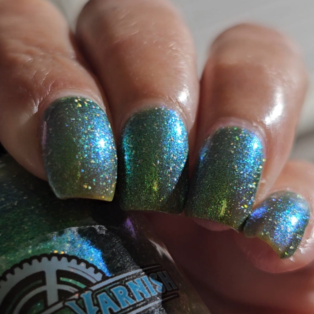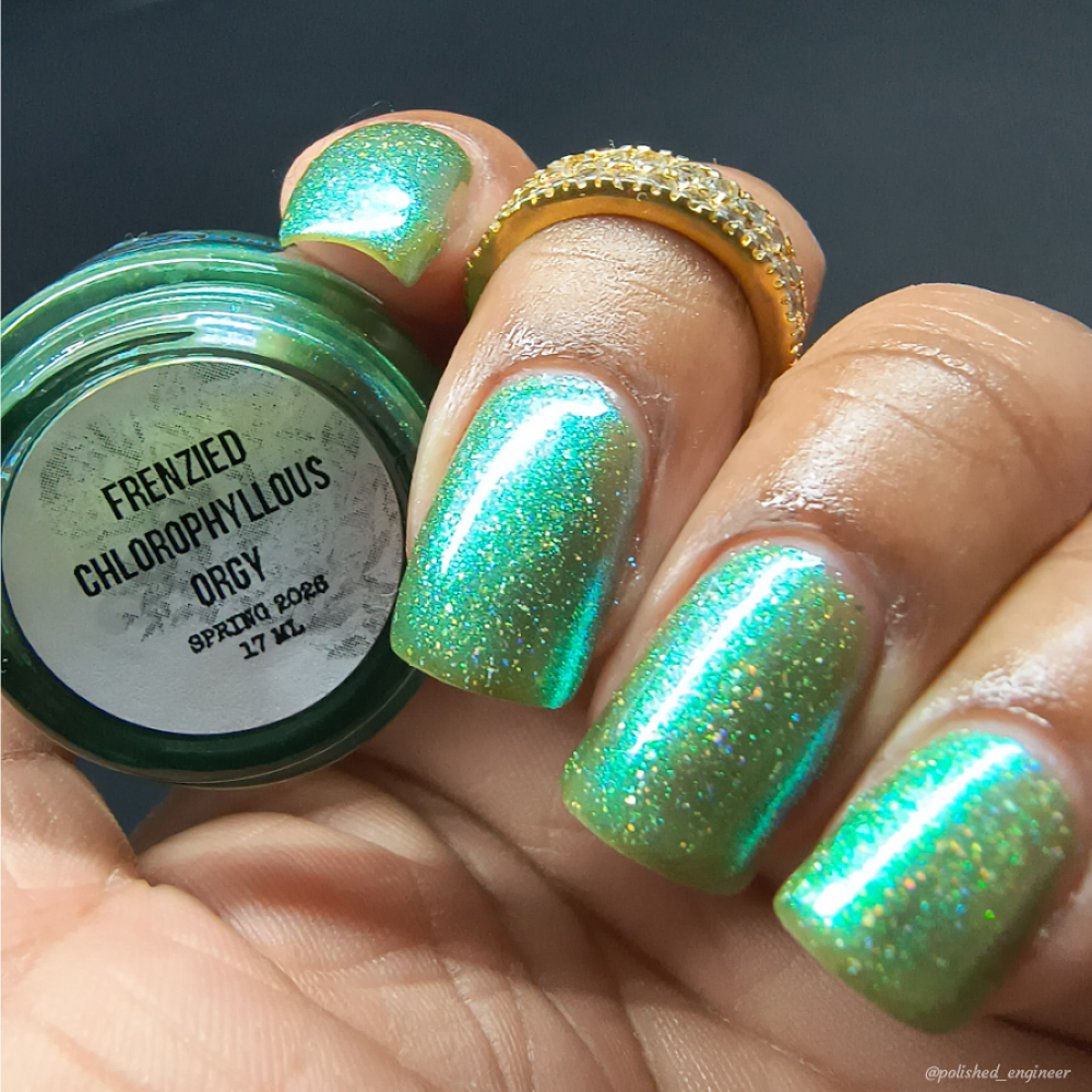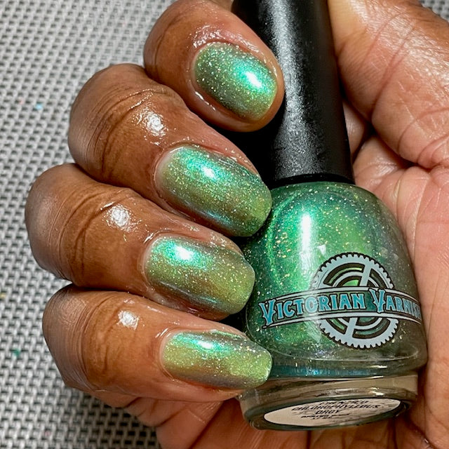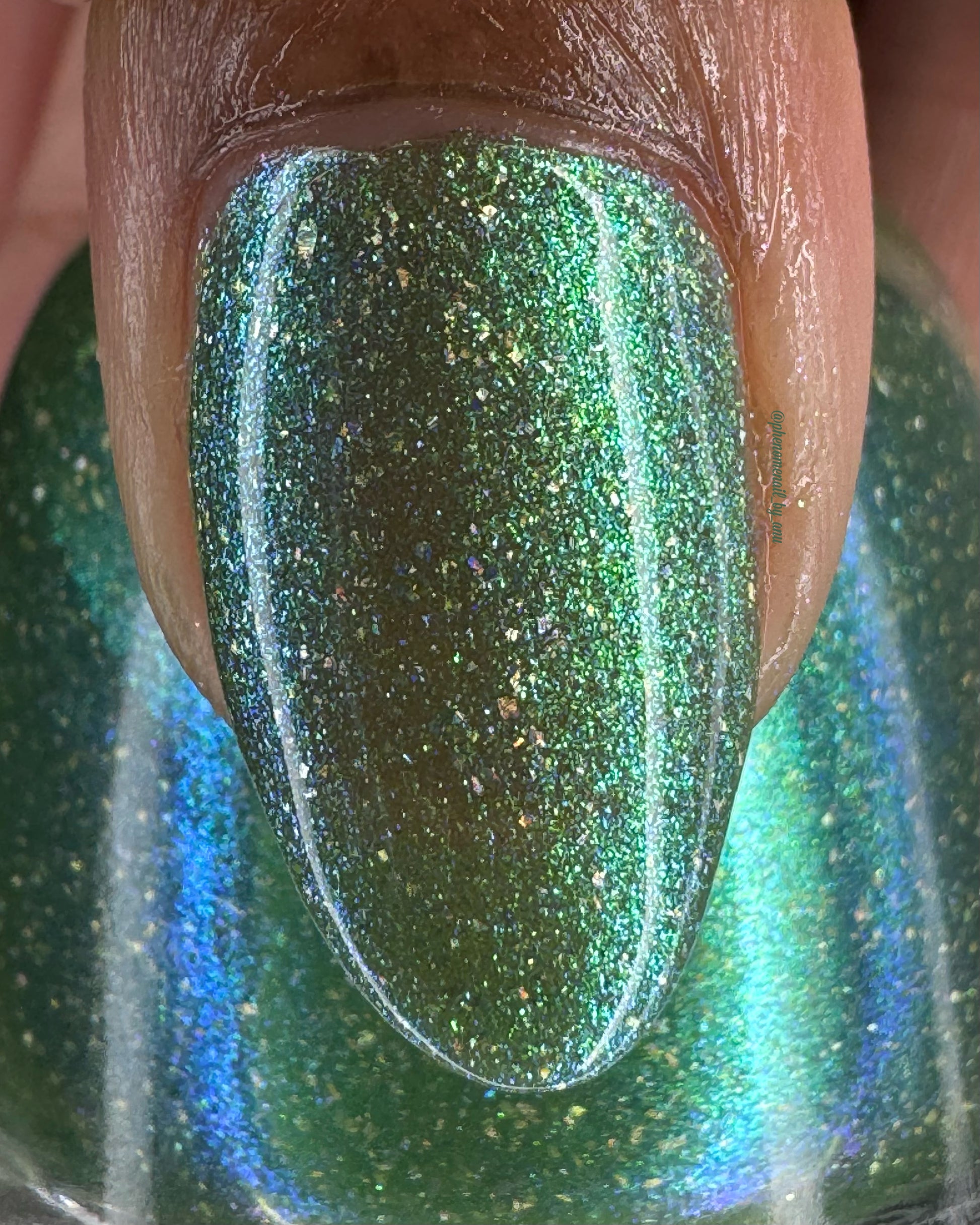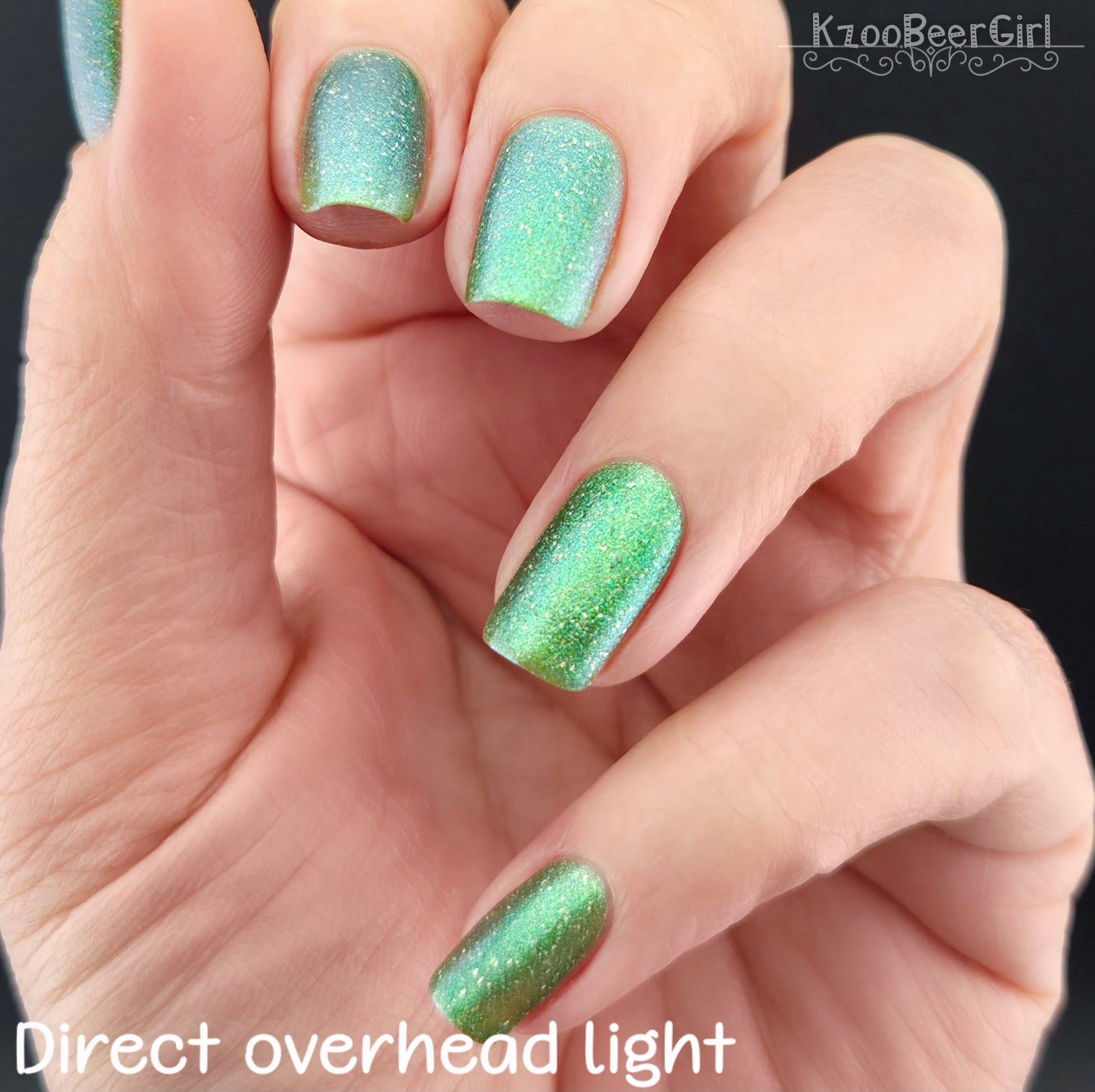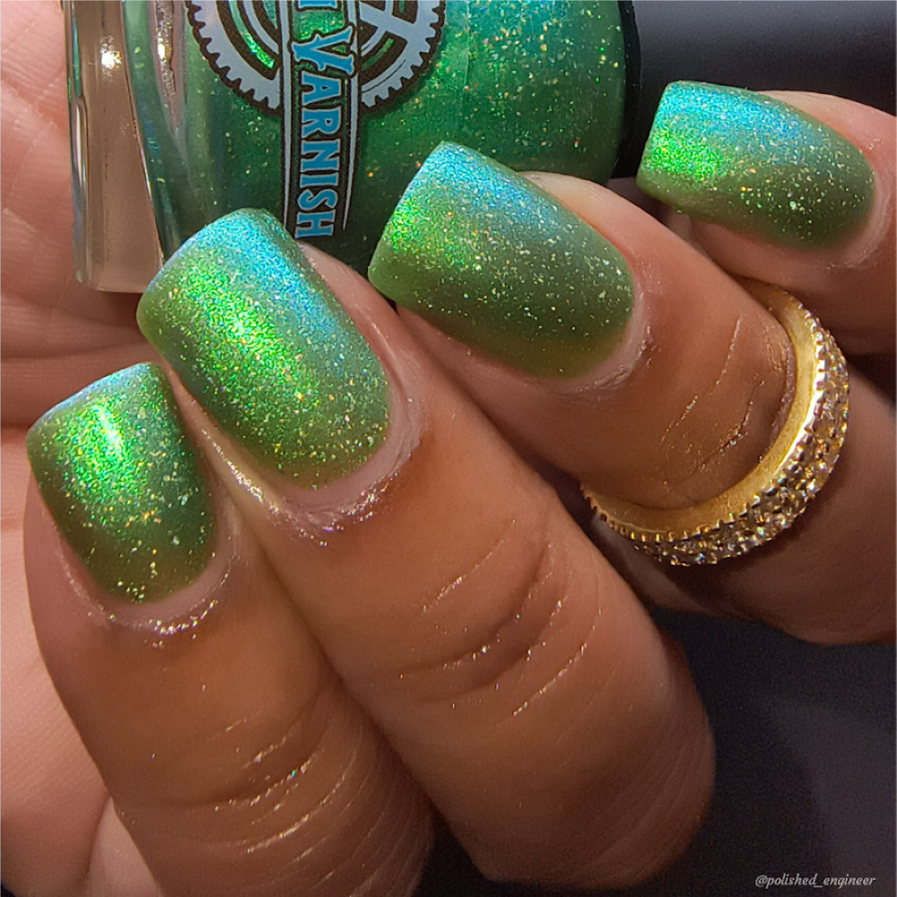 A sheer spring green with a large particle green/aqua to purple/blue at extreme angles aurora shimmer and a pollinating amount of holo flakes (holo dust)