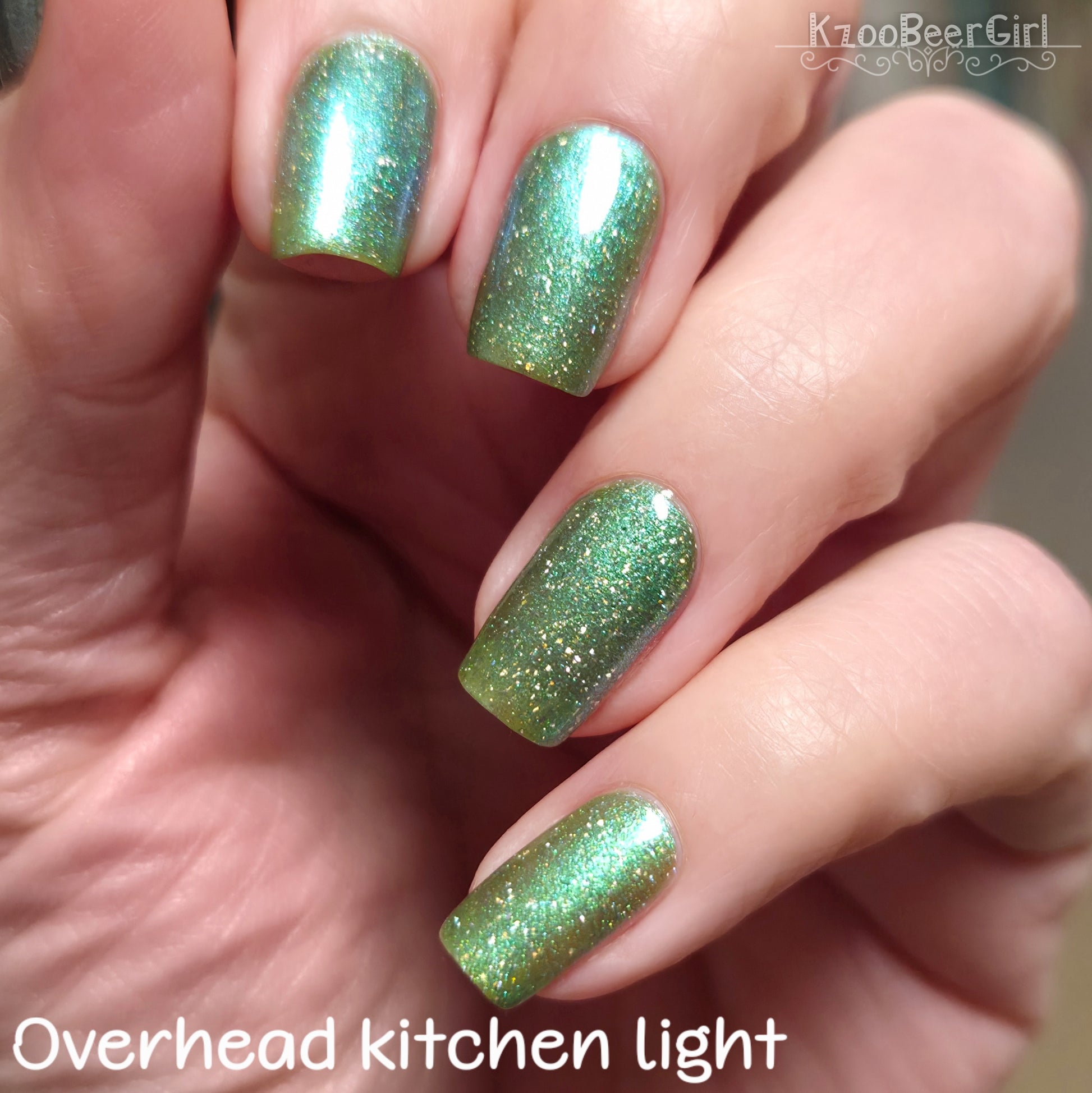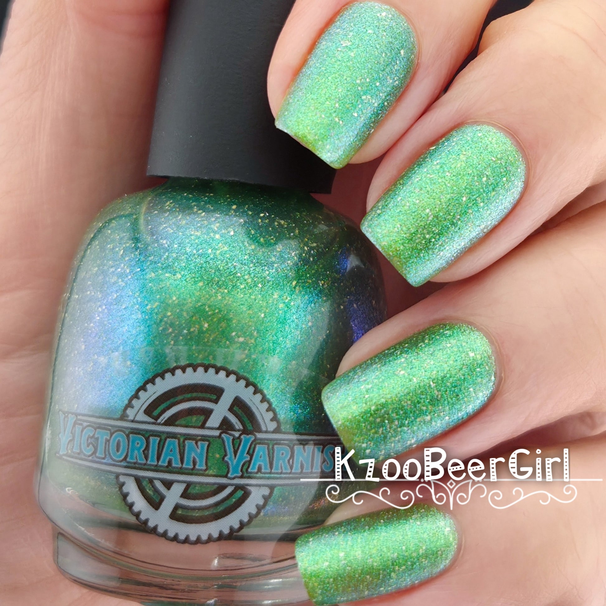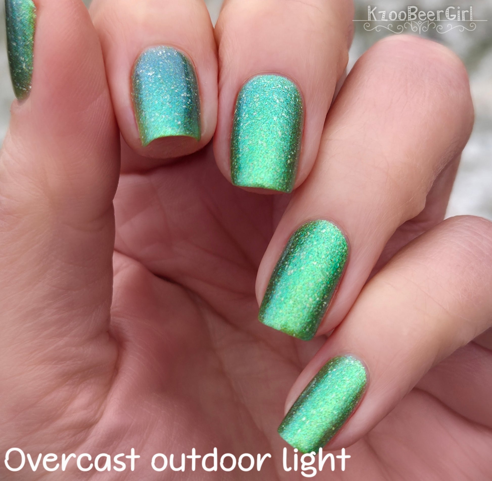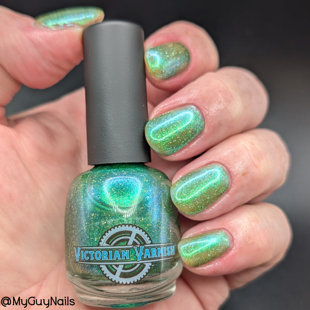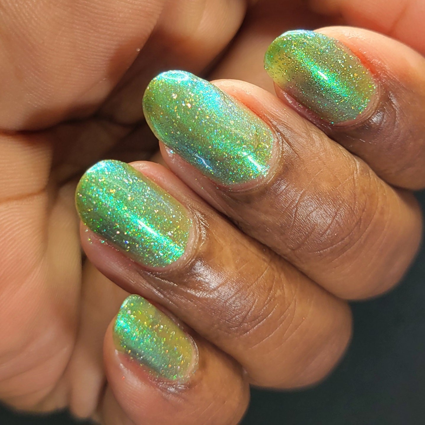 A sheer spring green with a large particle green/aqua to purple/blue at extreme angles aurora shimmer and a pollinating amount of holo flakes (holo dust)