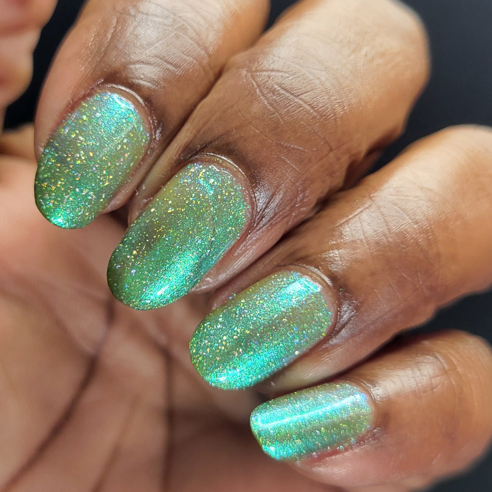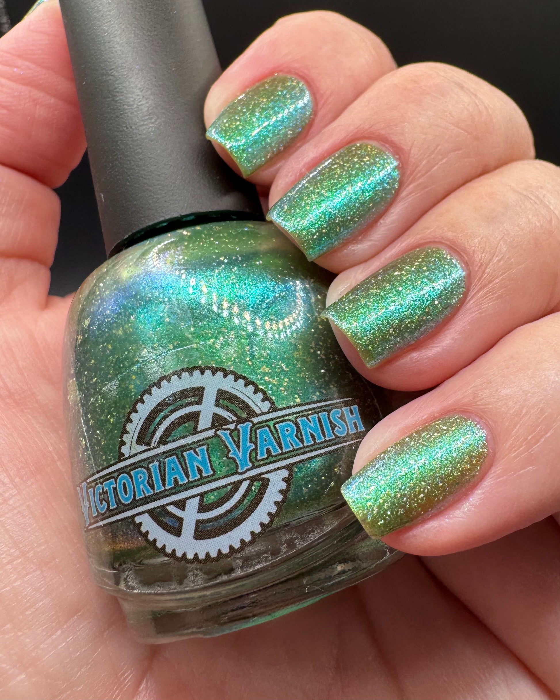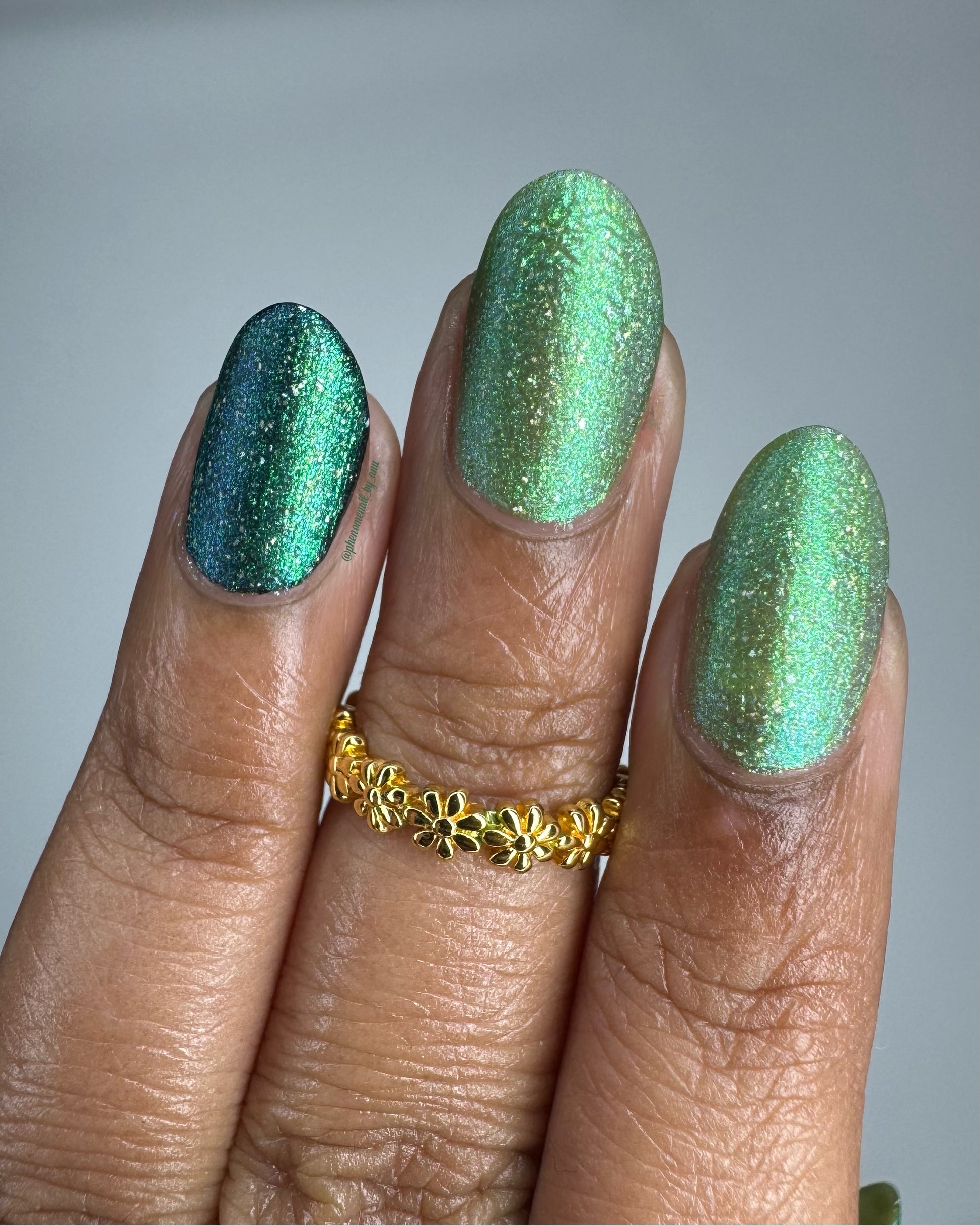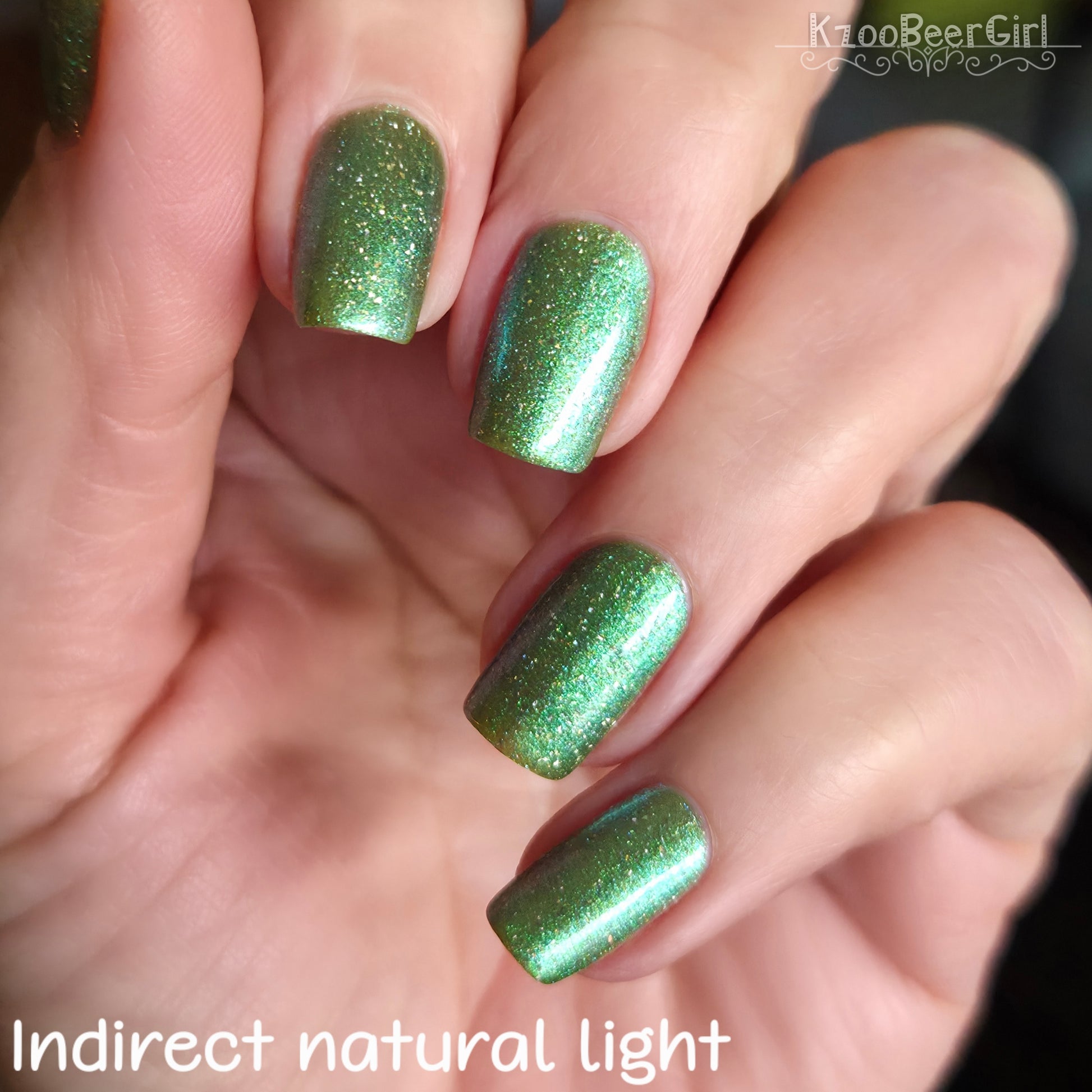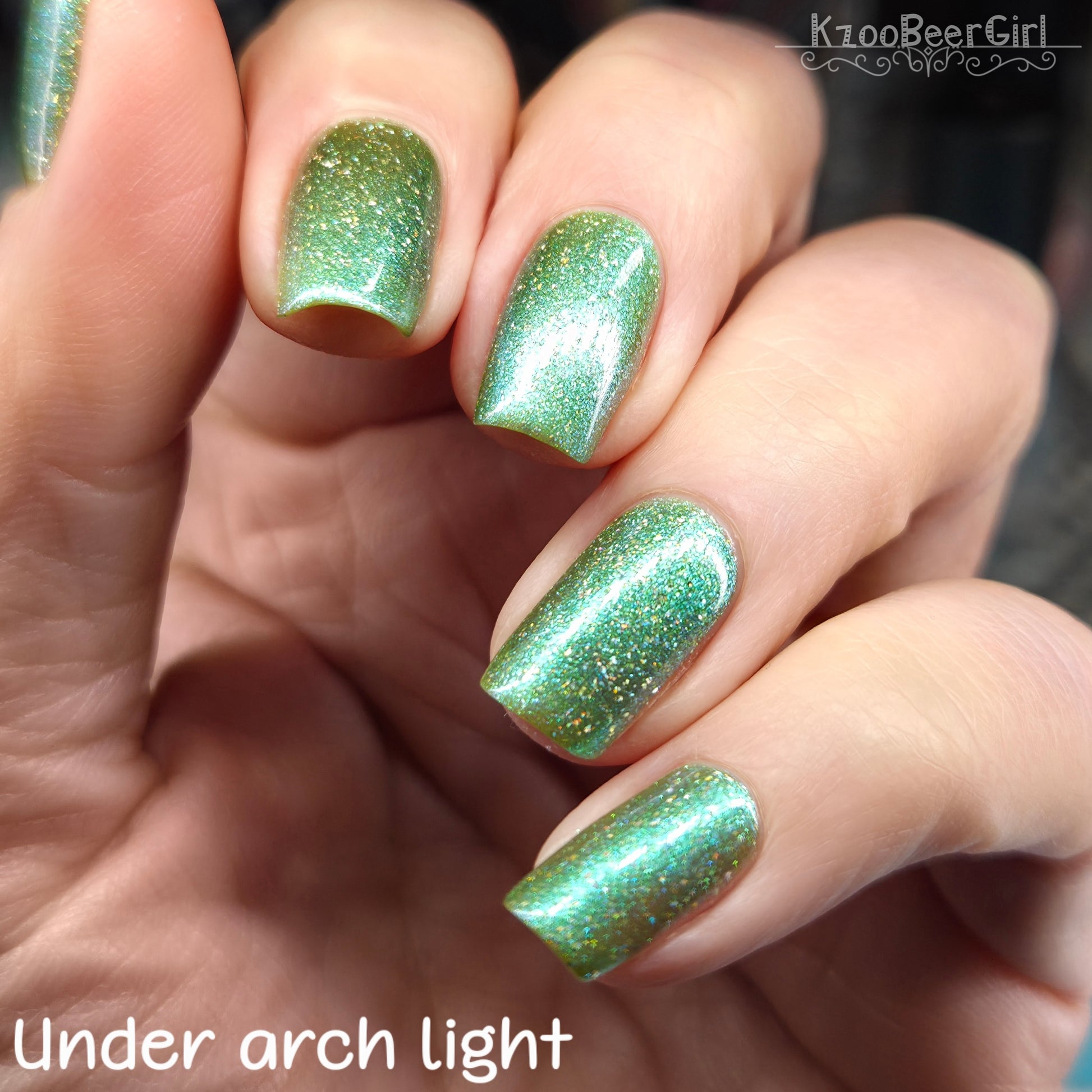 A sheer spring green with a large particle green/aqua to purple/blue at extreme angles aurora shimmer and a pollinating amount of holo flakes (holo dust)