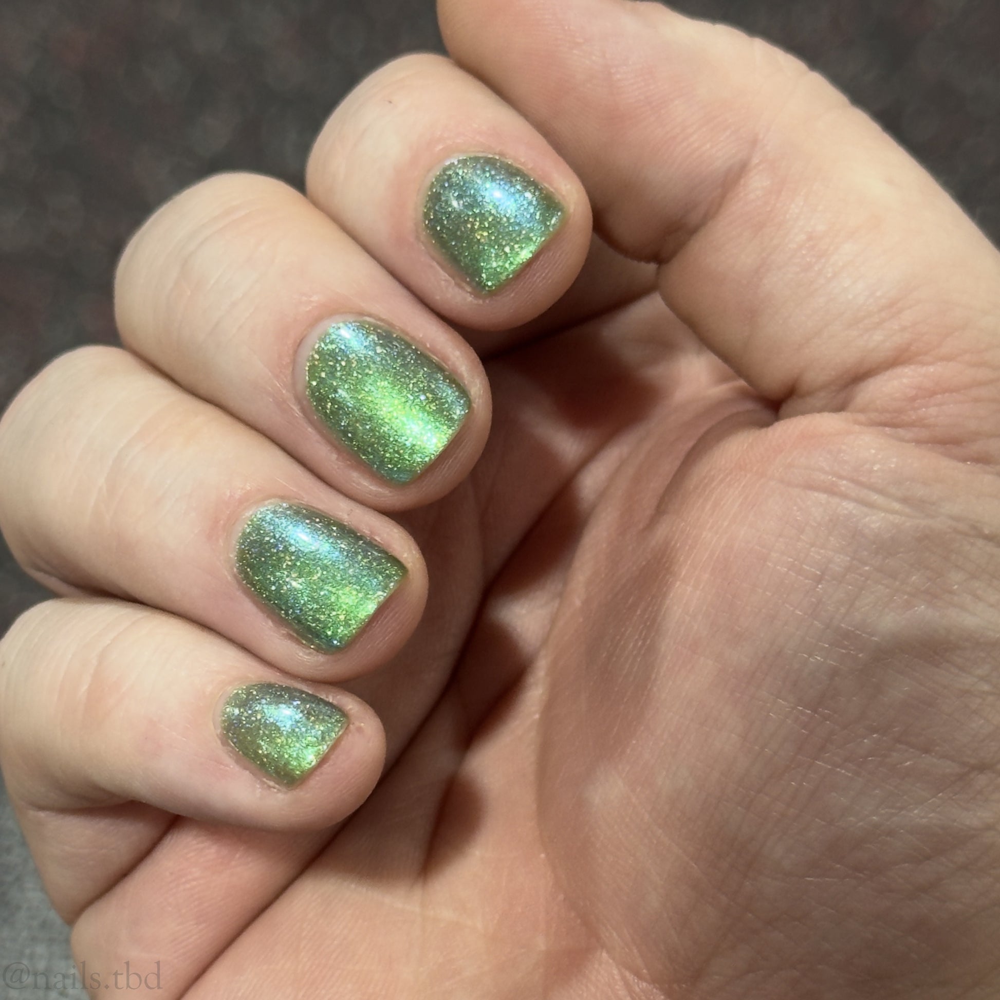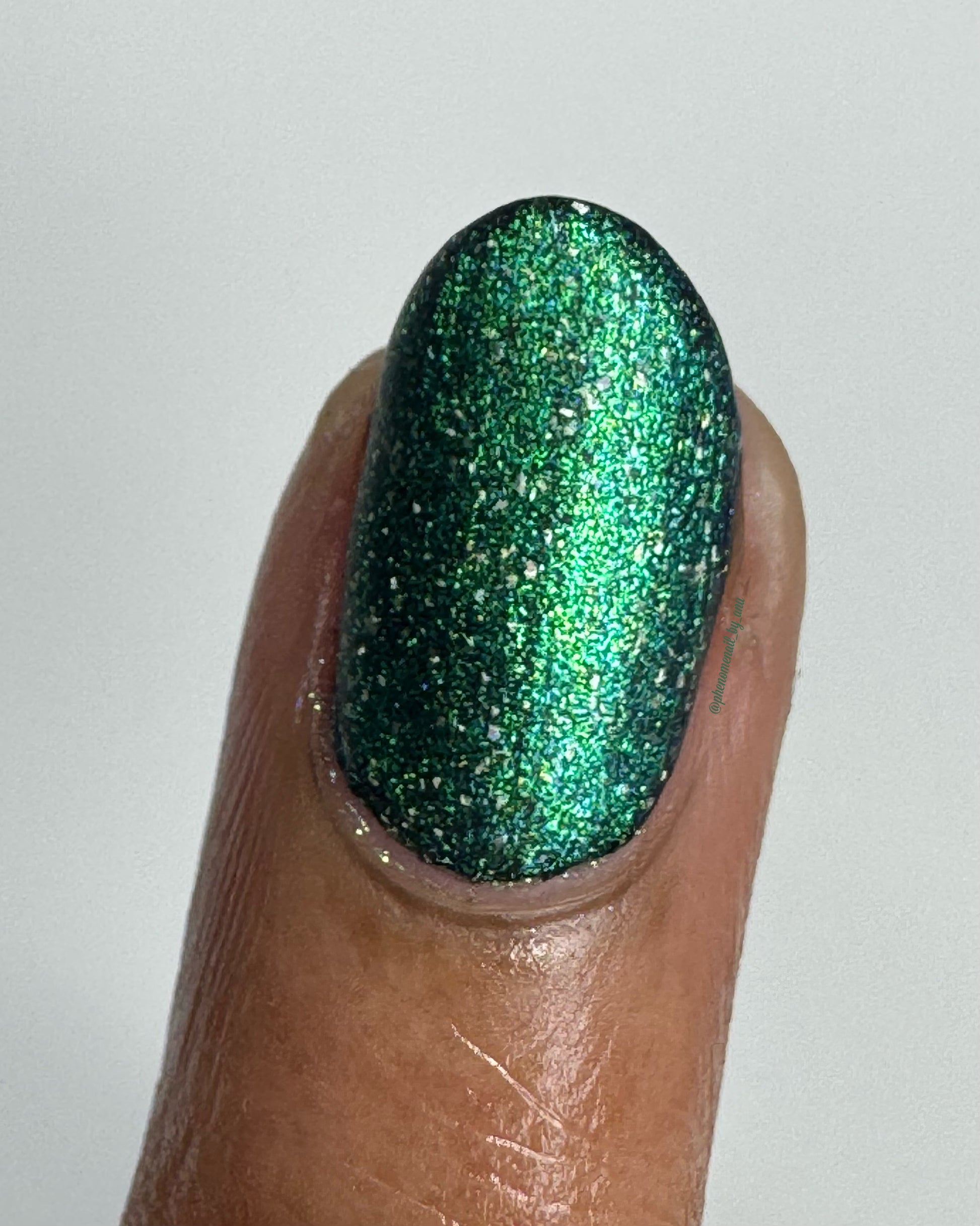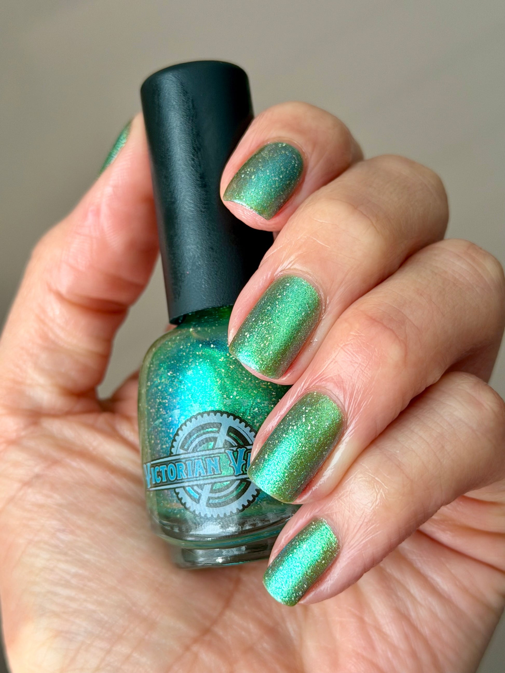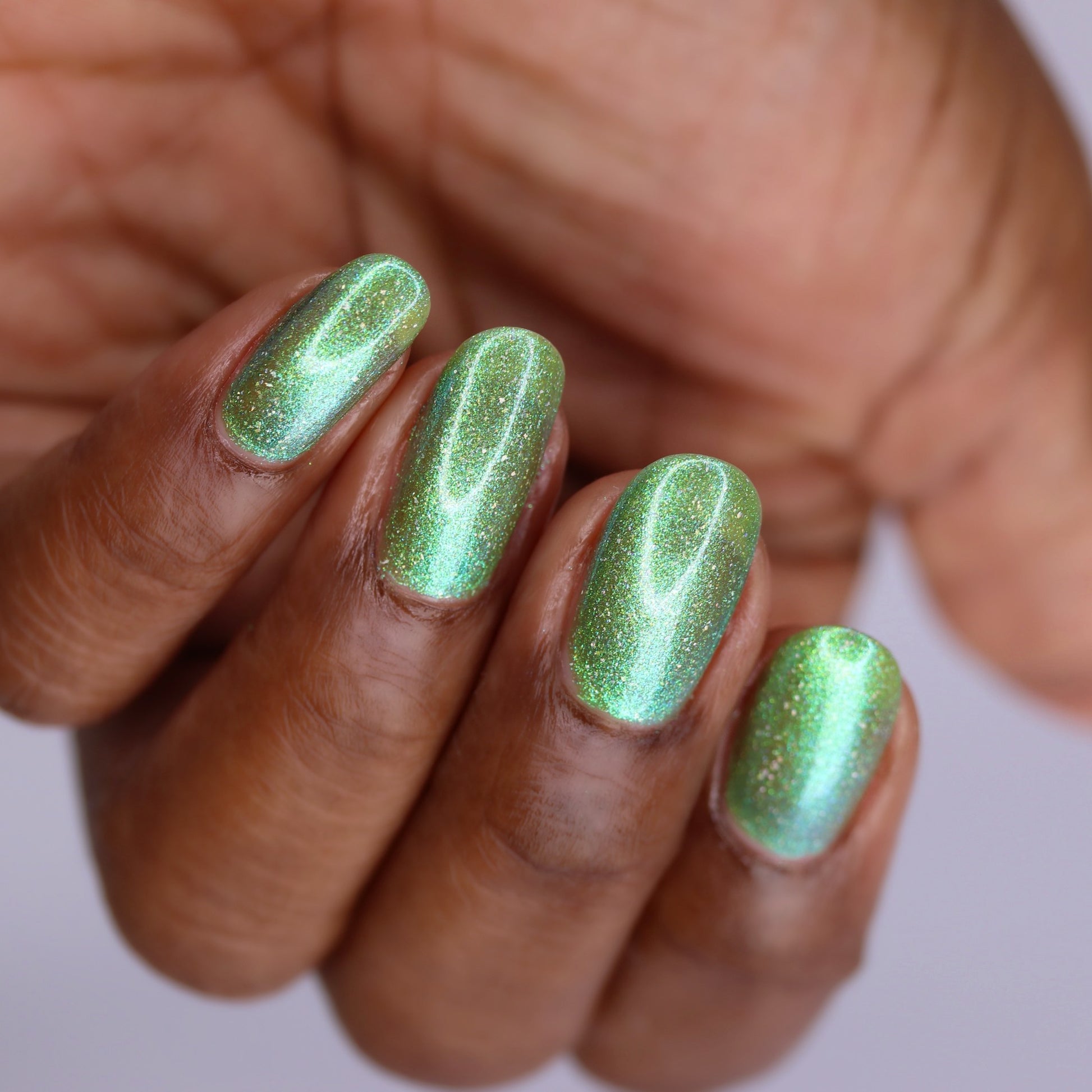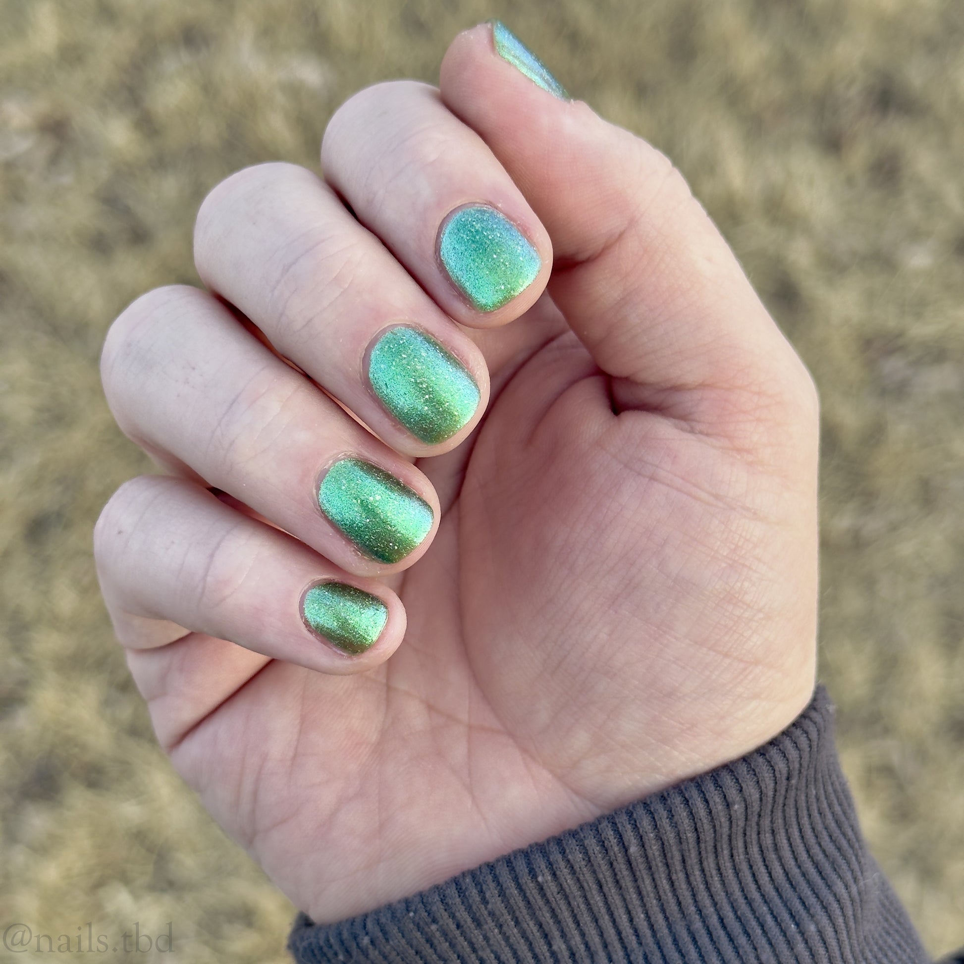 A sheer spring green with a large particle green/aqua to purple/blue at extreme angles aurora shimmer and a pollinating amount of holo flakes (holo dust)