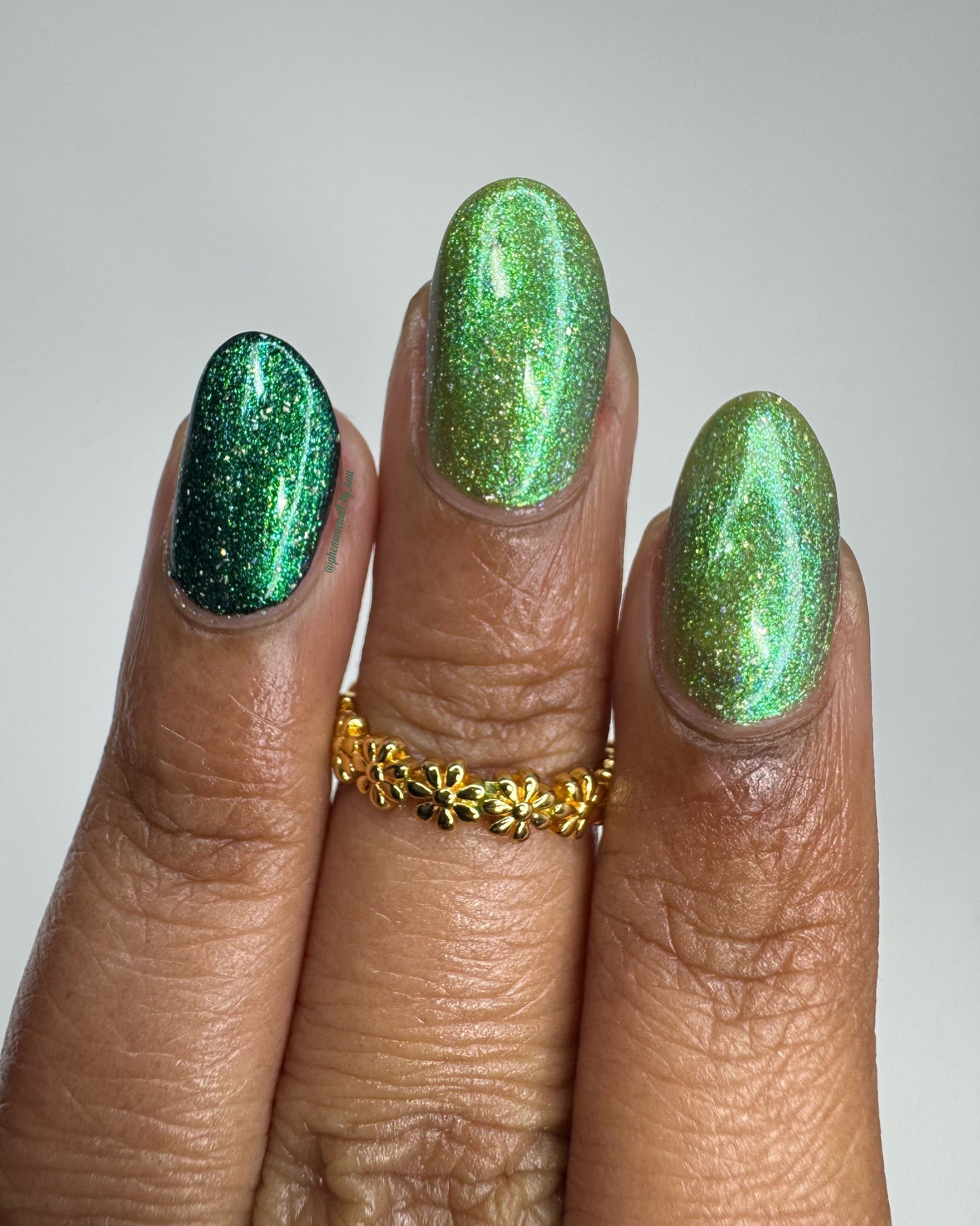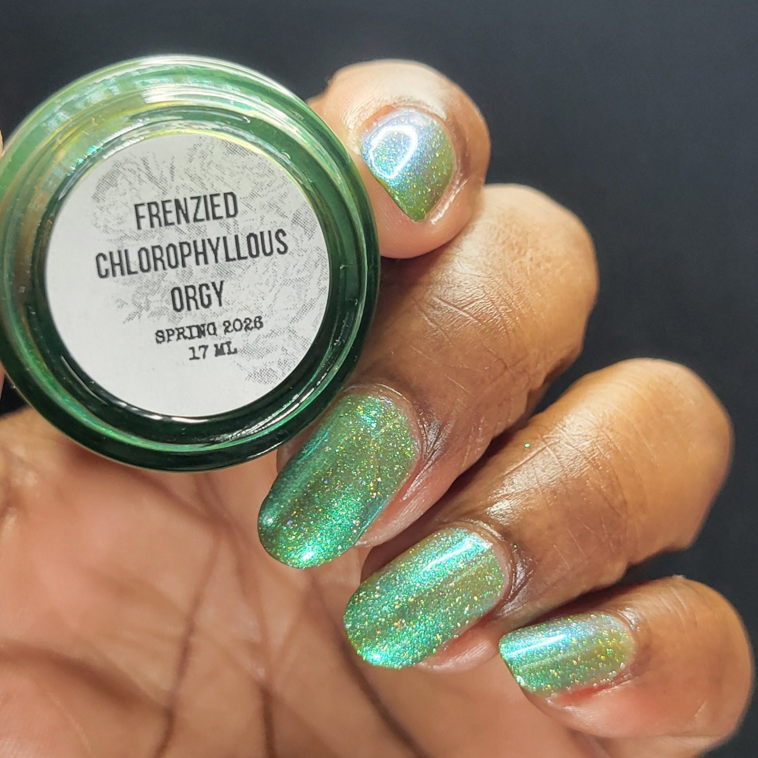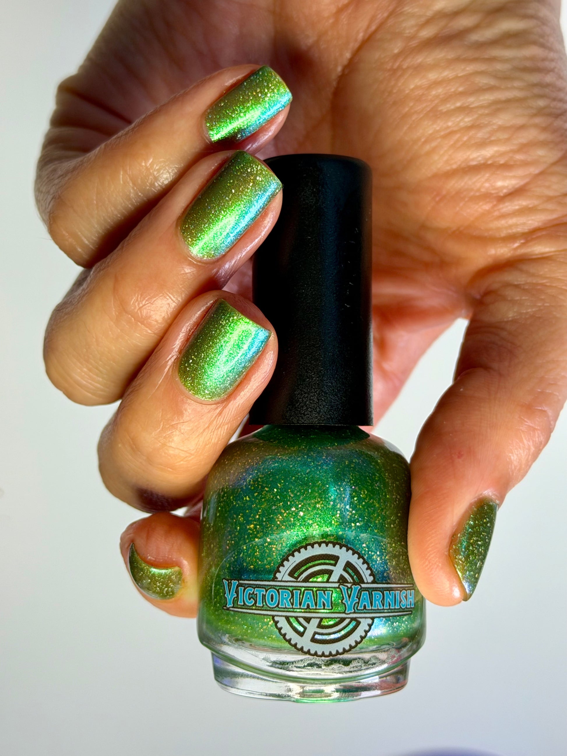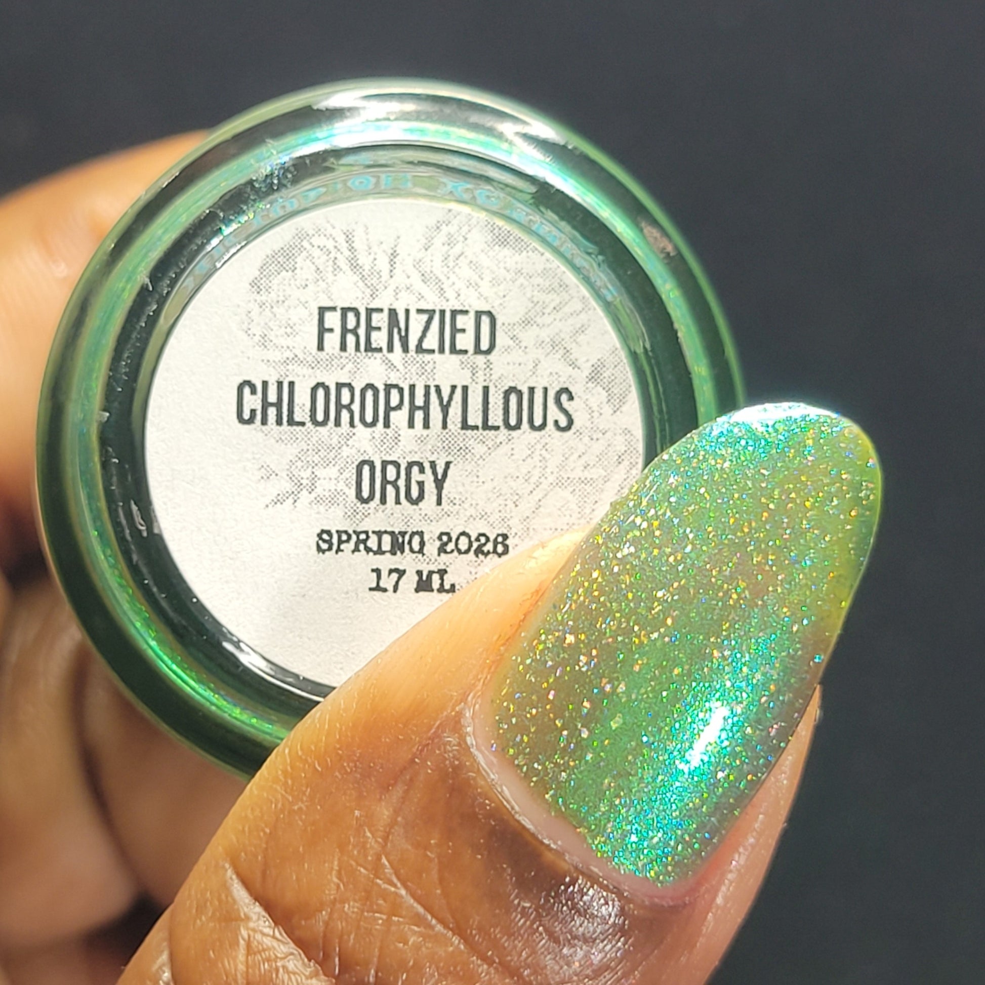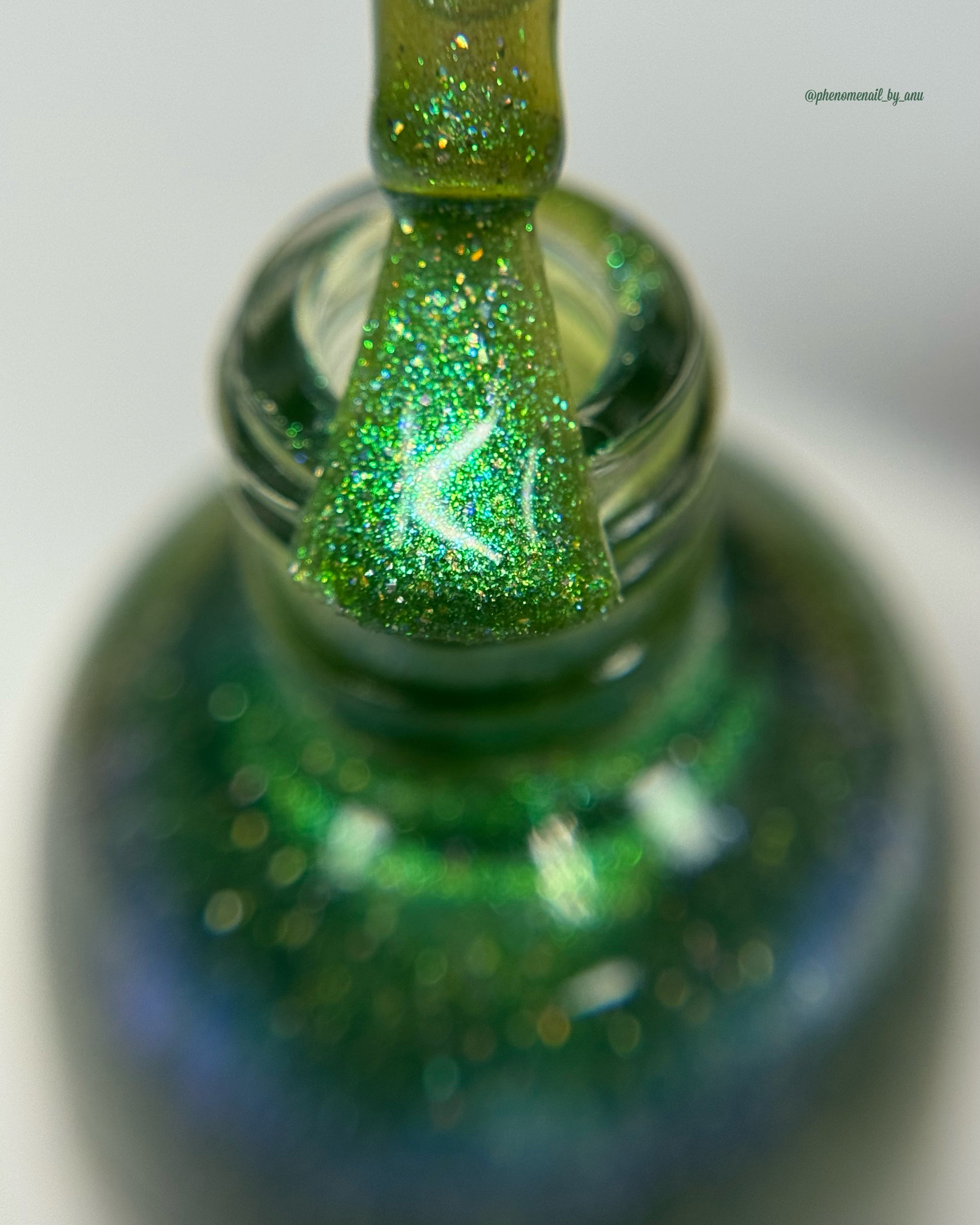 A sheer spring green with a large particle green/aqua to purple/blue at extreme angles aurora shimmer and a pollinating amount of holo flakes (holo dust)