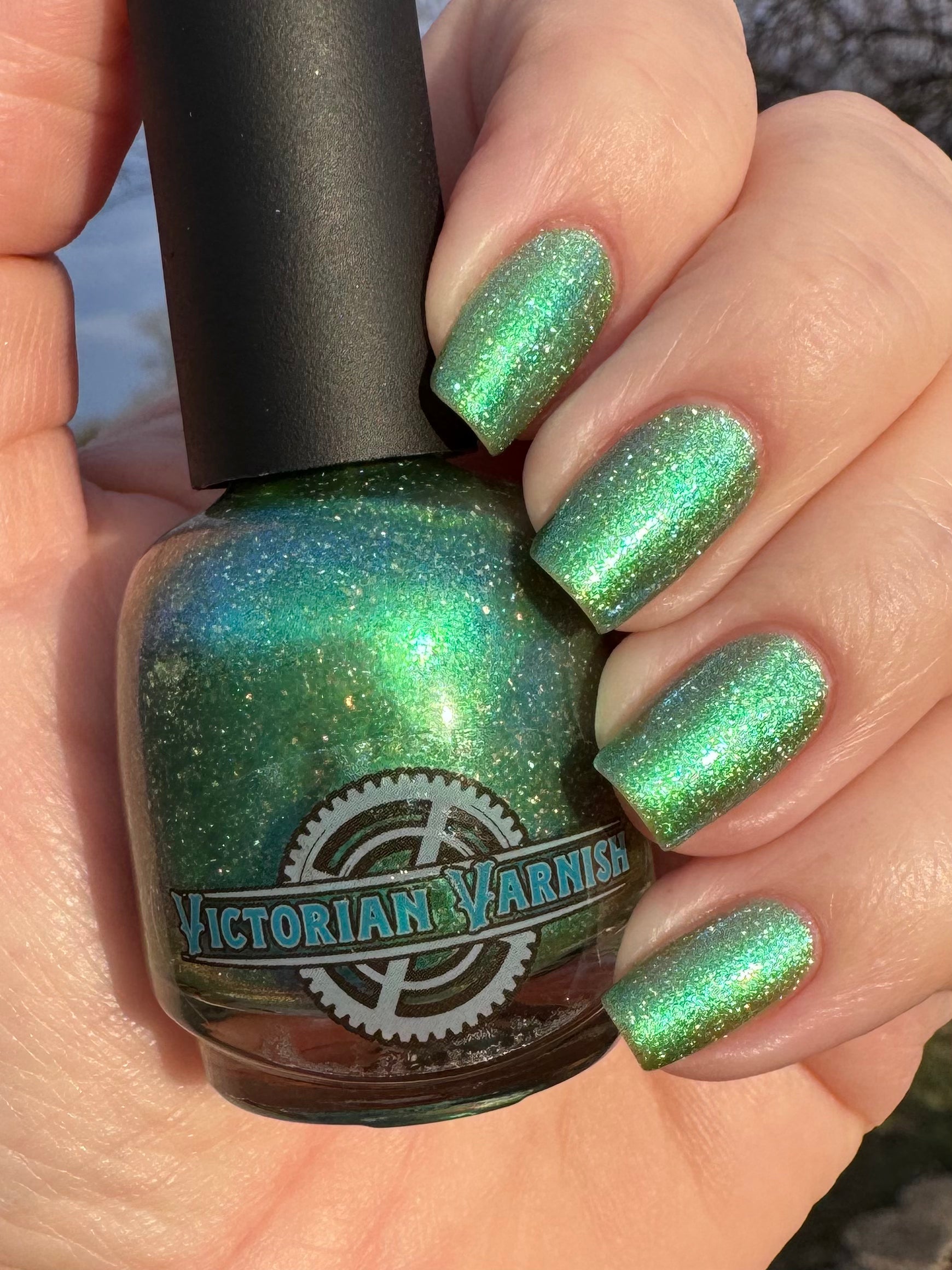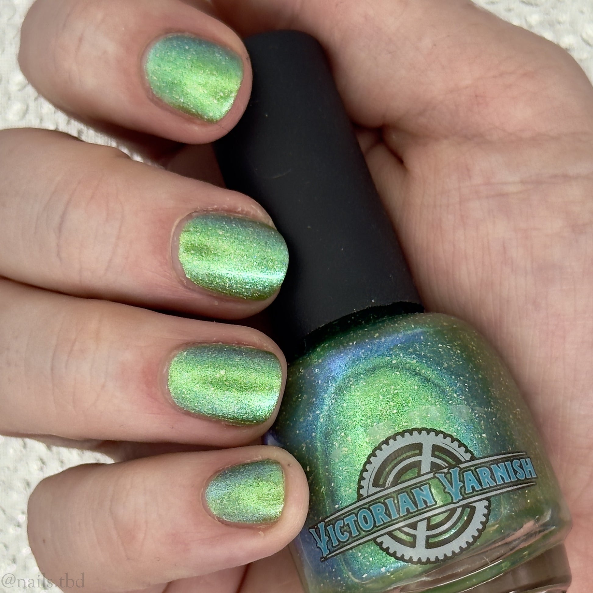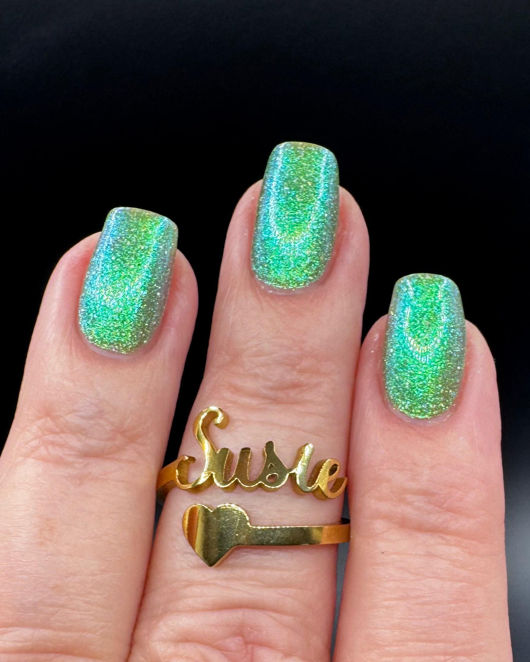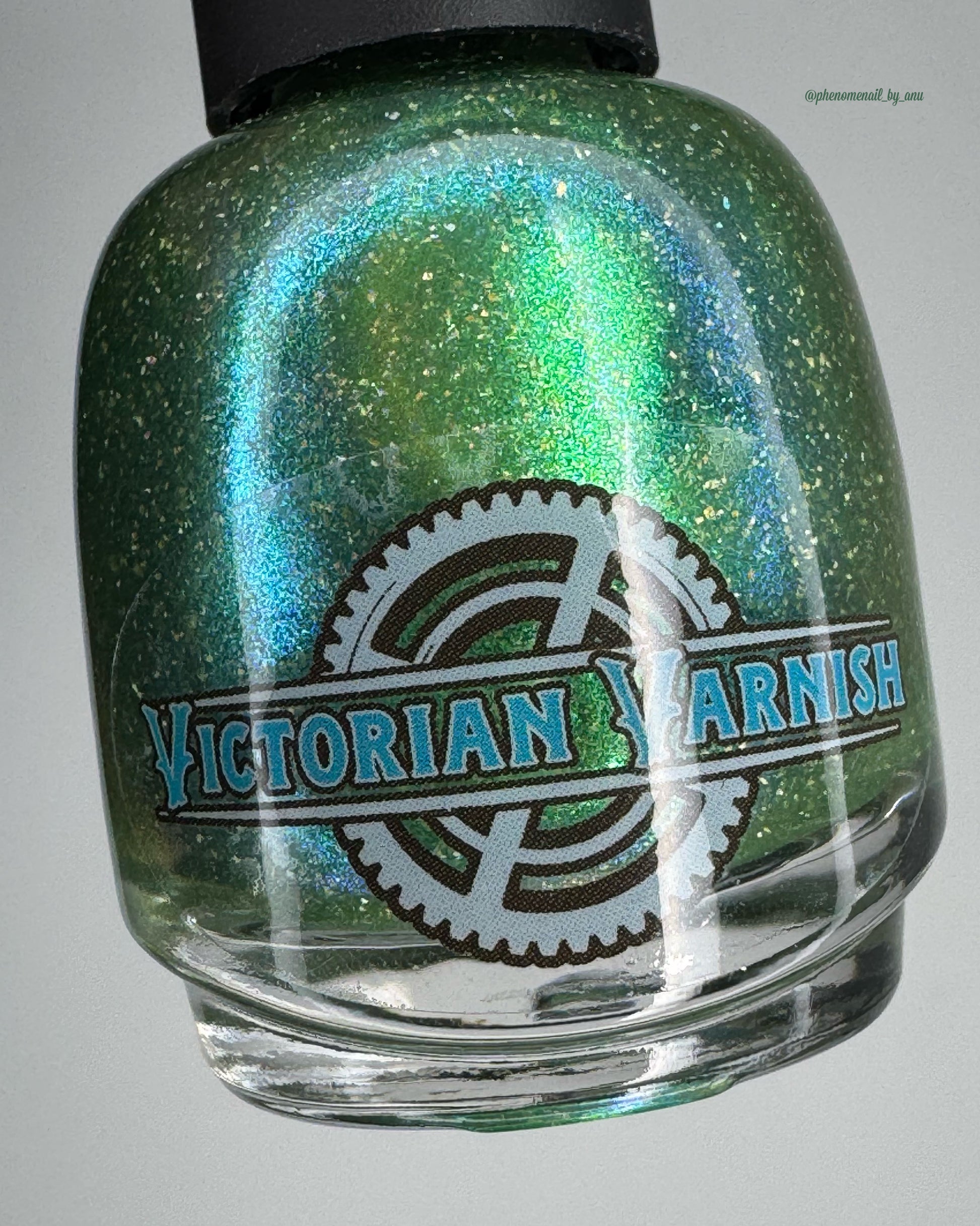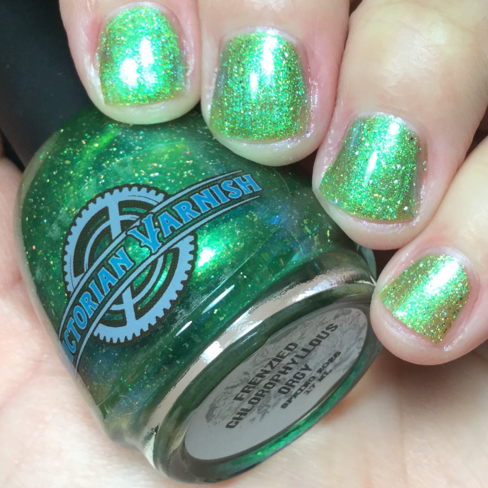 A sheer spring green with a large particle green/aqua to purple/blue at extreme angles aurora shimmer and a pollinating amount of holo flakes (holo dust)