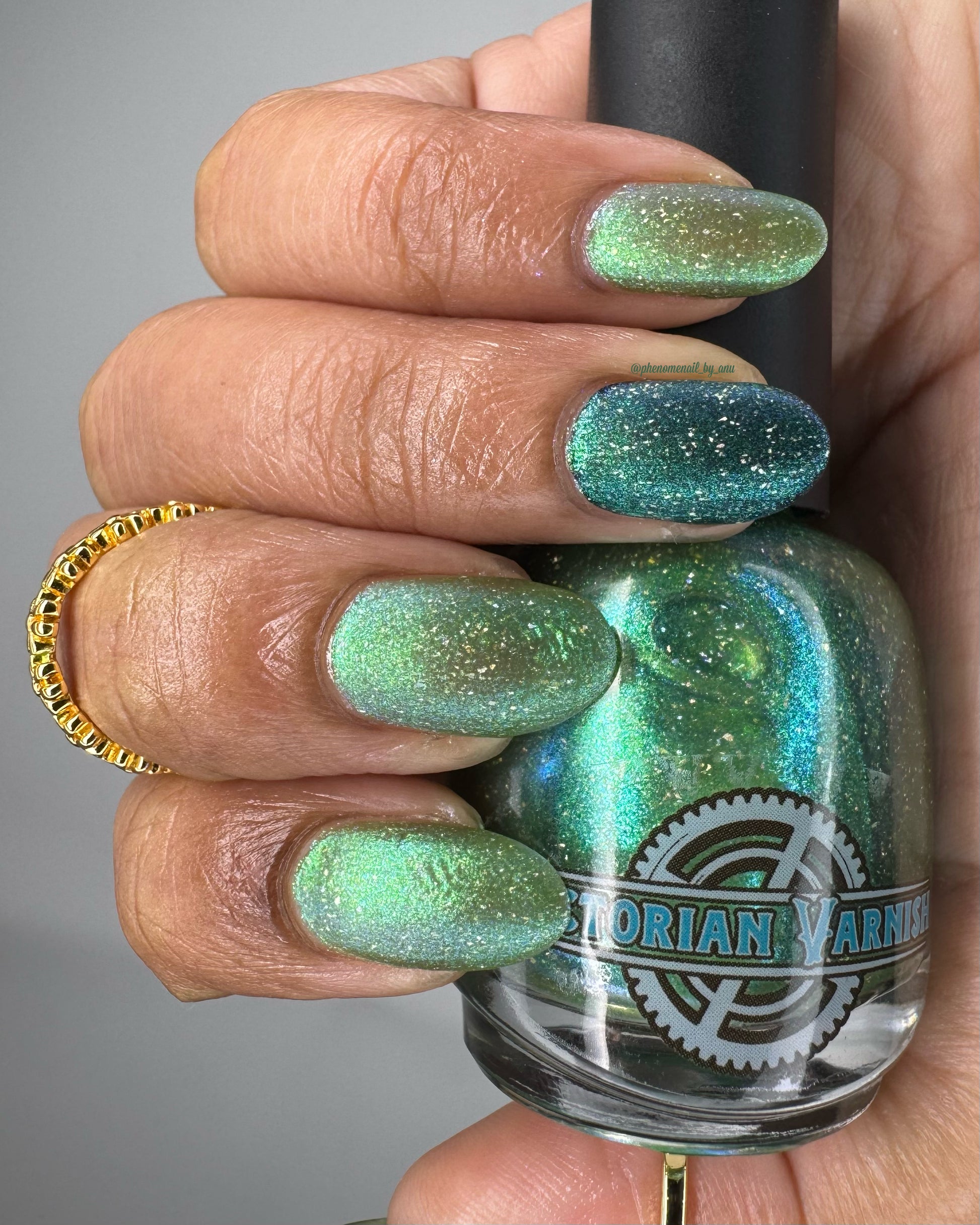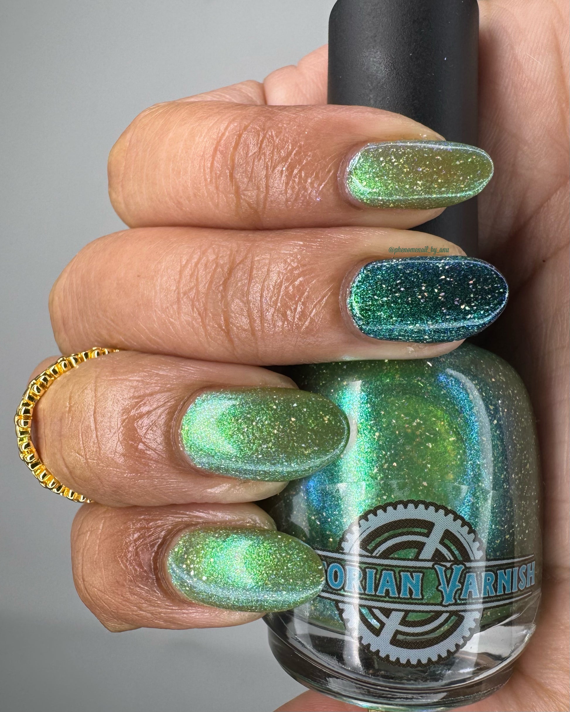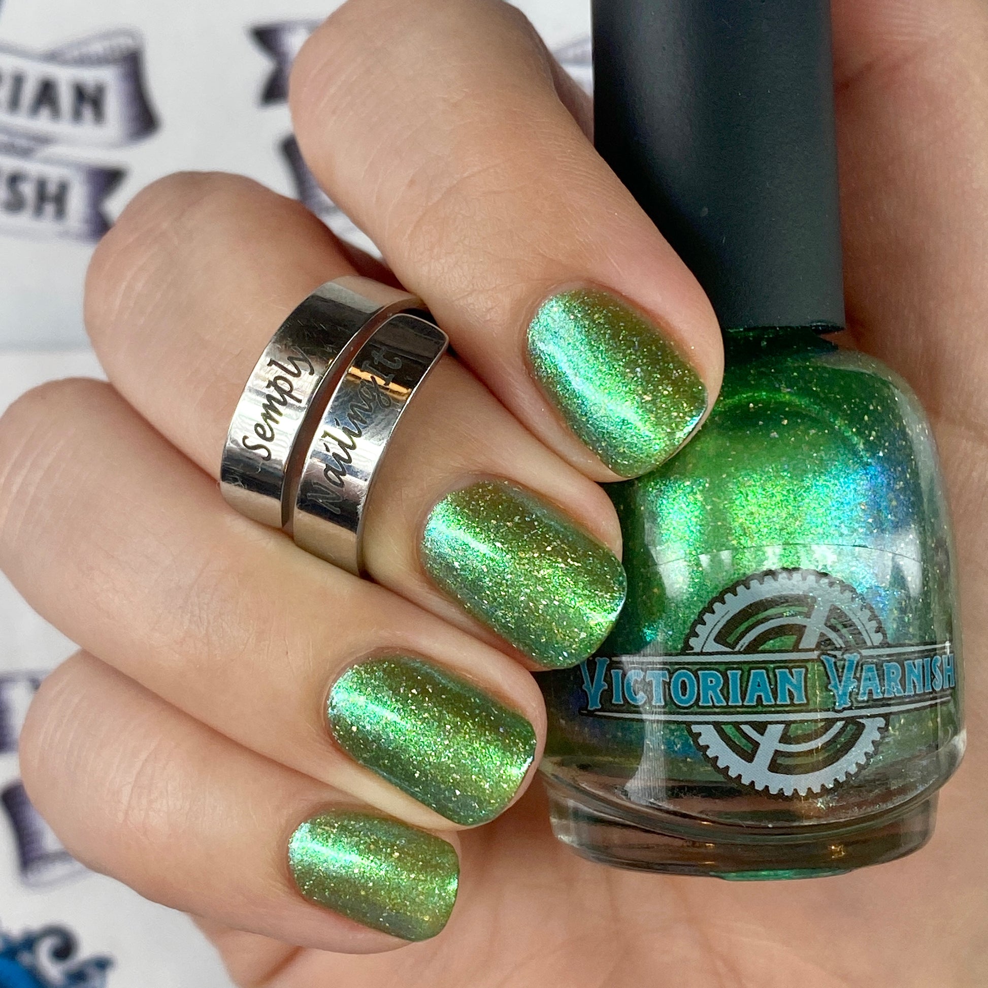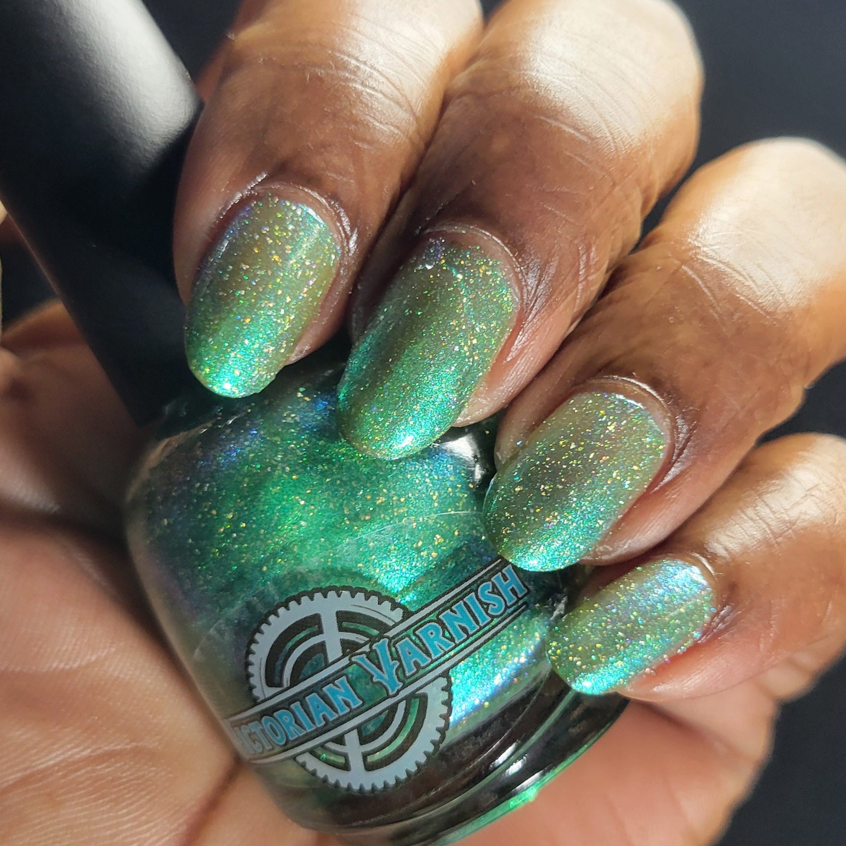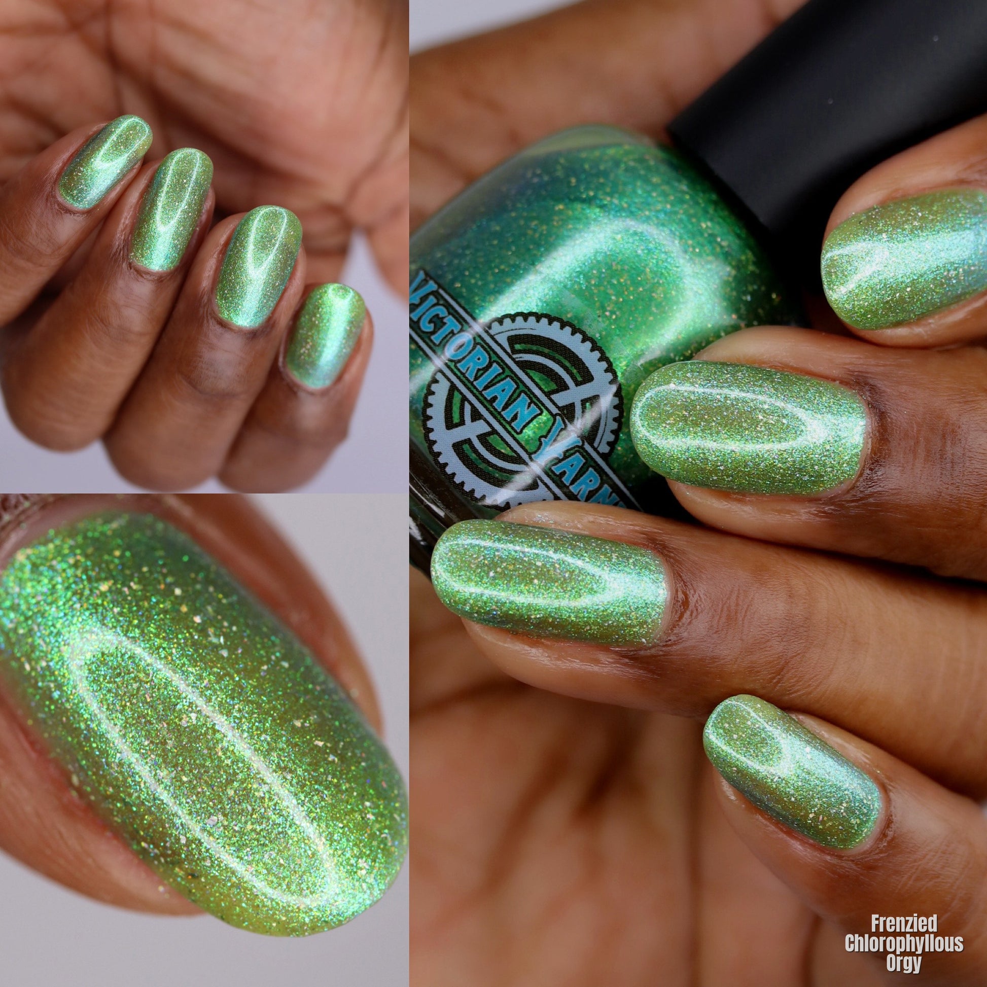 A sheer spring green with a large particle green/aqua to purple/blue at extreme angles aurora shimmer and a pollinating amount of holo flakes (holo dust)