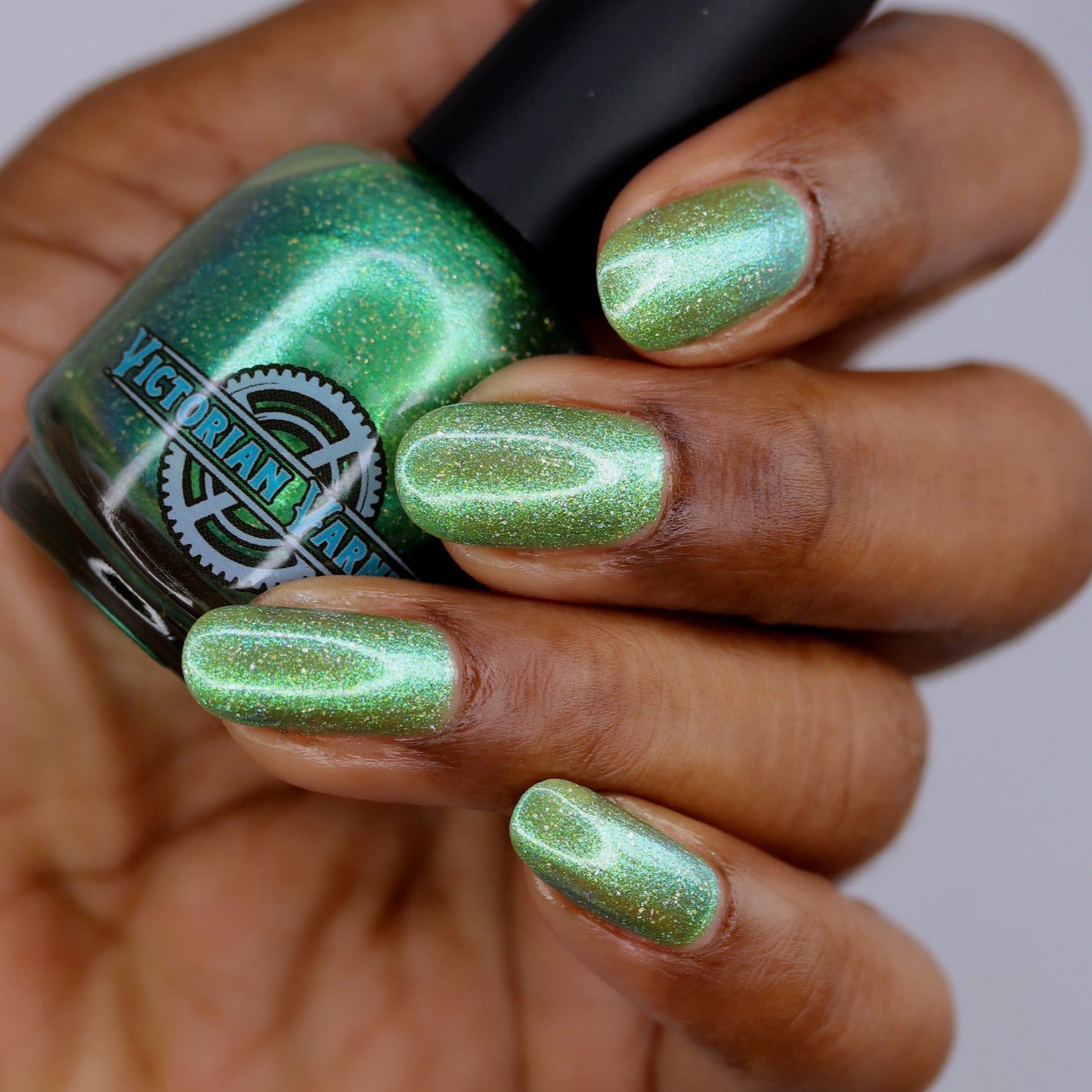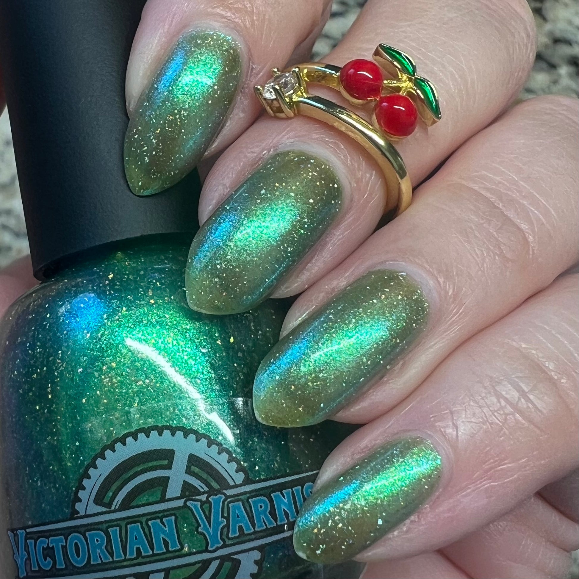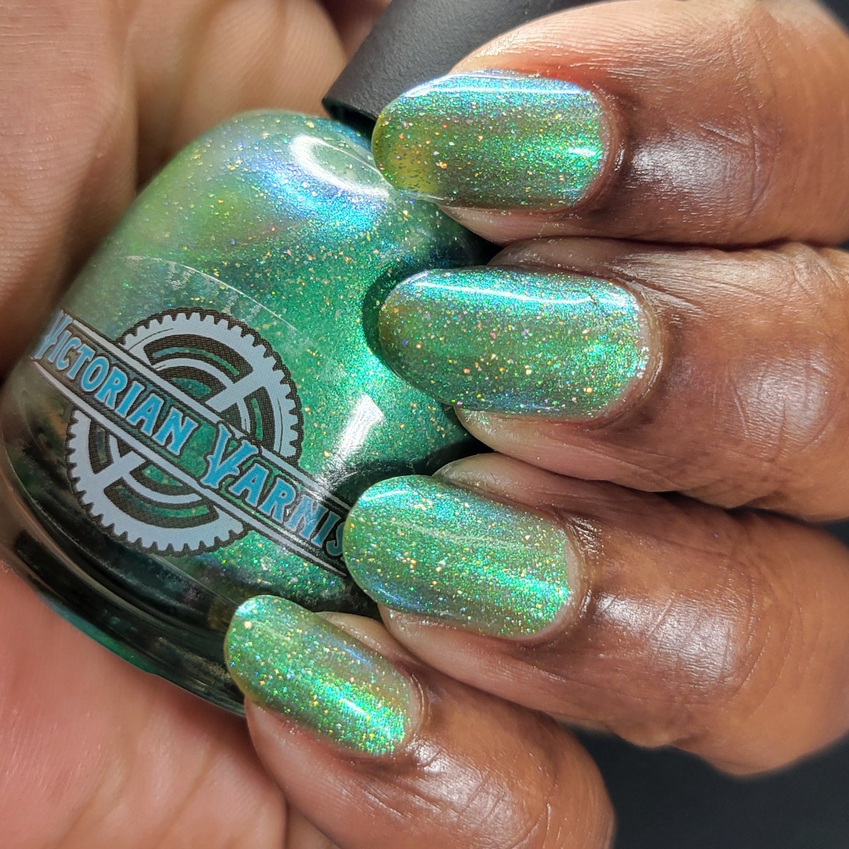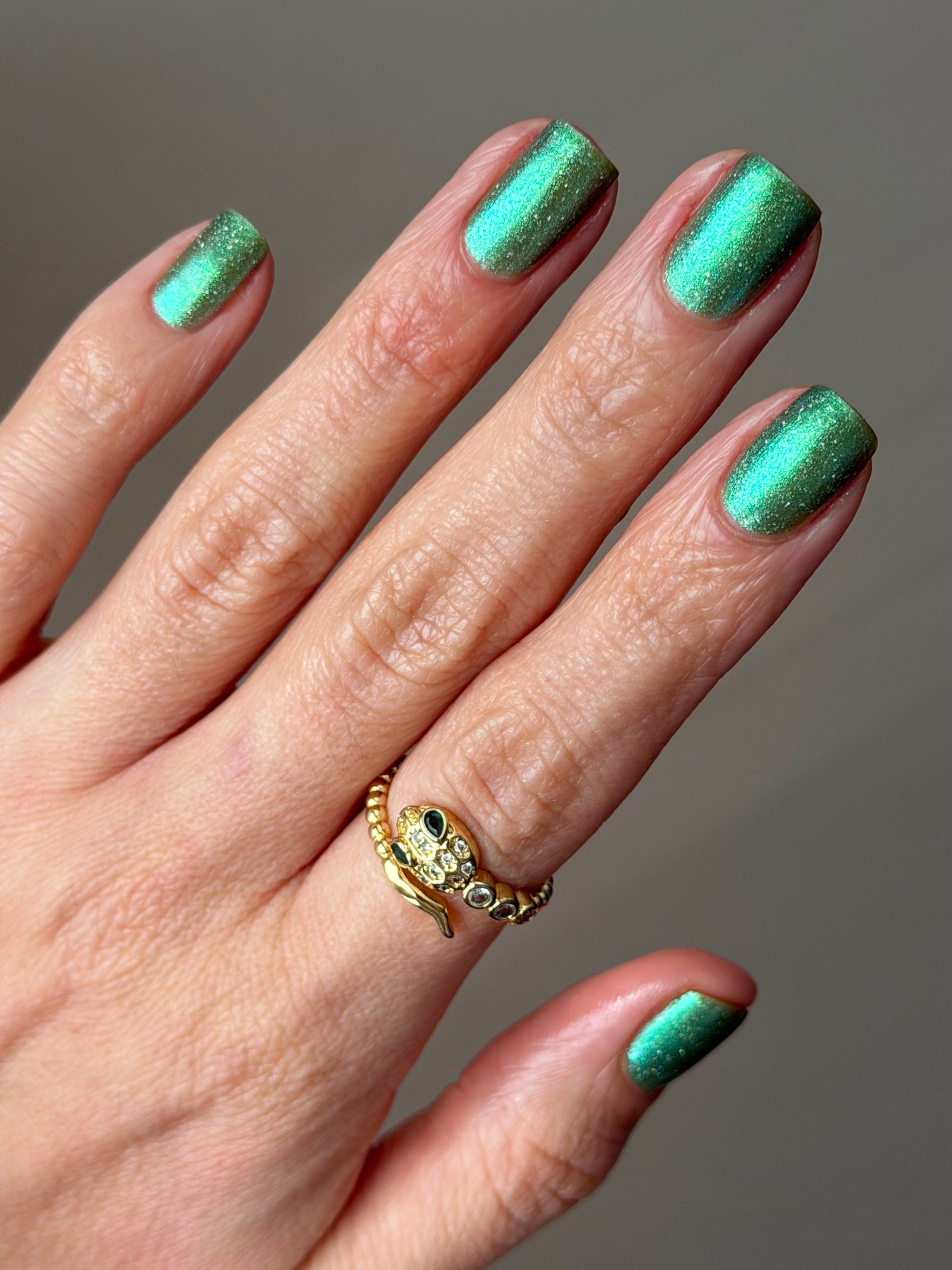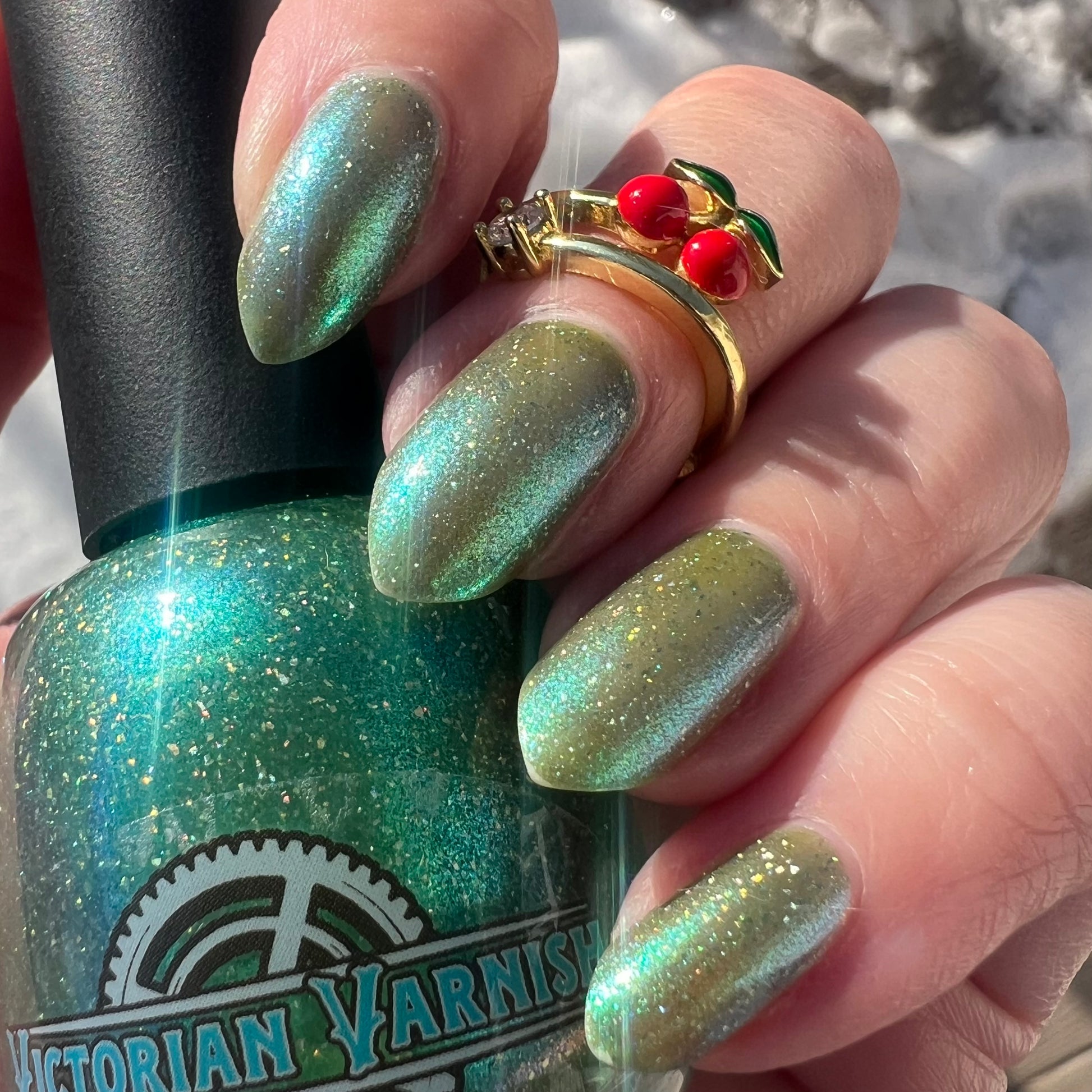 A sheer spring green with a large particle green/aqua to purple/blue at extreme angles aurora shimmer and a pollinating amount of holo flakes (holo dust)