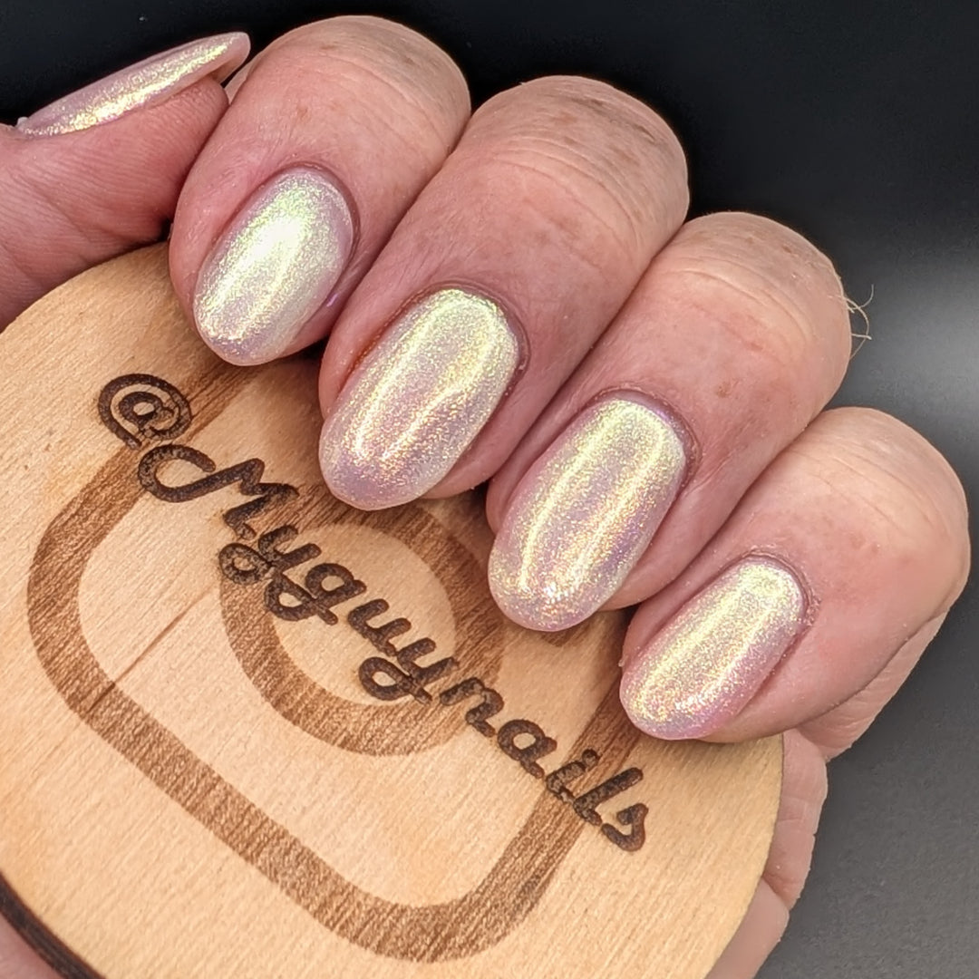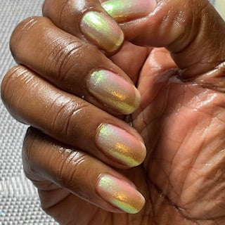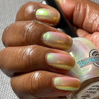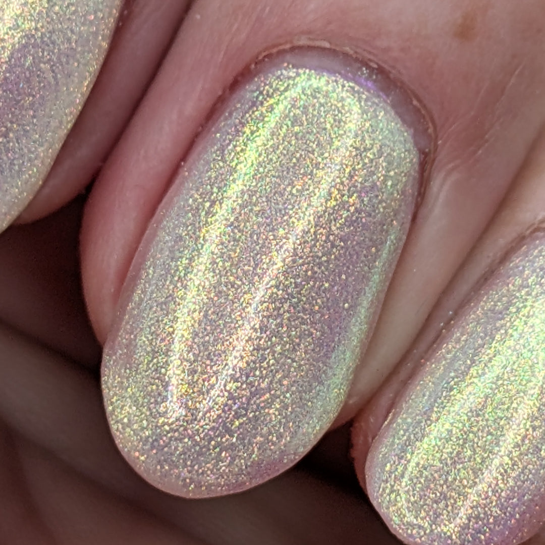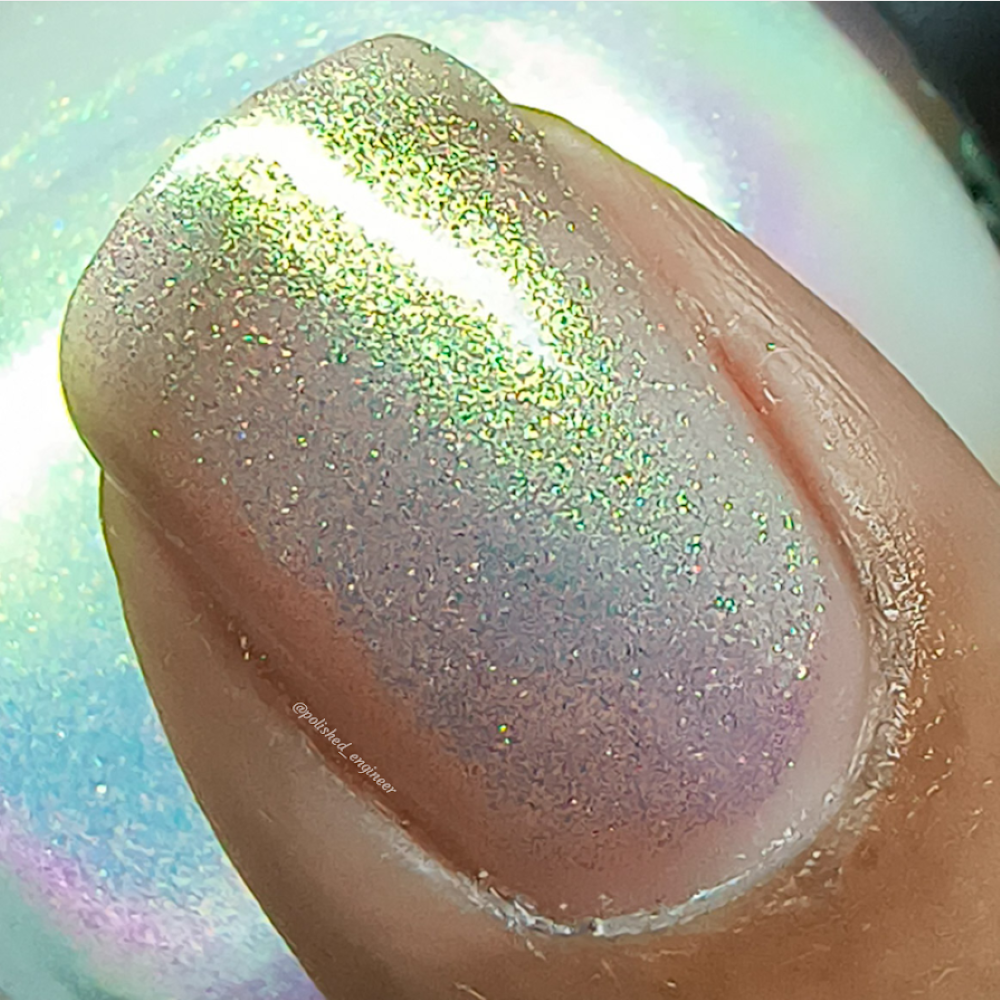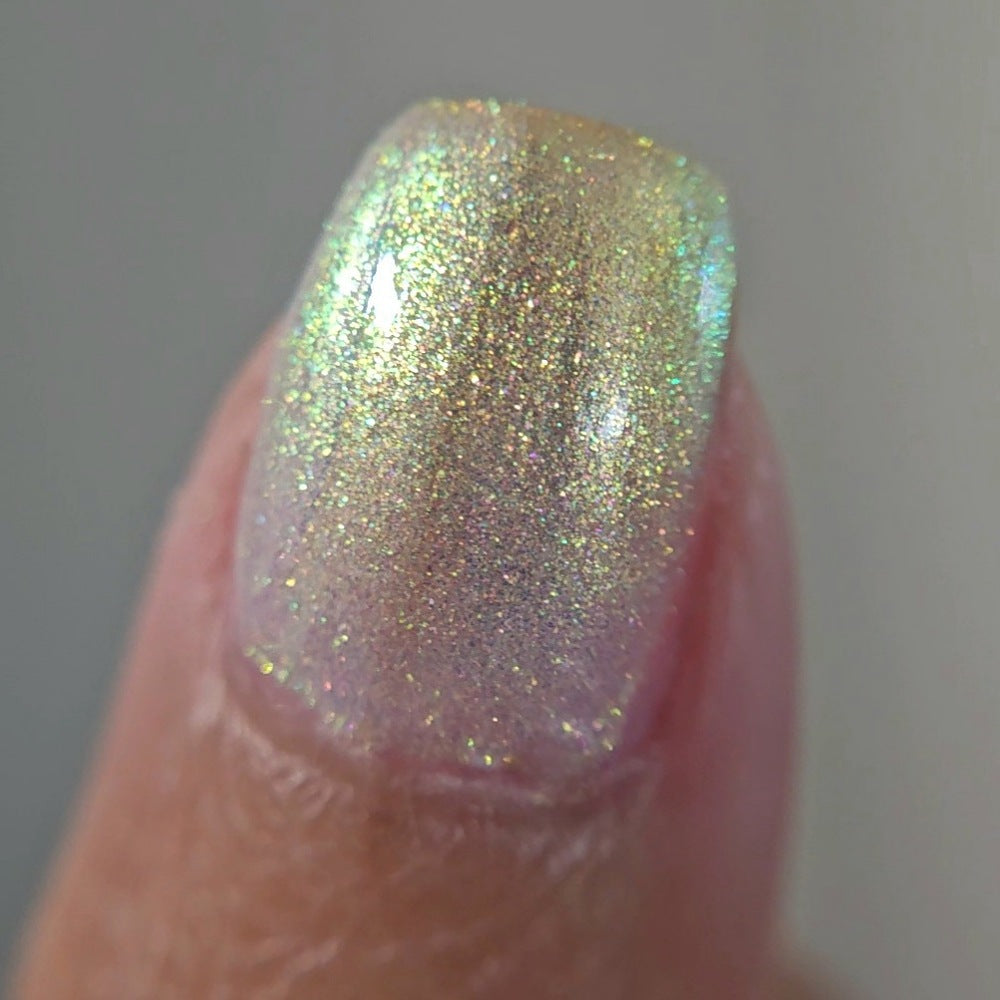 A sheer sparkling base that has a beautiful iridescent shimmer that ranges in shades thru the rainbow
