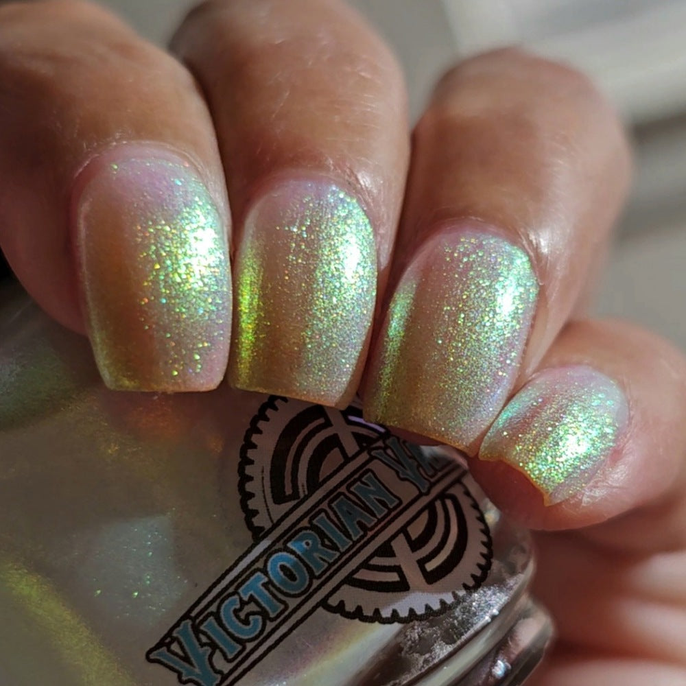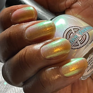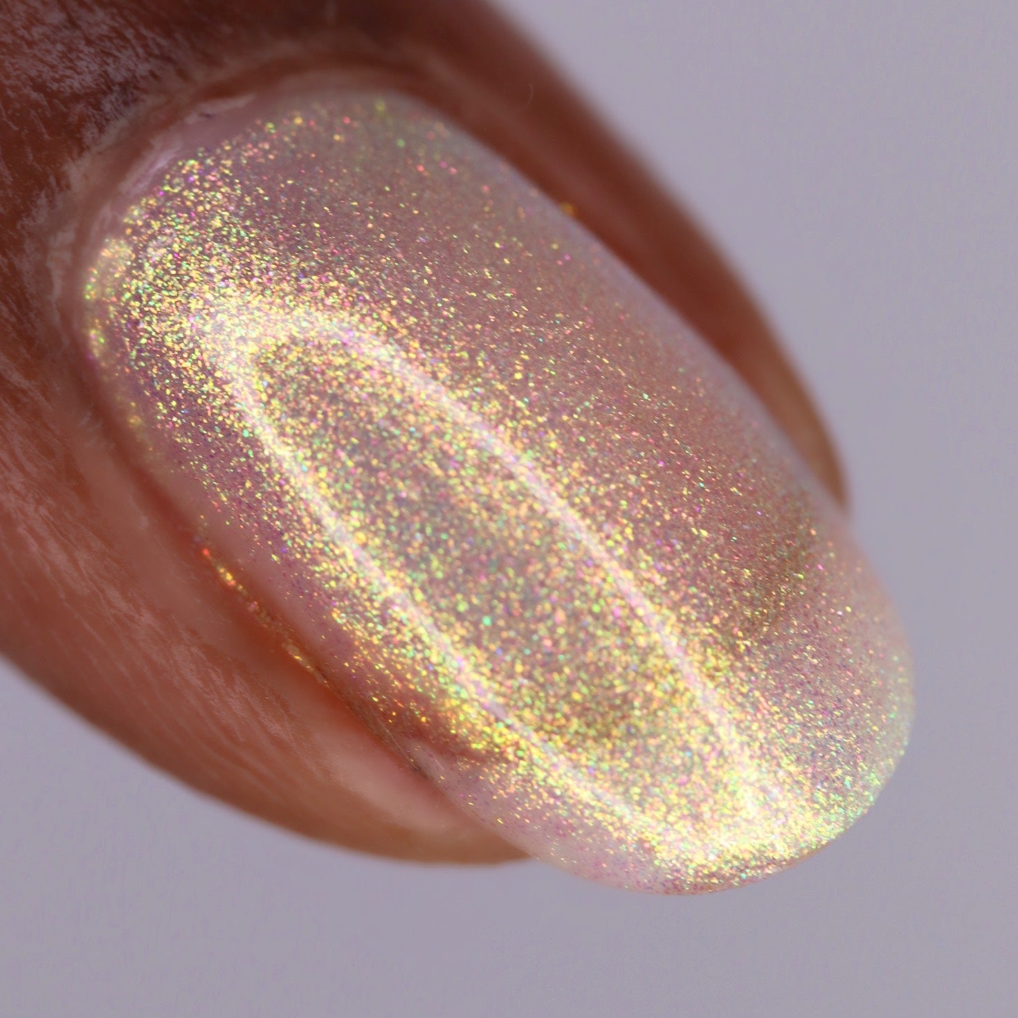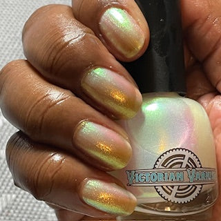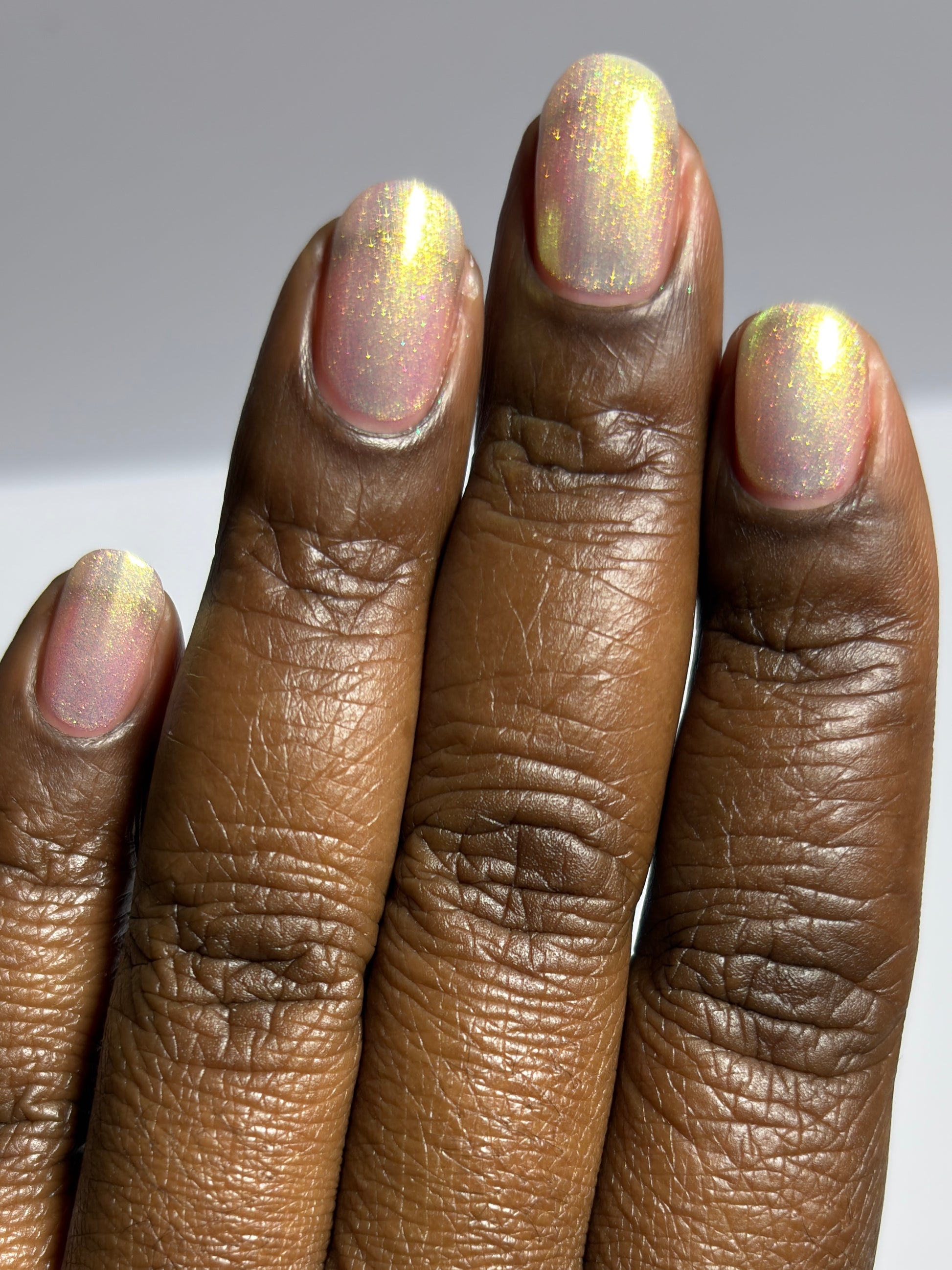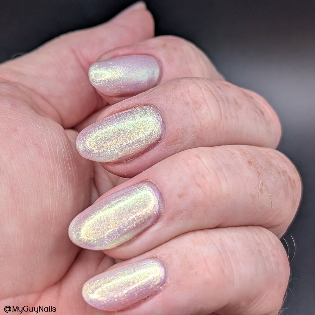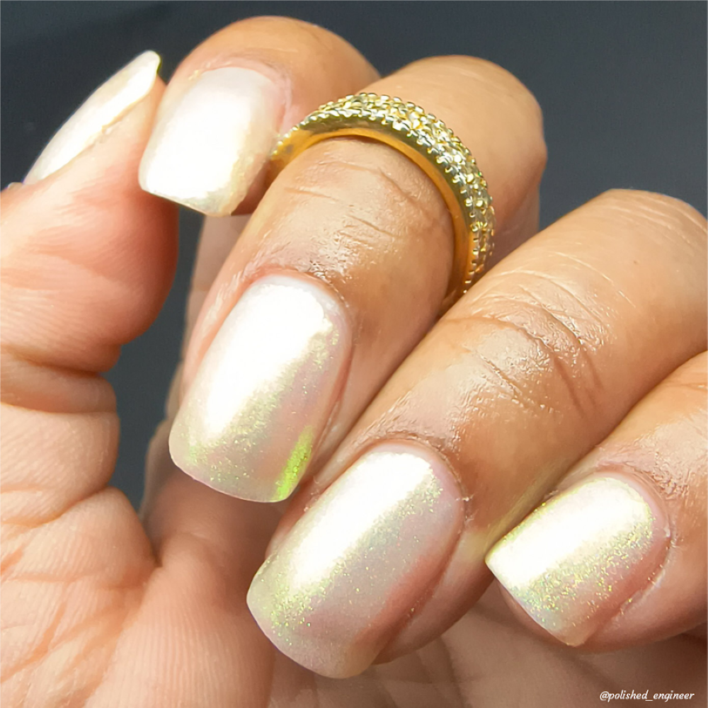 A sheer sparkling base that has a beautiful iridescent shimmer that ranges in shades thru the rainbow