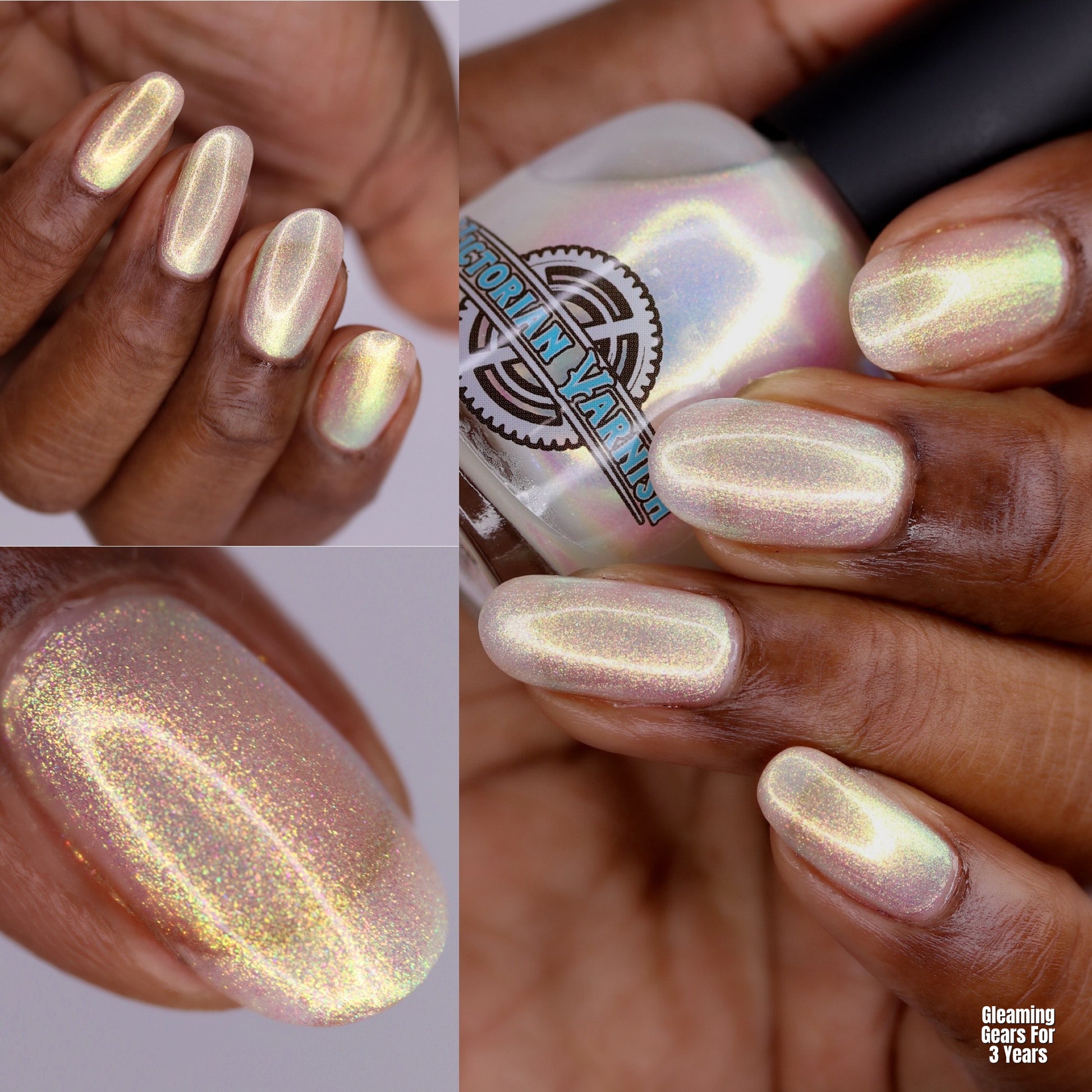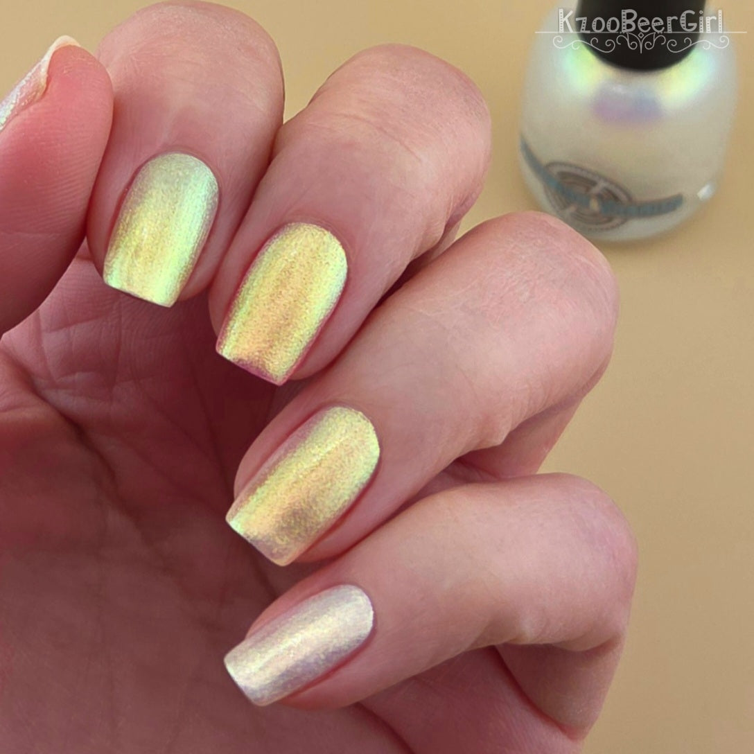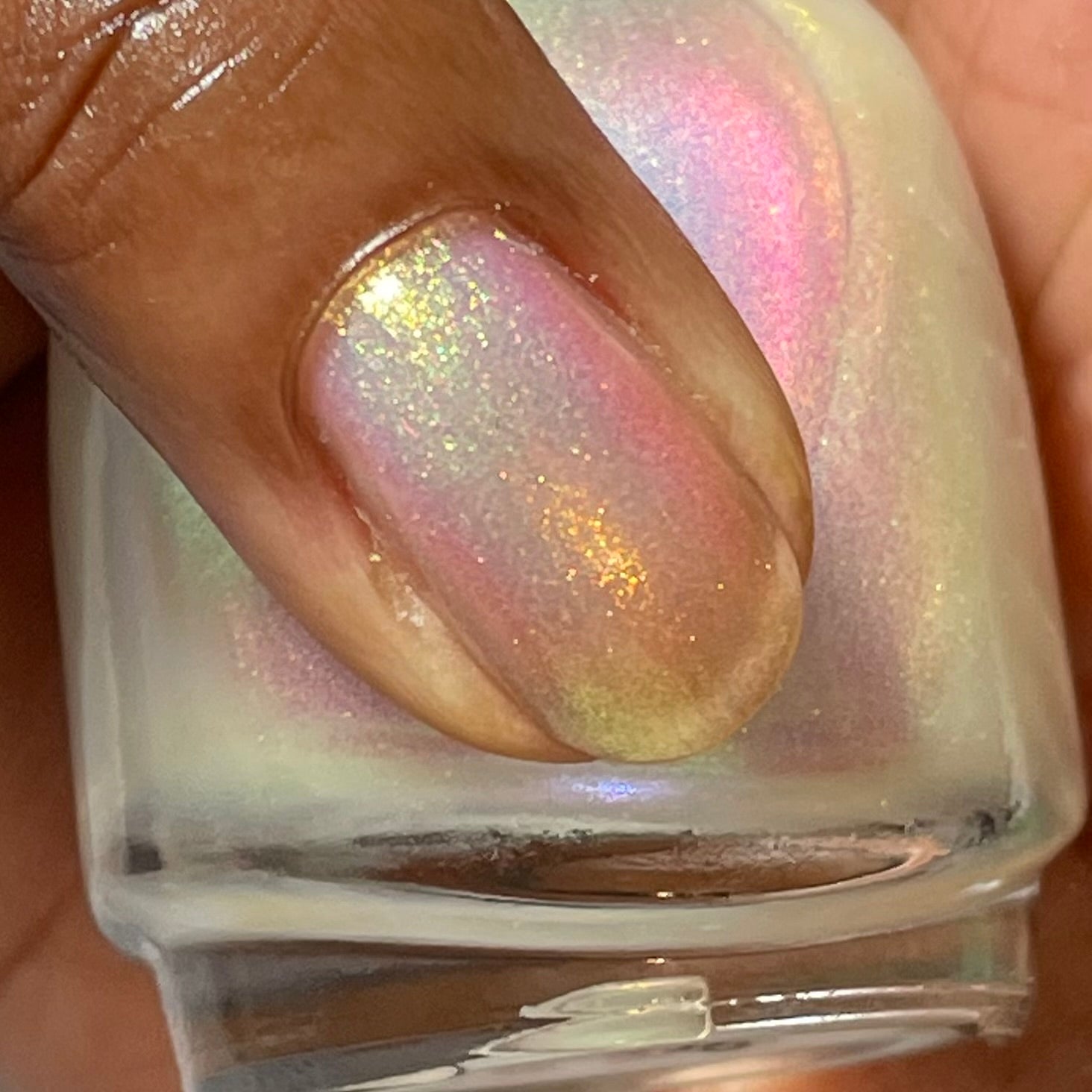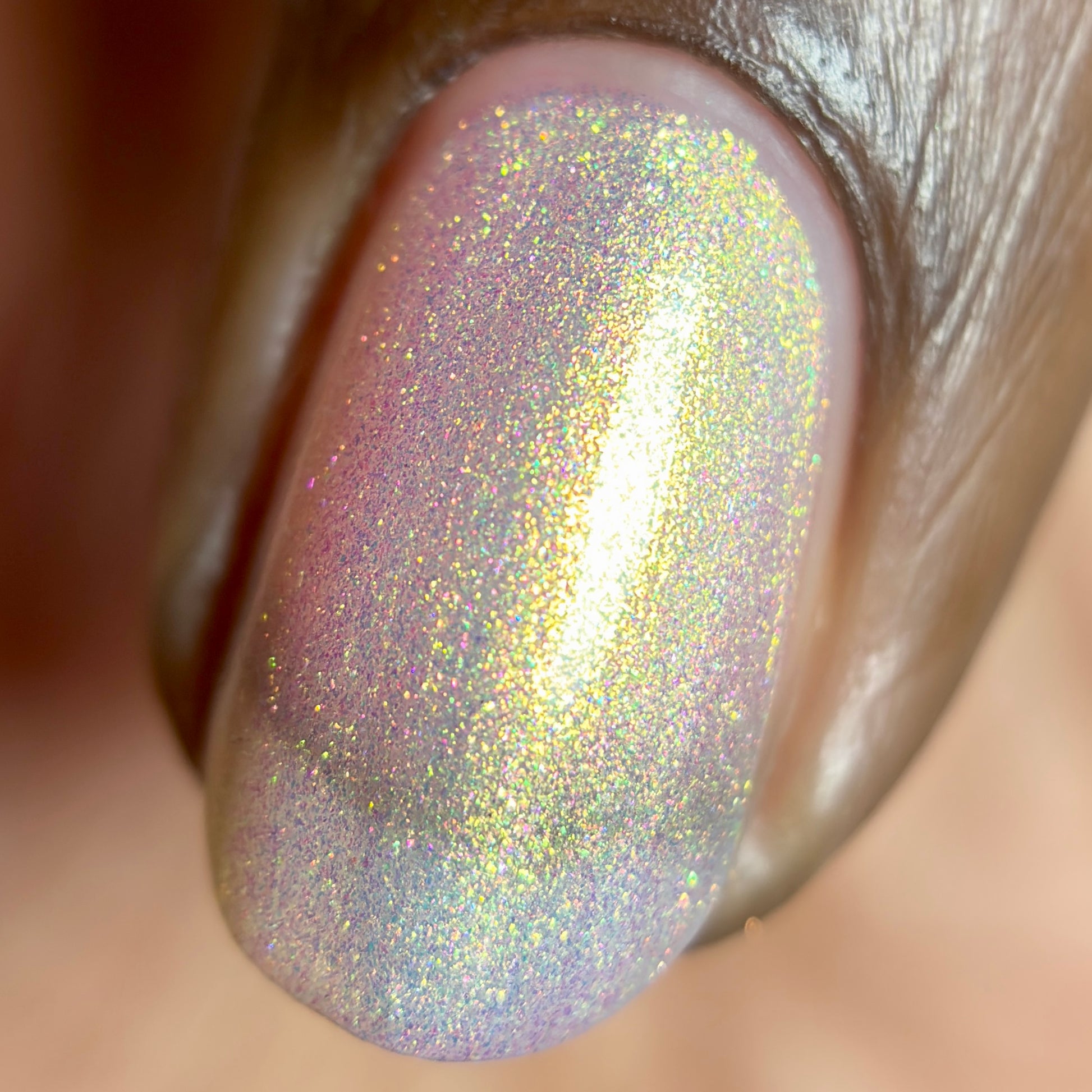 A sheer sparkling base that has a beautiful iridescent shimmer that ranges in shades thru the rainbow