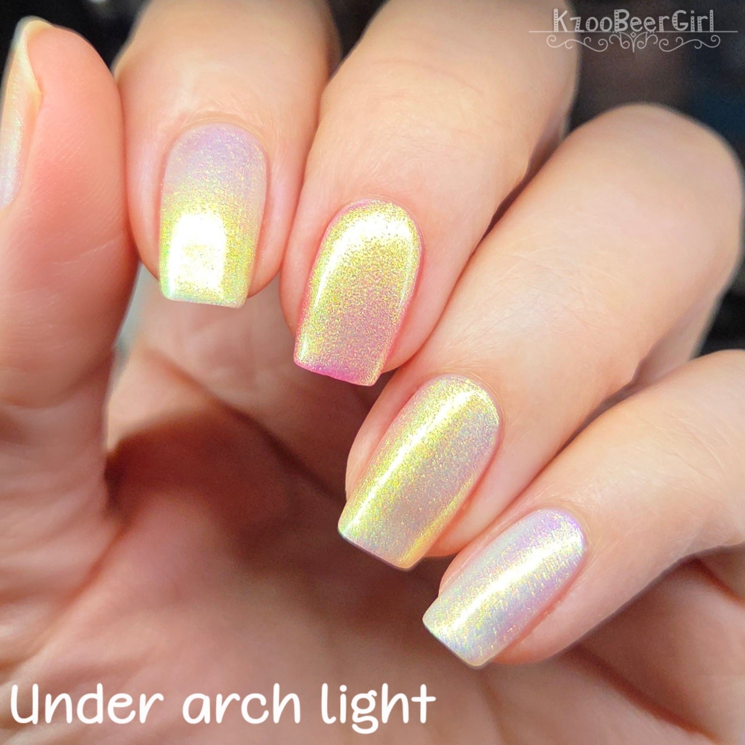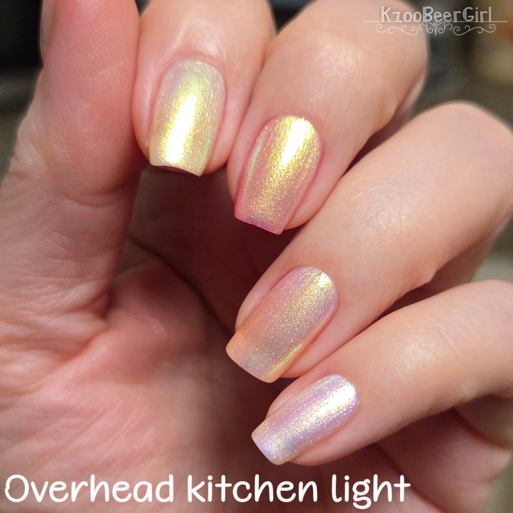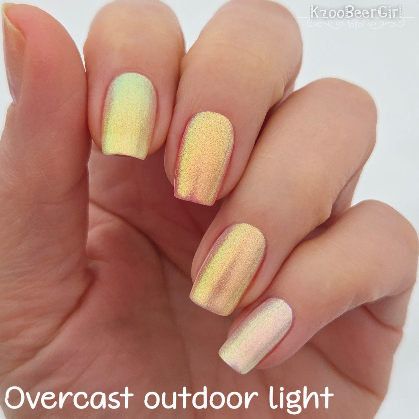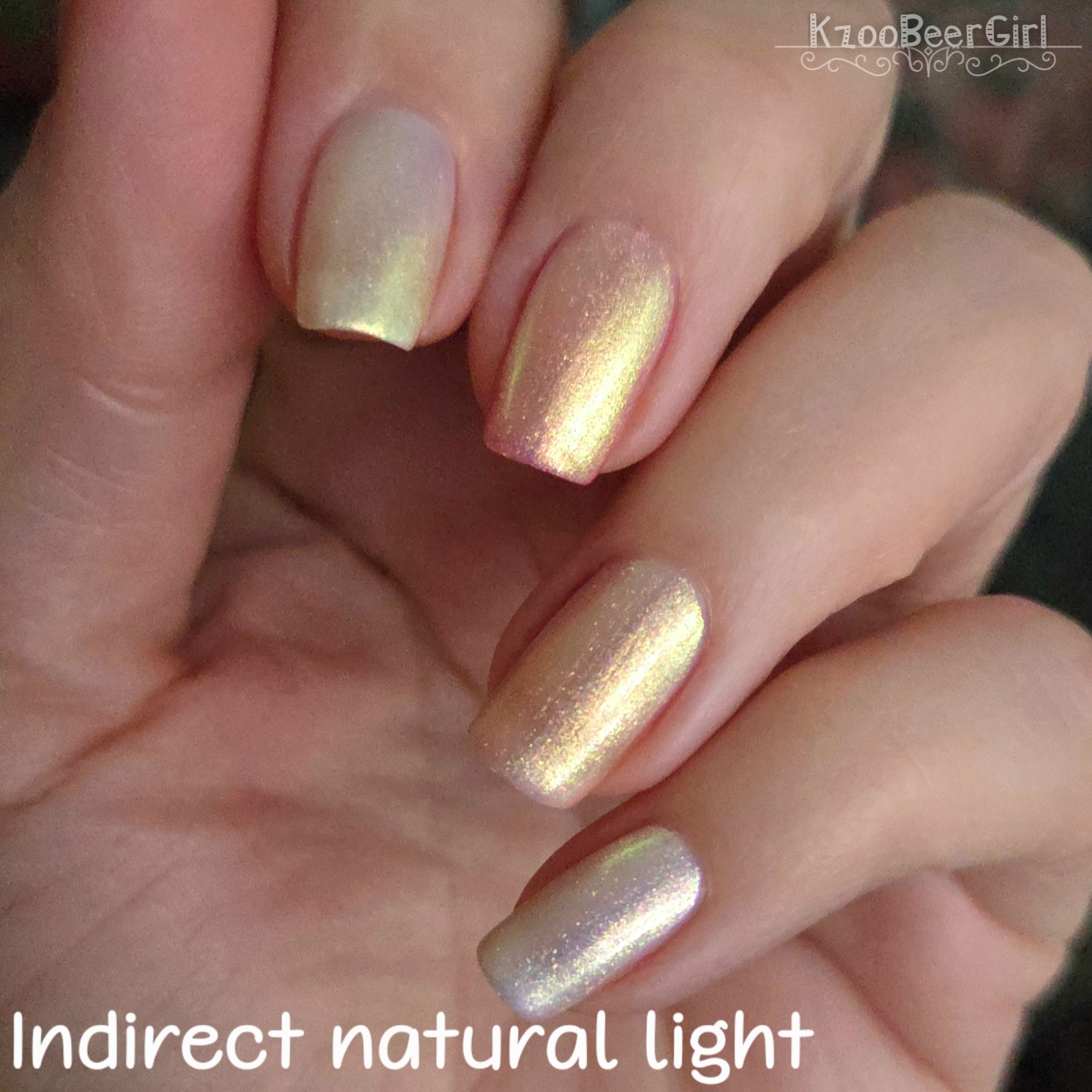 A sheer sparkling base that has a beautiful iridescent shimmer that ranges in shades thru the rainbow